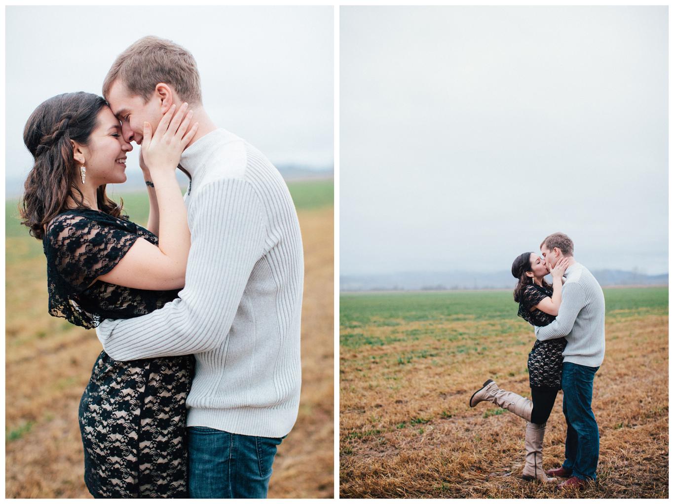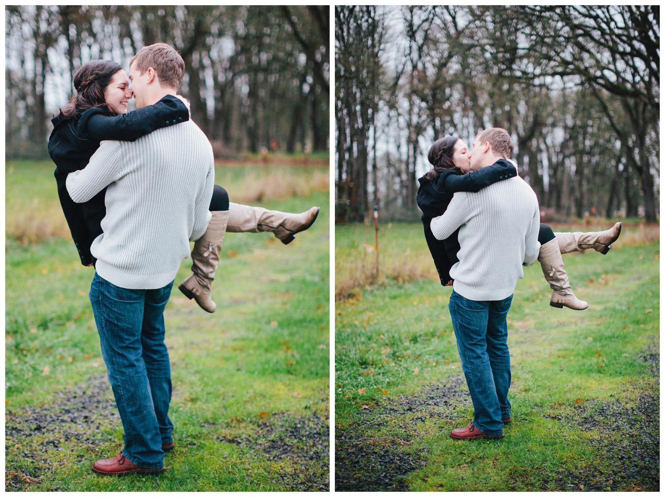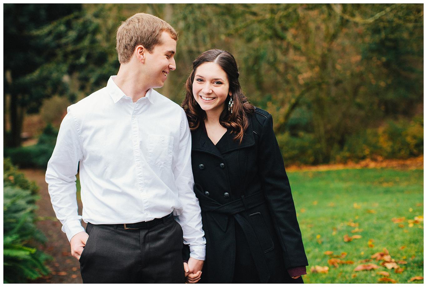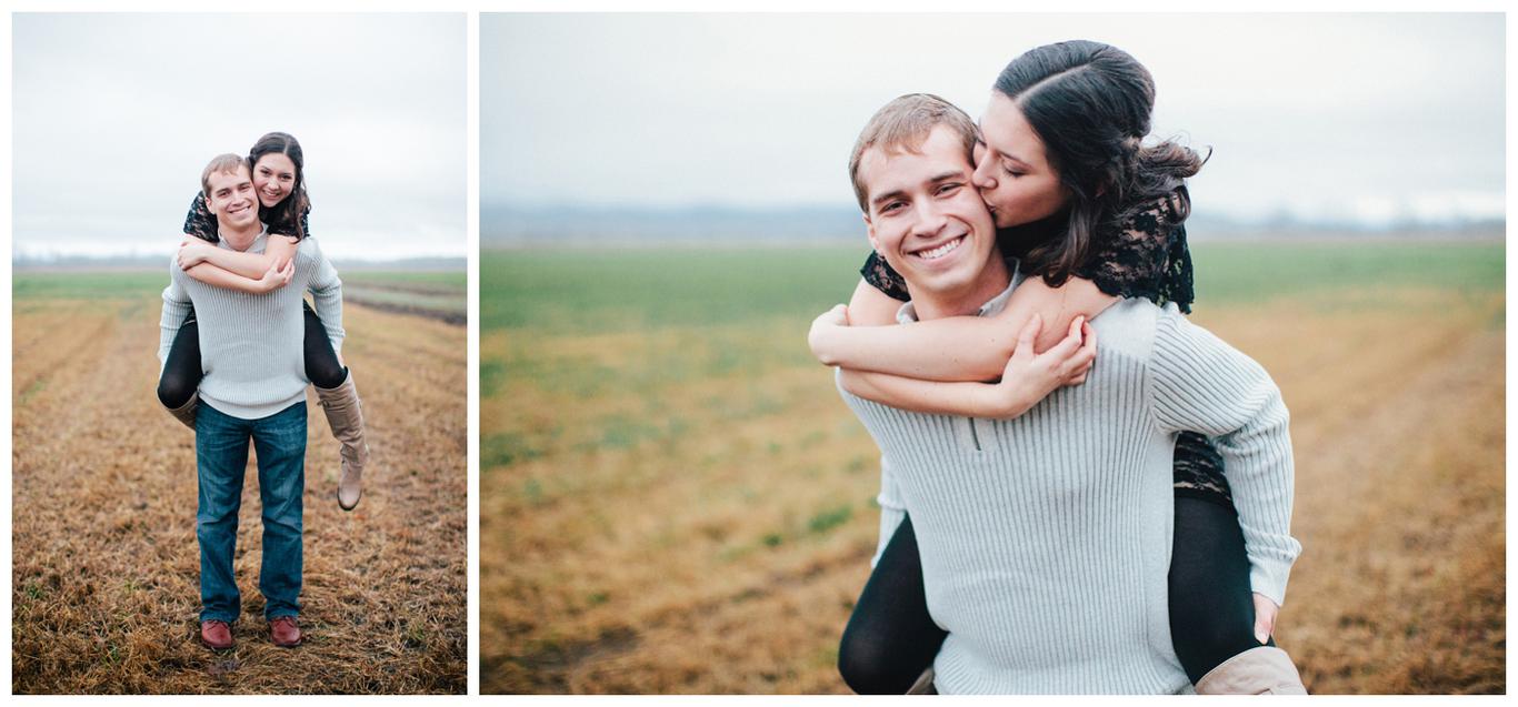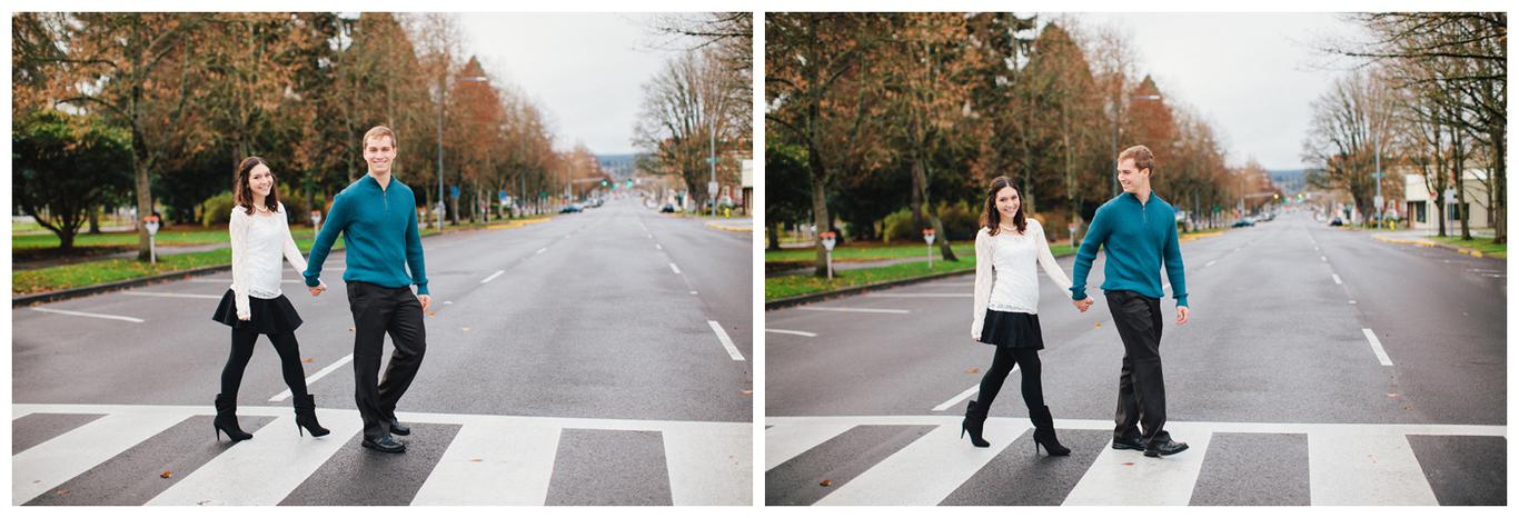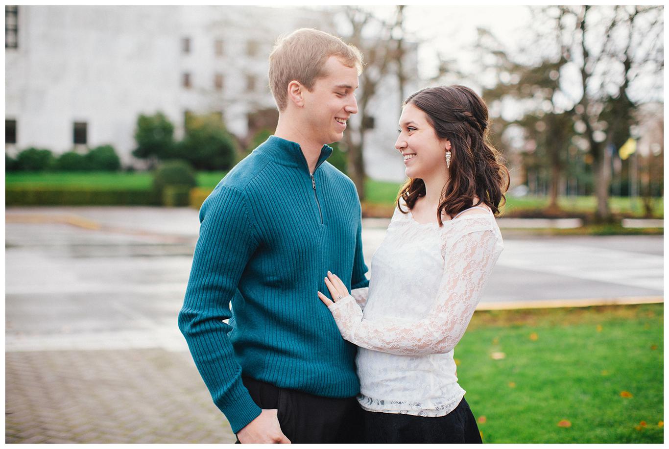 It was raining. Caitlin and Brendan were at an OSU football game and Brendan had been playing in the band all day. But instead of leaving afterwards, Brendan and a few band members broke out into a special tune: Disney’s “A whole new world.” Because Caitlin’s life was about to change forever. Brendan got down on one knee after the song and asked her to be his wife in front of everyone. And she said yes. I was insanely happy for her when I saw her announcement and even MORE happy when she emailed me asking me to take her wedding and engagement photos! You see, I photographed one of Caitlin’s best friends wedding this summer, I’m shooting her other best friends wedding in March, and now I get to shoot Caitlin’s as well! I went to high school with all three girls and it has been so fun to document their individual love stories and friendships! Anyway, just as Caitlin’s proposal happened in the rain, her engagement photos did too. But it was a beautiful misty NW day in the Salem area, and we had a blast despite the damp conditions! Gotta love Oregon! Congrats you two