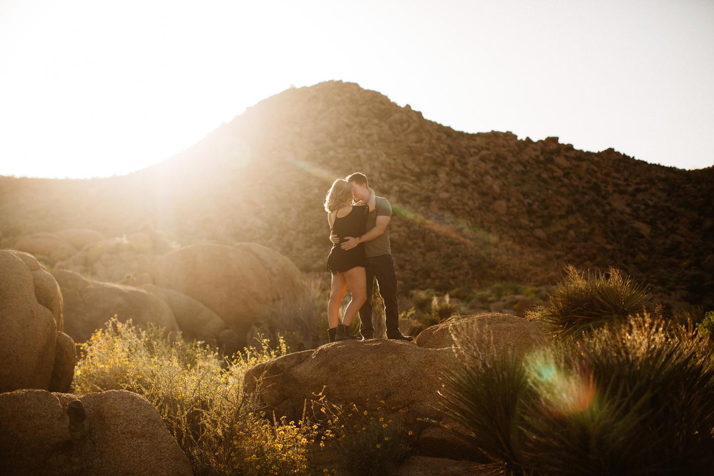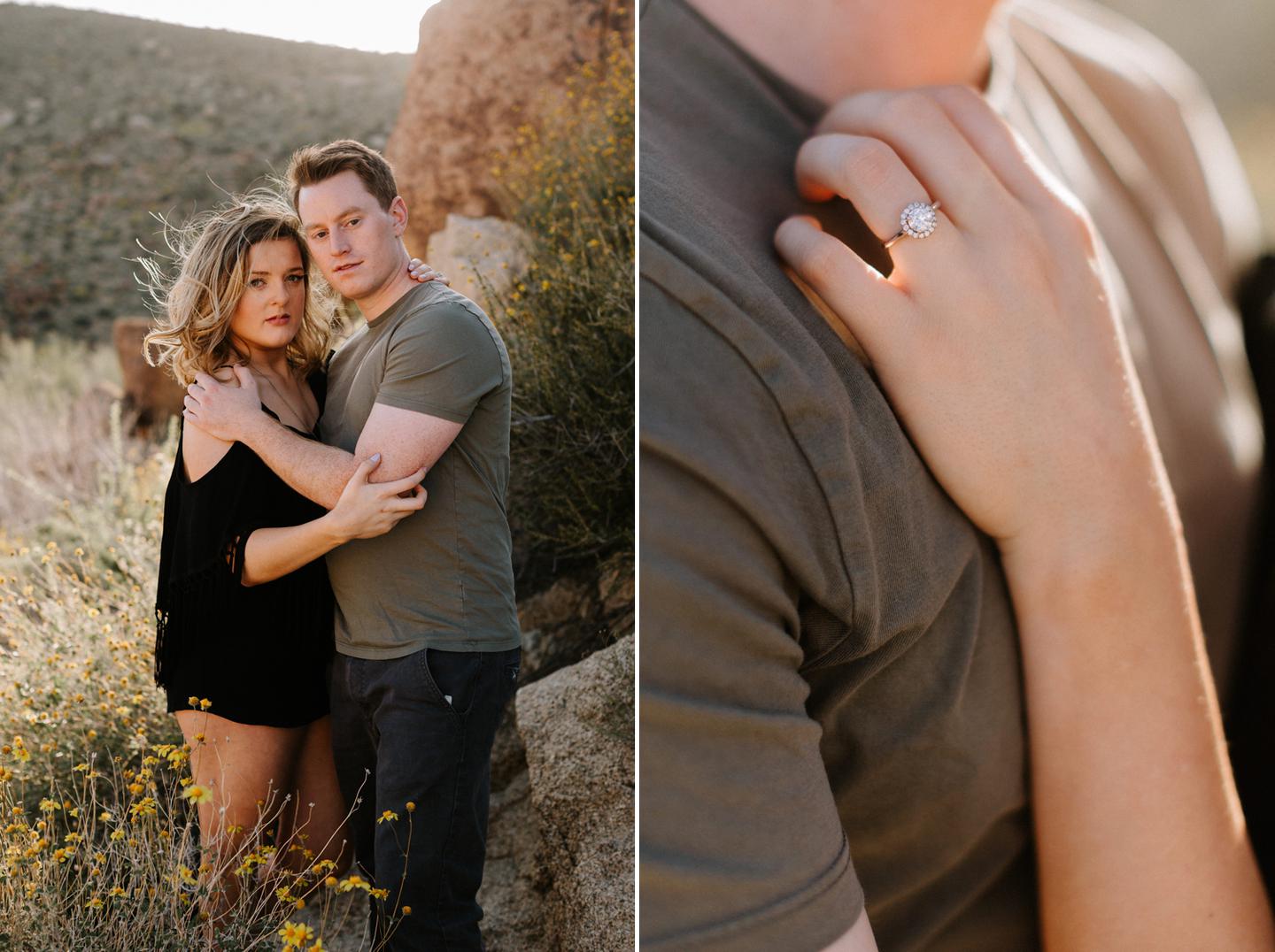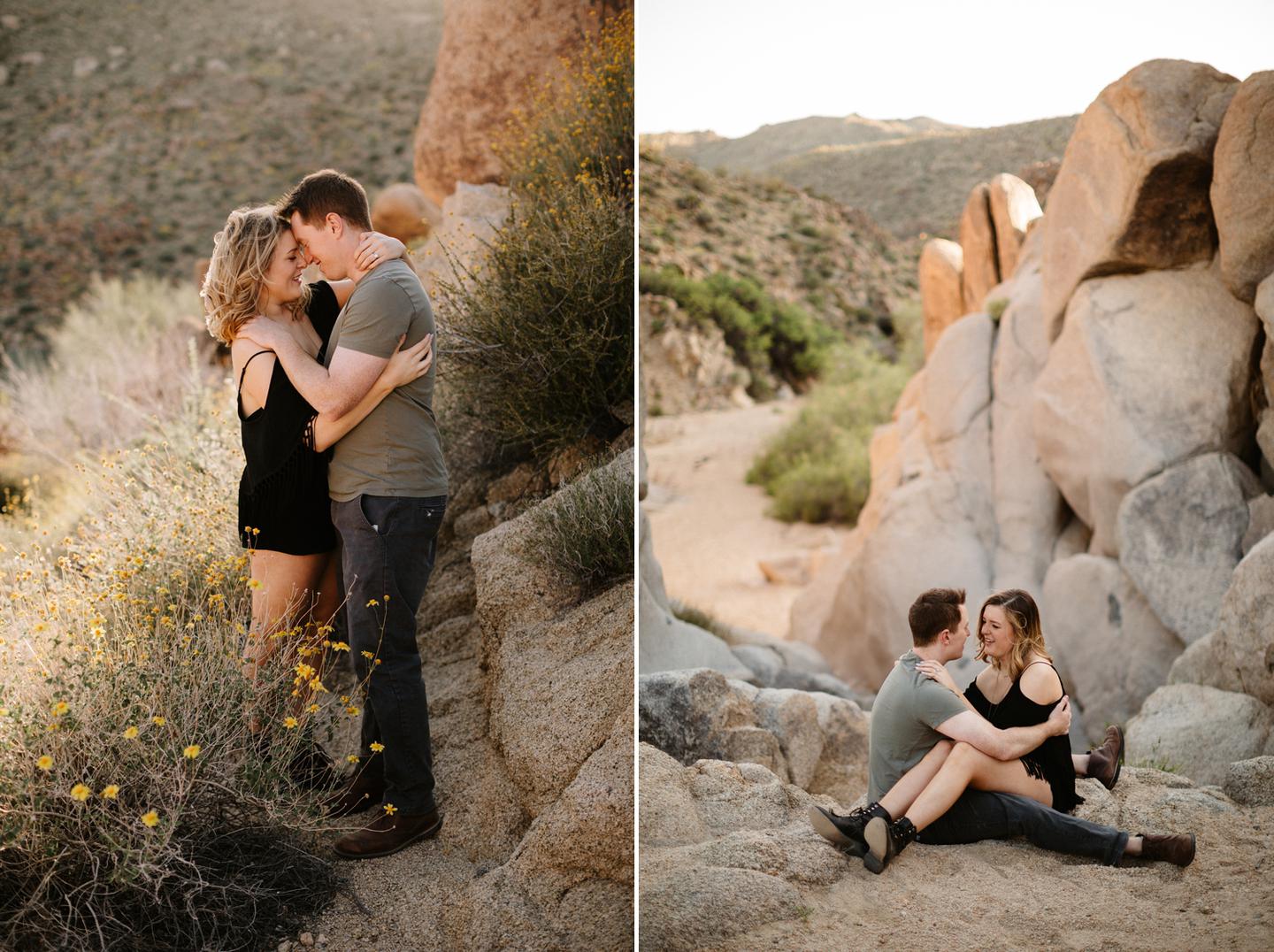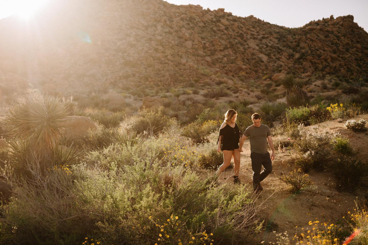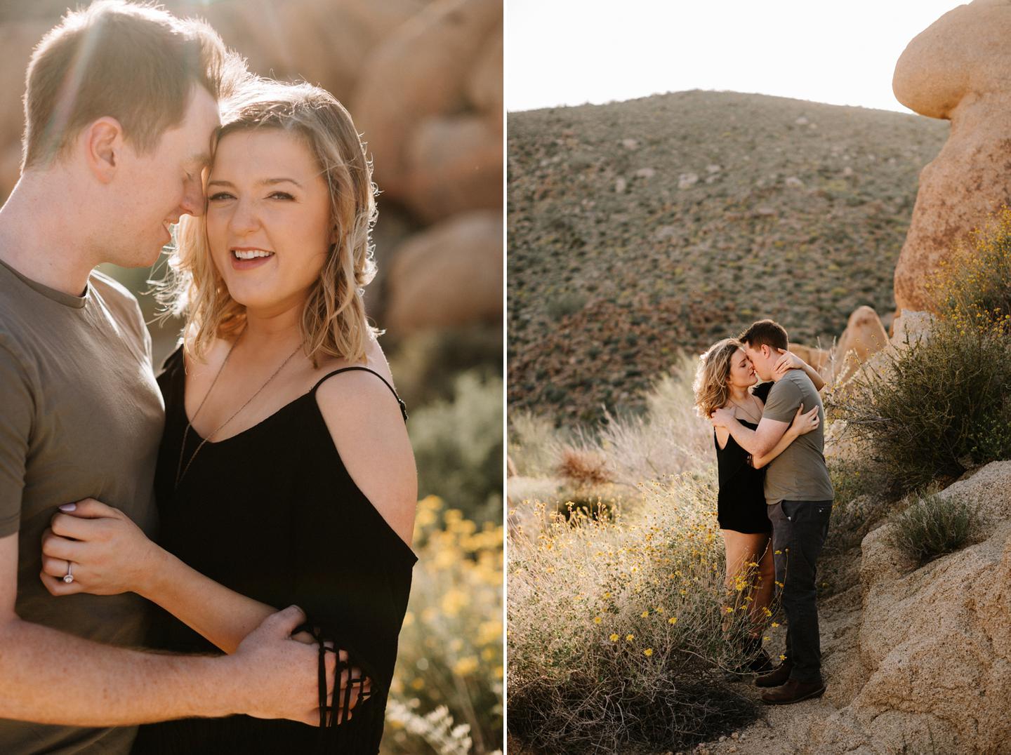 Getting to take Joshua Tree engagement photos is always such a treat. Kalli and Danielย just got engaged like a week and a half ago and I was lucky enough to get to join them and my sisters for a relaxing vacation at his parents AMAZING house in the desert for Coachella right afterward! It was a perfect way to escape the craziness of daily life and the perfect time for them to just appreciate one another and their new engagement! When I suggested we take an adventure out to Joshua Tree for their engagement photos (because its only 45 min from their house!) they were totally game! The desert was blooming like crazy and we were totally in awe when we arrived. Something I love about these two is that they are SO on each otherโs team. After spending a full week with them I really got to see how kind they are to one another, and how constantly supportive they are to each other. They have such a sweet but playful relationship and I am so happy that I got to document a little bit of that during this shoot