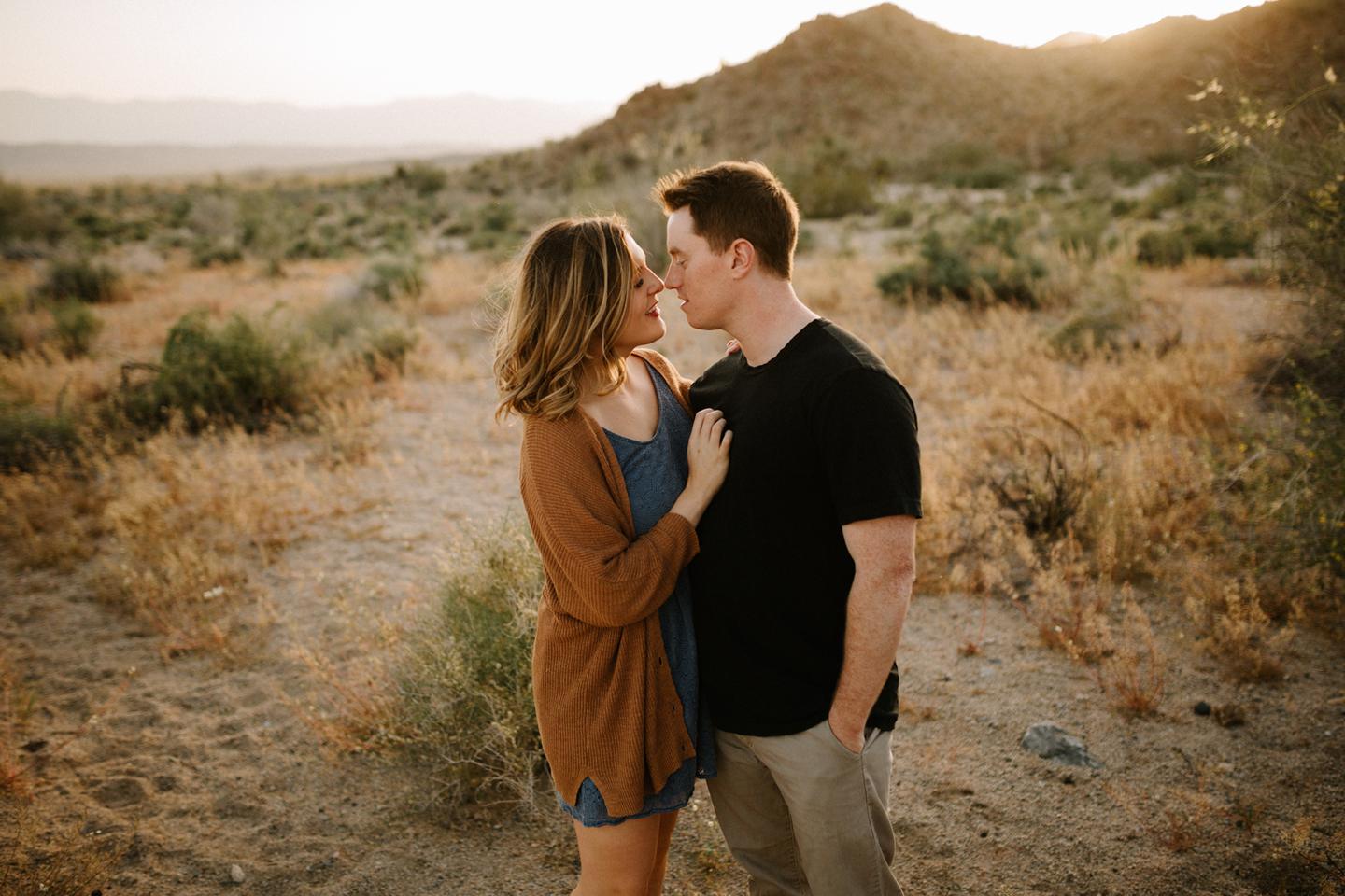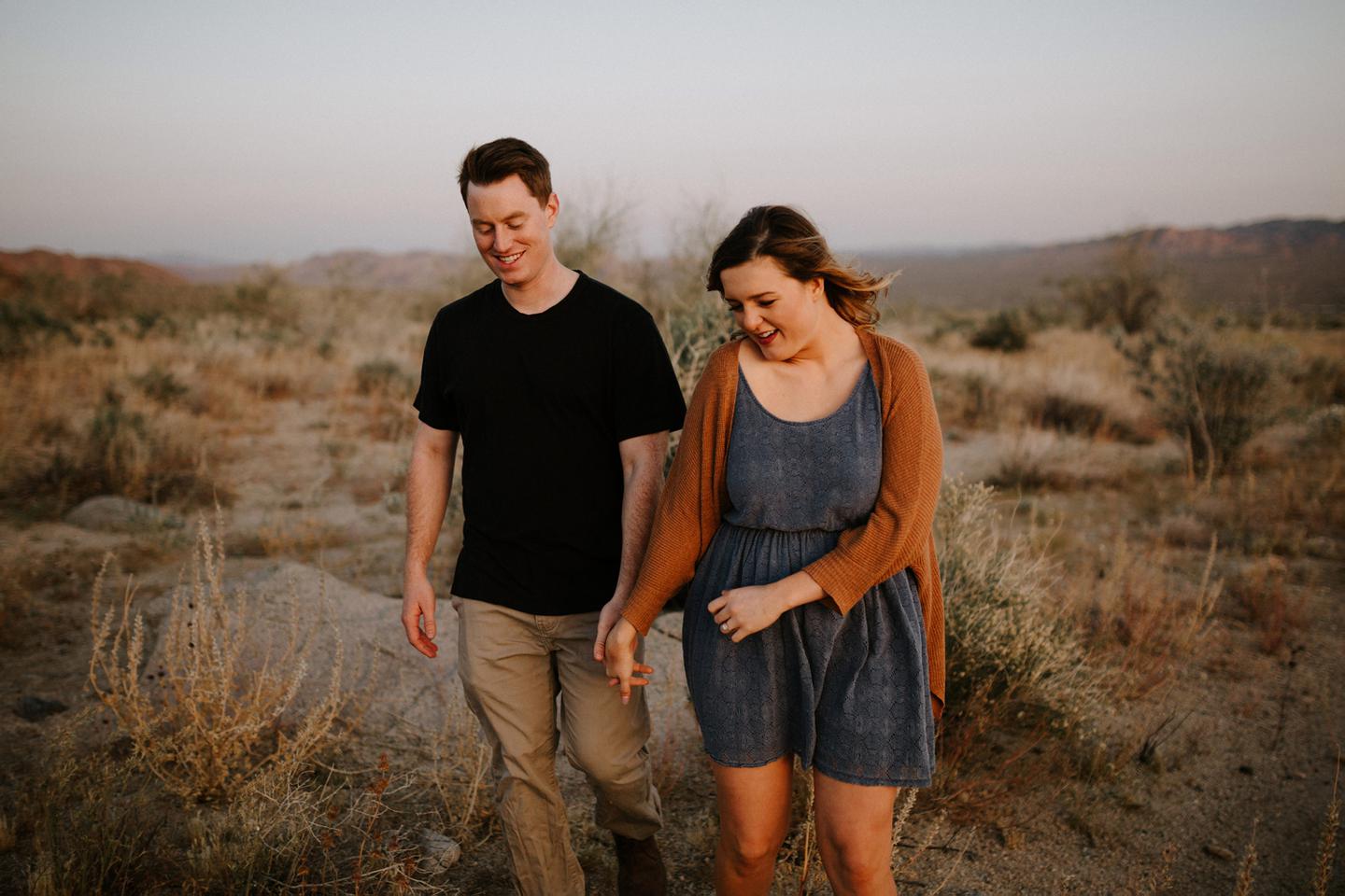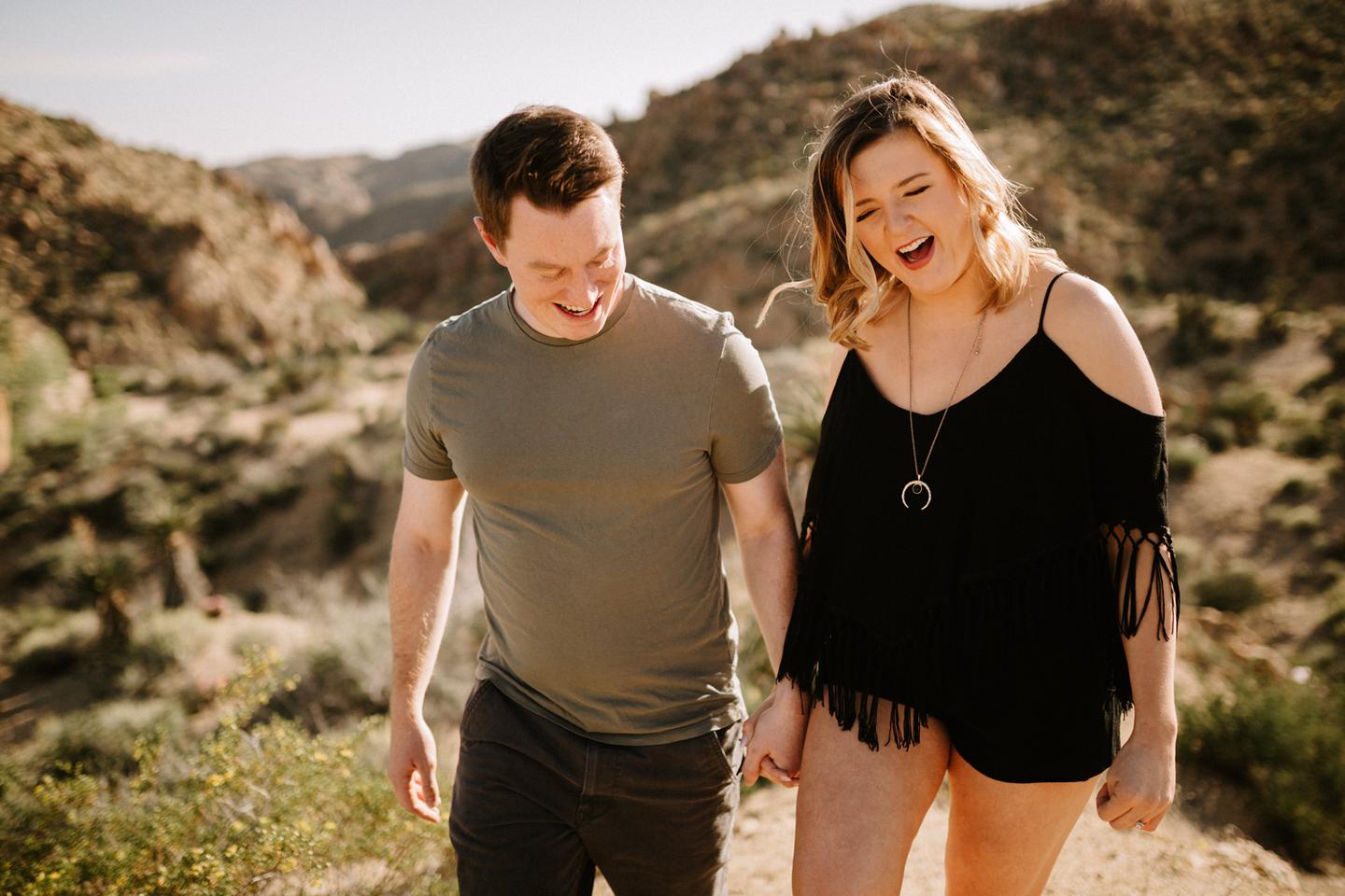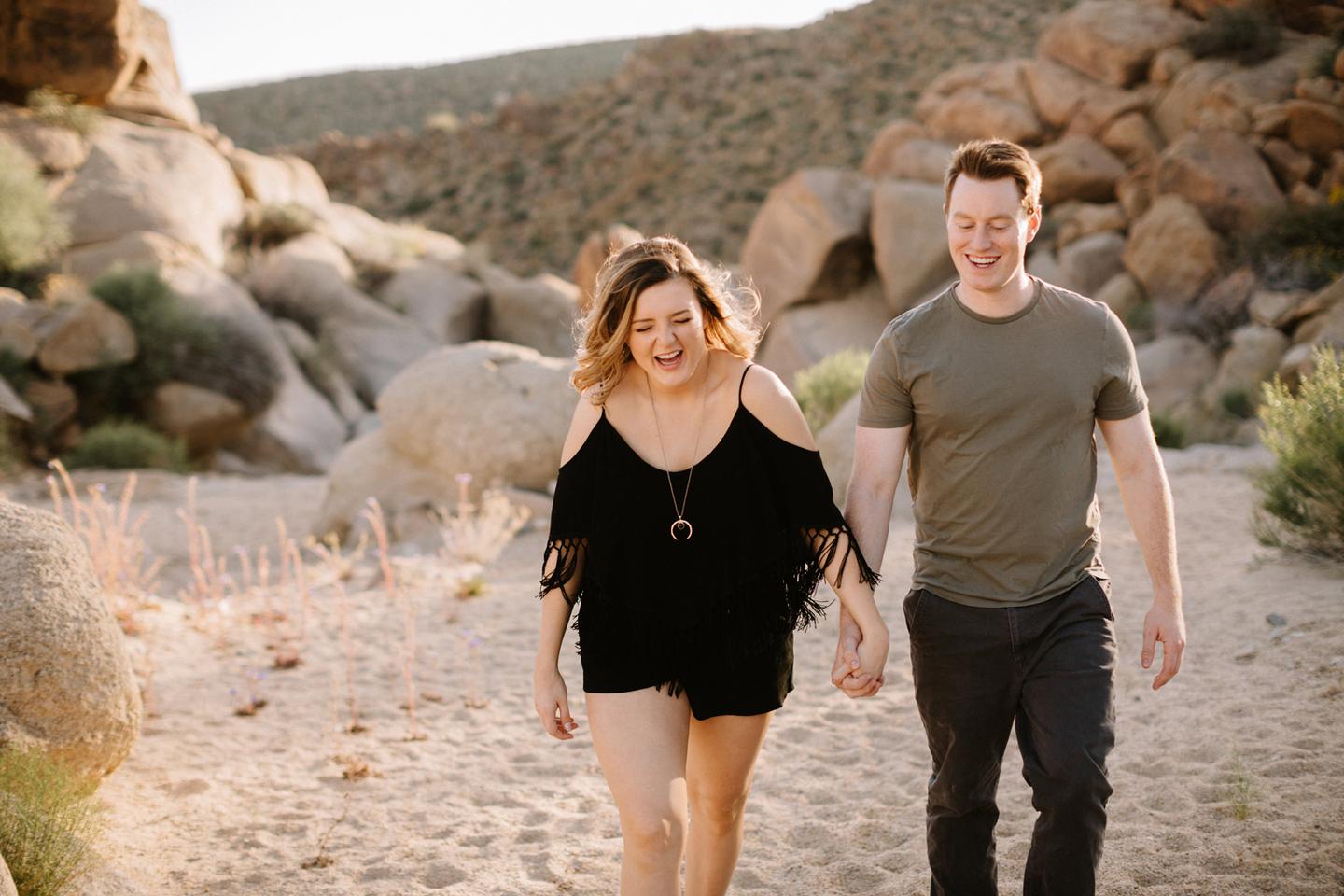 Getting to take Joshua Tree engagement photos is always such a treat. Kalli and Danielย just got engaged like a week and a half ago and I was lucky enough to get to join them and my sisters for a relaxing vacation at his parents AMAZING house in the desert for Coachella right afterward! It was a perfect way to escape the craziness of daily life and the perfect time for them to just appreciate one another and their new engagement! When I suggested we take an adventure out to Joshua Tree for their engagement photos (because its only 45 min from their house!) they were totally game! The desert was blooming like crazy and we were totally in awe when we arrived. Something I love about these two is that they are SO on each otherโs team. After spending a full week with them I really got to see how kind they are to one another, and how constantly supportive they are to each other. They have such a sweet but playful relationship and I am so happy that I got to document a little bit of that during this shoot