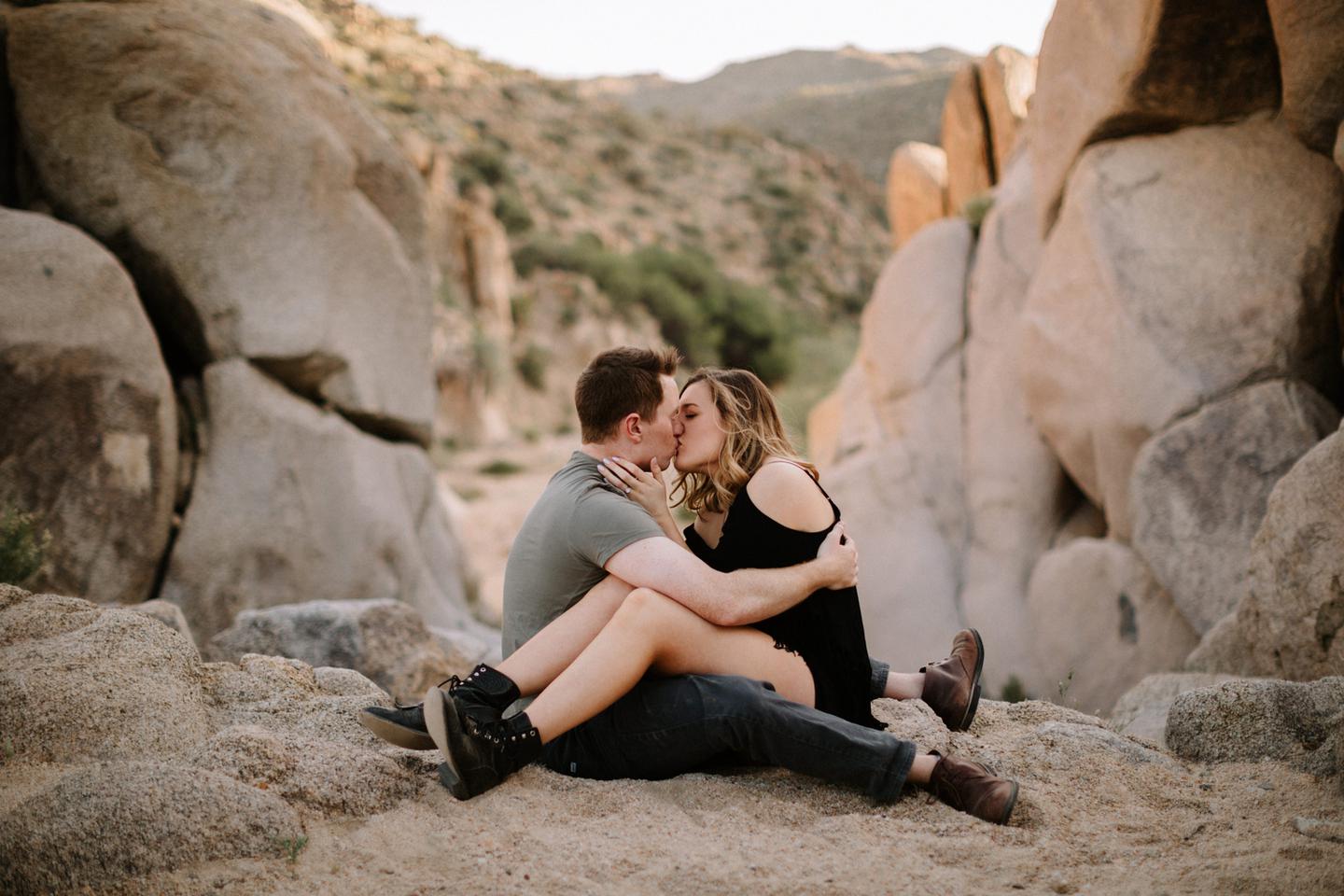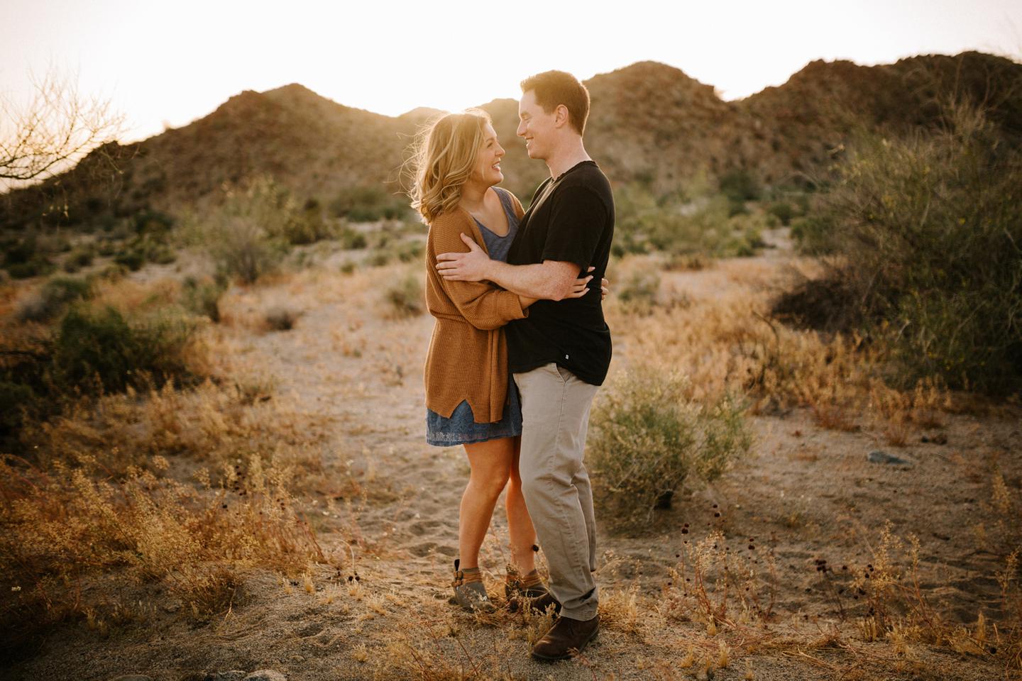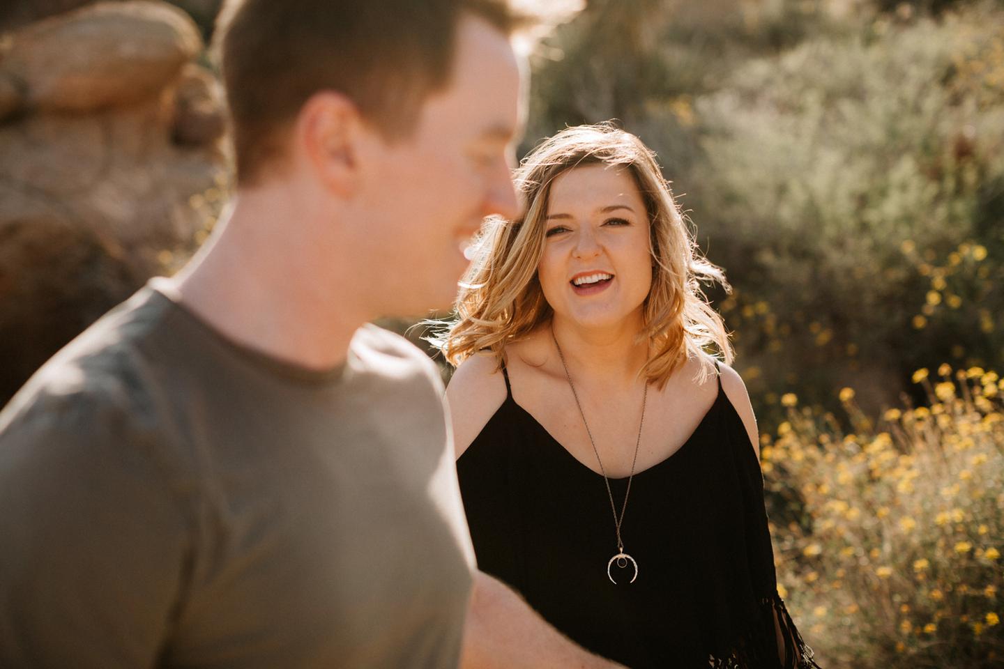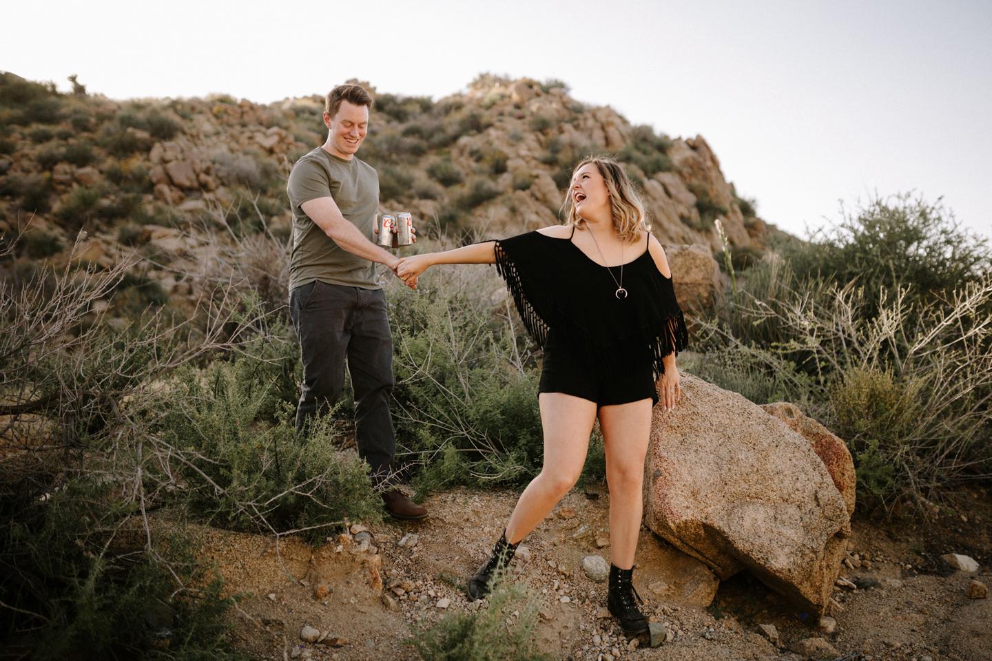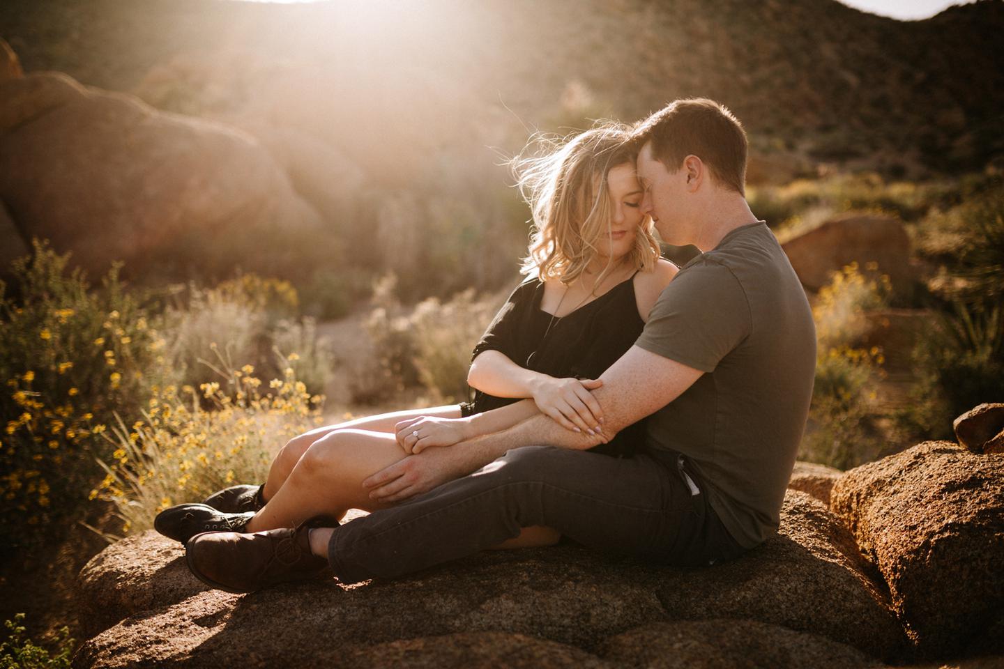 Getting to take Joshua Tree engagement photos is always such a treat. Kalli and Danielย just got engaged like a week and a half ago and I was lucky enough to get to join them and my sisters for a relaxing vacation at his parents AMAZING house in the desert for Coachella right afterward! It was a perfect way to escape the craziness of daily life and the perfect time for them to just appreciate one another and their new engagement! When I suggested we take an adventure out to Joshua Tree for their engagement photos (because its only 45 min from their house!) they were totally game! The desert was blooming like crazy and we were totally in awe when we arrived. Something I love about these two is that they are SO on each otherโs team. After spending a full week with them I really got to see how kind they are to one another, and how constantly supportive they are to each other. They have such a sweet but playful relationship and I am so happy that I got to document a little bit of that during this shoot