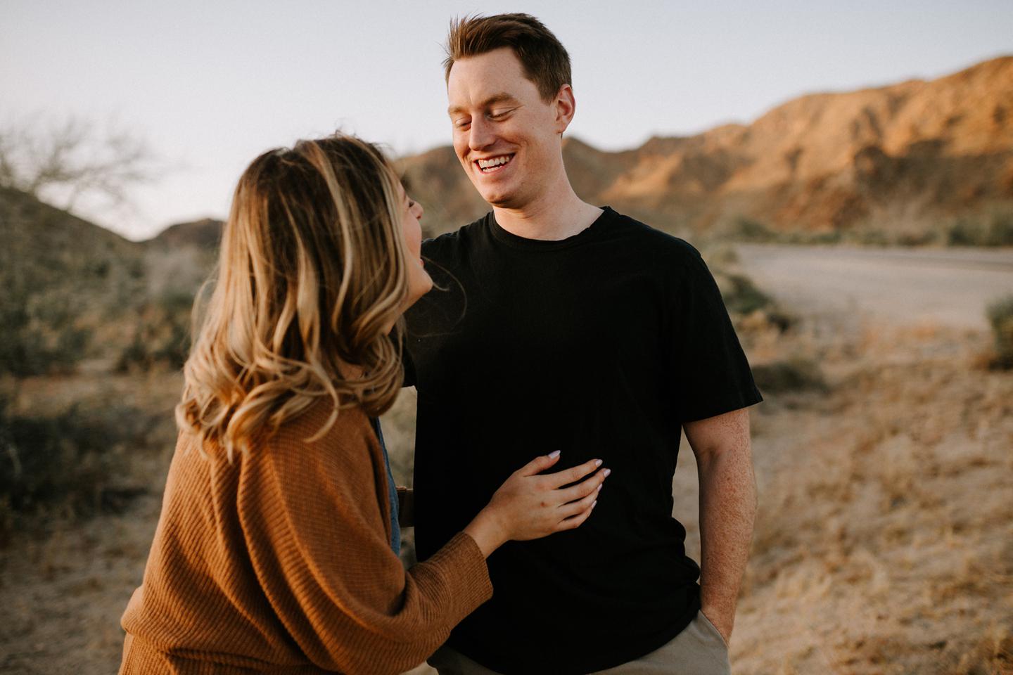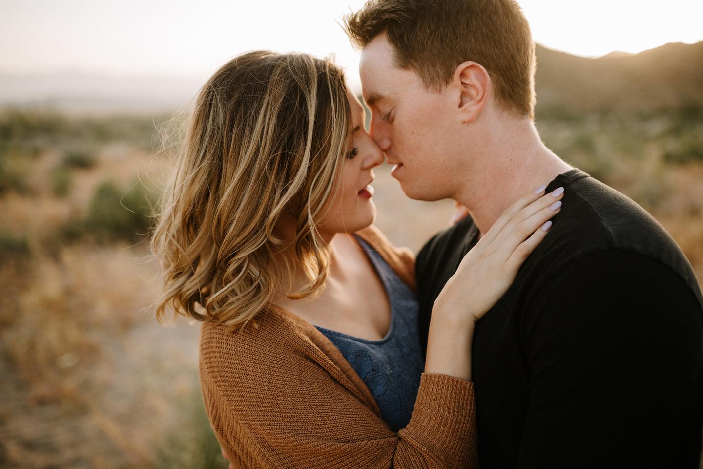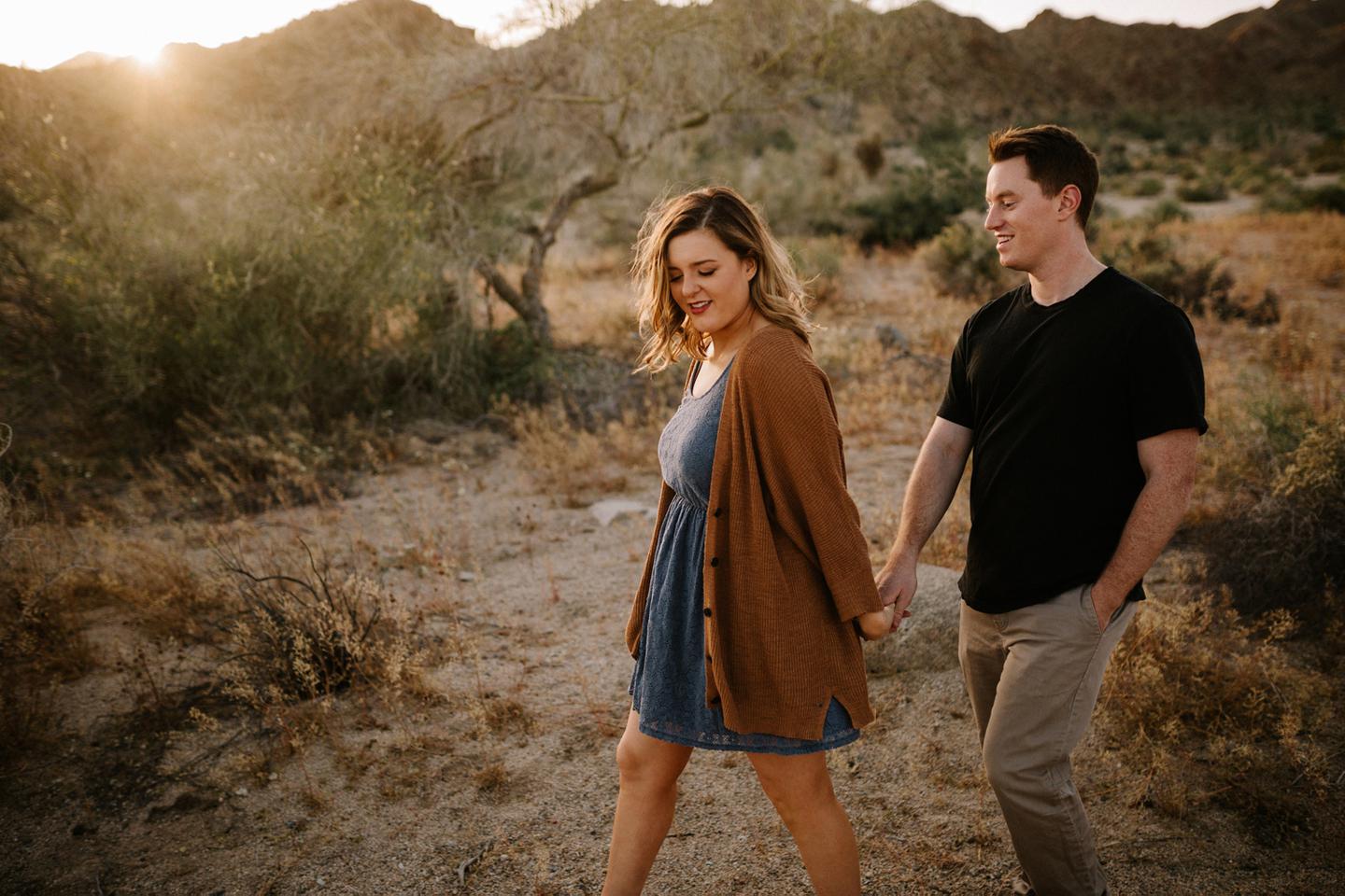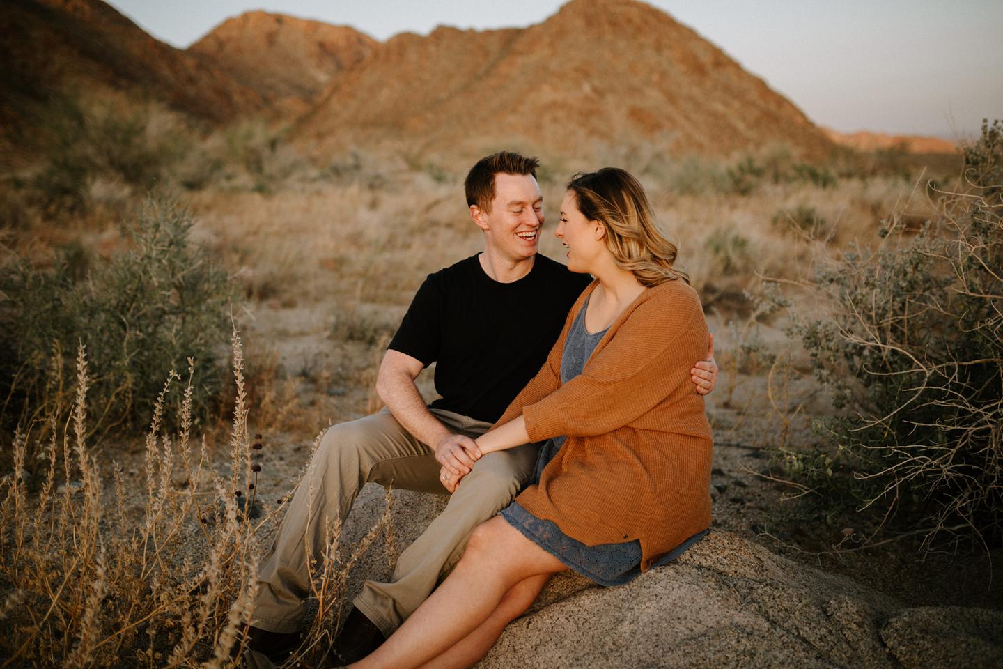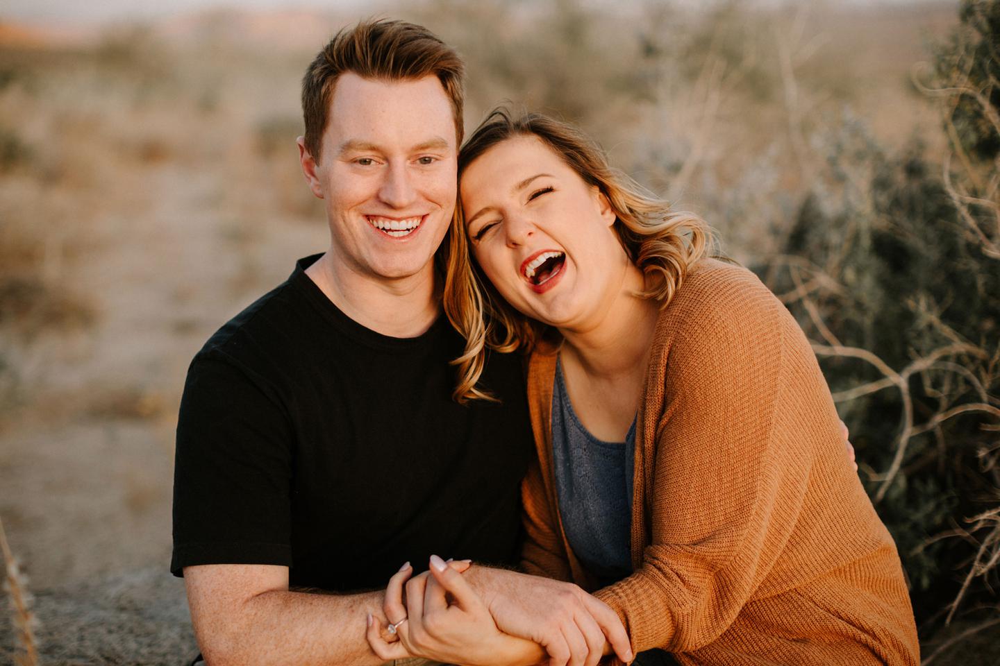 Getting to take Joshua Tree engagement photos is always such a treat. Kalli and Danielย just got engaged like a week and a half ago and I was lucky enough to get to join them and my sisters for a relaxing vacation at his parents AMAZING house in the desert for Coachella right afterward! It was a perfect way to escape the craziness of daily life and the perfect time for them to just appreciate one another and their new engagement! When I suggested we take an adventure out to Joshua Tree for their engagement photos (because its only 45 min from their house!) they were totally game! The desert was blooming like crazy and we were totally in awe when we arrived. Something I love about these two is that they are SO on each otherโs team. After spending a full week with them I really got to see how kind they are to one another, and how constantly supportive they are to each other. They have such a sweet but playful relationship and I am so happy that I got to document a little bit of that during this shoot
