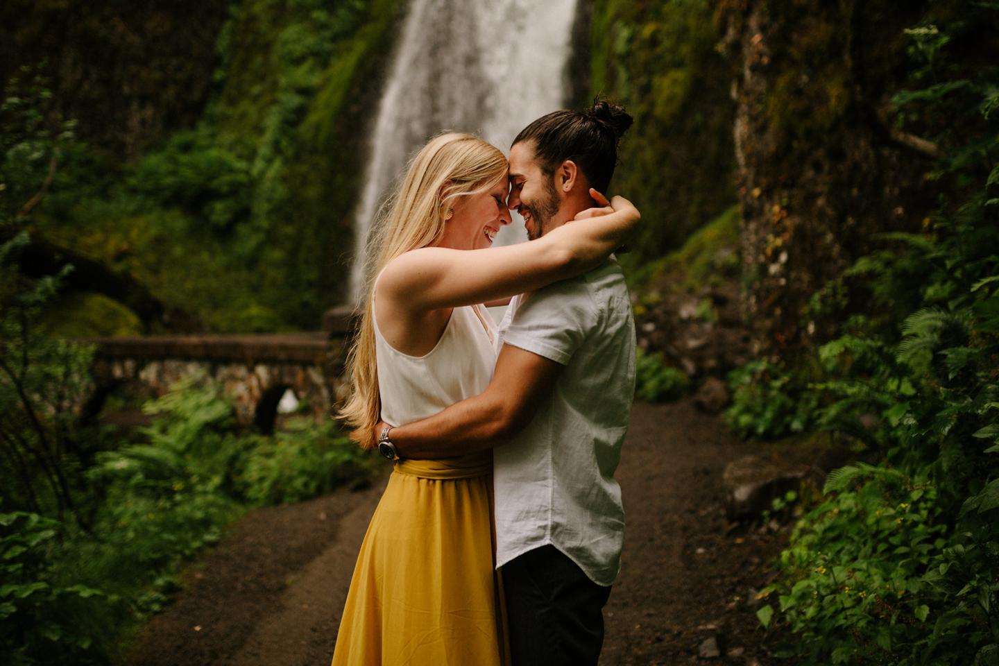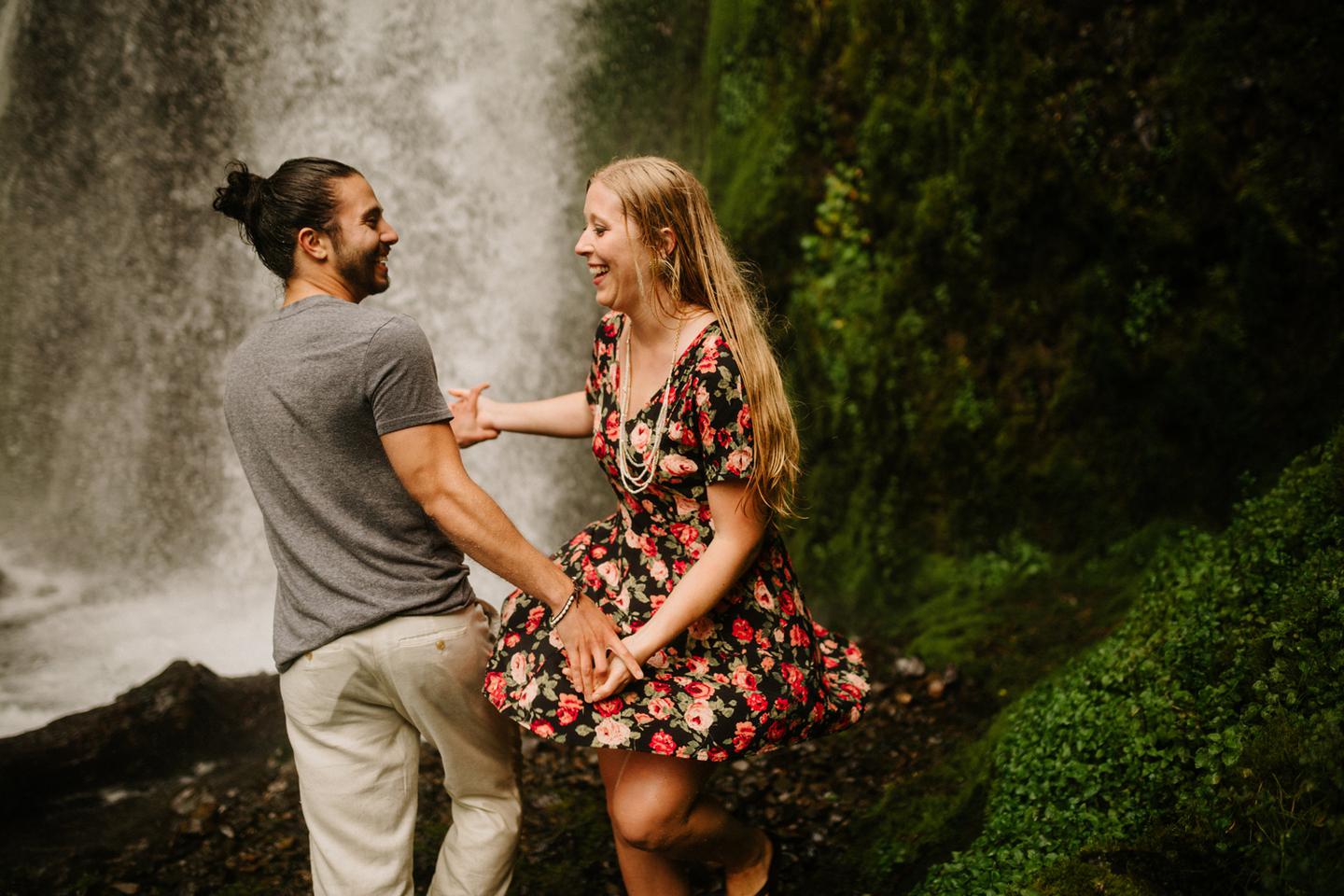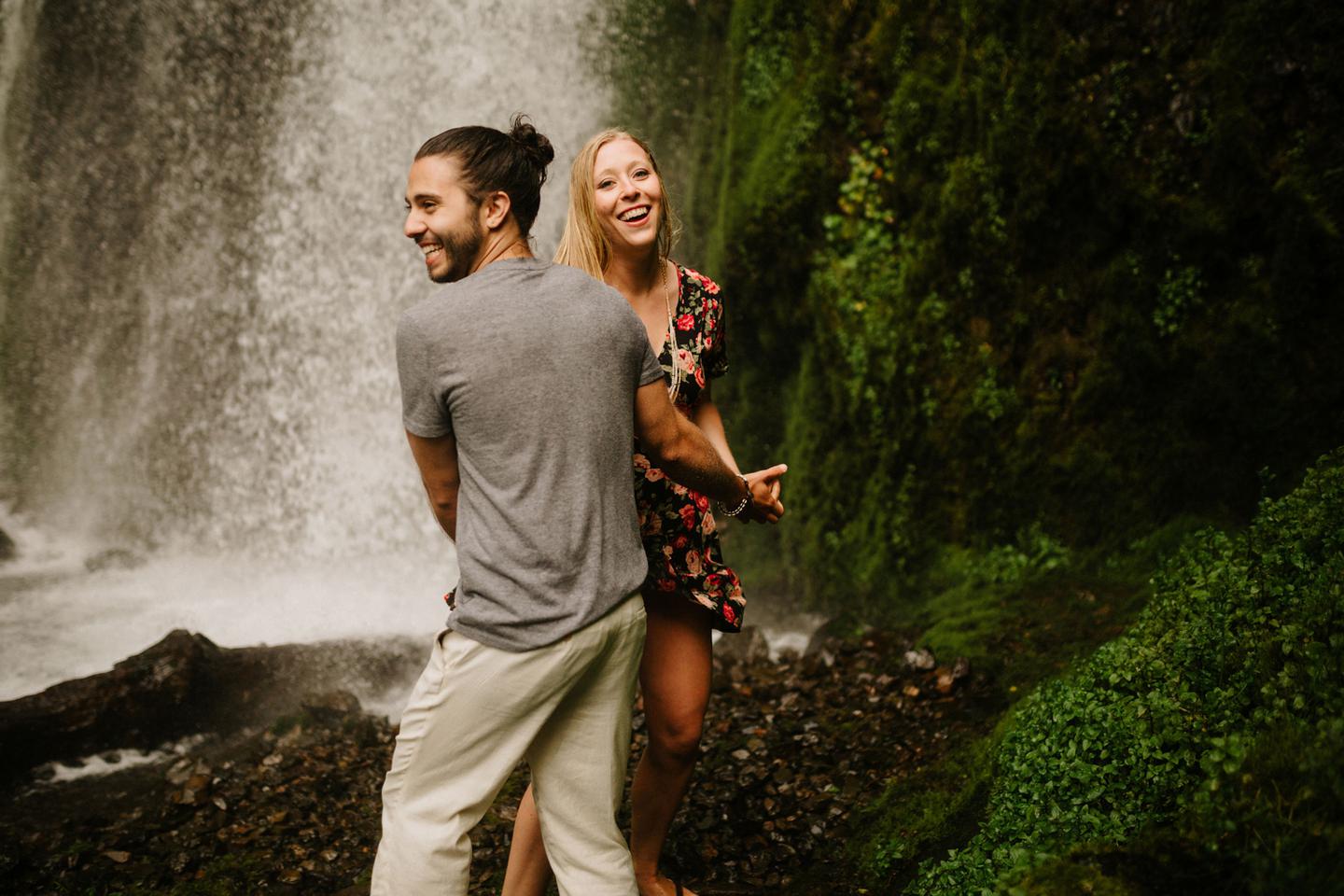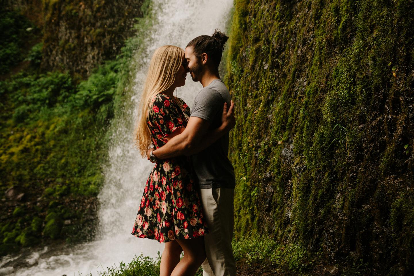 It was cold day in June and it looked like it might rain at any second, yet we found ourselves standing under a waterfall. You know, normal Oregon things. These two flew in from the midwest for a Columbia River Gorge engagement session. She’s a doctor. He’s a male nurse. They defy gender roles, are super playful, and they were 100% okay with freezing their butts off for some epic photos. My kind of people. This engagement shoot was blast