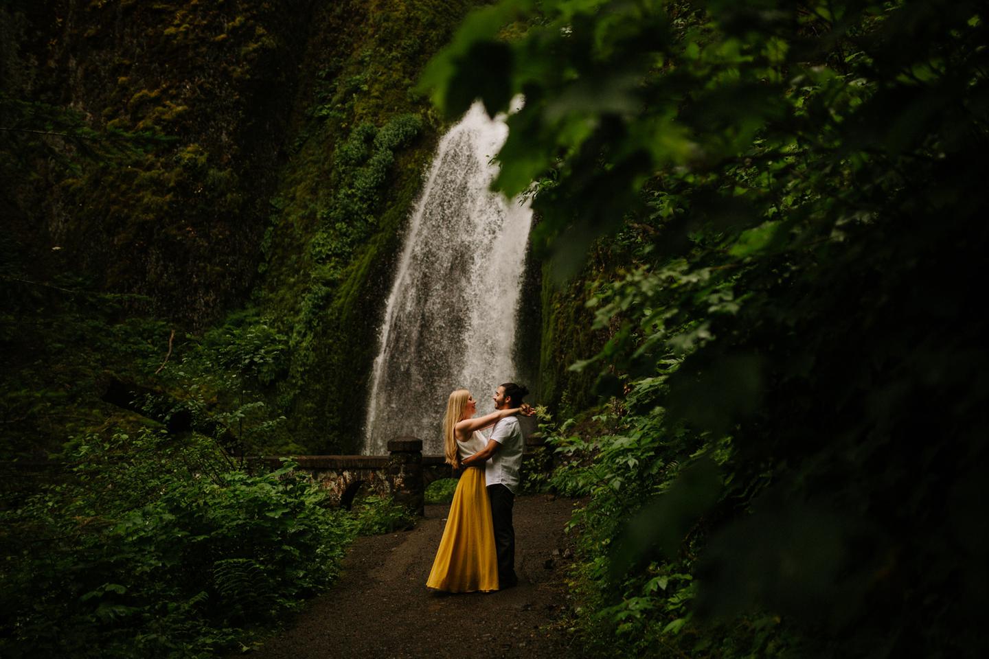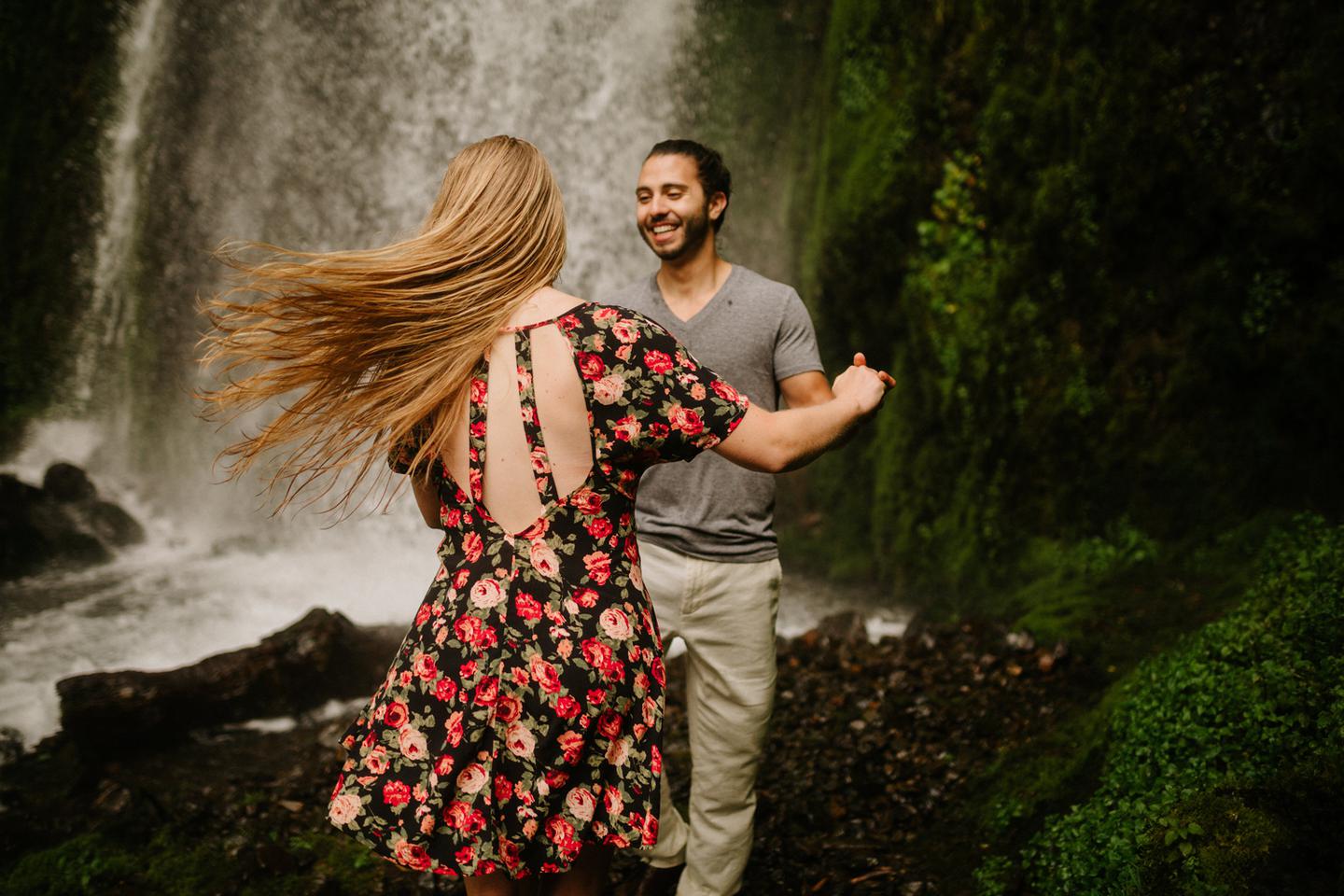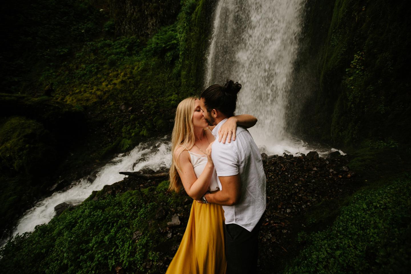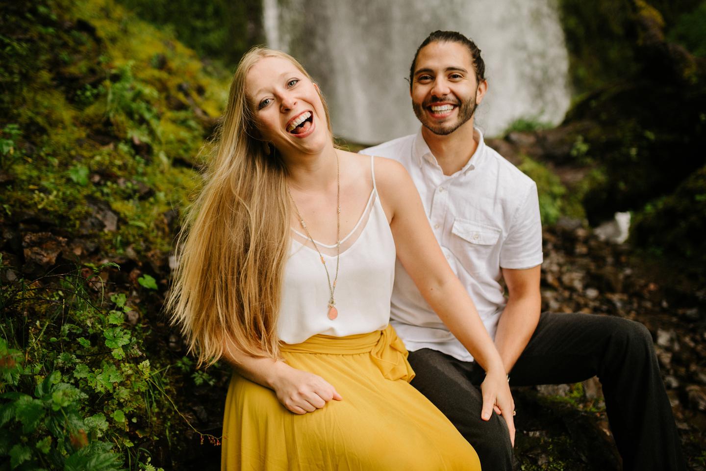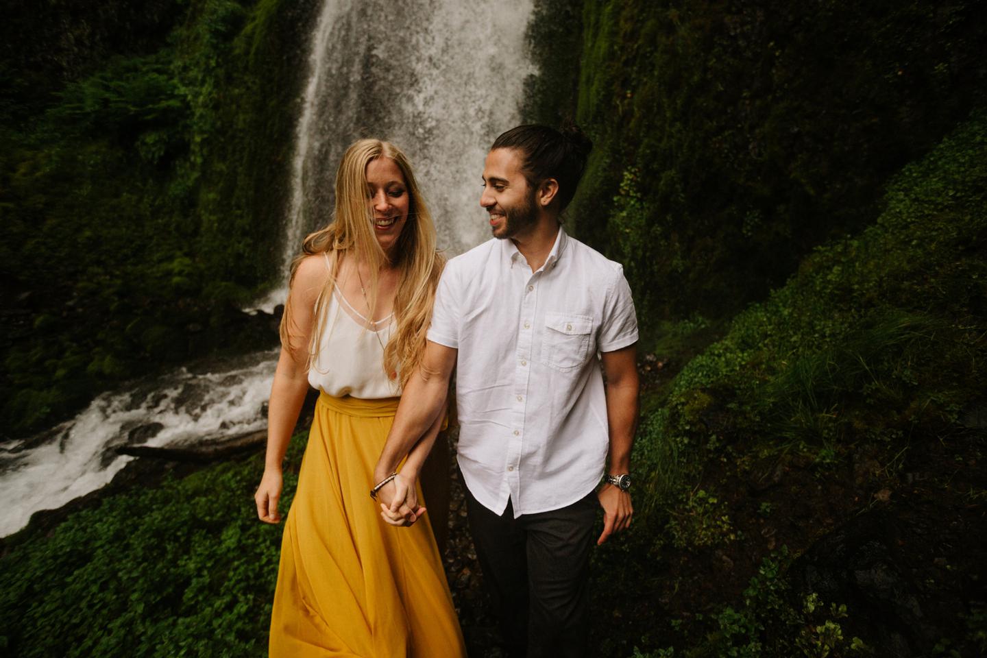 It was cold day in June and it looked like it might rain at any second, yet we found ourselves standing under a waterfall. You know, normal Oregon things. These two flew in from the midwest for a Columbia River Gorge engagement session. She’s a doctor. He’s a male nurse. They defy gender roles, are super playful, and they were 100% okay with freezing their butts off for some epic photos. My kind of people. This engagement shoot was blast
