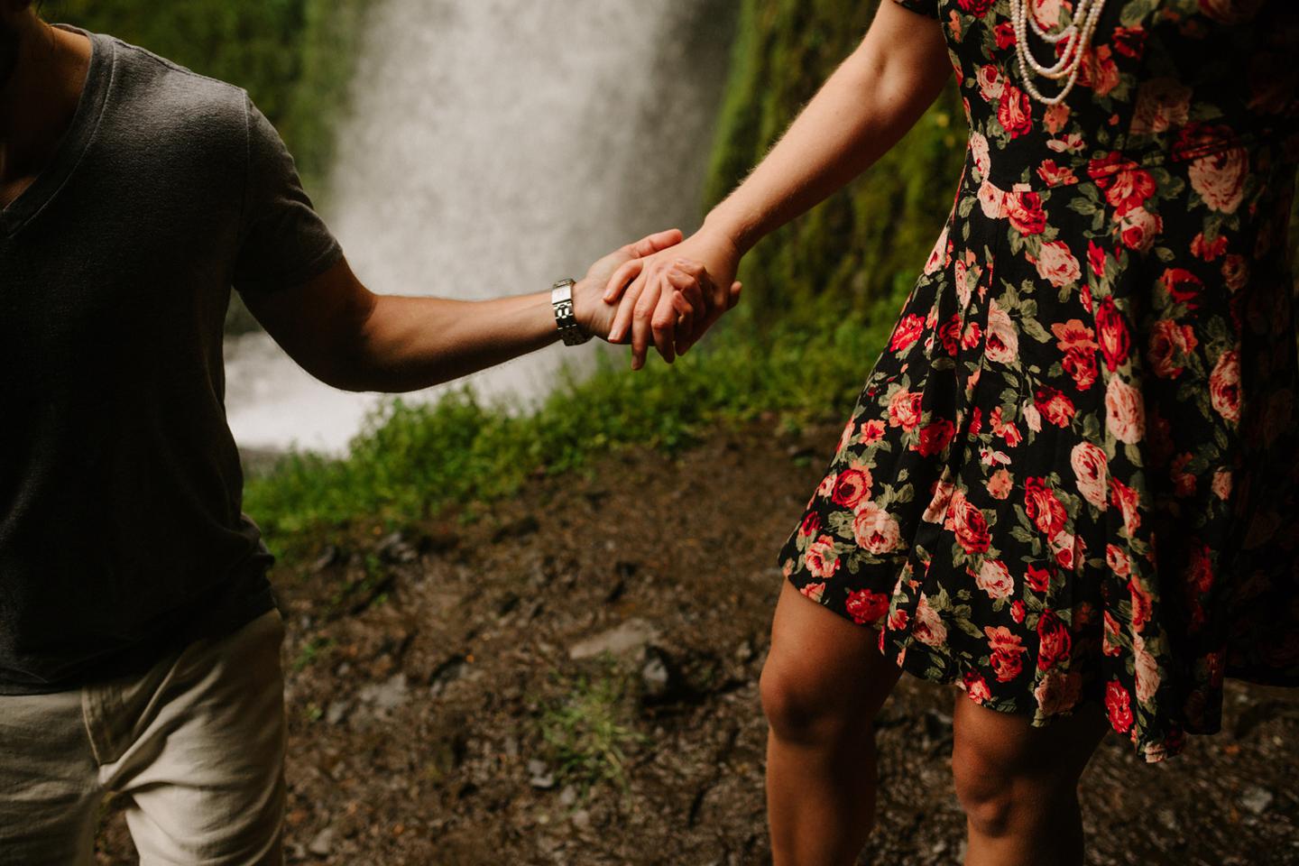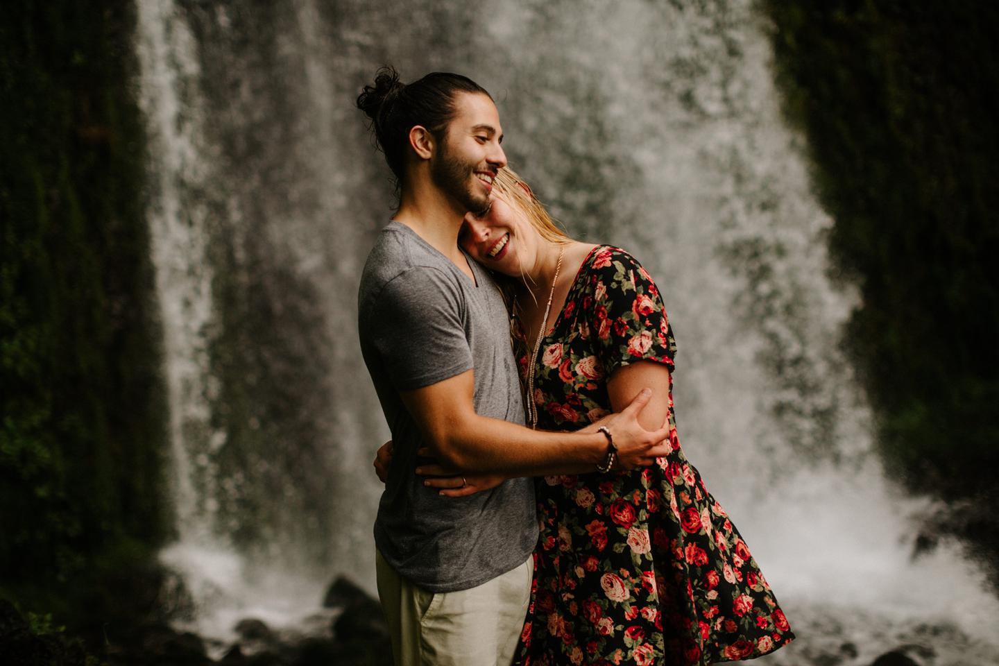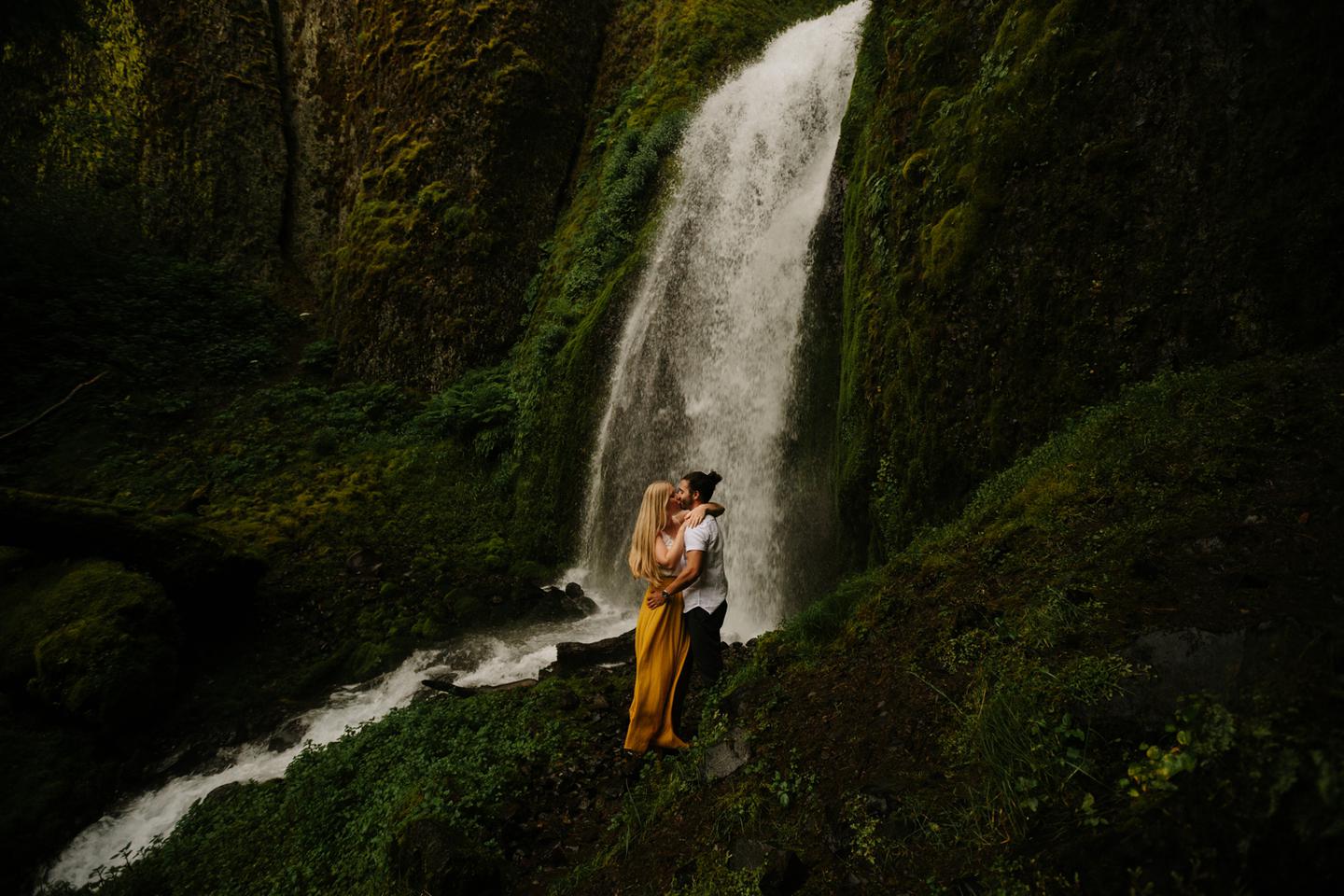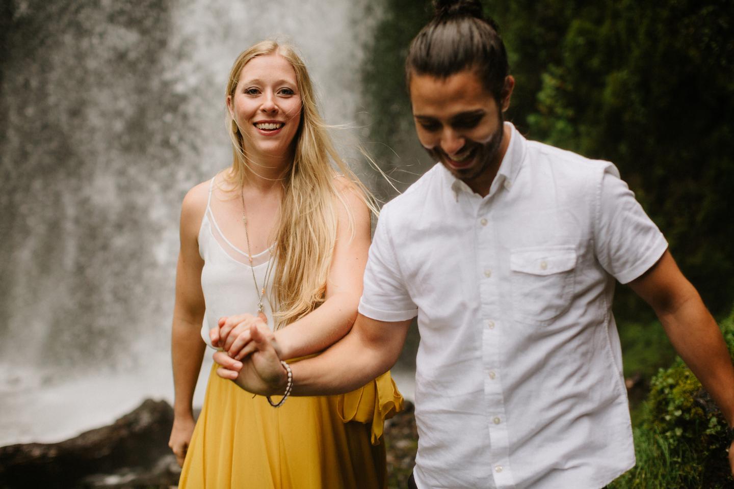 It was cold day in June and it looked like it might rain at any second, yet we found ourselves standing under a waterfall. You know, normal Oregon things. These two flew in from the midwest for a Columbia River Gorge engagement session. She’s a doctor. He’s a male nurse. They defy gender roles, are super playful, and they were 100% okay with freezing their butts off for some epic photos. My kind of people. This engagement shoot was blast