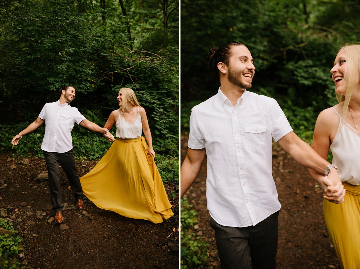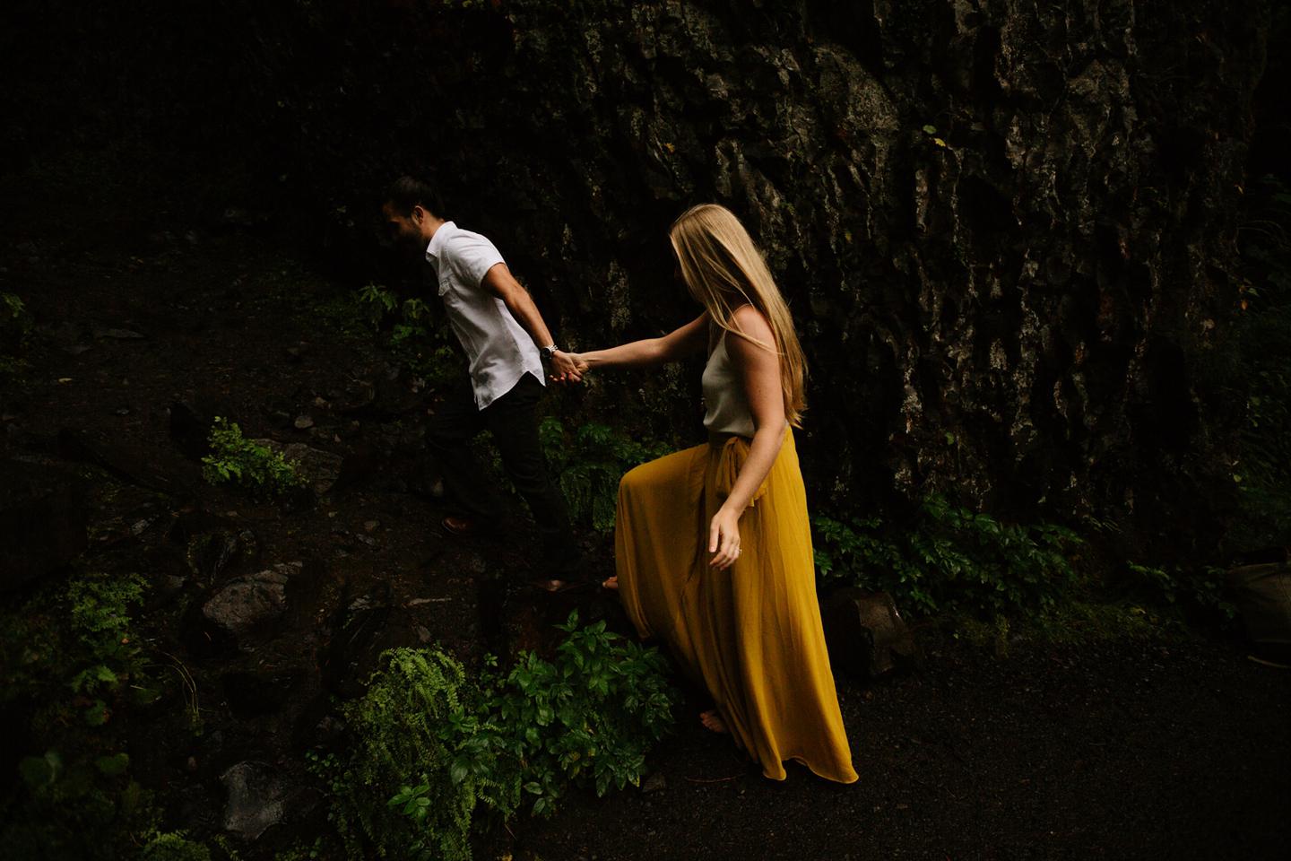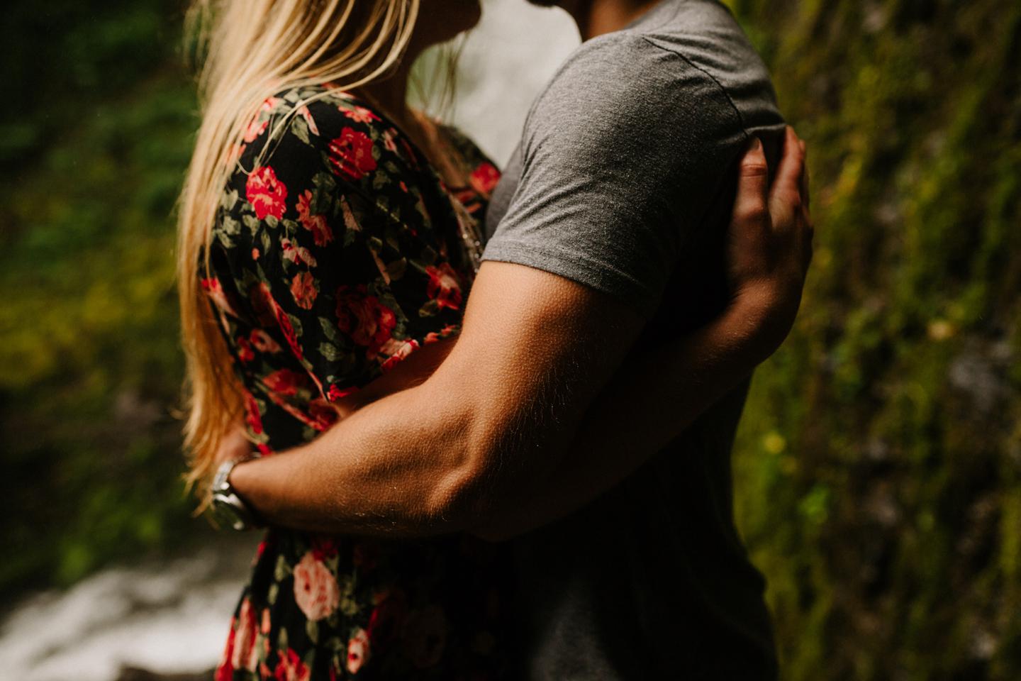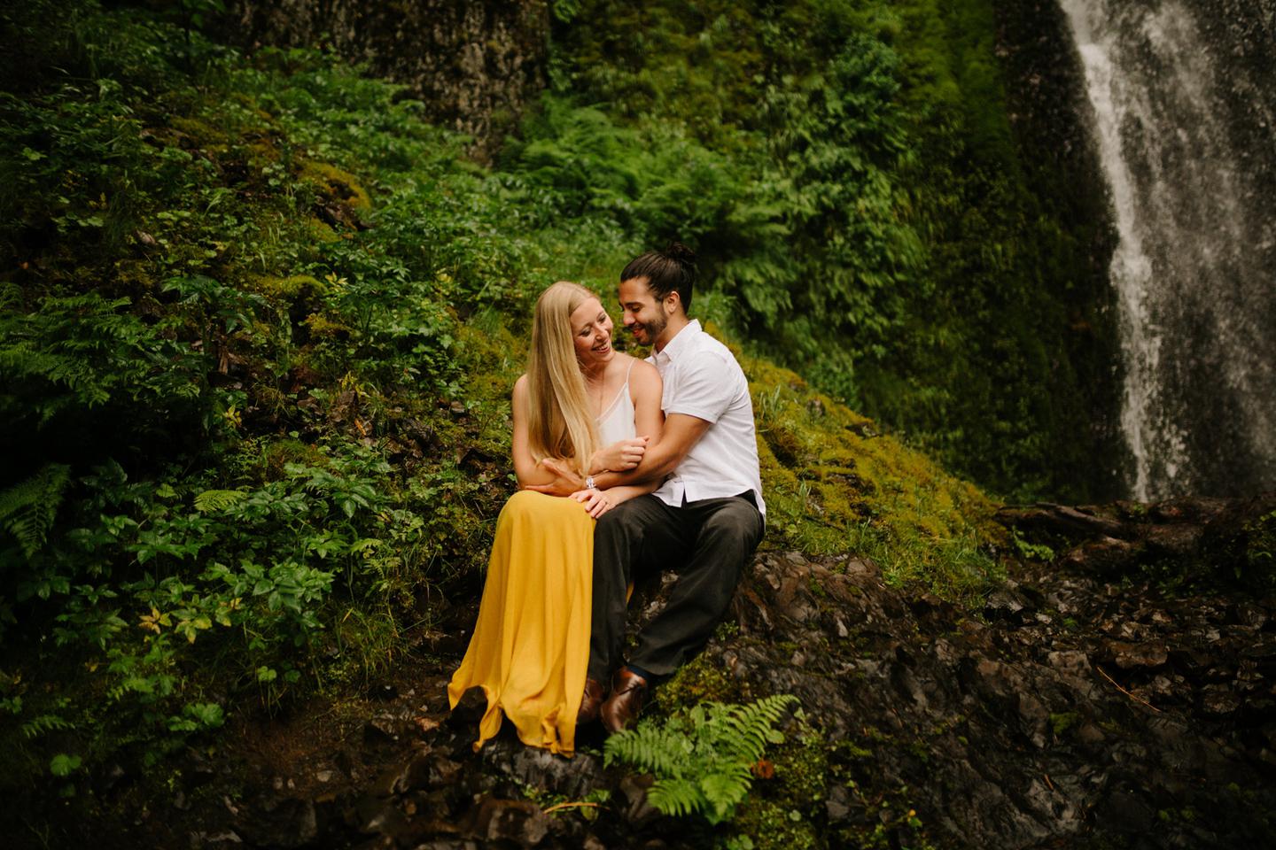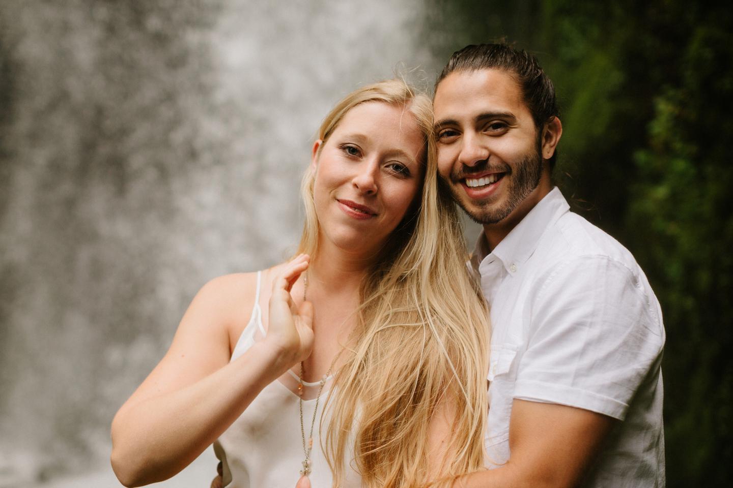 It was cold day in June and it looked like it might rain at any second, yet we found ourselves standing under a waterfall. You know, normal Oregon things. These two flew in from the midwest for a Columbia River Gorge engagement session. She’s a doctor. He’s a male nurse. They defy gender roles, are super playful, and they were 100% okay with freezing their butts off for some epic photos. My kind of people. This engagement shoot was blast