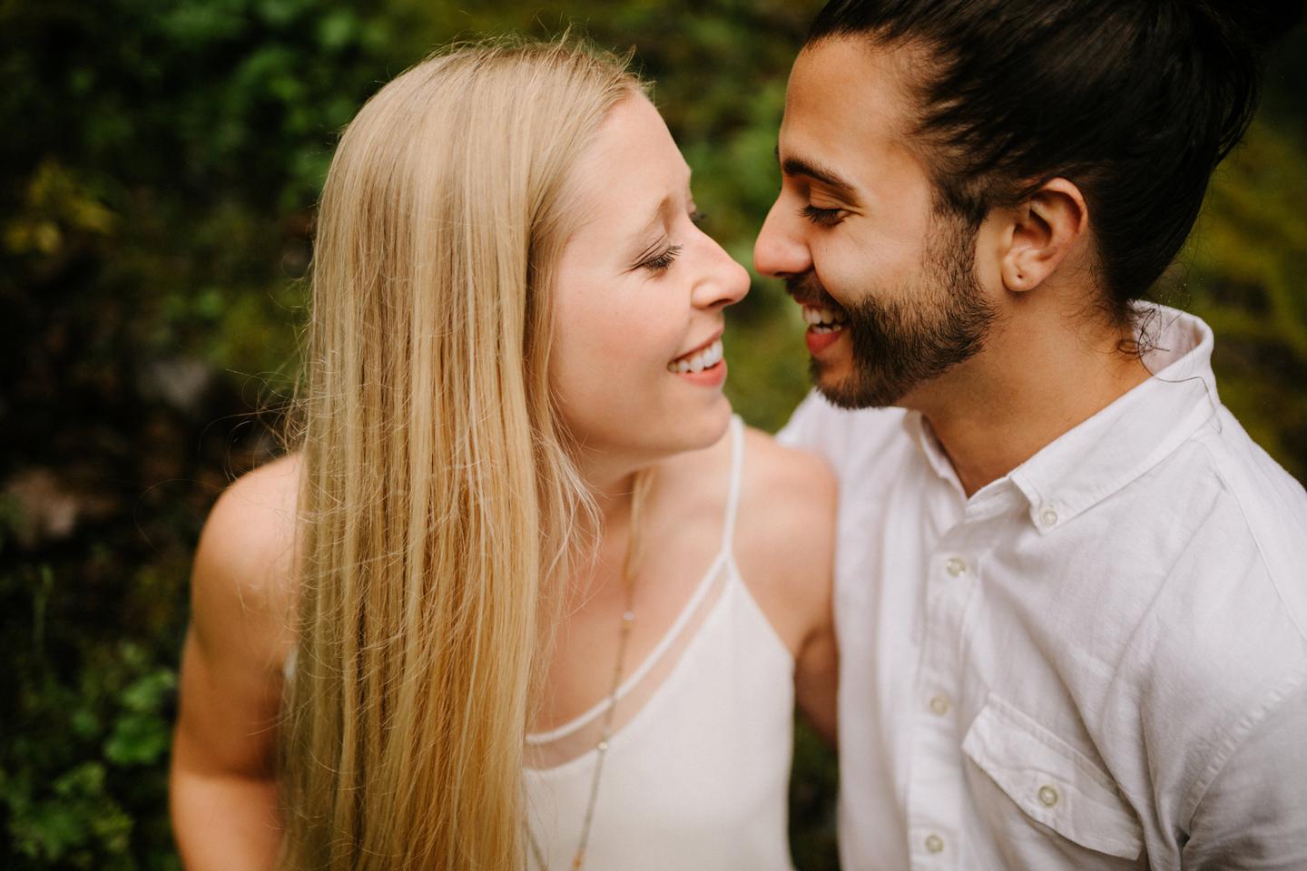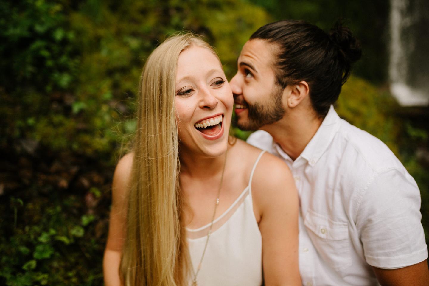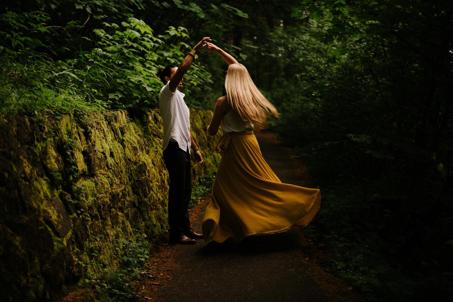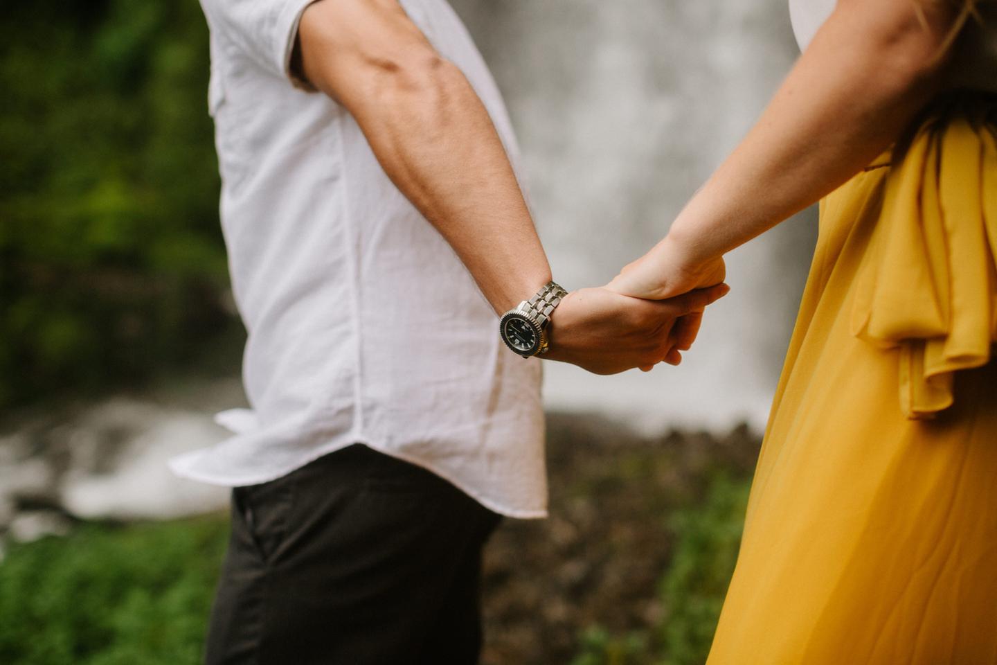 It was cold day in June and it looked like it might rain at any second, yet we found ourselves standing under a waterfall. You know, normal Oregon things. These two flew in from the midwest for a Columbia River Gorge engagement session. She’s a doctor. He’s a male nurse. They defy gender roles, are super playful, and they were 100% okay with freezing their butts off for some epic photos. My kind of people. This engagement shoot was blast