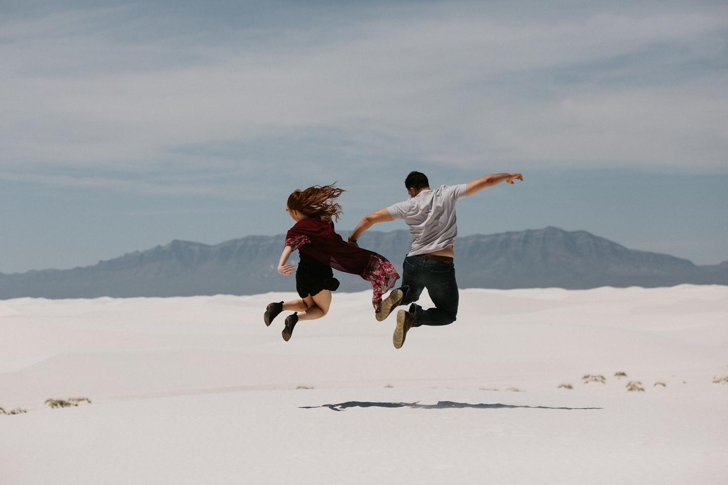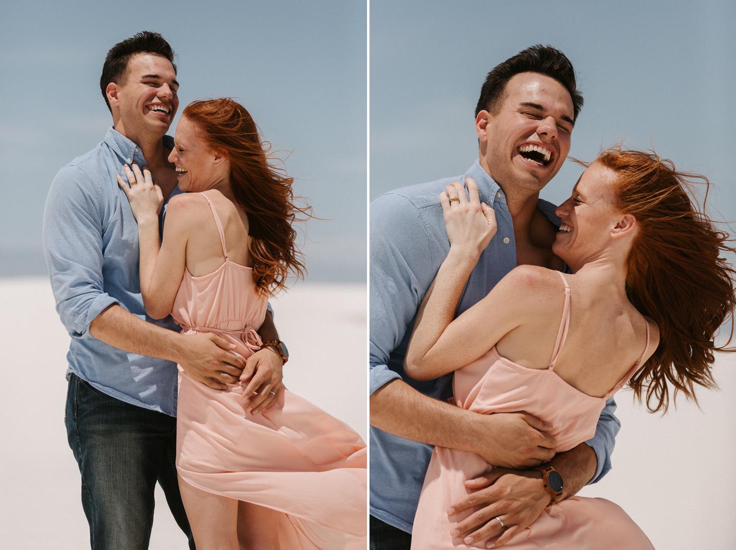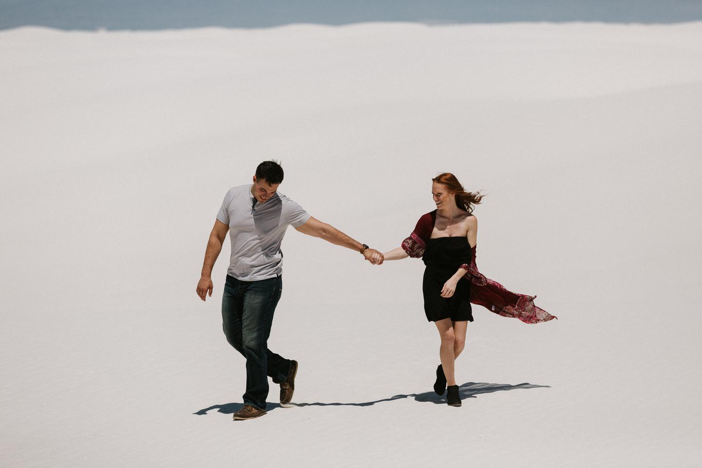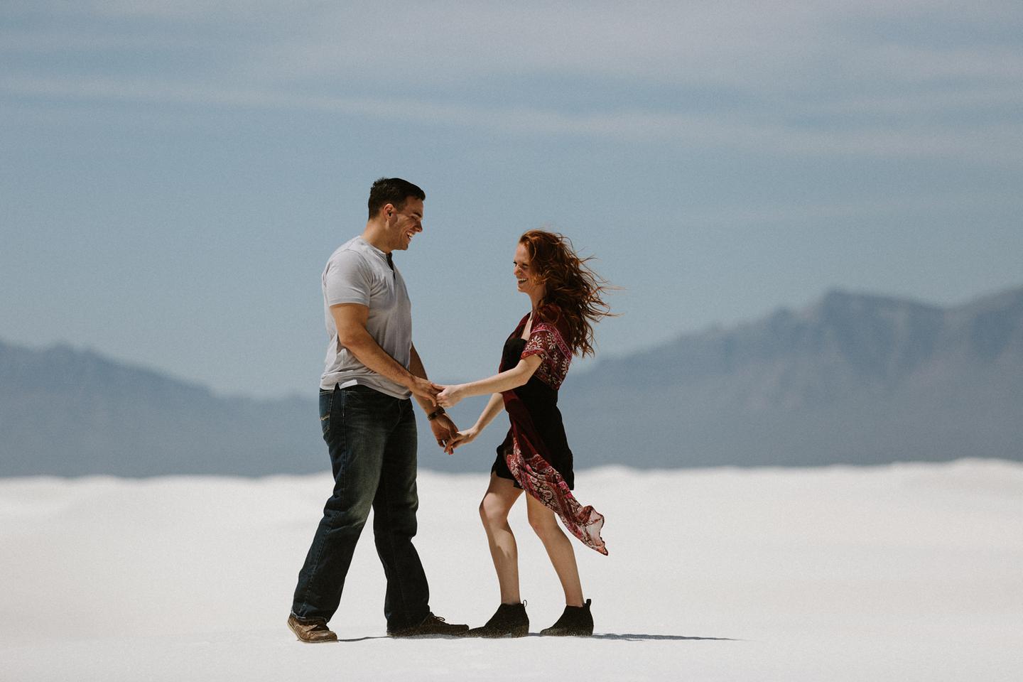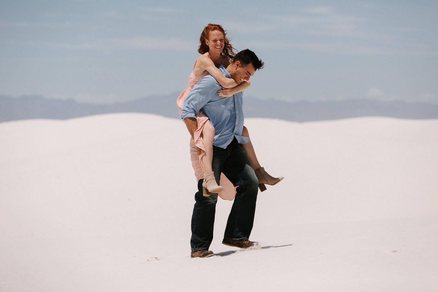 It was hot. It was sandy. And it was crazy bright. It was the perfect challenge. I took these New Mexico engagement photos while wearing sunglasses. I felt like I was shooting completely blind because I couldn’t see my LCD screen at all. I shot these with a lens I rarely use for portraits. I shot them at a much smaller aperture than I usually use. I shot them at exactly high noon, something I NEVER do unless I have to. Basically, I did the exact opposite of everything I normally do, and you know what? The shots still came out awesome. Jessica and Andrew hosted me in El Paso for one night while I was road-tripping across Texas in May (you can see landscape shots from my trip here!).I had never met them before, but Jessica is an amazing photographer herself (seriously, go check out her site! **https://sparrowandgold.com/ **) and we connected through an awesome Facebook group. They were such incredible hosts and I was thrilled when they were down to take a short trip out to White Sands New Mexico the next morning! We originally planned on being there at sunrise, but margaritas and a need for sleep stopped that. So we arrived at noon and I got to experience one of the most challenging, but simultaneously rewarding sessions that I have ever done. These two are so playful, kind, and perfect together. There was so much laughter and sweetness between them and it was so easy to just hang out at White Sands and document them being their normal selves. I cannot thank them enough for hosting me and for taking me out there! I can’t wait to go back again someday