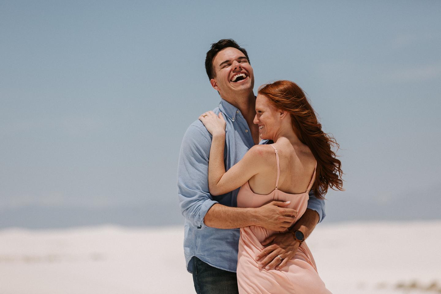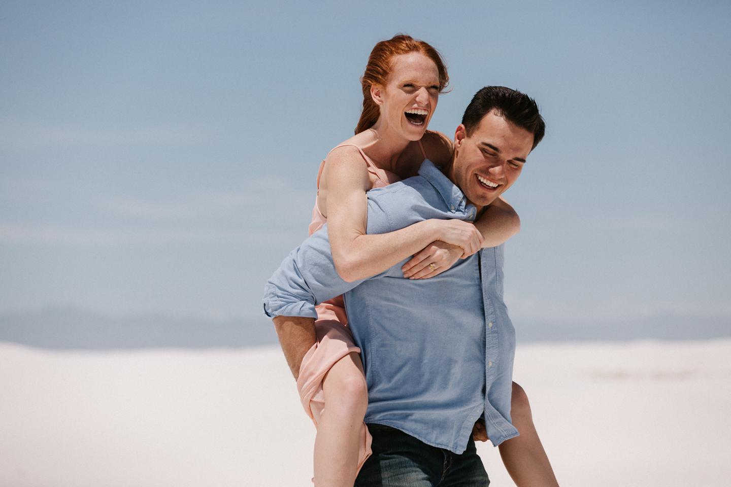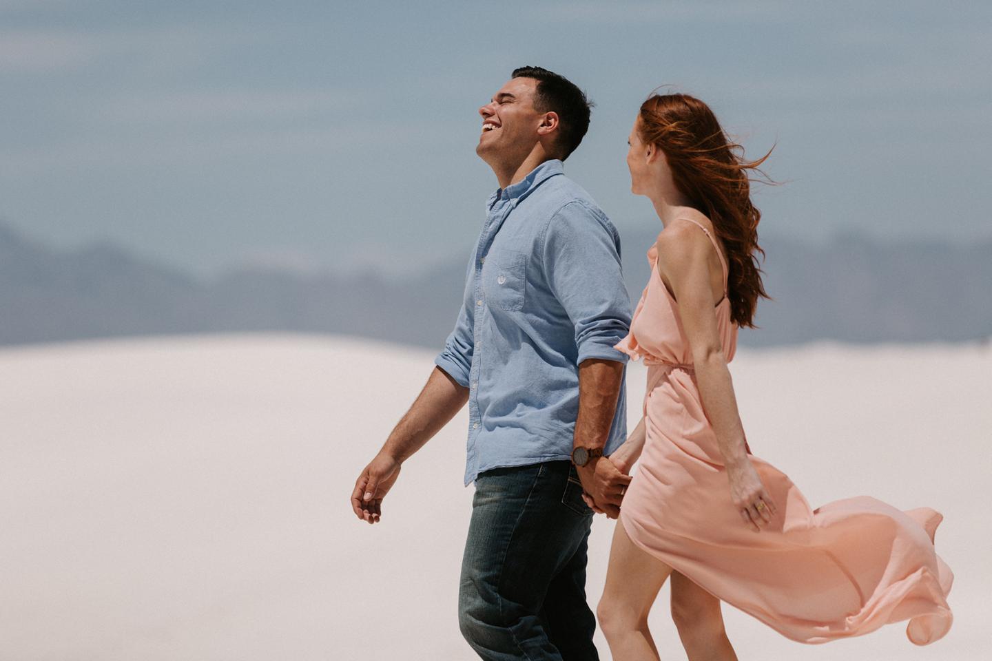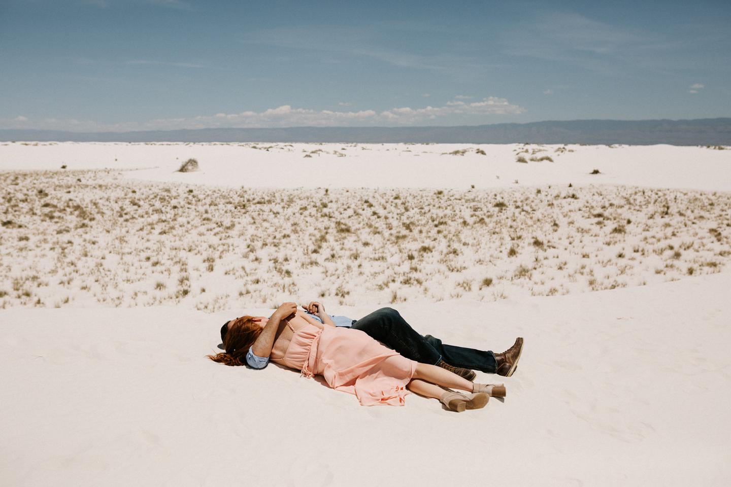 It was hot. It was sandy. And it was crazy bright. It was the perfect challenge. I took these New Mexico engagement photos while wearing sunglasses. I felt like I was shooting completely blind because I couldn’t see my LCD screen at all. I shot these with a lens I rarely use for portraits. I shot them at a much smaller aperture than I usually use. I shot them at exactly high noon, something I NEVER do unless I have to. Basically, I did the exact opposite of everything I normally do, and you know what? The shots still came out awesome. Jessica and Andrew hosted me in El Paso for one night while I was road-tripping across Texas in May (you can see landscape shots from my trip here!).I had never met them before, but Jessica is an amazing photographer herself (seriously, go check out her site! **https://sparrowandgold.com/ **) and we connected through an awesome Facebook group. They were such incredible hosts and I was thrilled when they were down to take a short trip out to White Sands New Mexico the next morning! We originally planned on being there at sunrise, but margaritas and a need for sleep stopped that. So we arrived at noon and I got to experience one of the most challenging, but simultaneously rewarding sessions that I have ever done. These two are so playful, kind, and perfect together. There was so much laughter and sweetness between them and it was so easy to just hang out at White Sands and document them being their normal selves. I cannot thank them enough for hosting me and for taking me out there! I can’t wait to go back again someday