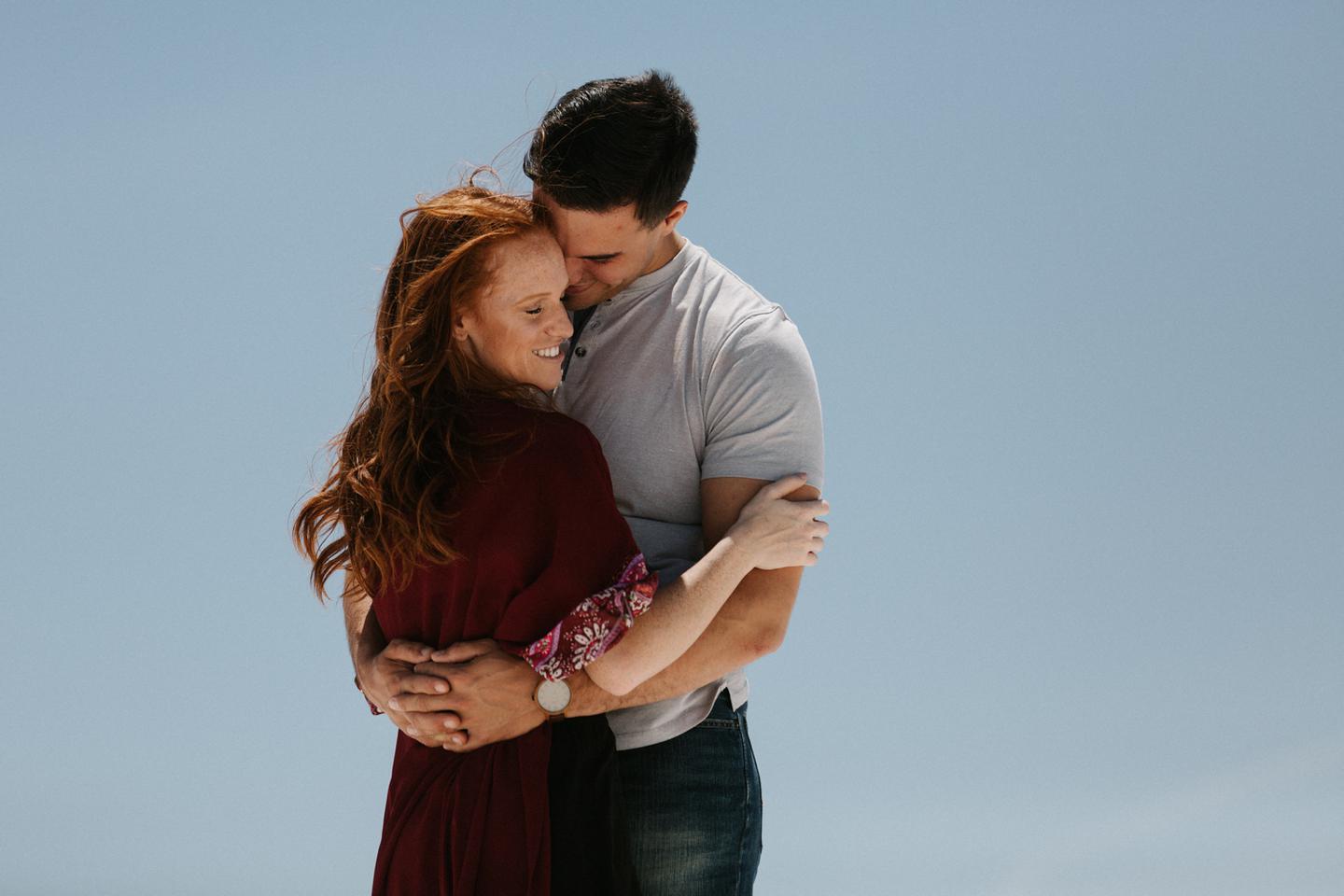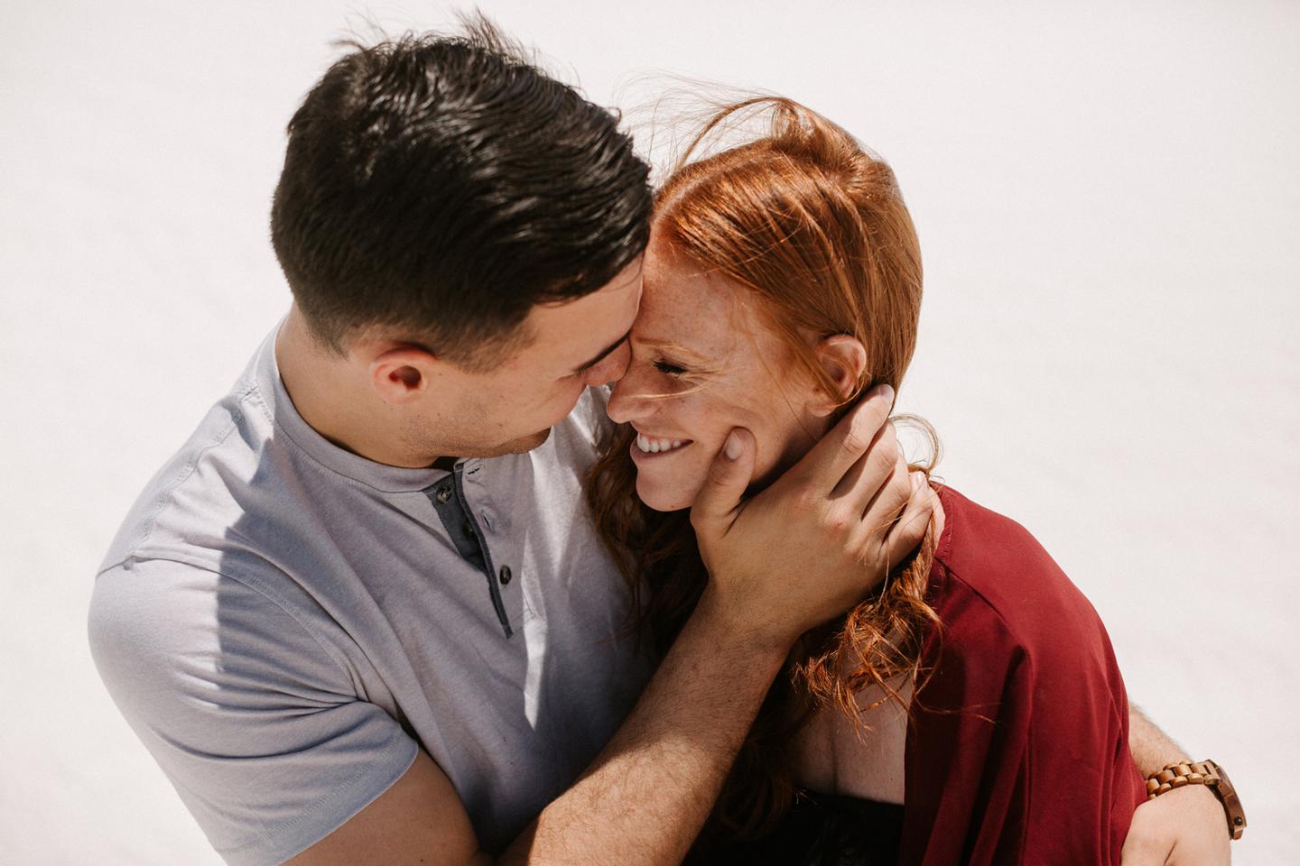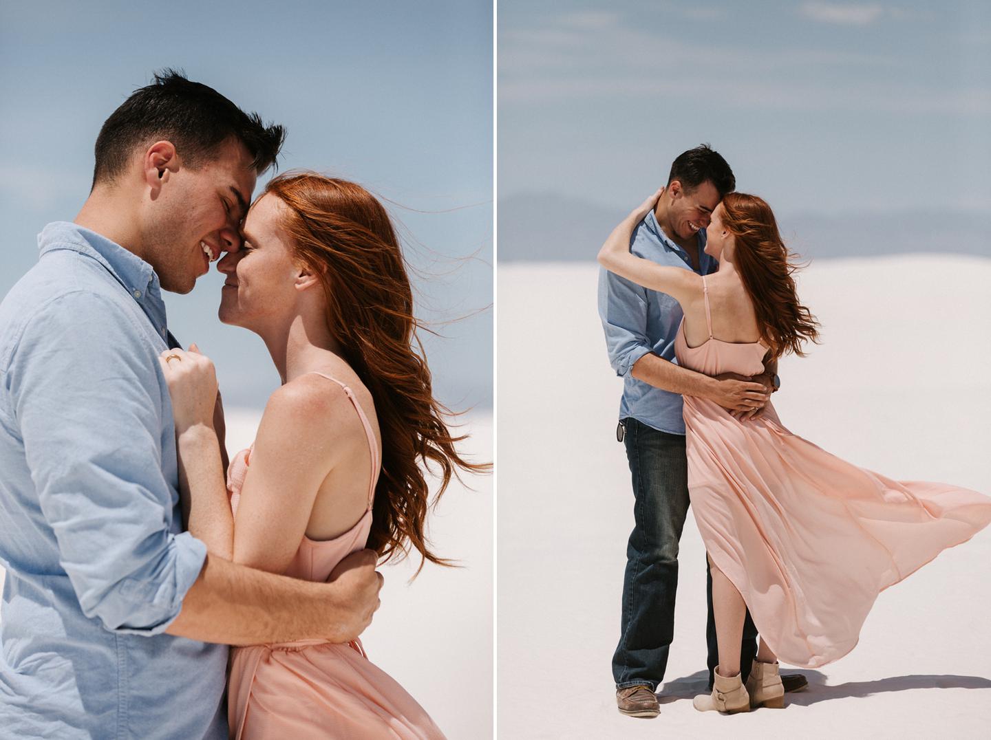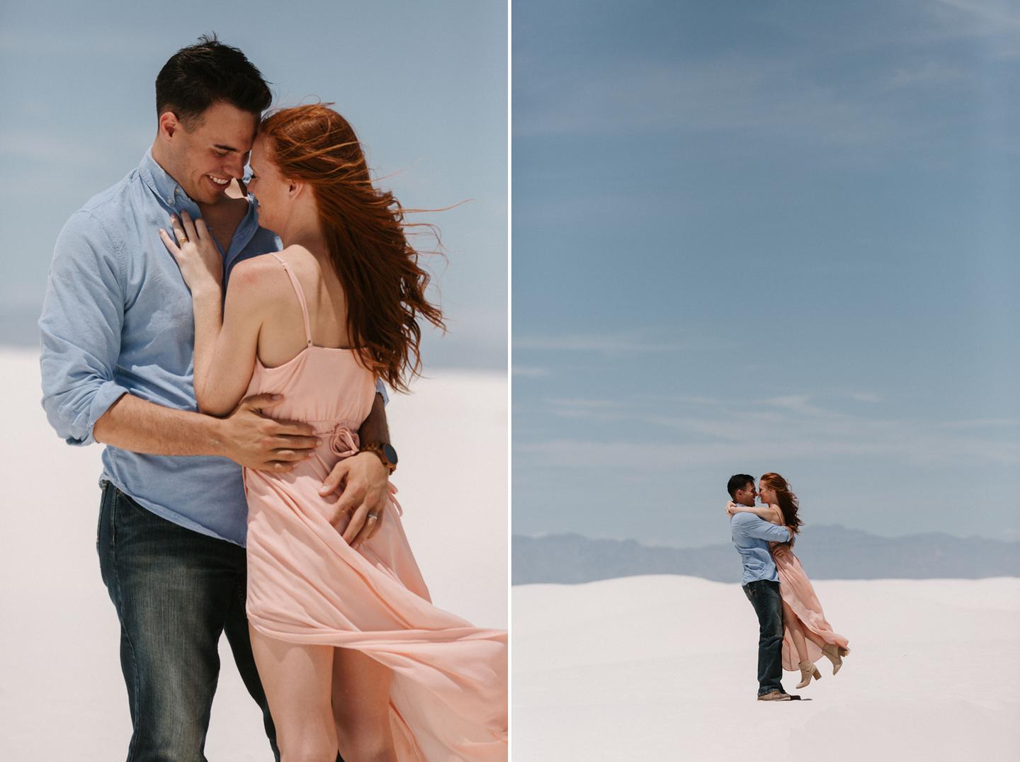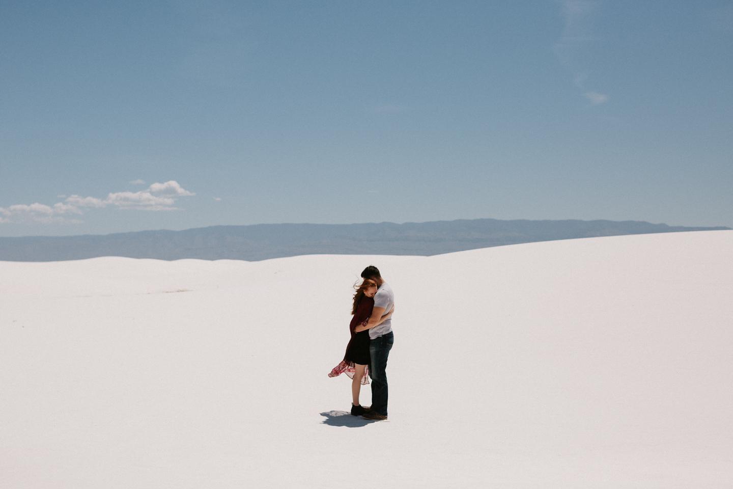 It was hot. It was sandy. And it was crazy bright. It was the perfect challenge. I took these New Mexico engagement photos while wearing sunglasses. I felt like I was shooting completely blind because I couldn’t see my LCD screen at all. I shot these with a lens I rarely use for portraits. I shot them at a much smaller aperture than I usually use. I shot them at exactly high noon, something I NEVER do unless I have to. Basically, I did the exact opposite of everything I normally do, and you know what? The shots still came out awesome. Jessica and Andrew hosted me in El Paso for one night while I was road-tripping across Texas in May (you can see landscape shots from my trip here!).I had never met them before, but Jessica is an amazing photographer herself (seriously, go check out her site! **https://sparrowandgold.com/ **) and we connected through an awesome Facebook group. They were such incredible hosts and I was thrilled when they were down to take a short trip out to White Sands New Mexico the next morning! We originally planned on being there at sunrise, but margaritas and a need for sleep stopped that. So we arrived at noon and I got to experience one of the most challenging, but simultaneously rewarding sessions that I have ever done. These two are so playful, kind, and perfect together. There was so much laughter and sweetness between them and it was so easy to just hang out at White Sands and document them being their normal selves. I cannot thank them enough for hosting me and for taking me out there! I can’t wait to go back again someday