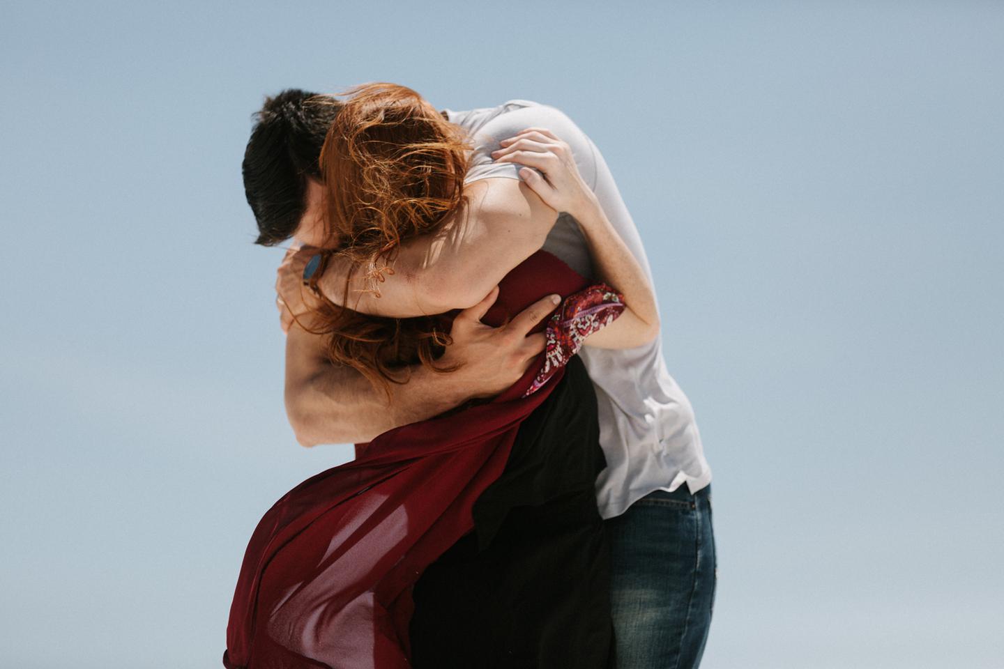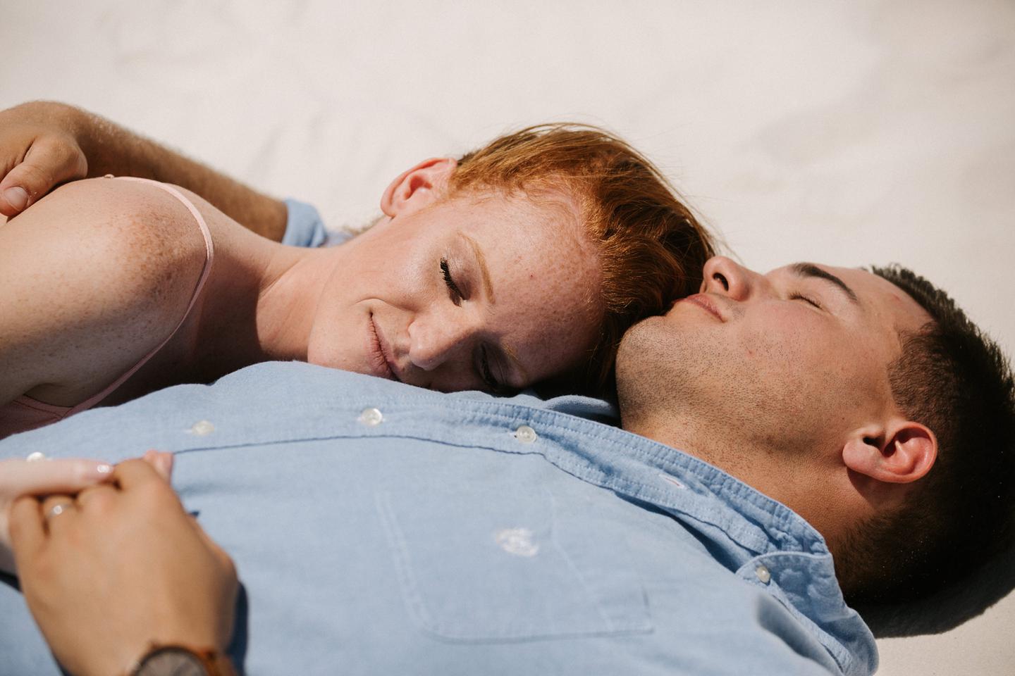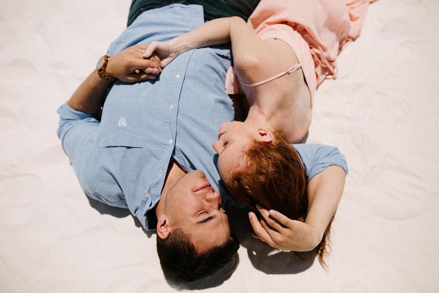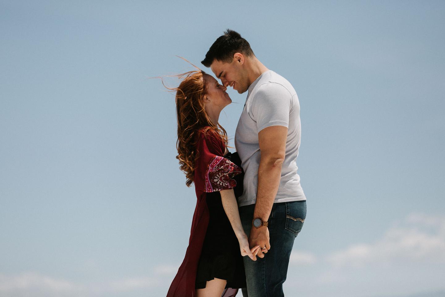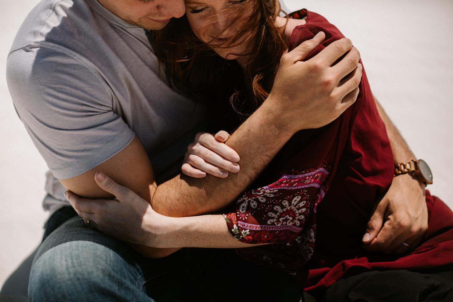 It was hot. It was sandy. And it was crazy bright. It was the perfect challenge. I took these New Mexico engagement photos while wearing sunglasses. I felt like I was shooting completely blind because I couldn’t see my LCD screen at all. I shot these with a lens I rarely use for portraits. I shot them at a much smaller aperture than I usually use. I shot them at exactly high noon, something I NEVER do unless I have to. Basically, I did the exact opposite of everything I normally do, and you know what? The shots still came out awesome. Jessica and Andrew hosted me in El Paso for one night while I was road-tripping across Texas in May (you can see landscape shots from my trip here!).I had never met them before, but Jessica is an amazing photographer herself (seriously, go check out her site! **https://sparrowandgold.com/ **) and we connected through an awesome Facebook group. They were such incredible hosts and I was thrilled when they were down to take a short trip out to White Sands New Mexico the next morning! We originally planned on being there at sunrise, but margaritas and a need for sleep stopped that. So we arrived at noon and I got to experience one of the most challenging, but simultaneously rewarding sessions that I have ever done. These two are so playful, kind, and perfect together. There was so much laughter and sweetness between them and it was so easy to just hang out at White Sands and document them being their normal selves. I cannot thank them enough for hosting me and for taking me out there! I can’t wait to go back again someday