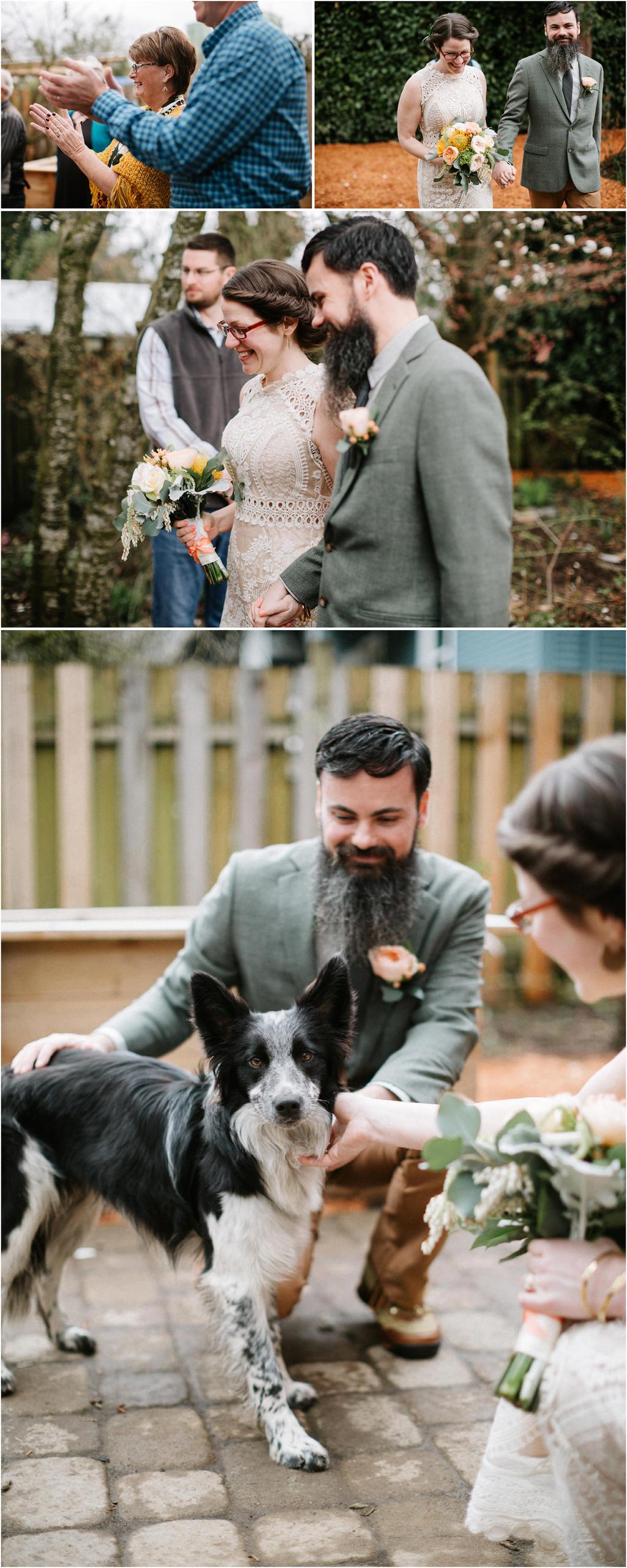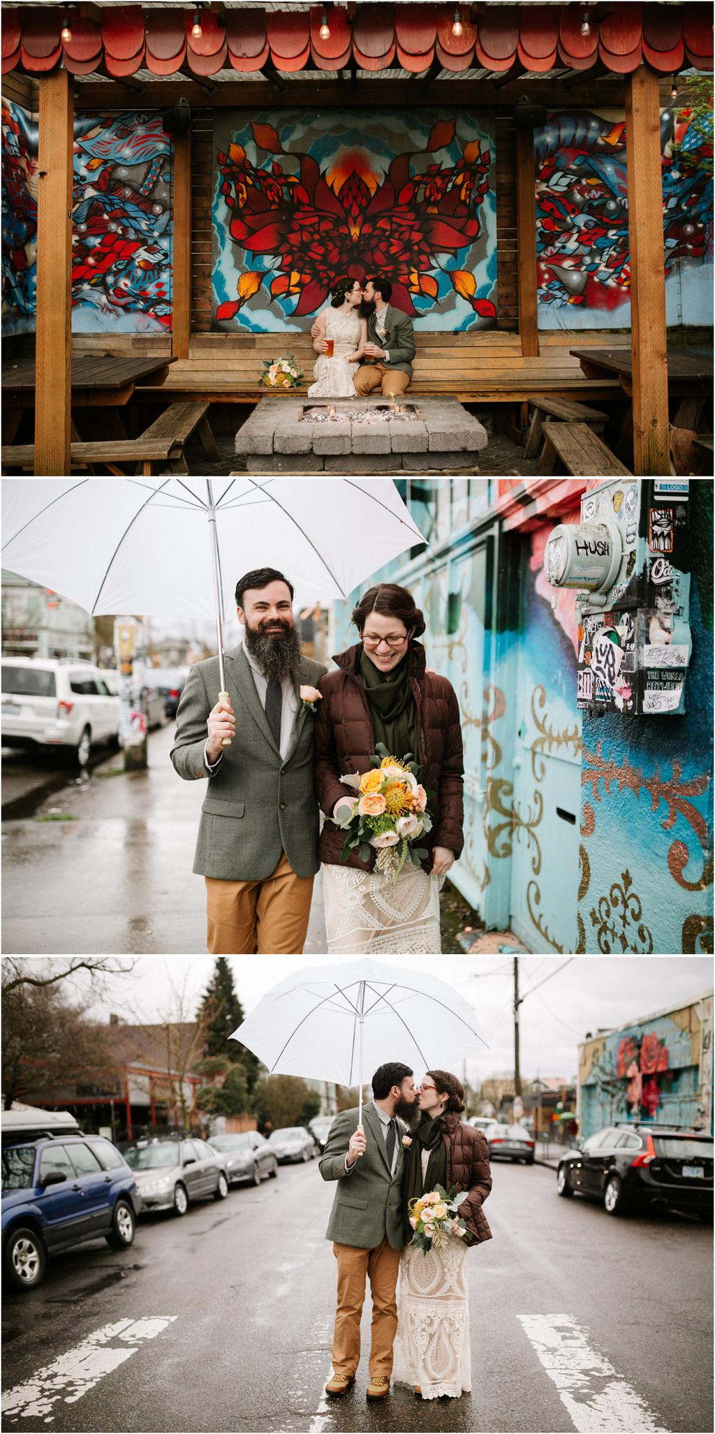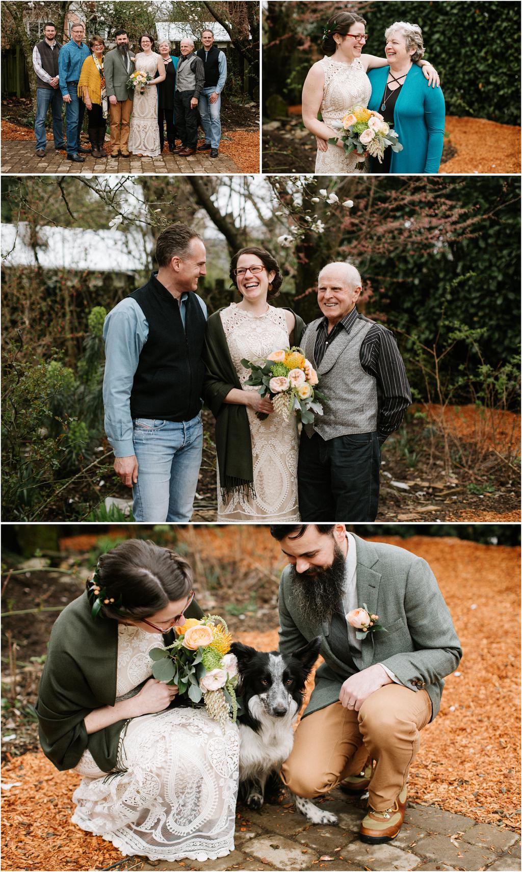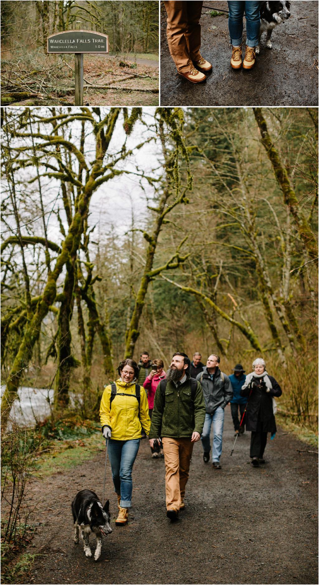 One of my favorite things is when couples follow their hearts and plan simple, heartfelt, personalized wedding days that are unique to them. Jenna and Eric did just that. They decided to have a simple Portland backyard wedding at their home near NE Alberta. They included just a few family and friends and said their vows under the spring magnolia blossoms. After their ceremony, we walked over to the Alberta Arts district to take a few photos by the colorful walls and have a quick drink at a bar! And then everyone hopped into their cars and we drove out to the Columbia River Gorge for a hike! Their family and friends braved the muddy Wahclella Falls trail and Jenna changed back into her wedding attire once we reached the waterfall. We took some amazing portraits in the rain and it was so romantic and fun! Their dog even got to join them! If you are trying to plan your Oregon or Portland elopement, there are SO many different ways you can schedule your day and so many beautiful places to go! If you need help, I’m always happy to give you elopement ideas or tell you about awesome things my clients have tried. There is no right or wrong way to get married, and it is so important to remember that! Hair: Zuzu Salon Flowers: Flowers in Flight Dress: BHLDN Jacket: Brooks Brothers Boots: Danner Venue: Private residence and Wahclella Falls