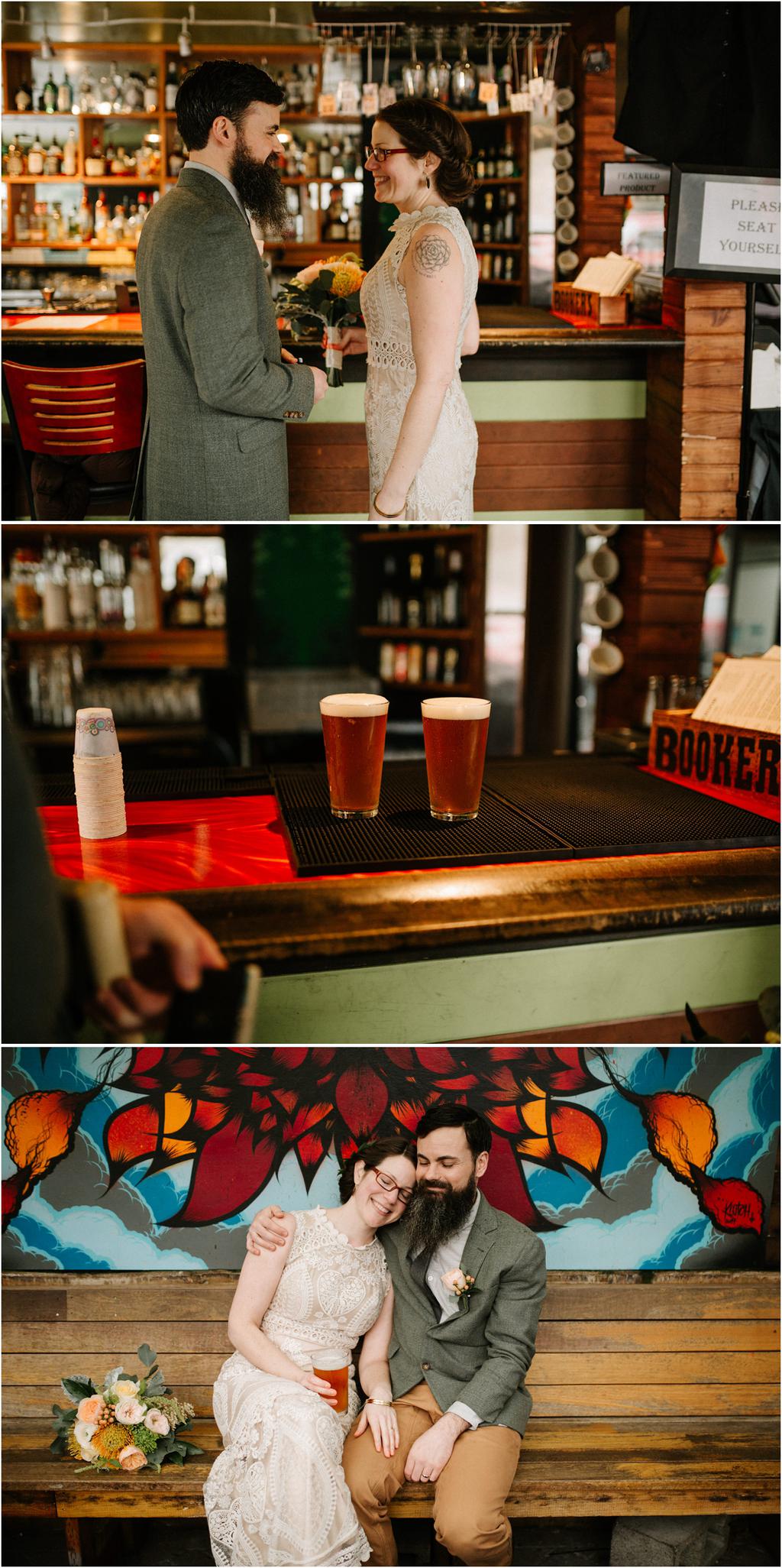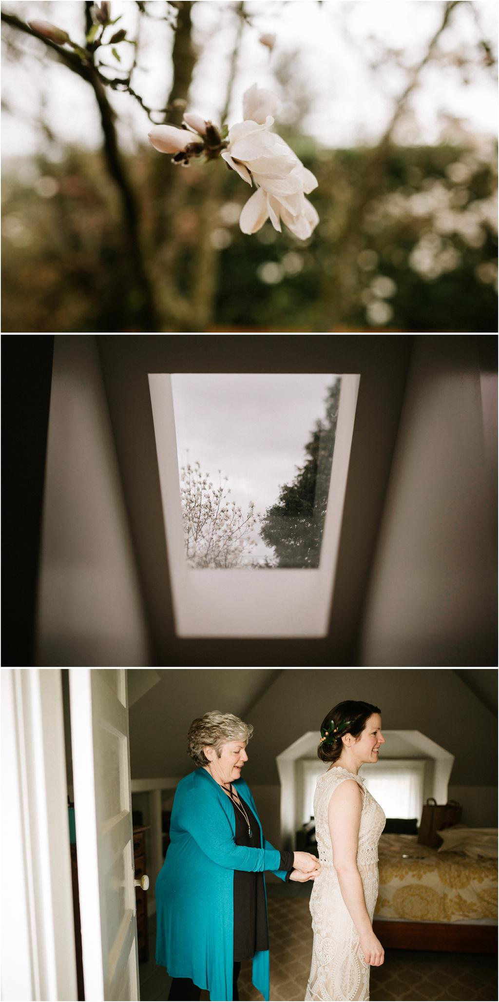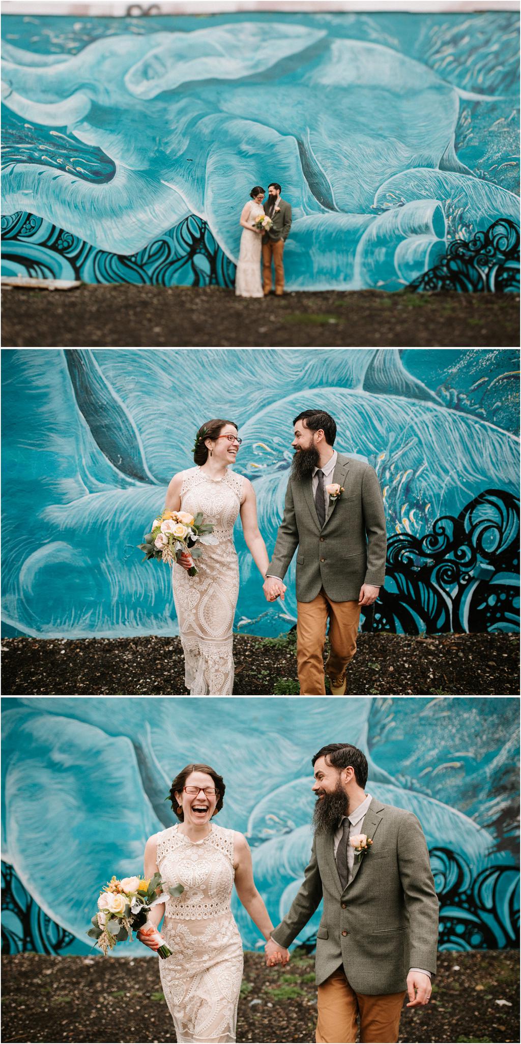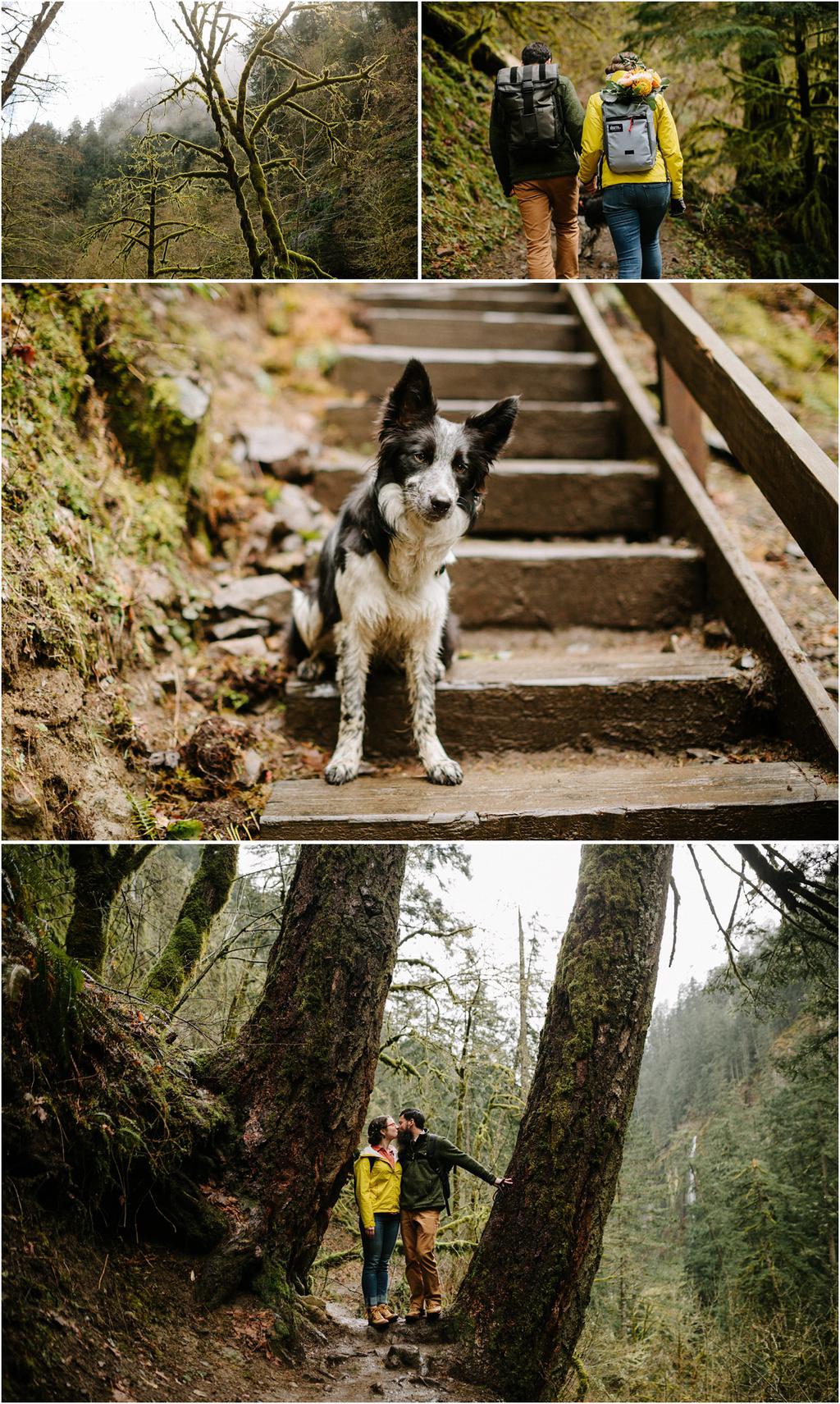 One of my favorite things is when couples follow their hearts and plan simple, heartfelt, personalized wedding days that are unique to them. Jenna and Eric did just that. They decided to have a simple Portland backyard wedding at their home near NE Alberta. They included just a few family and friends and said their vows under the spring magnolia blossoms. After their ceremony, we walked over to the Alberta Arts district to take a few photos by the colorful walls and have a quick drink at a bar! And then everyone hopped into their cars and we drove out to the Columbia River Gorge for a hike! Their family and friends braved the muddy Wahclella Falls trail and Jenna changed back into her wedding attire once we reached the waterfall. We took some amazing portraits in the rain and it was so romantic and fun! Their dog even got to join them! If you are trying to plan your Oregon or Portland elopement, there are SO many different ways you can schedule your day and so many beautiful places to go! If you need help, I’m always happy to give you elopement ideas or tell you about awesome things my clients have tried. There is no right or wrong way to get married, and it is so important to remember that! Hair: Zuzu Salon Flowers: Flowers in Flight Dress: BHLDN Jacket: Brooks Brothers Boots: Danner Venue: Private residence and Wahclella Falls