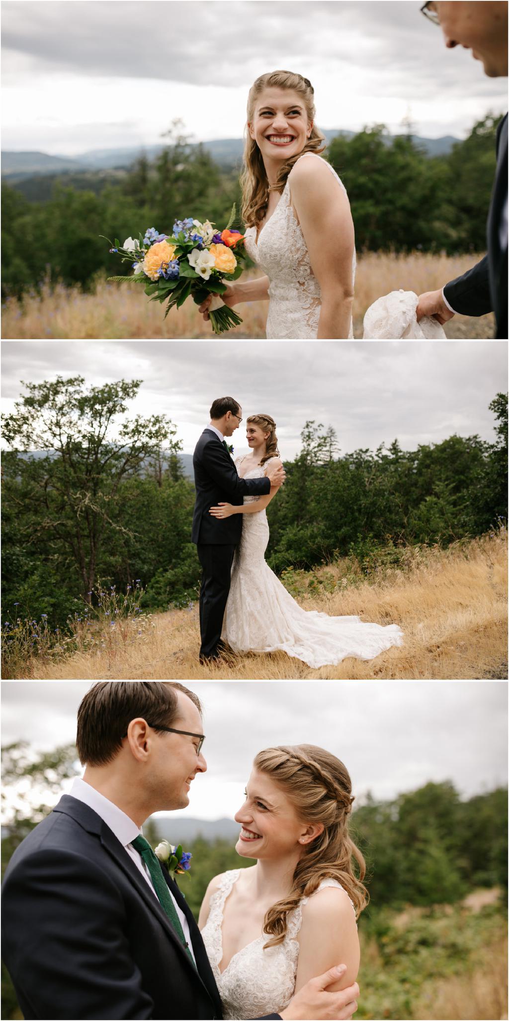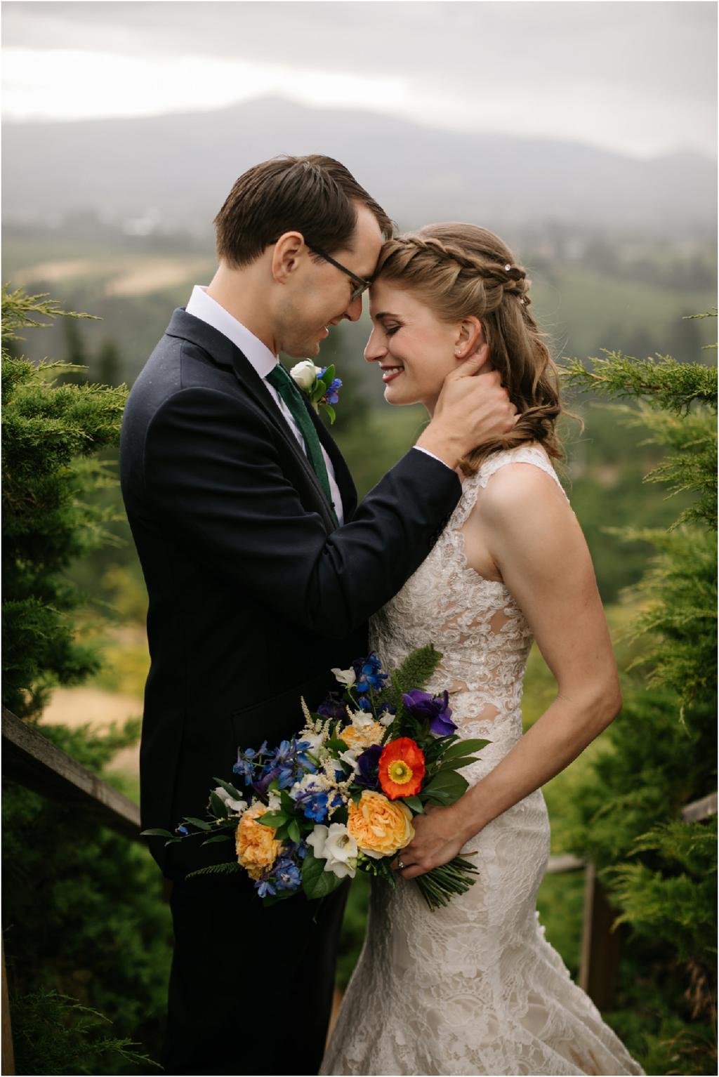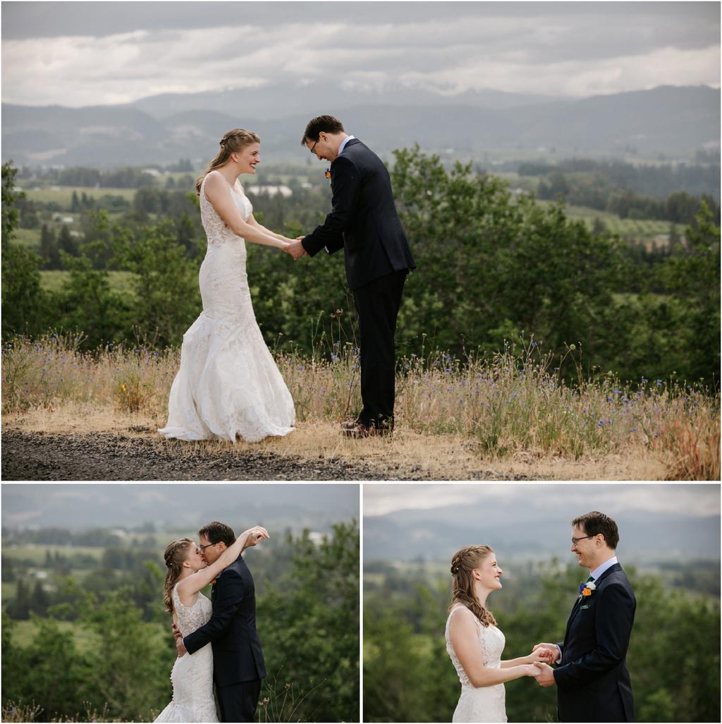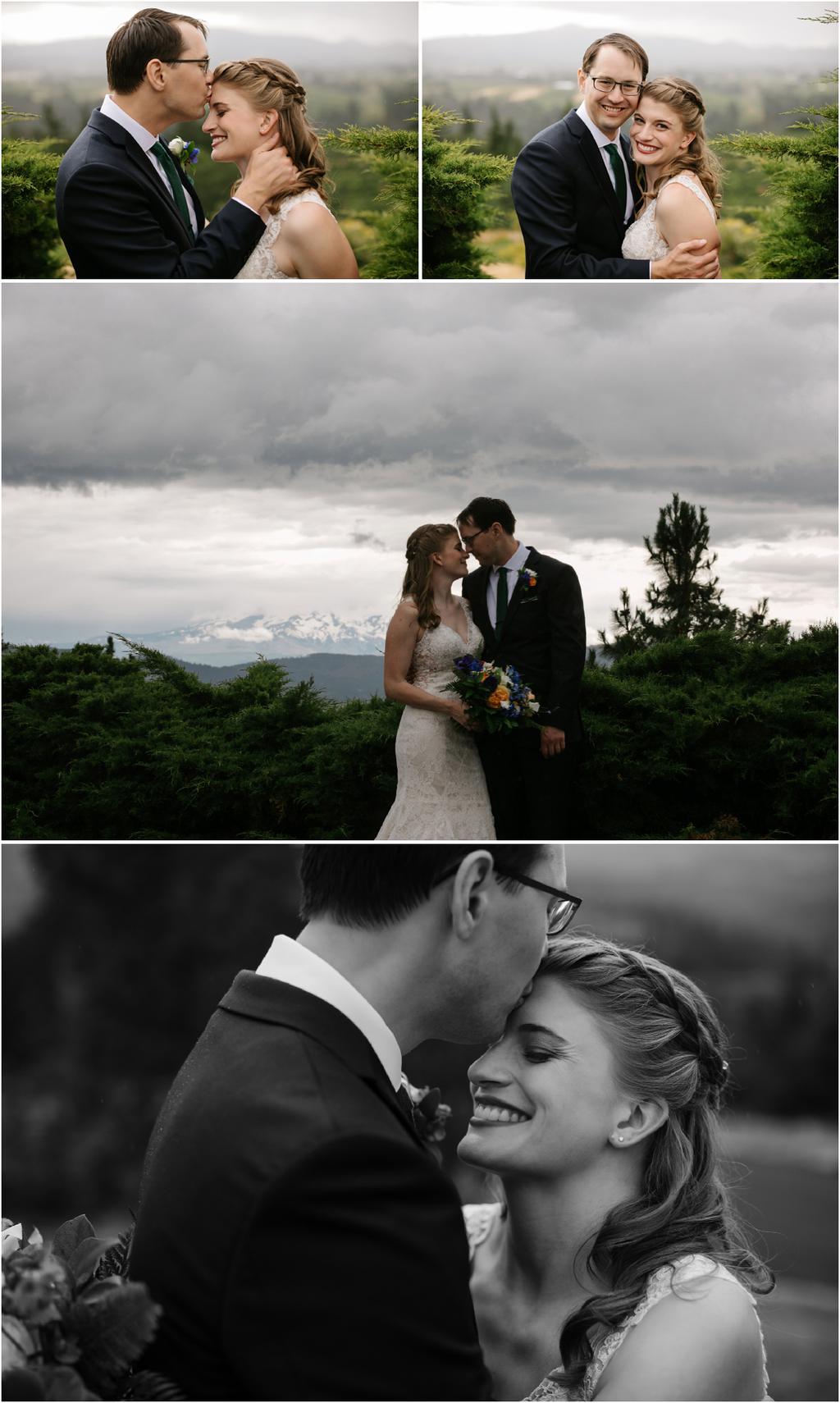 It was a stormy June day. The sun was out and shining one moment and it was pouring rain the next! But it didn’t bring Samantha and Marshall down one bit. These two had the sweetest **Wildwood Events indoor wedding in Hood River, Oregon this past weekend and it was an absolute joy to be there! The day began at Panorama Point where they did their first look. It was raining when we arrived, but we waited it out and the light was gorgeous! Sadly, Mt. Hood decided not to show herself, but it was beautiful anyway. After portraits, they had their beautiful ceremony and reception indoors at Wildwood Events, formerly known as Springhouse Cellar. It’s such a warm and cozy space! I loved that they named their tables after their favorite books and made custom bookmarks as favors. I love reading more than most things so it’s always nice to work with fellow book-lovers! They also had a delicious taco bar catered by Ahi Ohana’s Catering **and it was SO good. They even had a bunch of different hot sauces for spice-lovers like myself! Heck yes.