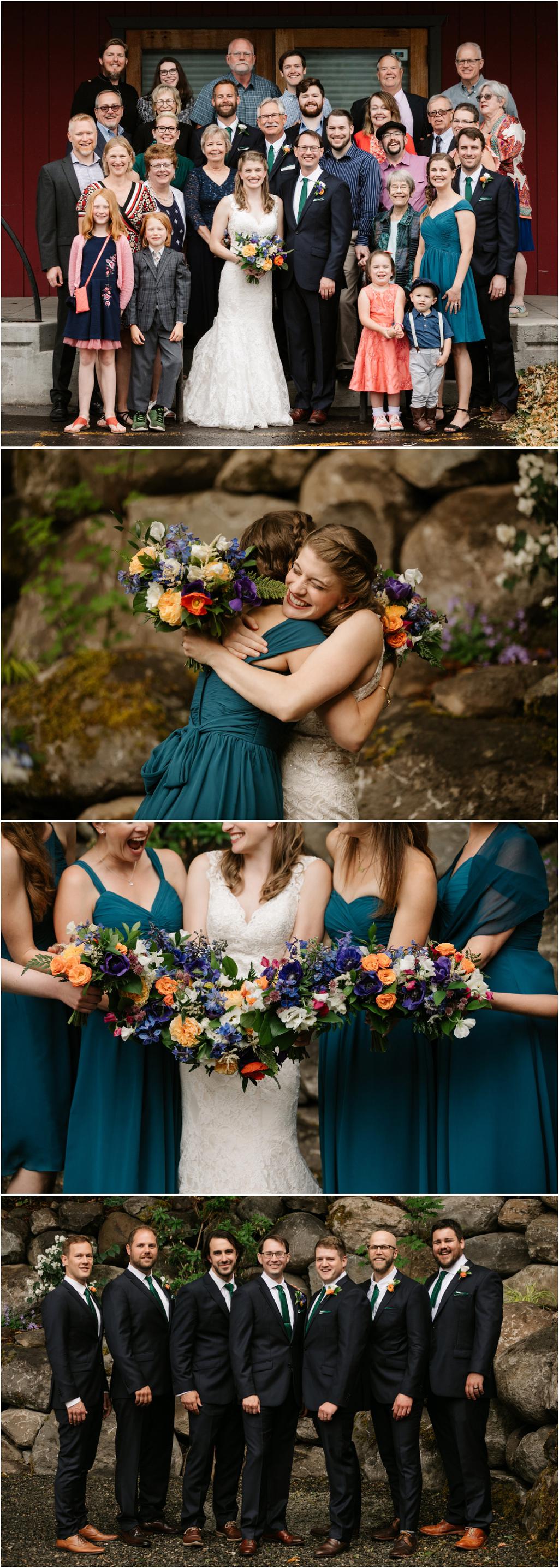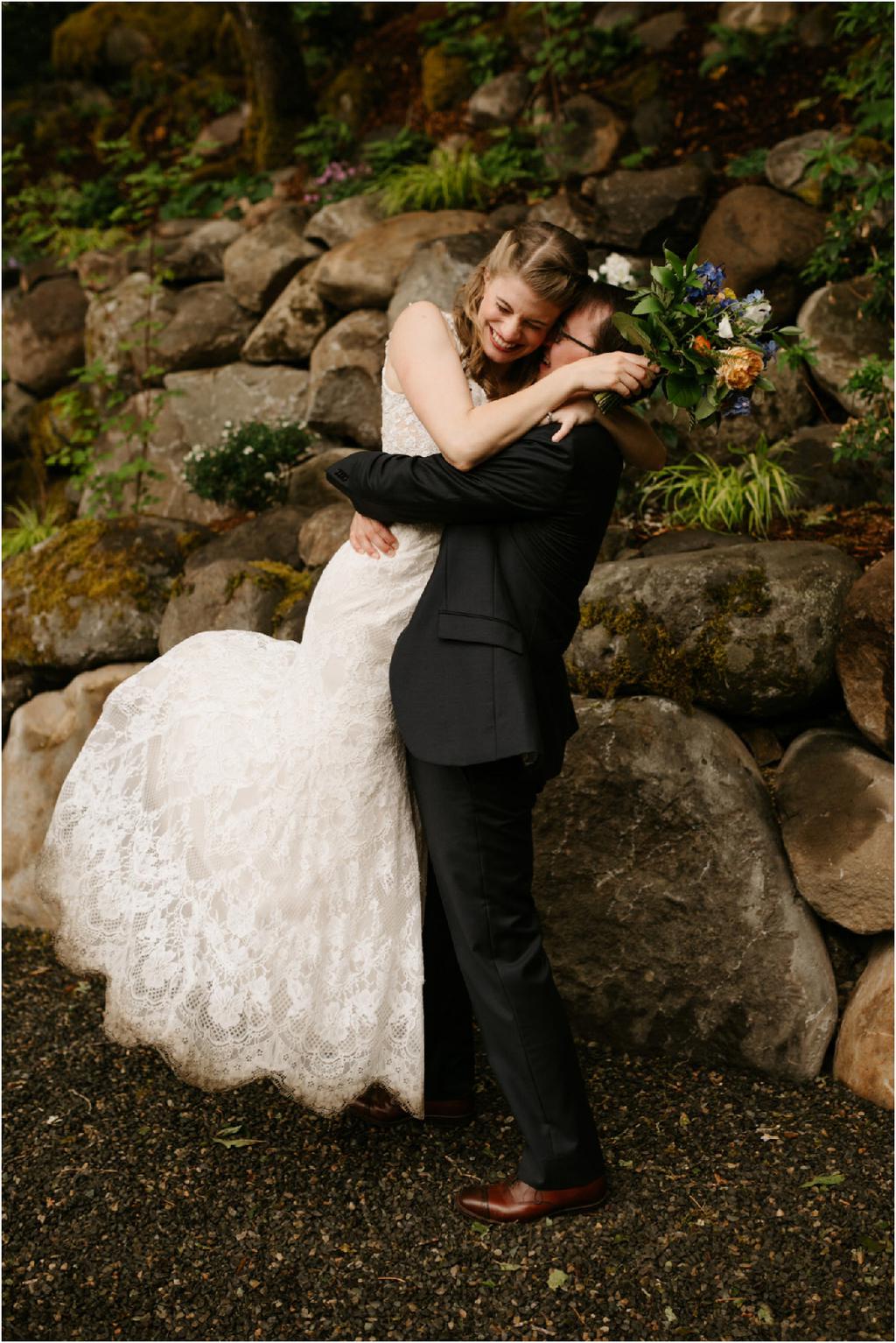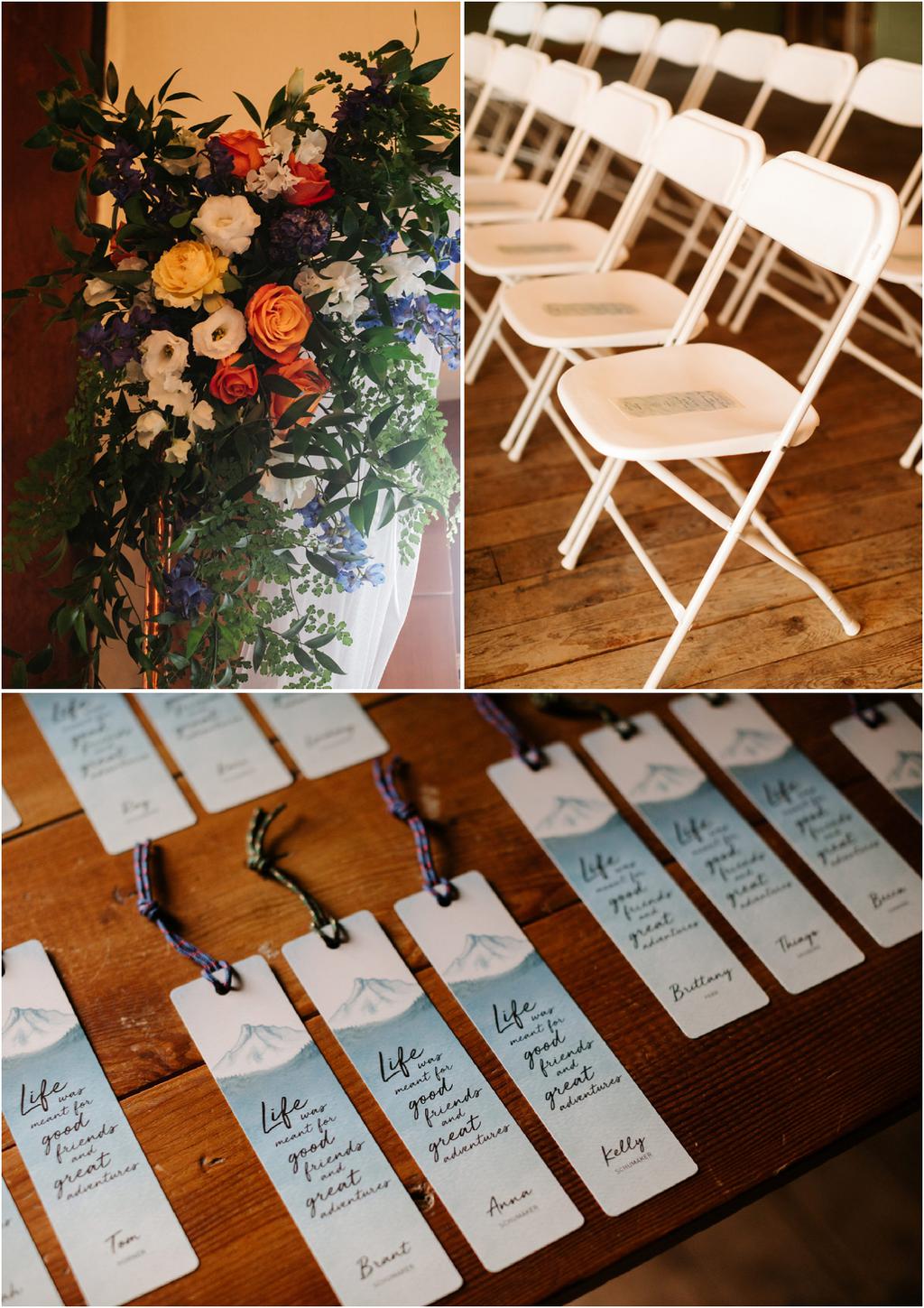 It was a stormy June day. The sun was out and shining one moment and it was pouring rain the next! But it didn’t bring Samantha and Marshall down one bit. These two had the sweetest **Wildwood Events indoor wedding in Hood River, Oregon this past weekend and it was an absolute joy to be there! The day began at Panorama Point where they did their first look. It was raining when we arrived, but we waited it out and the light was gorgeous! Sadly, Mt. Hood decided not to show herself, but it was beautiful anyway. After portraits, they had their beautiful ceremony and reception indoors at Wildwood Events, formerly known as Springhouse Cellar. It’s such a warm and cozy space! I loved that they named their tables after their favorite books and made custom bookmarks as favors. I love reading more than most things so it’s always nice to work with fellow book-lovers! They also had a delicious taco bar catered by Ahi Ohana’s Catering **and it was SO good. They even had a bunch of different hot sauces for spice-lovers like myself! Heck yes.