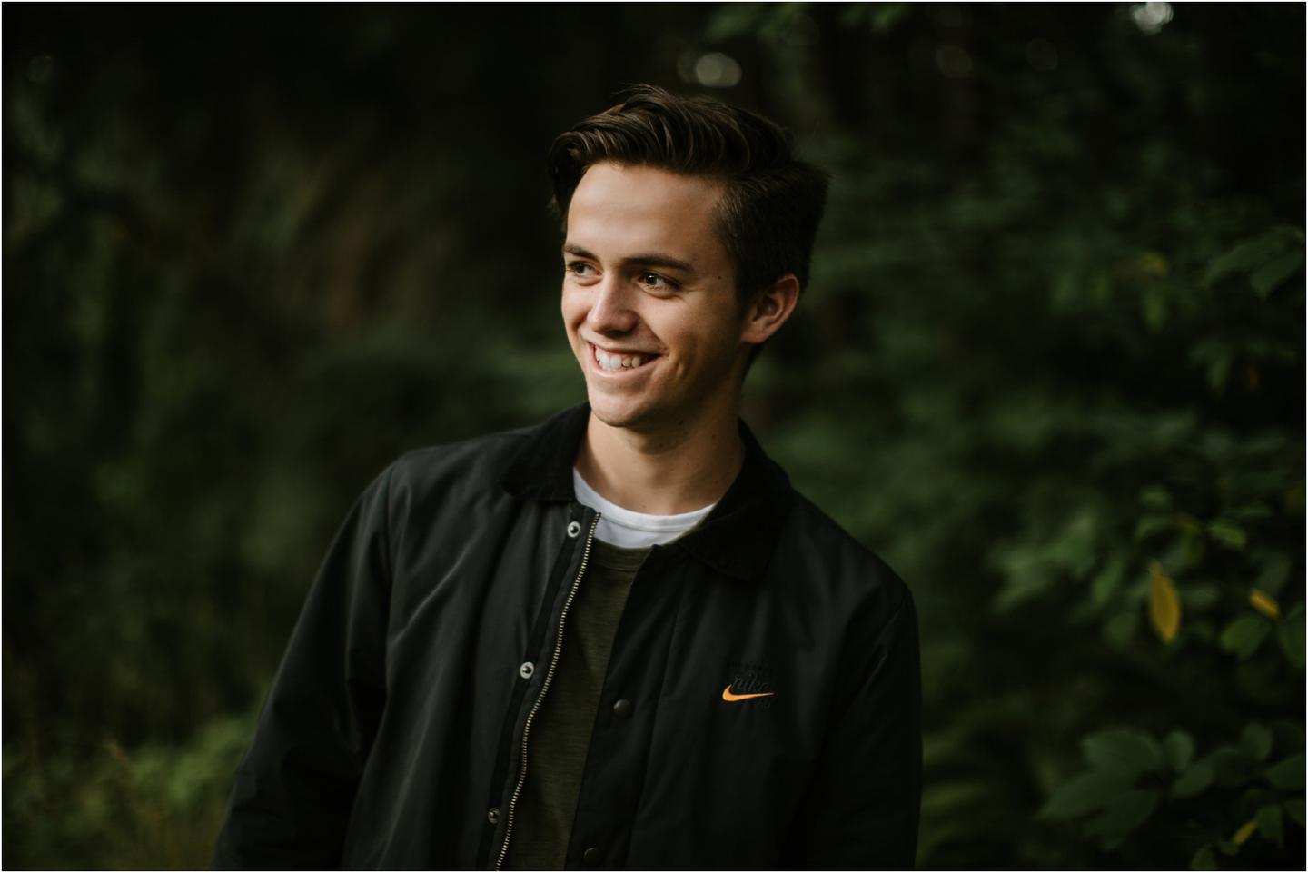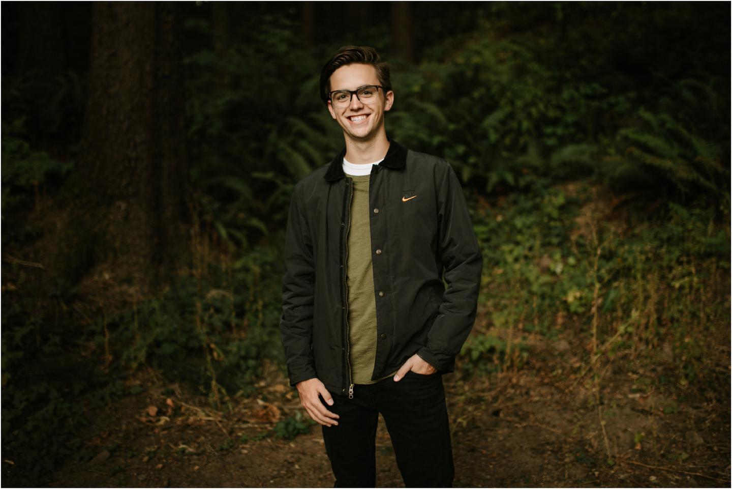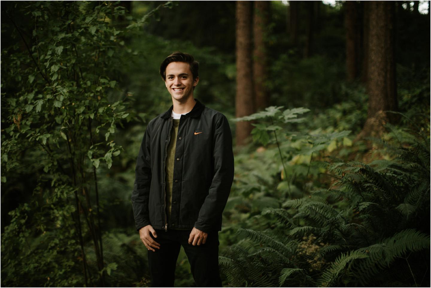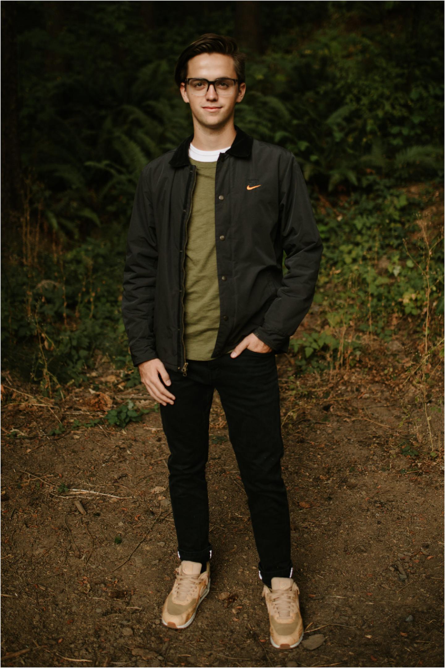 I took these Portland senior photos at the Hoyt Arboretum a few weeks ago with Cooper! He has two cute dogs and loves spending time outdoors. He’s not super extroverted, but definitely has a quiet confidence that shows in the photos. Cooper is also super athletic – he plays soccer and loves staying active. Something really cool about this guy is that he lived abroad for a few years while he was in middle school! He’s a native Oregonian (woohoo!) but his family got the opportunity to live in Amsterdam for two years and it was a really cool experience. His mom told me that it wasn’t easy to pull up and move, but that the entire experience was such a gift. It changed their entire family in a good way. Cooper knew he wanted to take photos somewhere out in nature. His Portland senior photos at the Hoyt Arboretum were perfect for his active, outdoor vibes and athletic style. Seriously, you might see the arboretum a lot on my blog, (hah) but that’s only because I love it SO freaking much. These Portland senior photos at the Hoyt Arboretum are no exception. It truly is one of my all time favorite spots in Portland for natural and moody photos