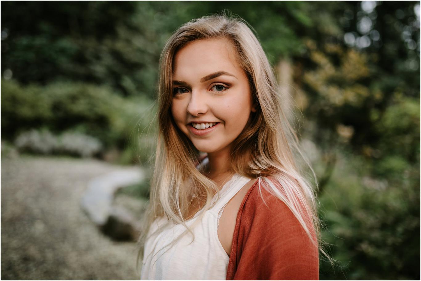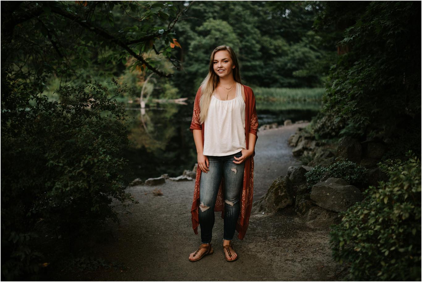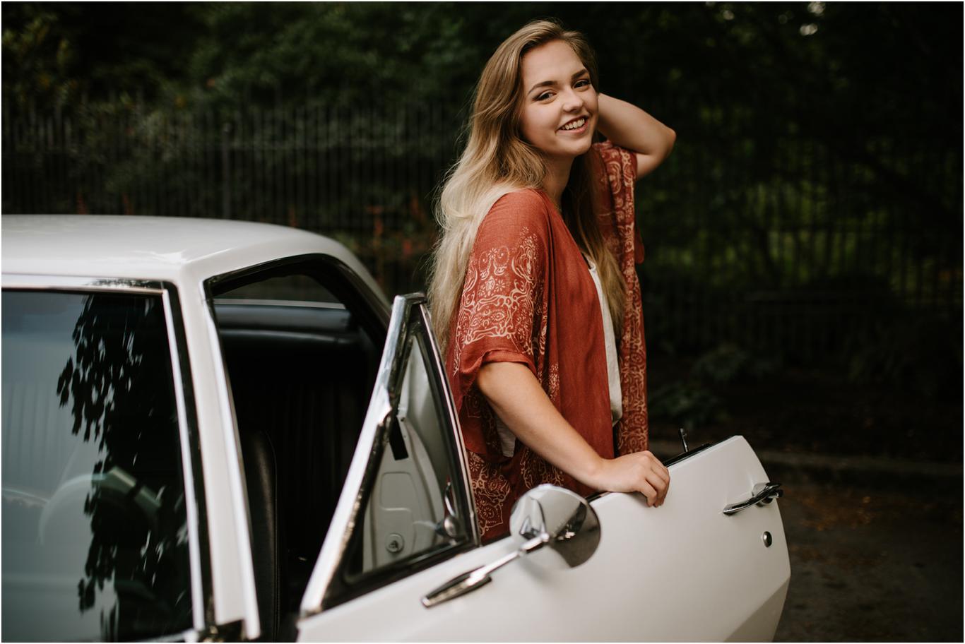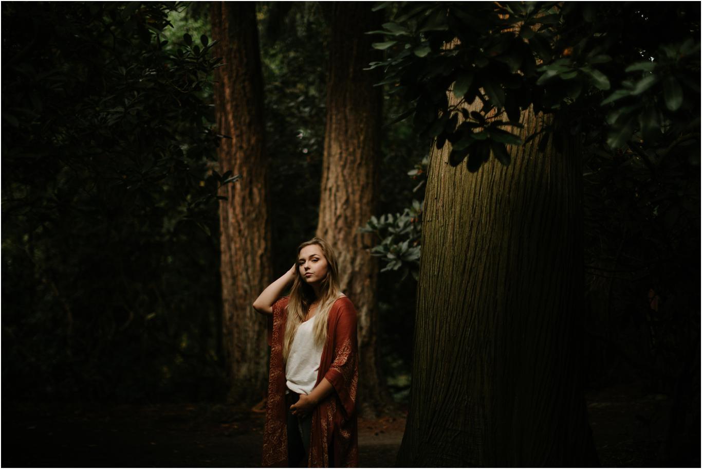 I seriously love working with seniors. These Crystal Springs Rhododendron Garden senior photos were so fun and Jessica was awesome to work with. Her whole family came to the shoot and we took a few quick family photos at the beginning of our session (a great idea – by the way!) Then her dad surprised her by bringing his vintage car that she LOVES to the photoshoot. It was such cool vehicle and Jessica looked beautiful alongside it! Jessica has this chill, laid-back vibe that made her really fun to photograph. She’s definitely a tomboy and loves doing outdoor activities with her family – fishing, camping, boating, water sports, you name it. She told me she actually feels the most comfortable in sweats and athletic clothes, but that she dressed up a little more than normal for our shoot. I feel like she could totally rock that athletic vibe too, but hey, her outfit was amazing! Every time I take Crystal Springs Rhododendron Garden senior photos, I remember how much I love this location. The gardens are huge and they have so much variety! I love the rhododendron tunnels and how the light plays in the trees there. It’s a beautiful backdrop for any photoshoot and it works well for classic photos or for images that are a little moodier like mine! I definitely want to do senior shoots here more often