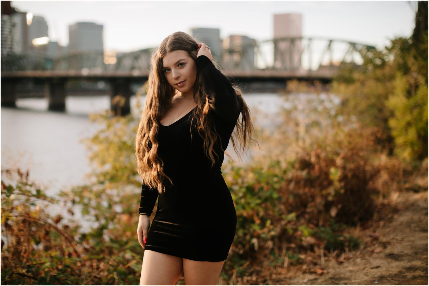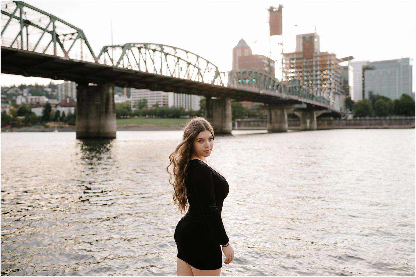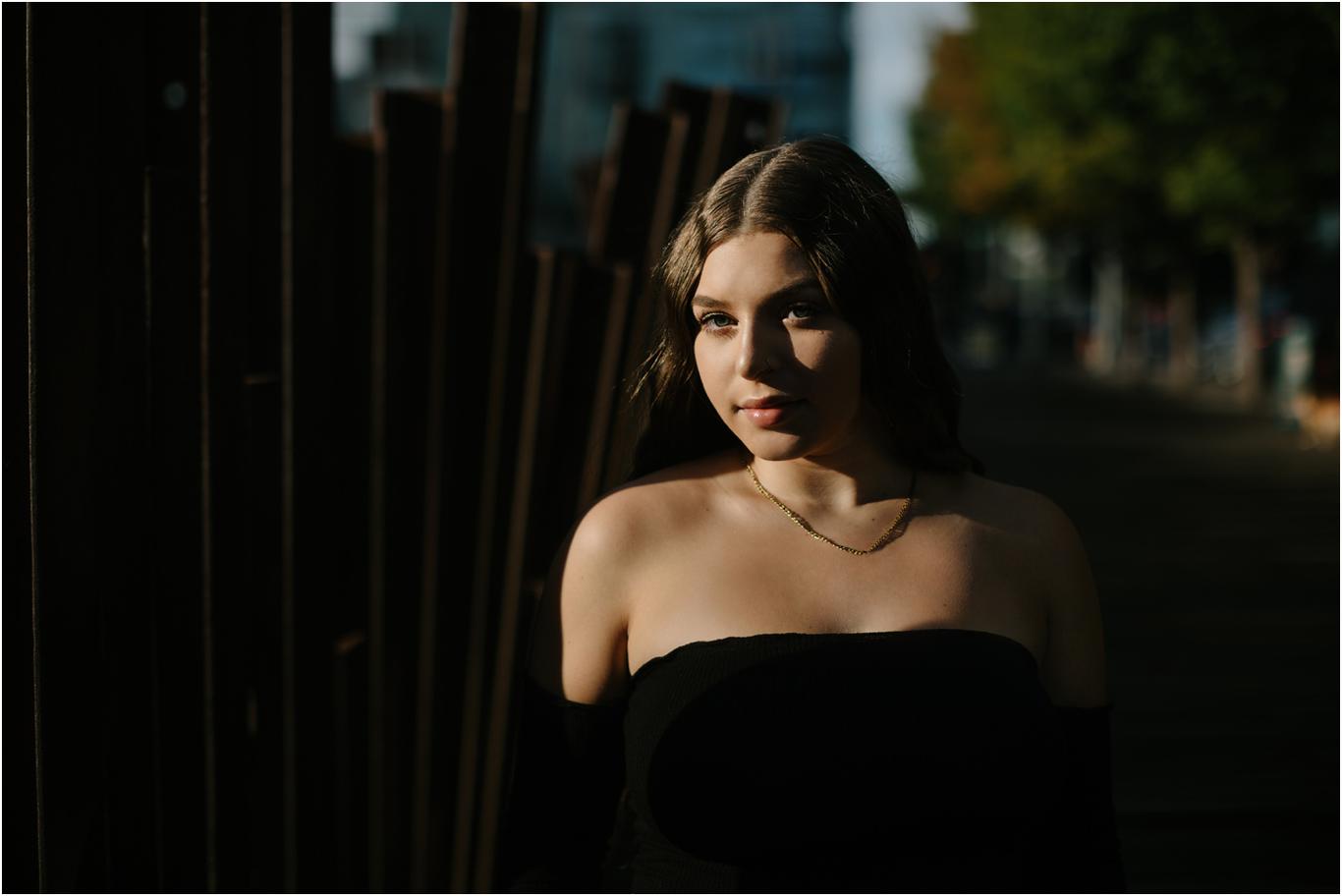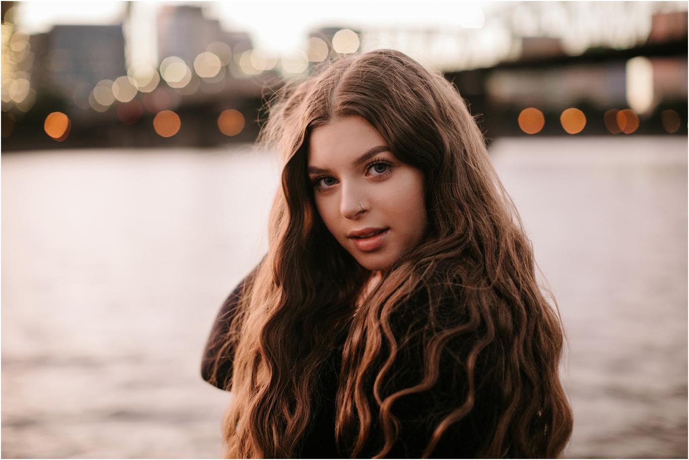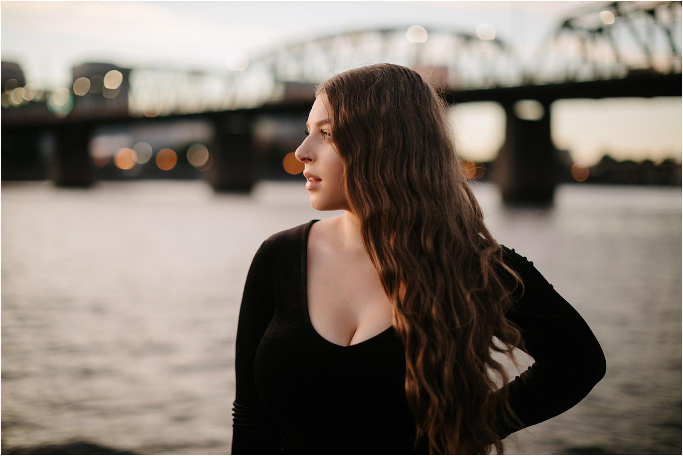Oh my gosh I had SO much fun taking these downtown Portland senior pictures for Zorya! She is so gorgeous and we had such a fun time taking unique senior pictures in all sorts of gorgeous lighting! We started out downtown Portland senior pictures in the Pearl District. We explored around Lovejoy and Tanner Springs Park, catching pockets of bold light that really highlighted her stunning blue eyes. I love working with seniors who trust me to play with light and create imagery that is a little bolder and more unique! Zorya was totally down for that! Afterwards, we traded the west side for the east side and head down the Eastbank Esplanade near OMSI for some photos along the river. I shoot at this spot often but it never disappoints! It’s such a good place for downtown Portland senior pictures! I love the soft light at dusk with the awesome city views of Portland
