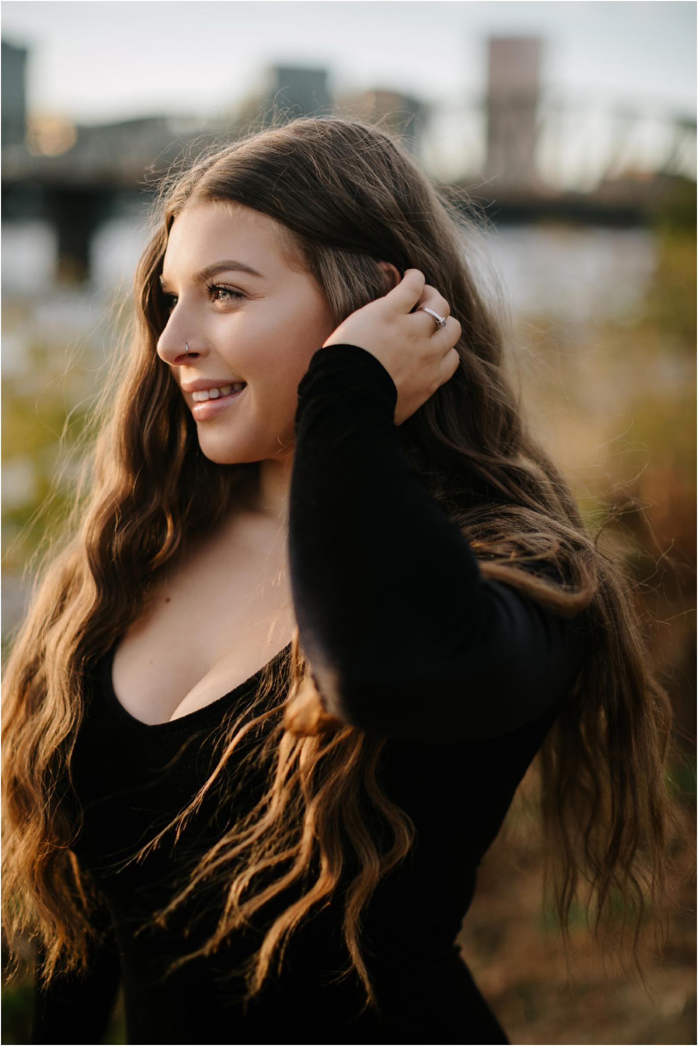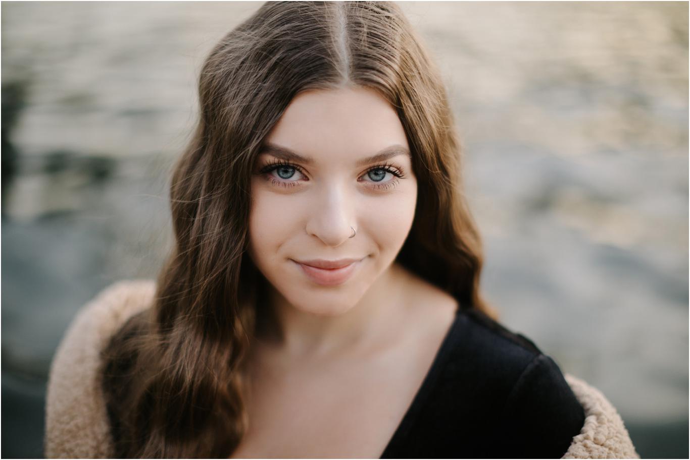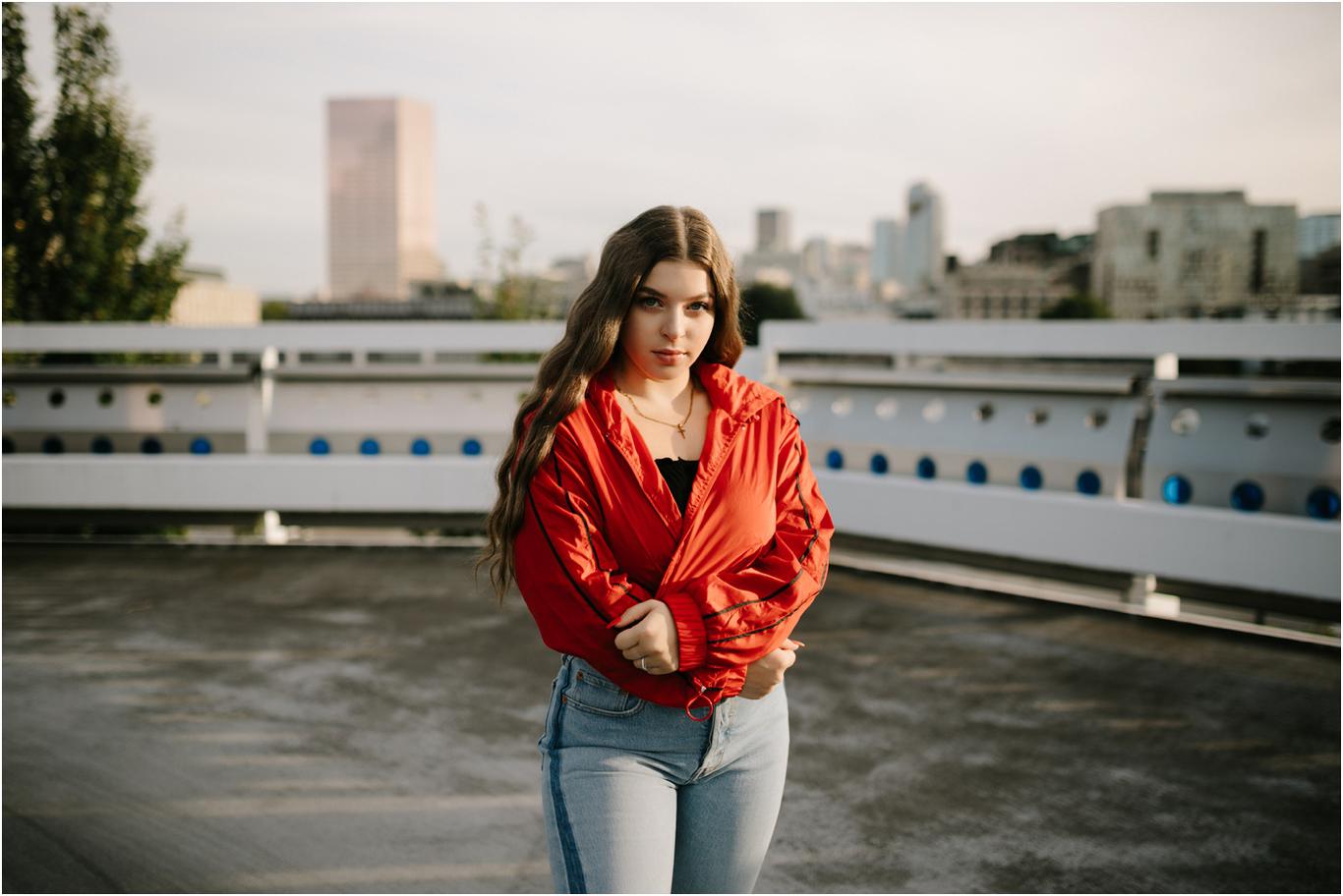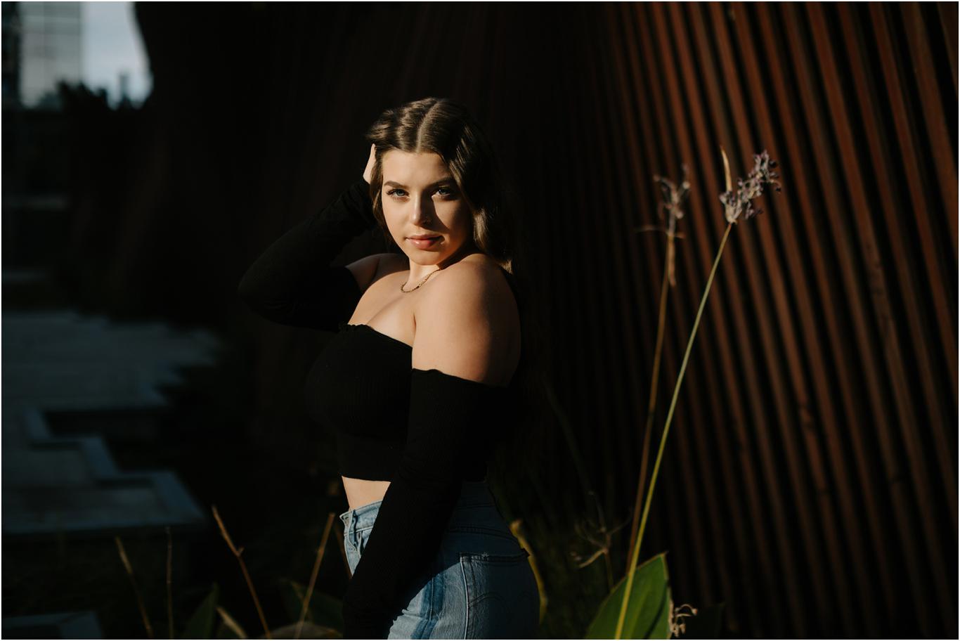 Oh my gosh I had SO much fun taking these downtown Portland senior pictures for Zorya! She is so gorgeous and we had such a fun time taking unique senior pictures in all sorts of gorgeous lighting! We started out downtown Portland senior pictures in the Pearl District. We explored around Lovejoy and Tanner Springs Park, catching pockets of bold light that really highlighted her stunning blue eyes. I love working with seniors who trust me to play with light and create imagery that is a little bolder and more unique! Zorya was totally down for that! Afterwards, we traded the west side for the east side and head down the Eastbank Esplanade near OMSI for some photos along the river. I shoot at this spot often but it never disappoints! It’s such a good place for downtown Portland senior pictures! I love the soft light at dusk with the awesome city views of Portland