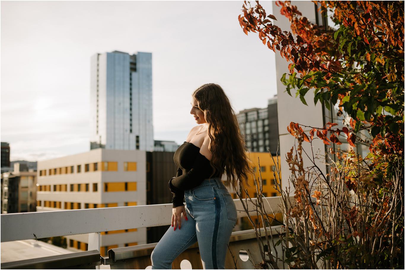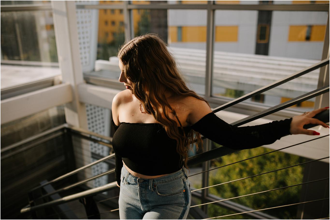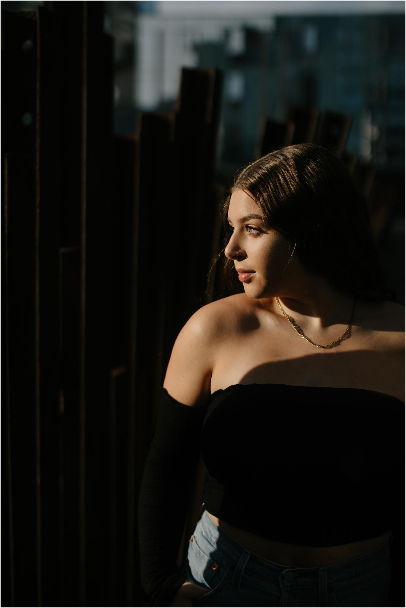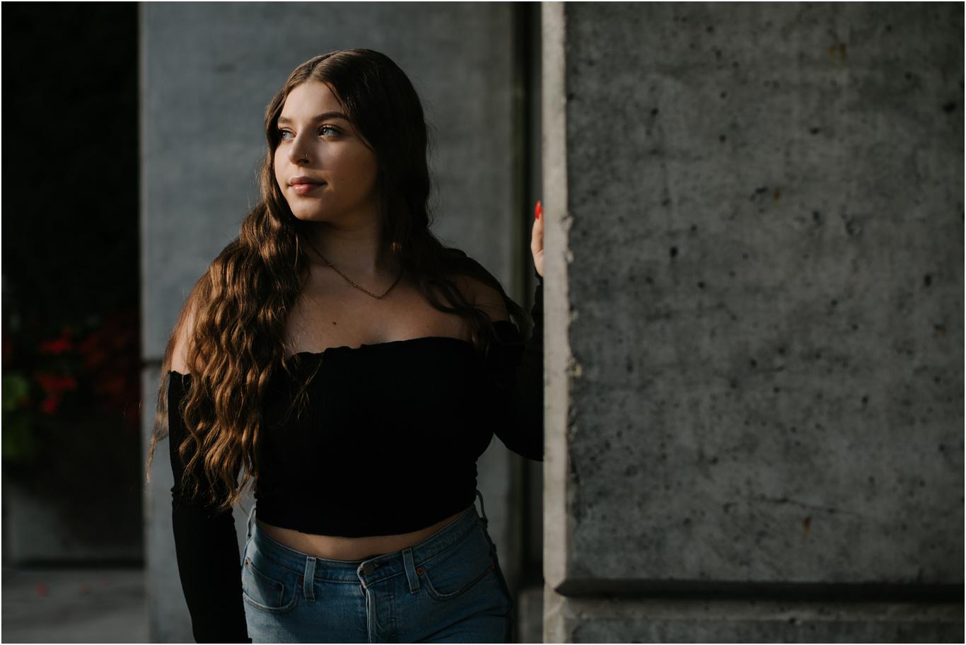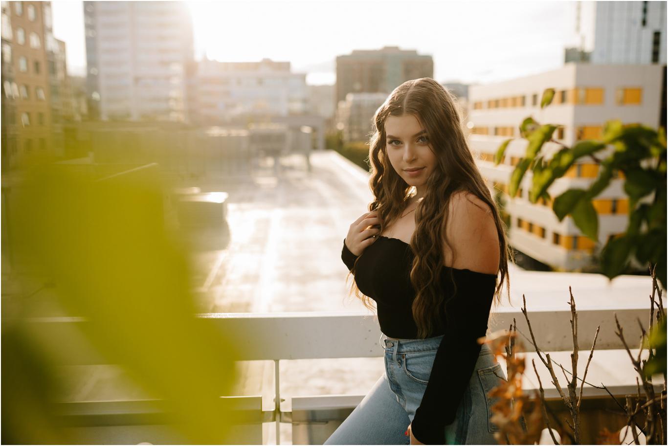 Oh my gosh I had SO much fun taking these downtown Portland senior pictures for Zorya! She is so gorgeous and we had such a fun time taking unique senior pictures in all sorts of gorgeous lighting! We started out downtown Portland senior pictures in the Pearl District. We explored around Lovejoy and Tanner Springs Park, catching pockets of bold light that really highlighted her stunning blue eyes. I love working with seniors who trust me to play with light and create imagery that is a little bolder and more unique! Zorya was totally down for that! Afterwards, we traded the west side for the east side and head down the Eastbank Esplanade near OMSI for some photos along the river. I shoot at this spot often but it never disappoints! It’s such a good place for downtown Portland senior pictures! I love the soft light at dusk with the awesome city views of Portland