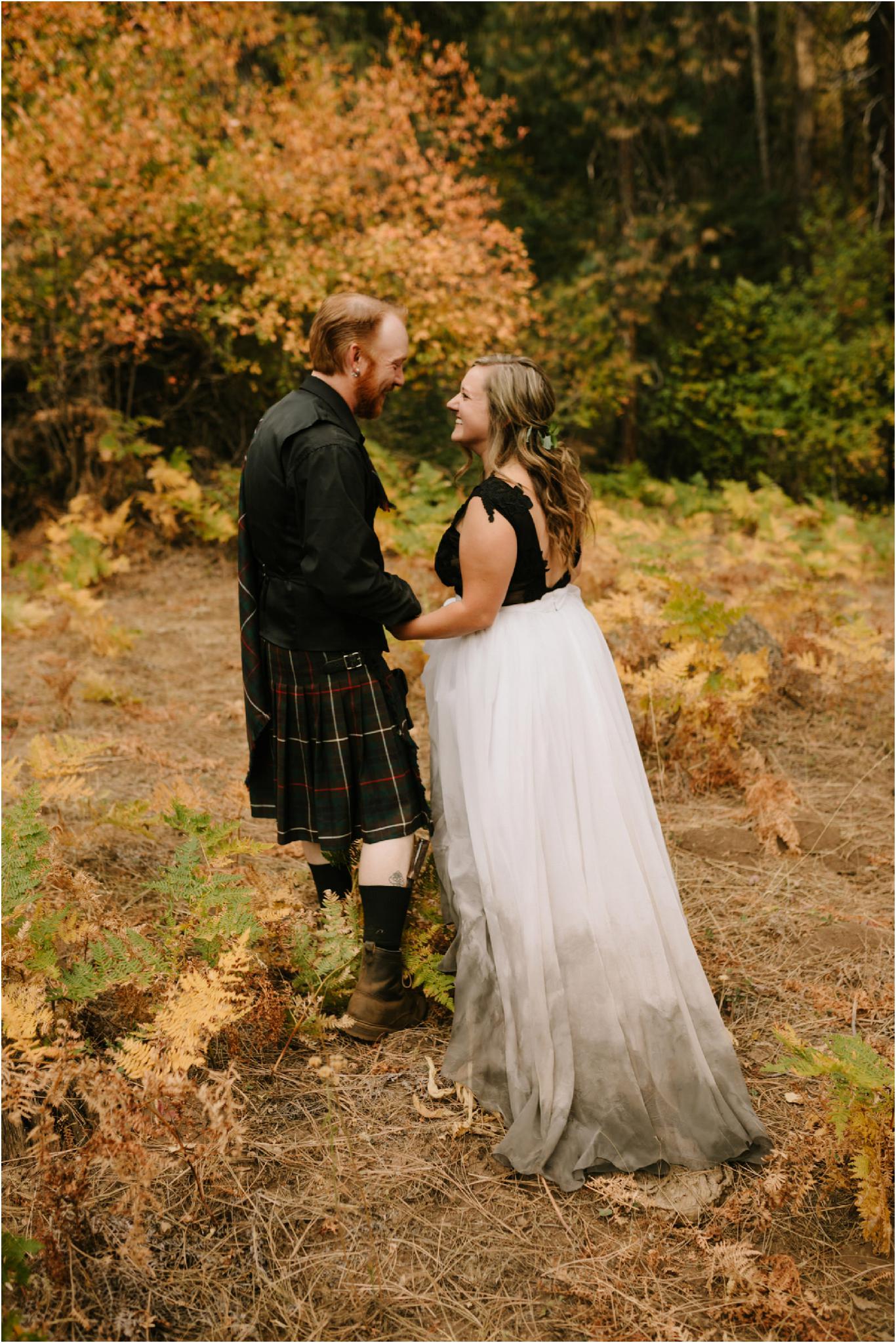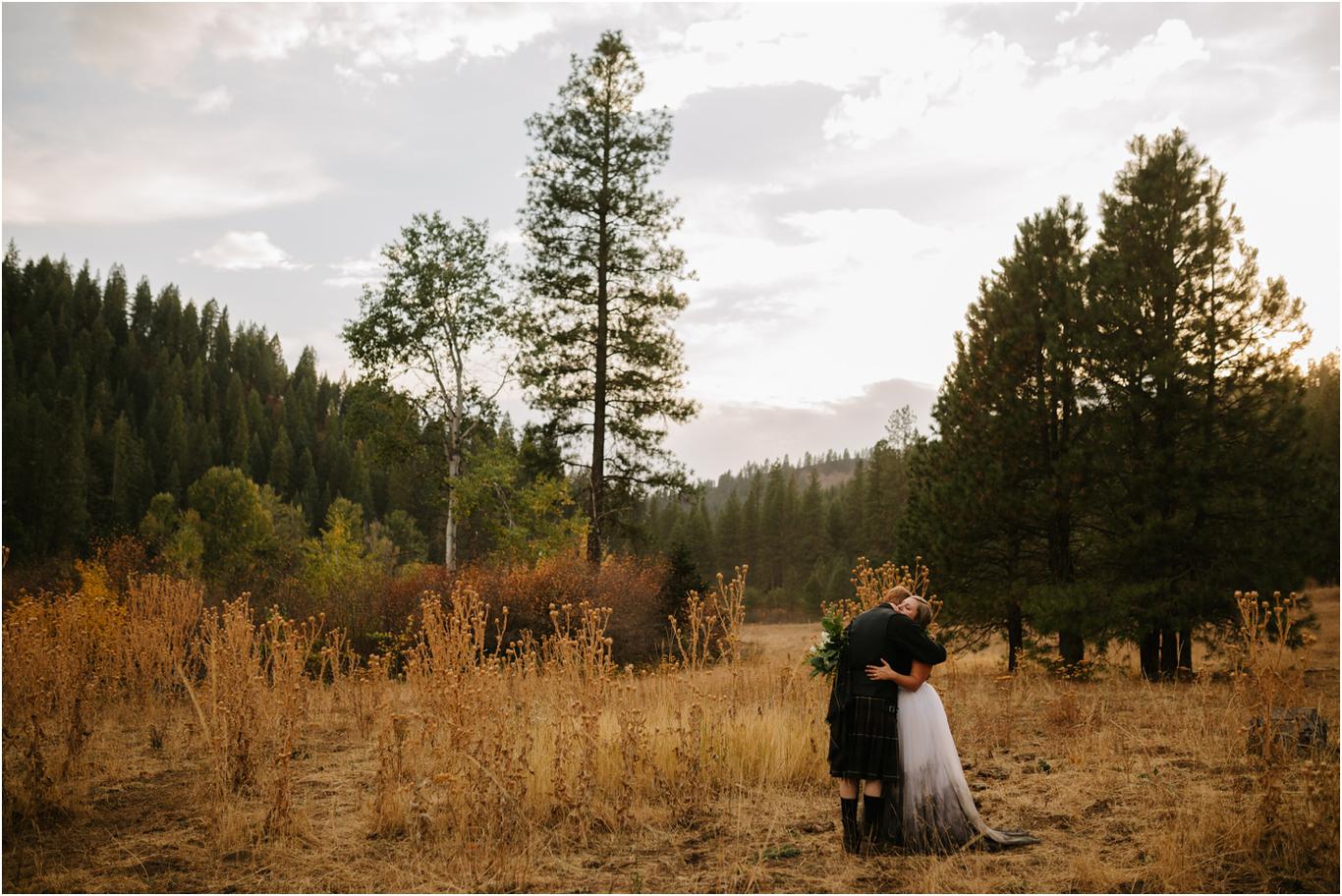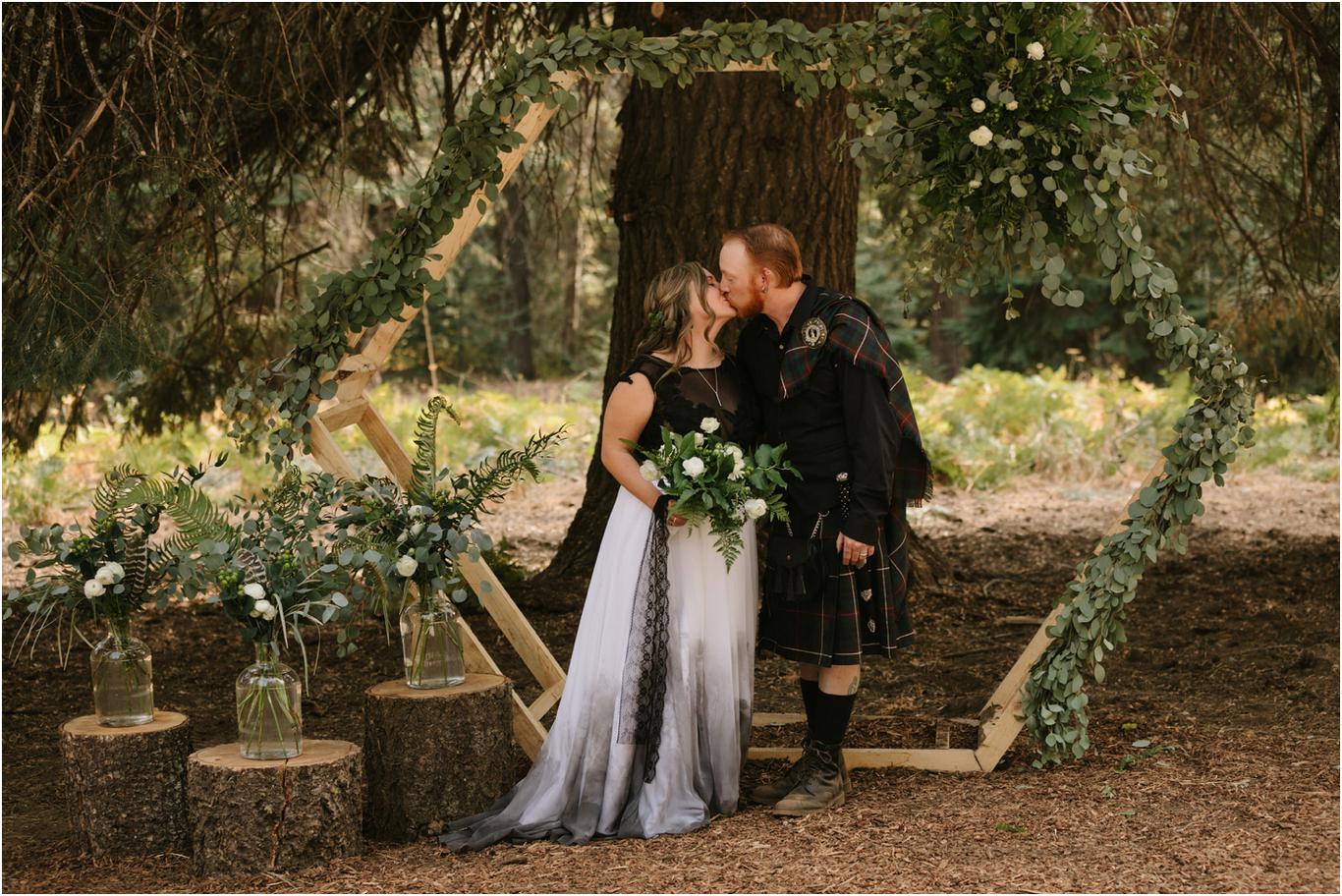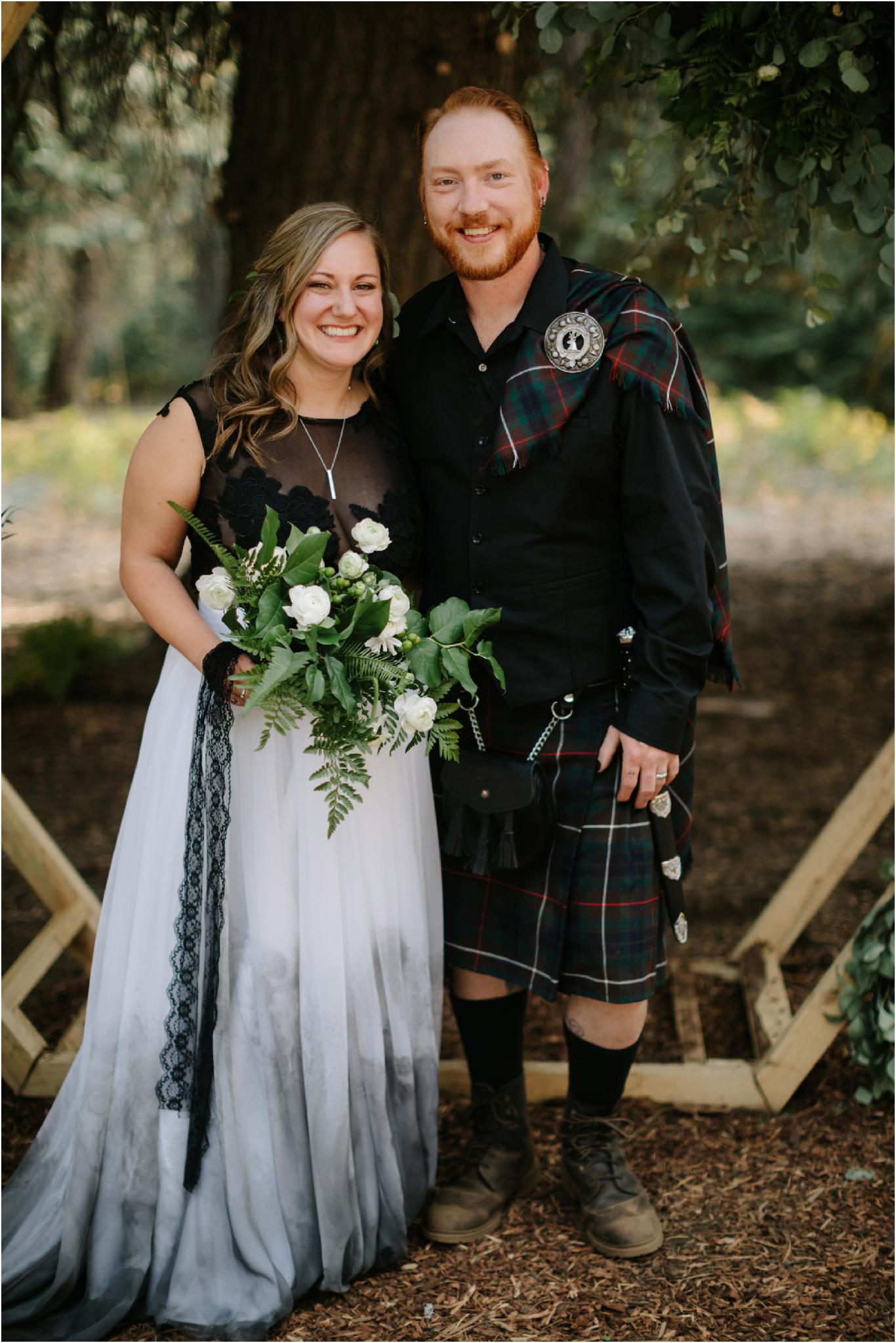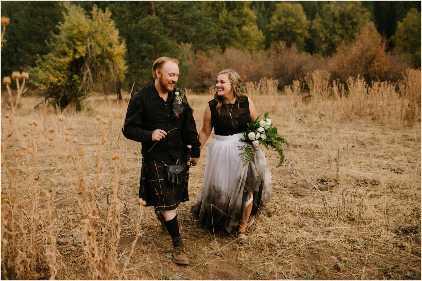Josh’s family has deep ties to the land around Halfway. Like, seriously deep. His family actually came over on the Oregon Trail around 1868 (SO COOL!!!) and have lived there ever since. He told me that he has 6+ generations buried at the local cemetery. As we were driving around, he pointed out roads that his grandfather helped blast out with dynamite. The town already has a wild west feel to it, but learning the personal history made it even better. I could totally see how Mallory, a Portland girl like me, could fall hopelessly in love with the place and its inhabitants. Mallory and Josh planned their wedding in the town that started it all. They got ready at the lodge in town and a friends house, then held their wedding ceremony on Josh’s family property in the forest. He told me a story about a black bear that charged in the exact meadow they got married in, just a year or two earlier. The ceremony location is called “Pretty Tree,” nicknamed for the tall white fir tree that stands out in a small clearing. His great-grandfather always loved the tree and it was such a romantic spot to get married. Mallory is a graphic designer, and her design skills definitely made this Eastern Oregon wedding special. I was obsessed with the hexagonal ceremony arch, greenery with feathers, and the all the ceremony decor. PLUS she had a dip-dyed black wedding dress and bodysuit from Sweet Caroline Styles! How cool is that? Her outfit paired SO well with Josh’s traditional kilt that he wore to represent his family’s Fraser clan.