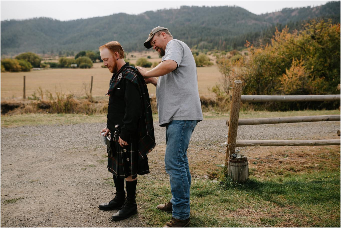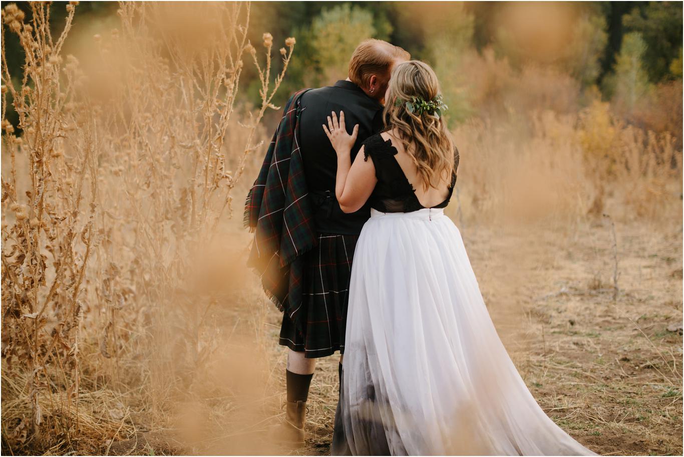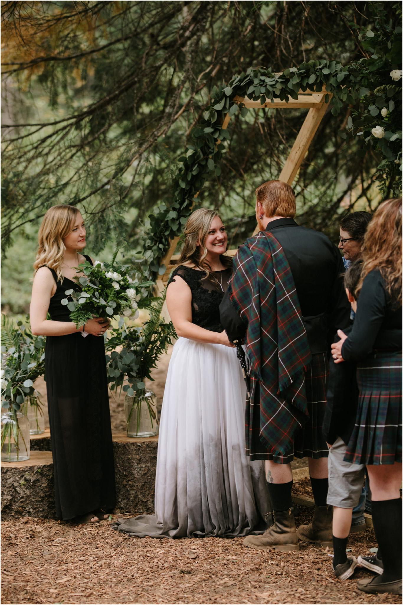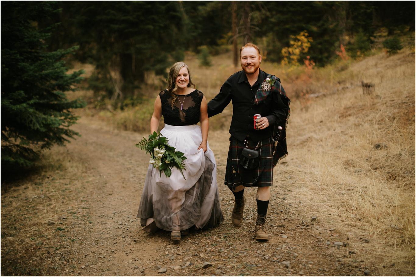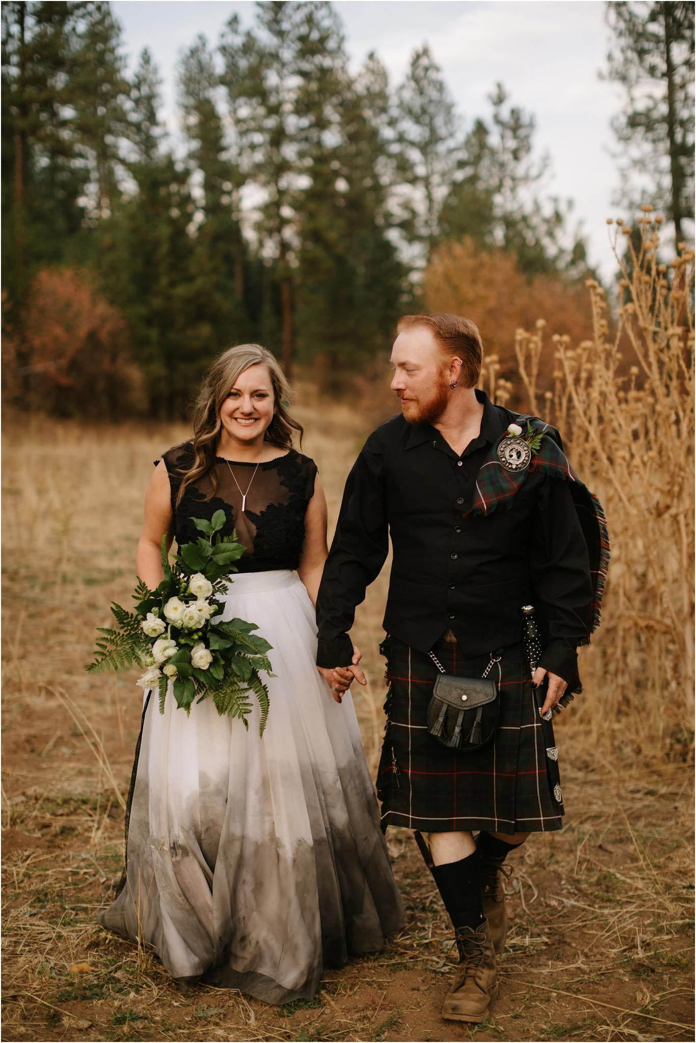 Josh’s family has deep ties to the land around Halfway. Like, seriously deep. His family actually came over on the Oregon Trail around 1868 (SO COOL!!!) and have lived there ever since. He told me that he has 6+ generations buried at the local cemetery. As we were driving around, he pointed out roads that his grandfather helped blast out with dynamite. The town already has a wild west feel to it, but learning the personal history made it even better. I could totally see how Mallory, a Portland girl like me, could fall hopelessly in love with the place and its inhabitants. Mallory and Josh planned their wedding in the town that started it all. They got ready at the lodge in town and a friends house, then held their wedding ceremony on Josh’s family property in the forest. He told me a story about a black bear that charged in the exact meadow they got married in, just a year or two earlier. The ceremony location is called “Pretty Tree,” nicknamed for the tall white fir tree that stands out in a small clearing. His great-grandfather always loved the tree and it was such a romantic spot to get married. Mallory is a graphic designer, and her design skills definitely made this Eastern Oregon wedding special. I was obsessed with the hexagonal ceremony arch, greenery with feathers, and the all the ceremony decor. PLUS she had a dip-dyed black wedding dress and bodysuit from Sweet Caroline Styles! How cool is that? Her outfit paired SO well with Josh’s traditional kilt that he wore to represent his family’s Fraser clan.