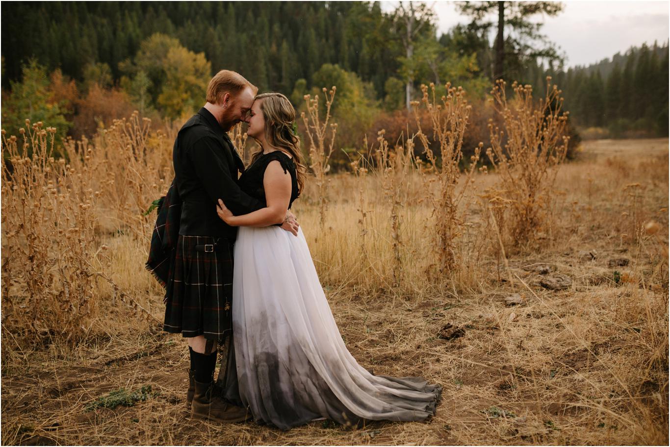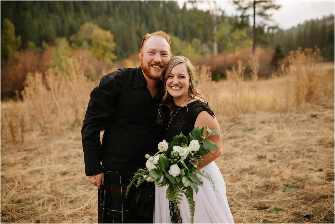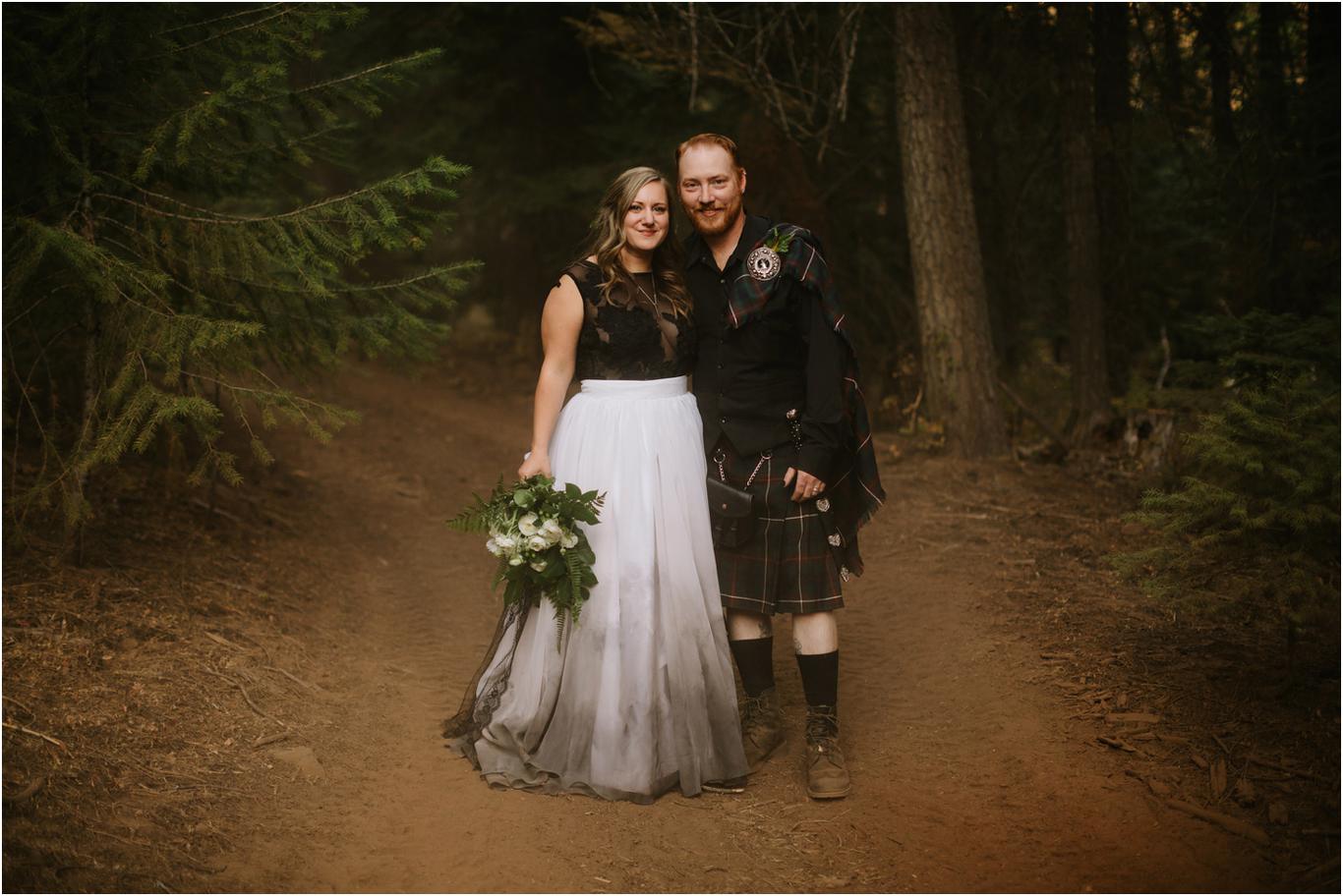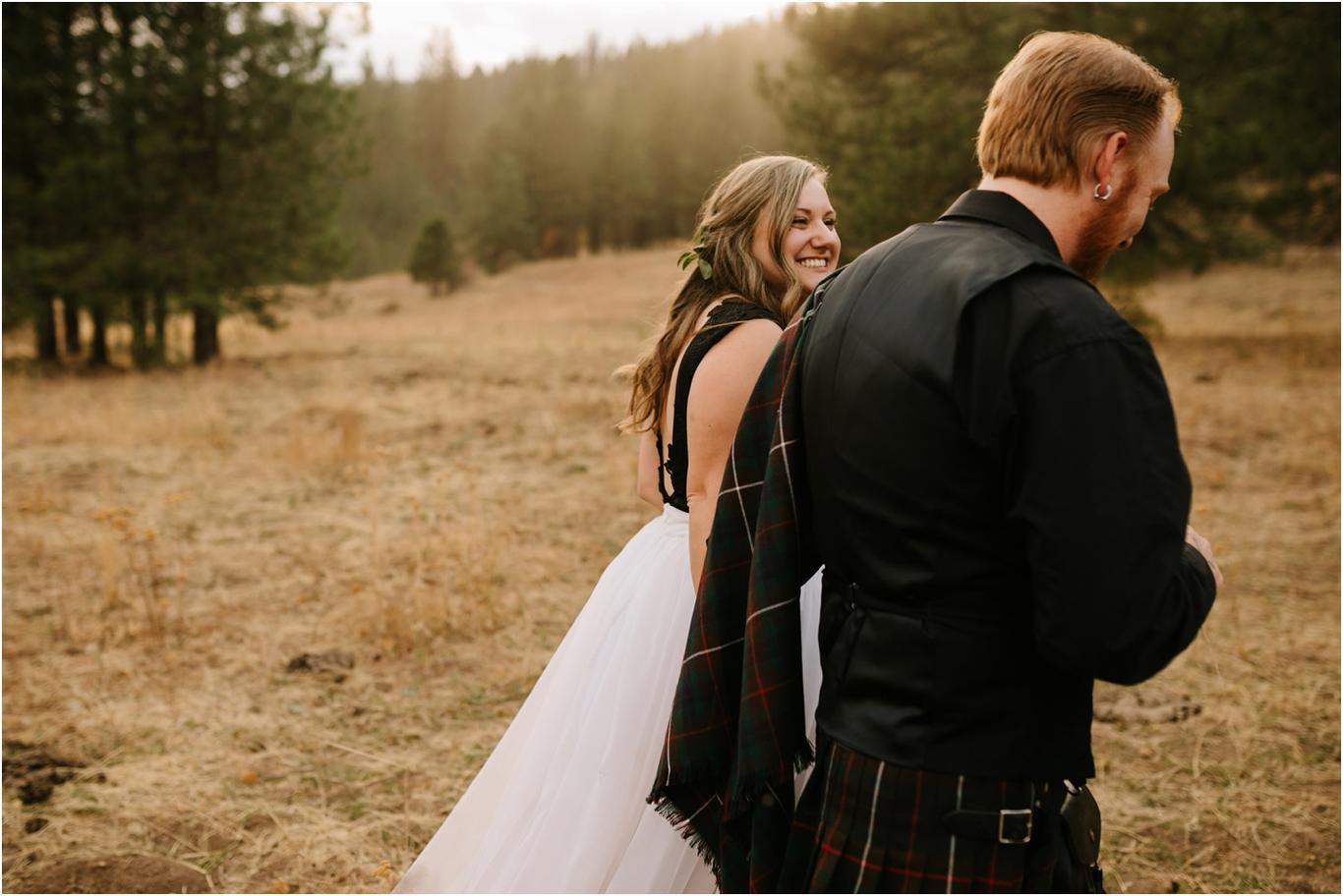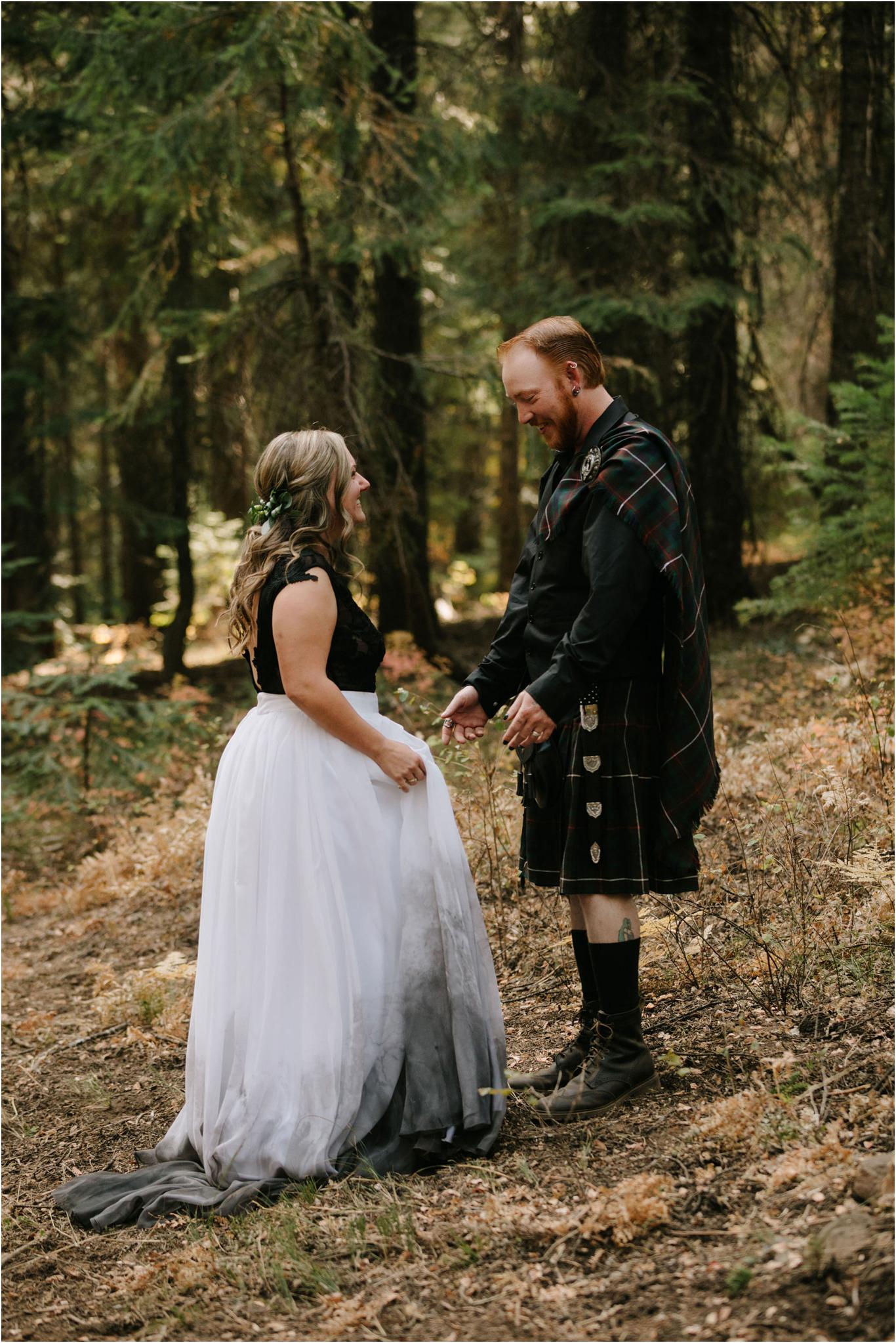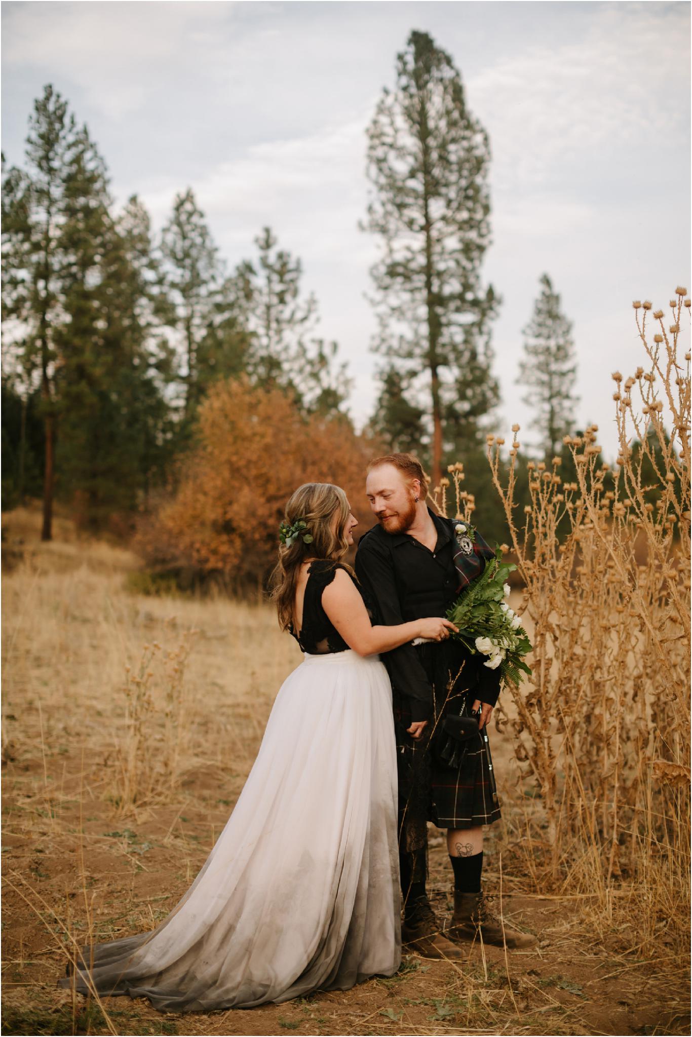 Josh’s family has deep ties to the land around Halfway. Like, seriously deep. His family actually came over on the Oregon Trail around 1868 (SO COOL!!!) and have lived there ever since. He told me that he has 6+ generations buried at the local cemetery. As we were driving around, he pointed out roads that his grandfather helped blast out with dynamite. The town already has a wild west feel to it, but learning the personal history made it even better. I could totally see how Mallory, a Portland girl like me, could fall hopelessly in love with the place and its inhabitants. Mallory and Josh planned their wedding in the town that started it all. They got ready at the lodge in town and a friends house, then held their wedding ceremony on Josh’s family property in the forest. He told me a story about a black bear that charged in the exact meadow they got married in, just a year or two earlier. The ceremony location is called “Pretty Tree,” nicknamed for the tall white fir tree that stands out in a small clearing. His great-grandfather always loved the tree and it was such a romantic spot to get married. Mallory is a graphic designer, and her design skills definitely made this Eastern Oregon wedding special. I was obsessed with the hexagonal ceremony arch, greenery with feathers, and the all the ceremony decor. PLUS she had a dip-dyed black wedding dress and bodysuit from Sweet Caroline Styles! How cool is that? Her outfit paired SO well with Josh’s traditional kilt that he wore to represent his family’s Fraser clan.