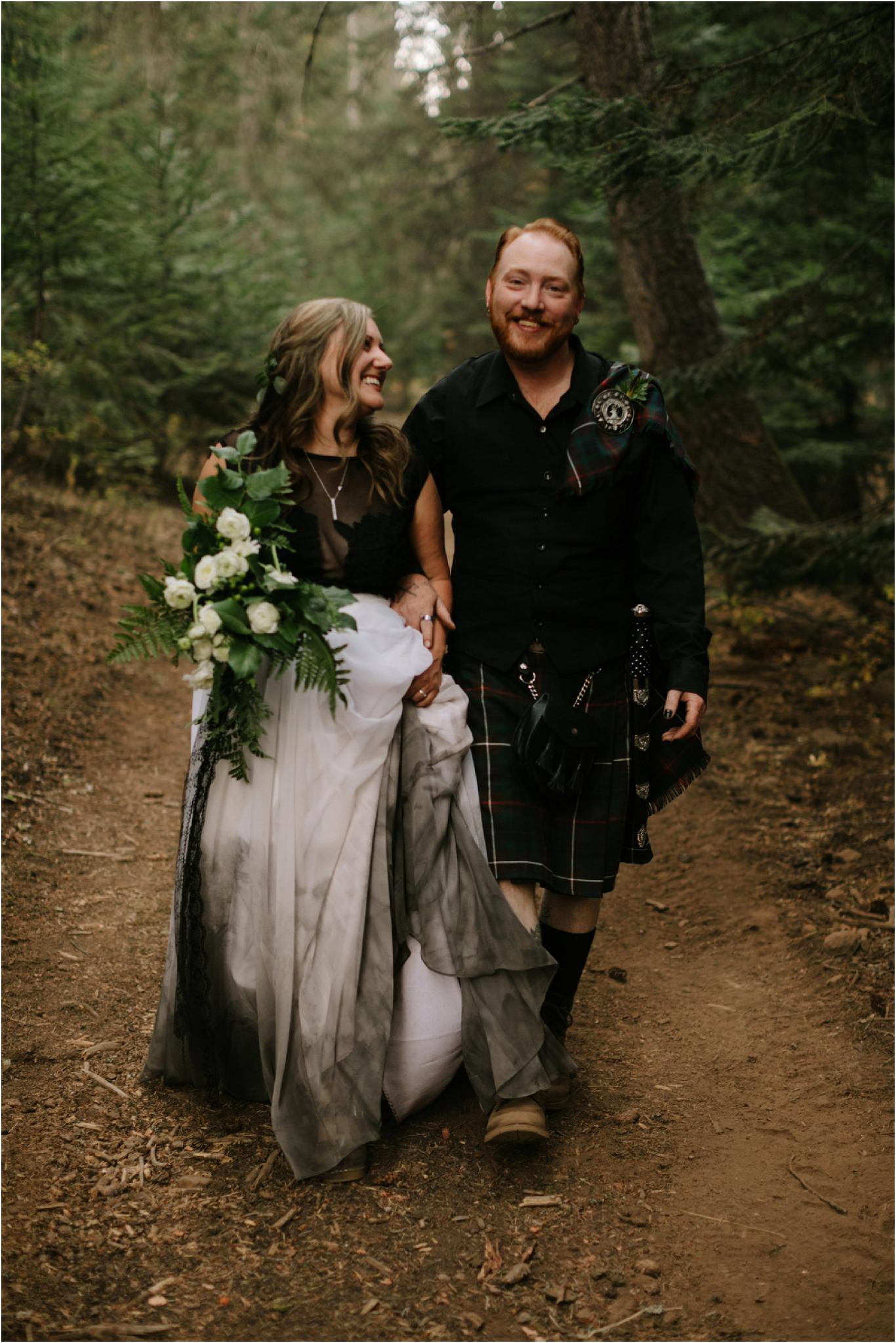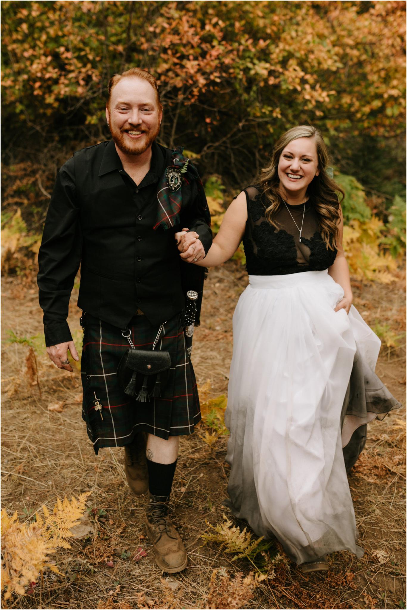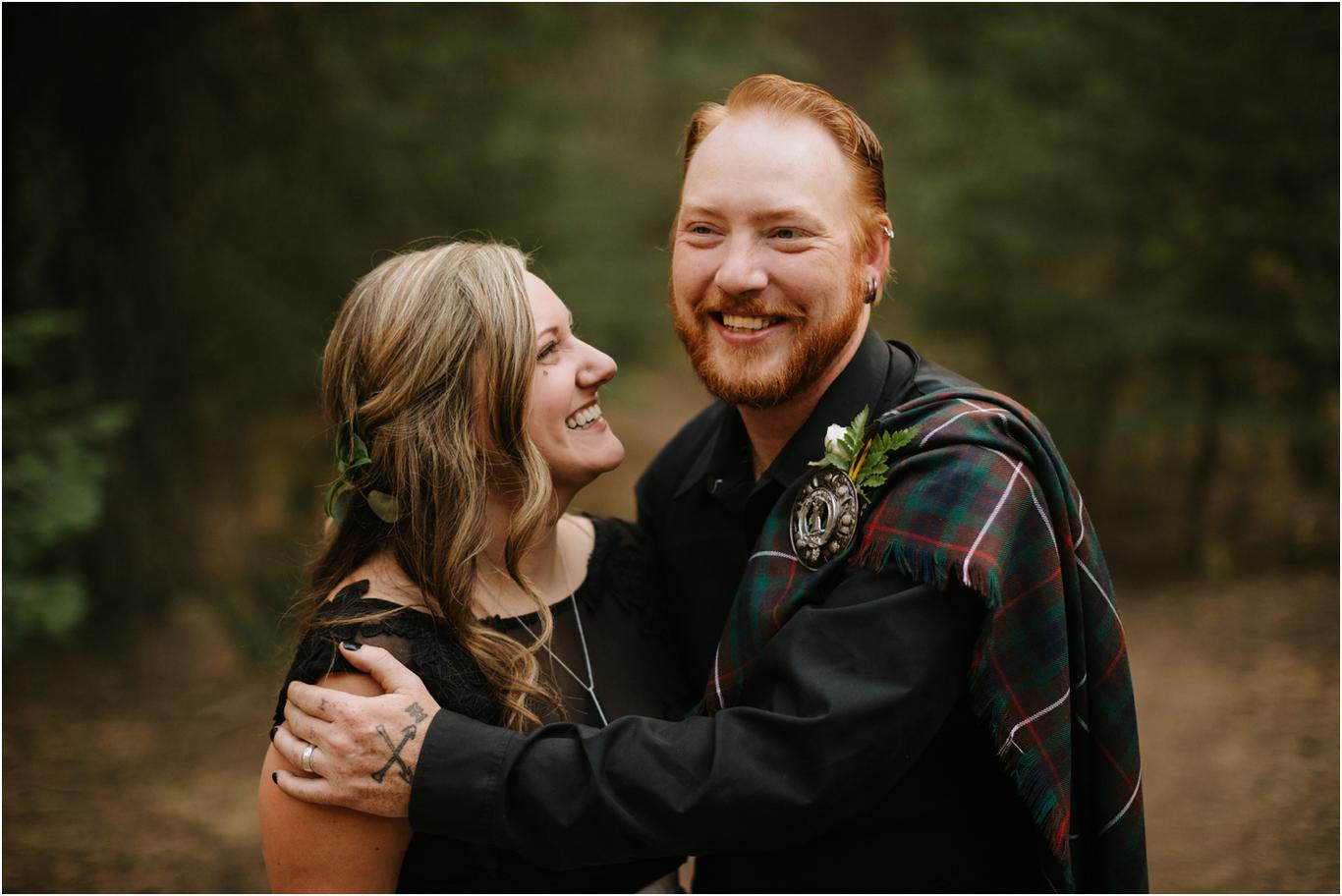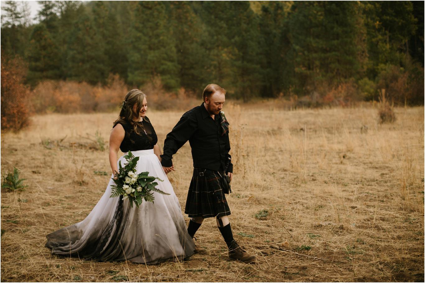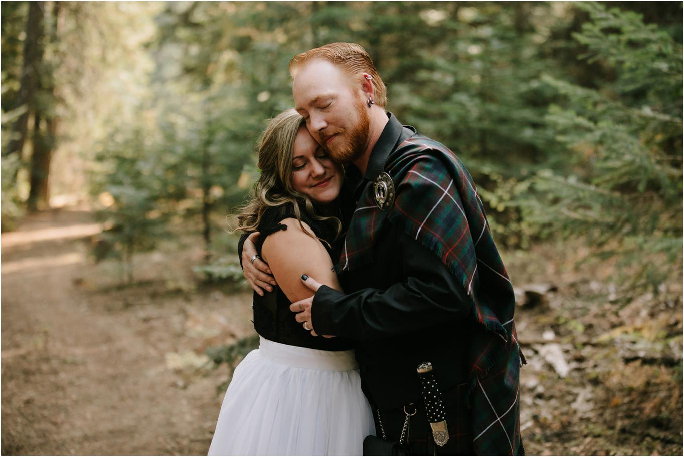 Josh’s family has deep ties to the land around Halfway. Like, seriously deep. His family actually came over on the Oregon Trail around 1868 (SO COOL!!!) and have lived there ever since. He told me that he has 6+ generations buried at the local cemetery. As we were driving around, he pointed out roads that his grandfather helped blast out with dynamite. The town already has a wild west feel to it, but learning the personal history made it even better. I could totally see how Mallory, a Portland girl like me, could fall hopelessly in love with the place and its inhabitants. Mallory and Josh planned their wedding in the town that started it all. They got ready at the lodge in town and a friends house, then held their wedding ceremony on Josh’s family property in the forest. He told me a story about a black bear that charged in the exact meadow they got married in, just a year or two earlier. The ceremony location is called “Pretty Tree,” nicknamed for the tall white fir tree that stands out in a small clearing. His great-grandfather always loved the tree and it was such a romantic spot to get married. Mallory is a graphic designer, and her design skills definitely made this Eastern Oregon wedding special. I was obsessed with the hexagonal ceremony arch, greenery with feathers, and the all the ceremony decor. PLUS she had a dip-dyed black wedding dress and bodysuit from Sweet Caroline Styles! How cool is that? Her outfit paired SO well with Josh’s traditional kilt that he wore to represent his family’s Fraser clan.