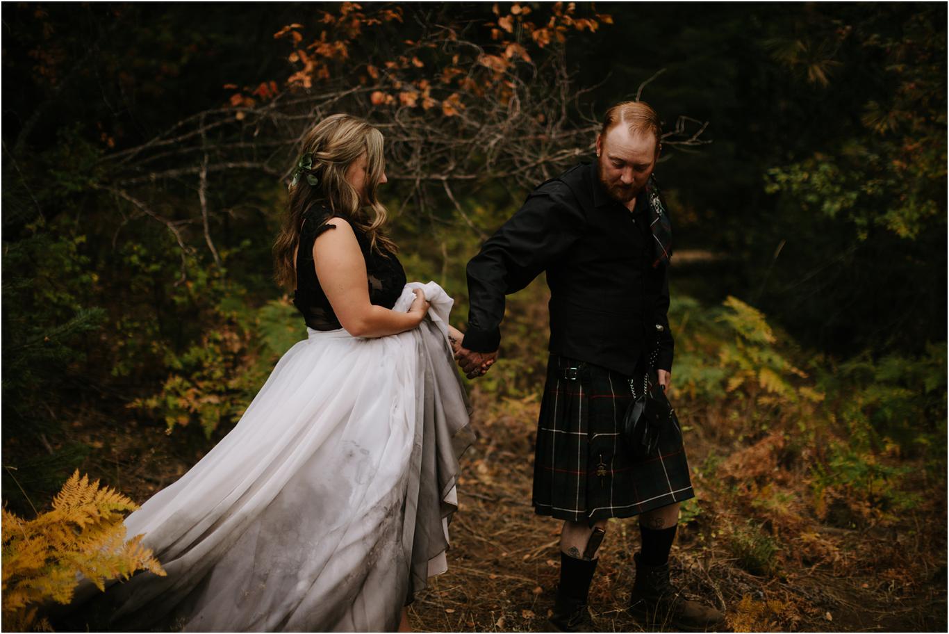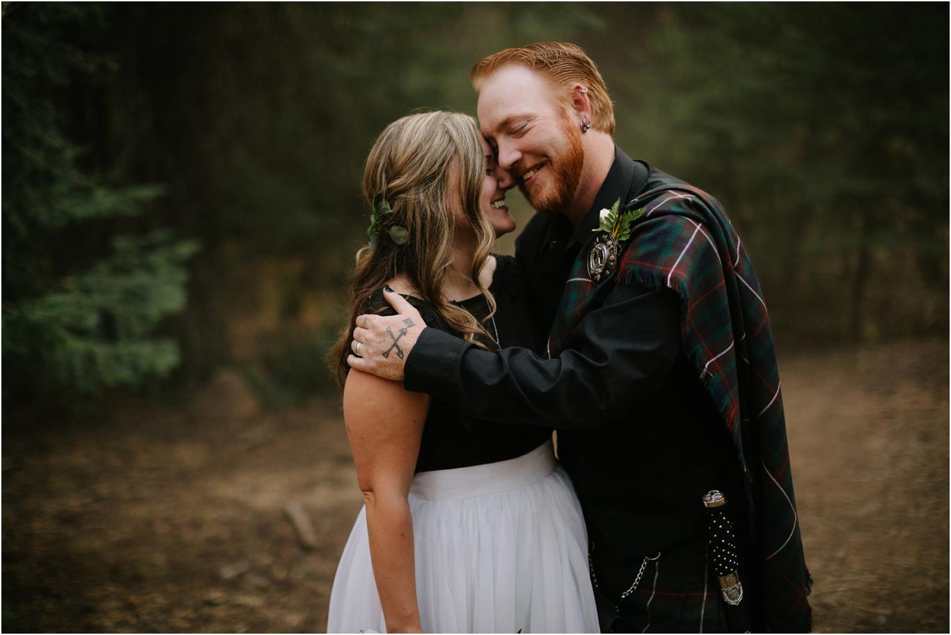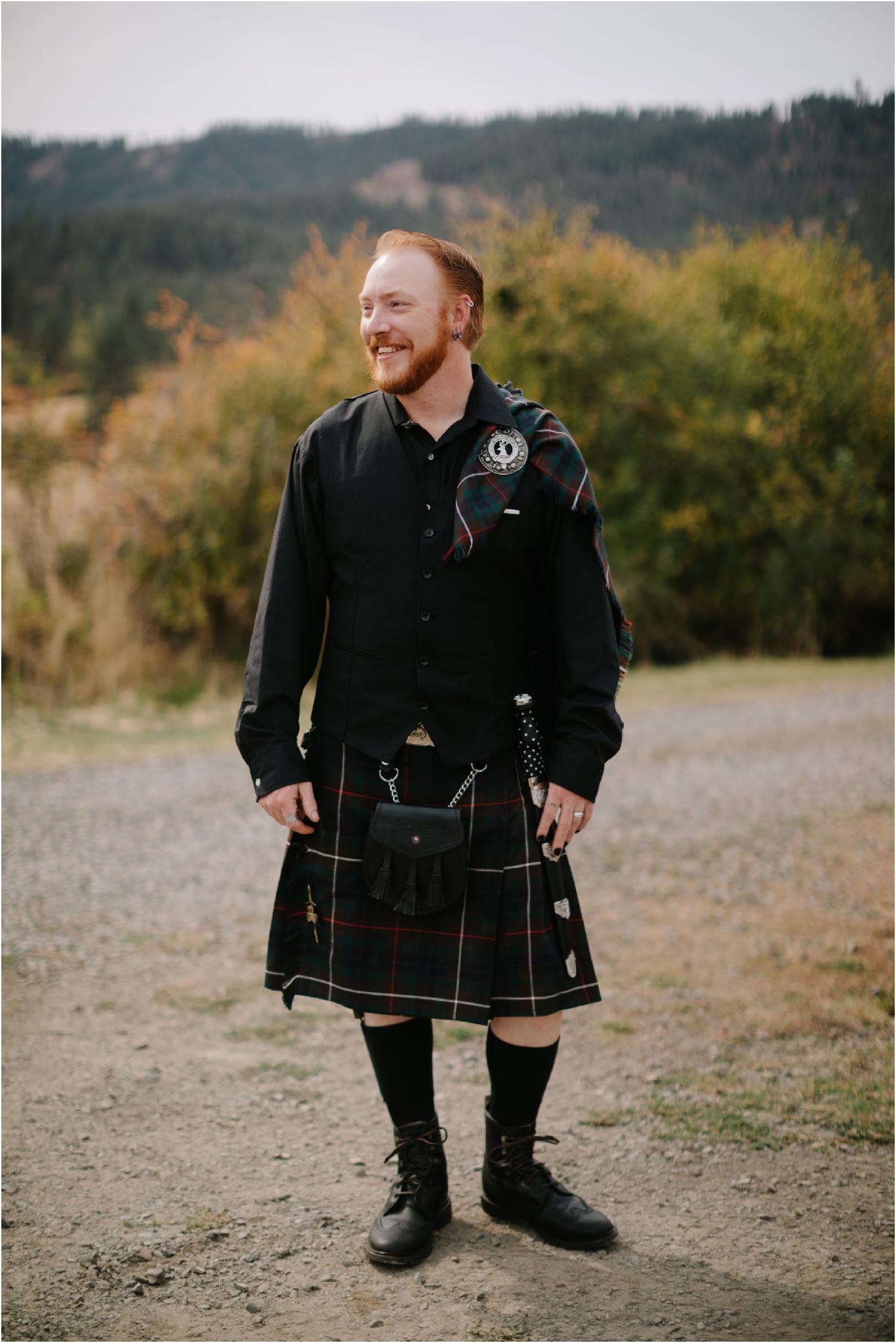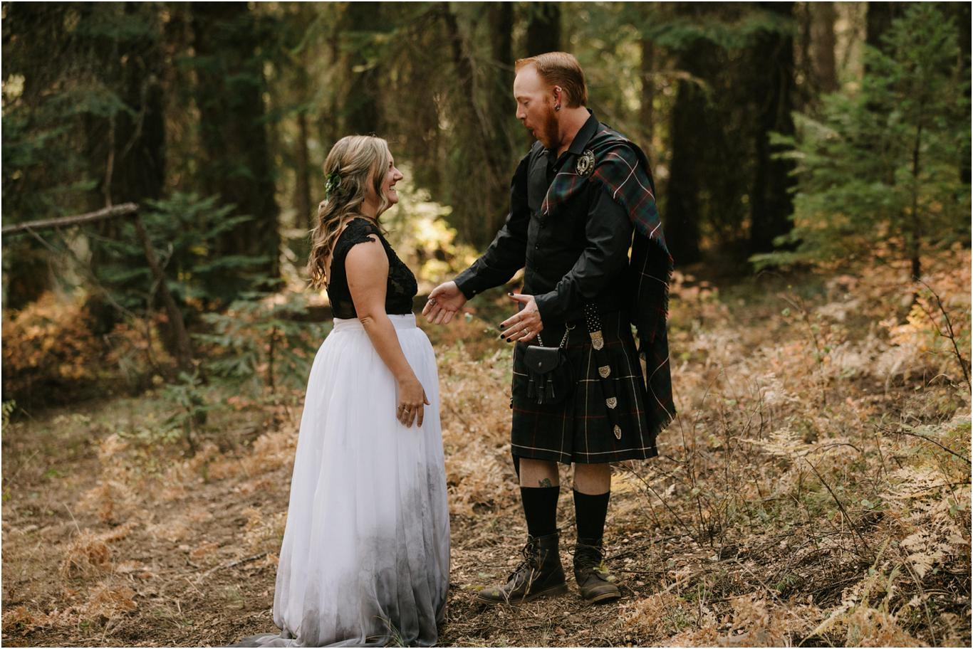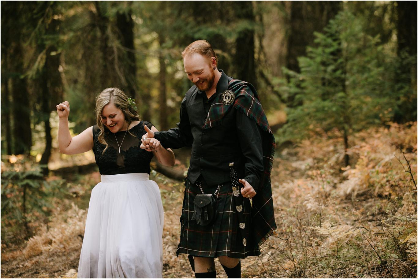 Josh’s family has deep ties to the land around Halfway. Like, seriously deep. His family actually came over on the Oregon Trail around 1868 (SO COOL!!!) and have lived there ever since. He told me that he has 6+ generations buried at the local cemetery. As we were driving around, he pointed out roads that his grandfather helped blast out with dynamite. The town already has a wild west feel to it, but learning the personal history made it even better. I could totally see how Mallory, a Portland girl like me, could fall hopelessly in love with the place and its inhabitants. Mallory and Josh planned their wedding in the town that started it all. They got ready at the lodge in town and a friends house, then held their wedding ceremony on Josh’s family property in the forest. He told me a story about a black bear that charged in the exact meadow they got married in, just a year or two earlier. The ceremony location is called “Pretty Tree,” nicknamed for the tall white fir tree that stands out in a small clearing. His great-grandfather always loved the tree and it was such a romantic spot to get married. Mallory is a graphic designer, and her design skills definitely made this Eastern Oregon wedding special. I was obsessed with the hexagonal ceremony arch, greenery with feathers, and the all the ceremony decor. PLUS she had a dip-dyed black wedding dress and bodysuit from Sweet Caroline Styles! How cool is that? Her outfit paired SO well with Josh’s traditional kilt that he wore to represent his family’s Fraser clan.