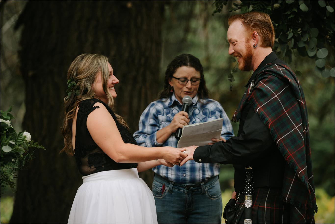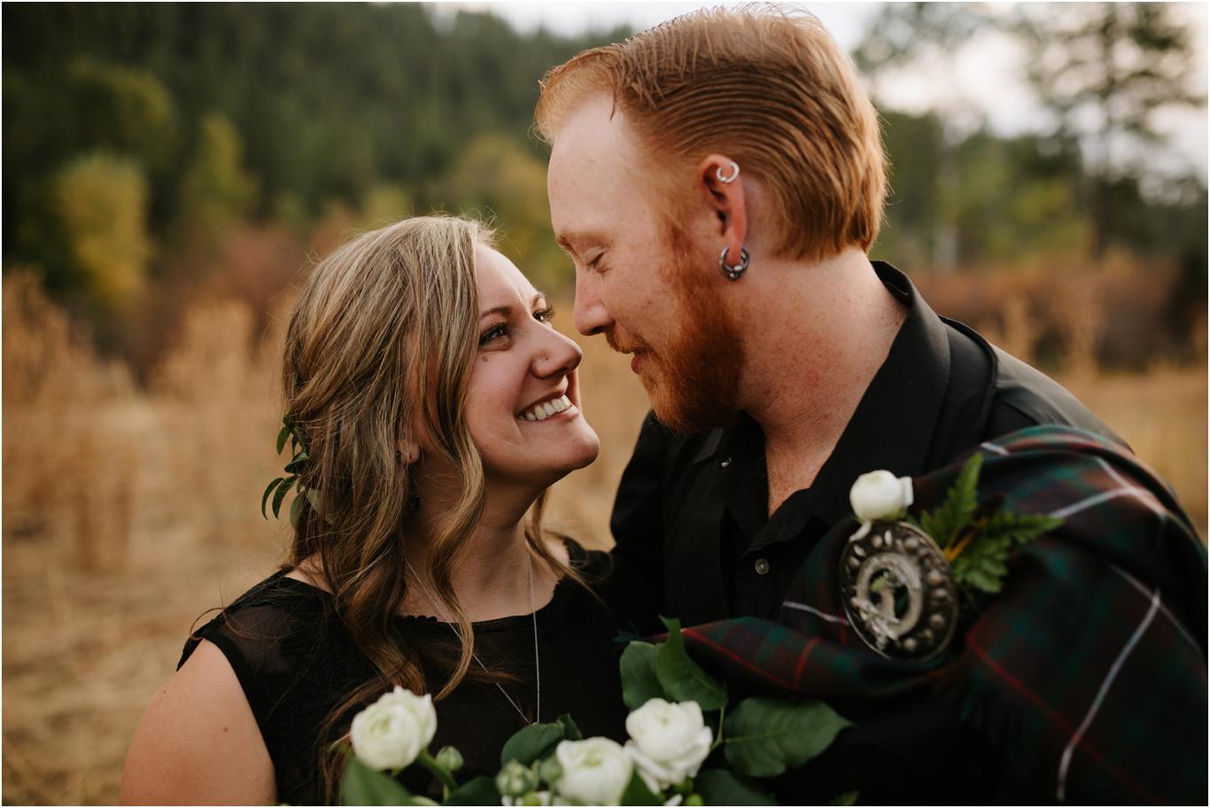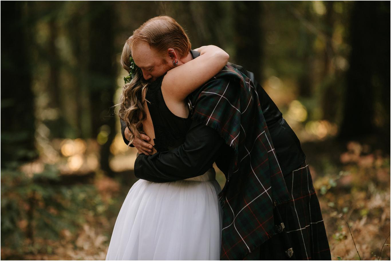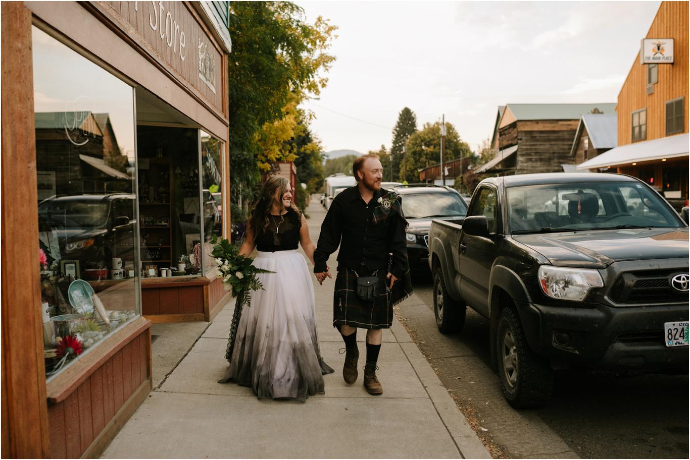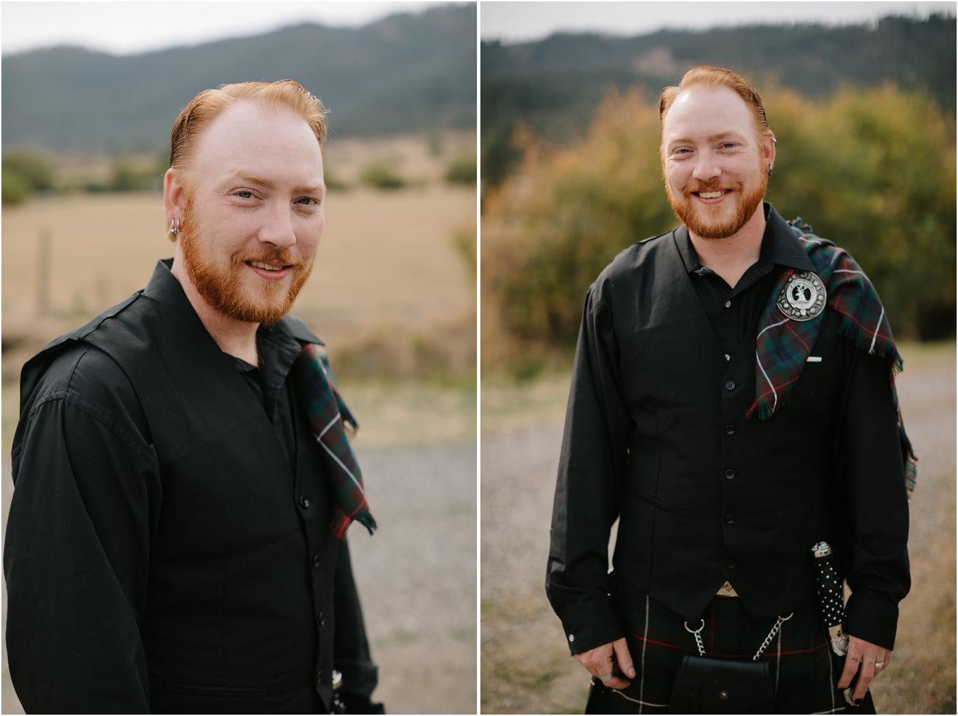 Josh’s family has deep ties to the land around Halfway. Like, seriously deep. His family actually came over on the Oregon Trail around 1868 (SO COOL!!!) and have lived there ever since. He told me that he has 6+ generations buried at the local cemetery. As we were driving around, he pointed out roads that his grandfather helped blast out with dynamite. The town already has a wild west feel to it, but learning the personal history made it even better. I could totally see how Mallory, a Portland girl like me, could fall hopelessly in love with the place and its inhabitants. Mallory and Josh planned their wedding in the town that started it all. They got ready at the lodge in town and a friends house, then held their wedding ceremony on Josh’s family property in the forest. He told me a story about a black bear that charged in the exact meadow they got married in, just a year or two earlier. The ceremony location is called “Pretty Tree,” nicknamed for the tall white fir tree that stands out in a small clearing. His great-grandfather always loved the tree and it was such a romantic spot to get married. Mallory is a graphic designer, and her design skills definitely made this Eastern Oregon wedding special. I was obsessed with the hexagonal ceremony arch, greenery with feathers, and the all the ceremony decor. PLUS she had a dip-dyed black wedding dress and bodysuit from Sweet Caroline Styles! How cool is that? Her outfit paired SO well with Josh’s traditional kilt that he wore to represent his family’s Fraser clan.