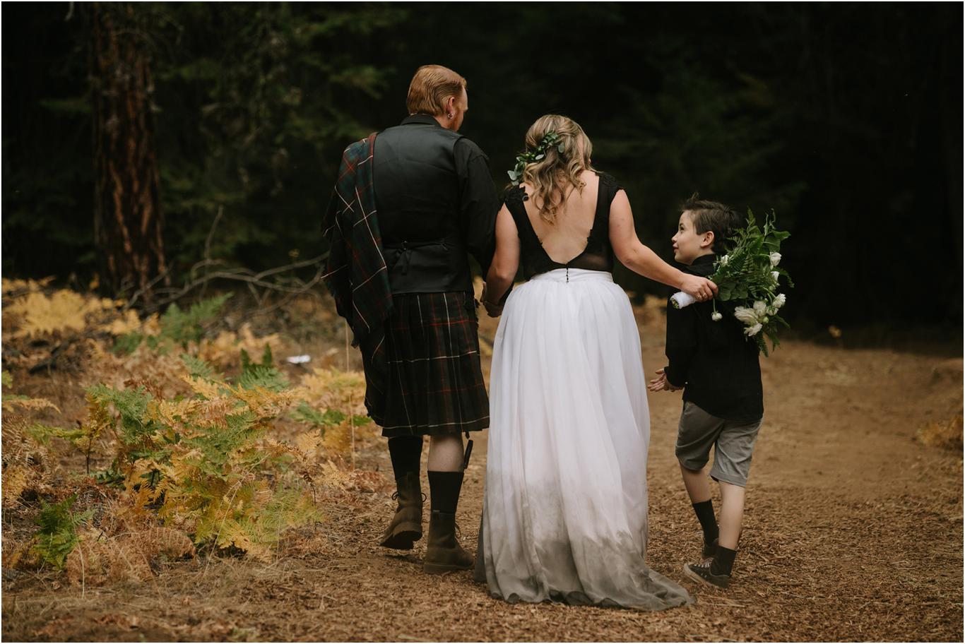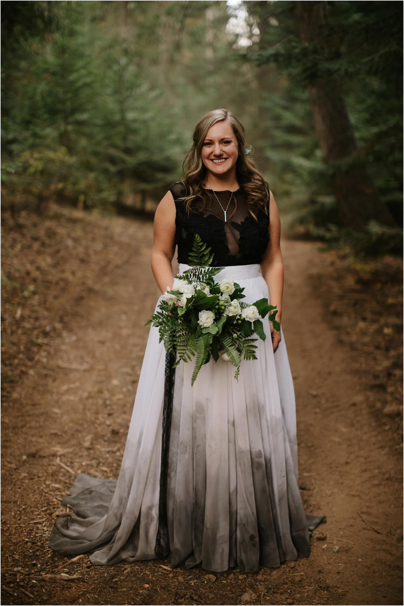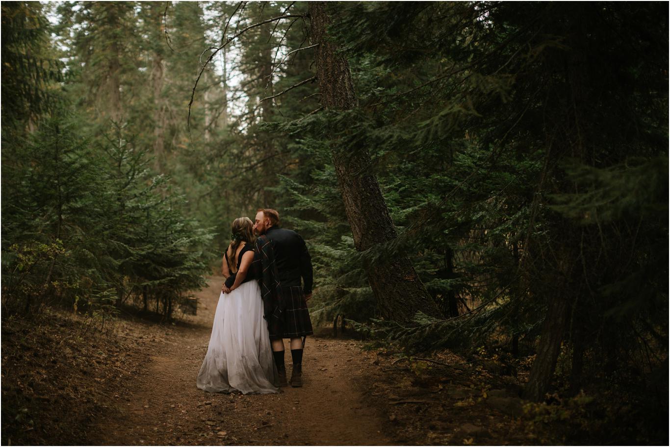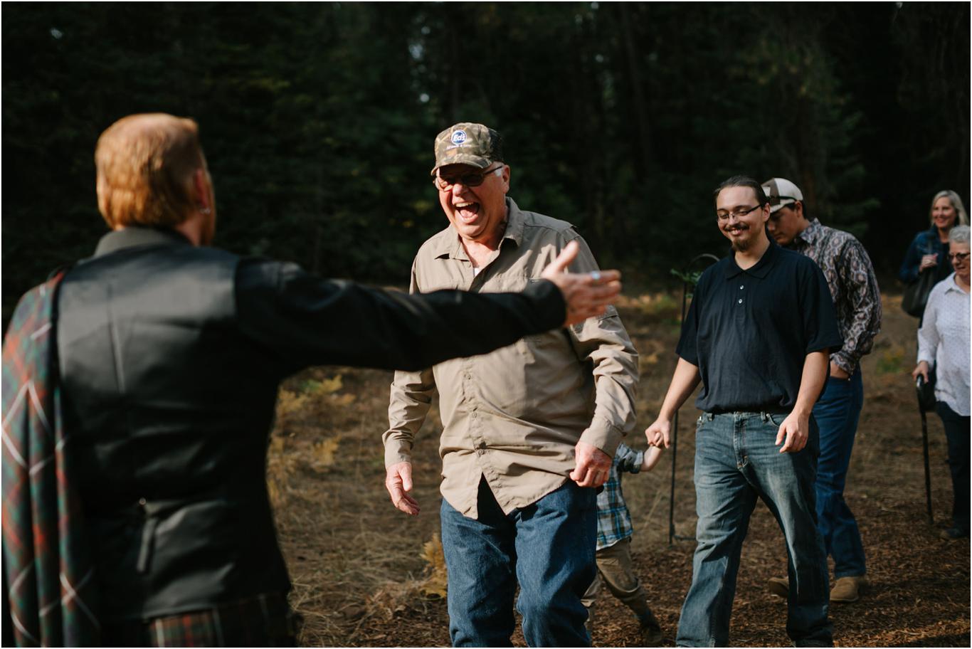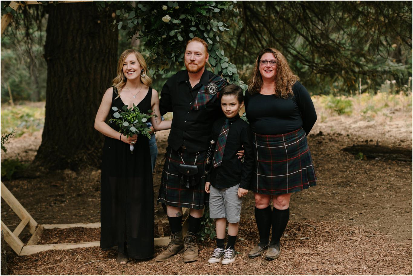Josh’s family has deep ties to the land around Halfway. Like, seriously deep. His family actually came over on the Oregon Trail around 1868 (SO COOL!!!) and have lived there ever since. He told me that he has 6+ generations buried at the local cemetery. As we were driving around, he pointed out roads that his grandfather helped blast out with dynamite. The town already has a wild west feel to it, but learning the personal history made it even better. I could totally see how Mallory, a Portland girl like me, could fall hopelessly in love with the place and its inhabitants. Mallory and Josh planned their wedding in the town that started it all. They got ready at the lodge in town and a friends house, then held their wedding ceremony on Josh’s family property in the forest. He told me a story about a black bear that charged in the exact meadow they got married in, just a year or two earlier. The ceremony location is called “Pretty Tree,” nicknamed for the tall white fir tree that stands out in a small clearing. His great-grandfather always loved the tree and it was such a romantic spot to get married. Mallory is a graphic designer, and her design skills definitely made this Eastern Oregon wedding special. I was obsessed with the hexagonal ceremony arch, greenery with feathers, and the all the ceremony decor. PLUS she had a dip-dyed black wedding dress and bodysuit from Sweet Caroline Styles! How cool is that? Her outfit paired SO well with Josh’s traditional kilt that he wore to represent his family’s Fraser clan.