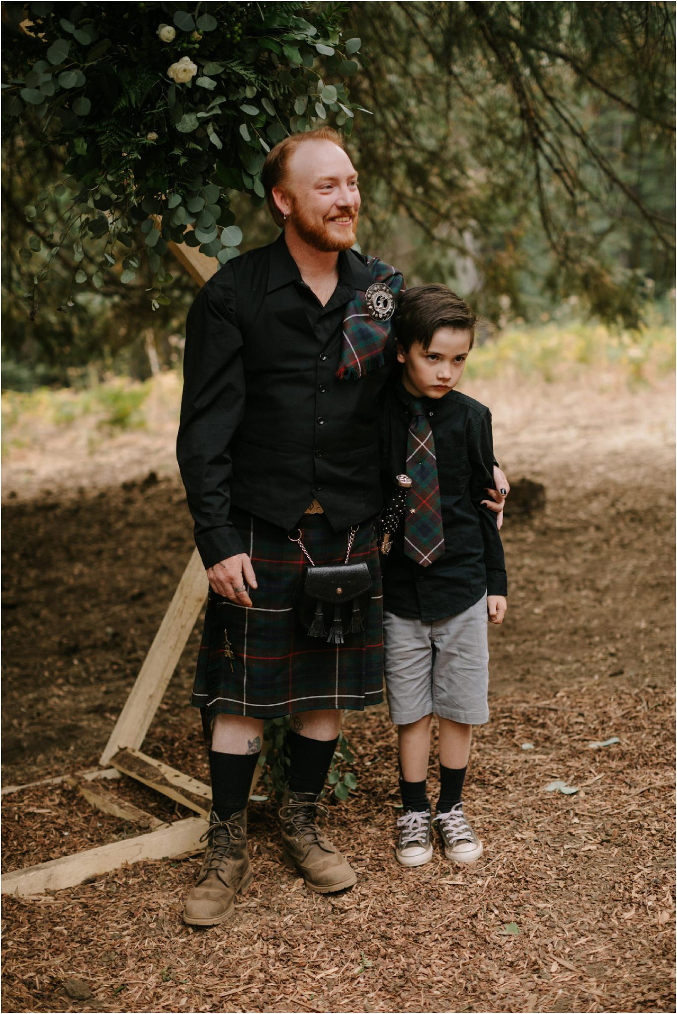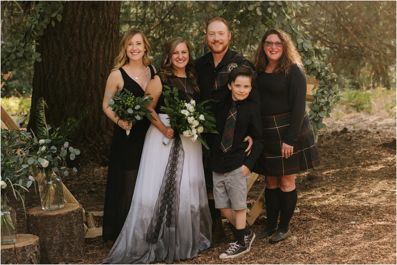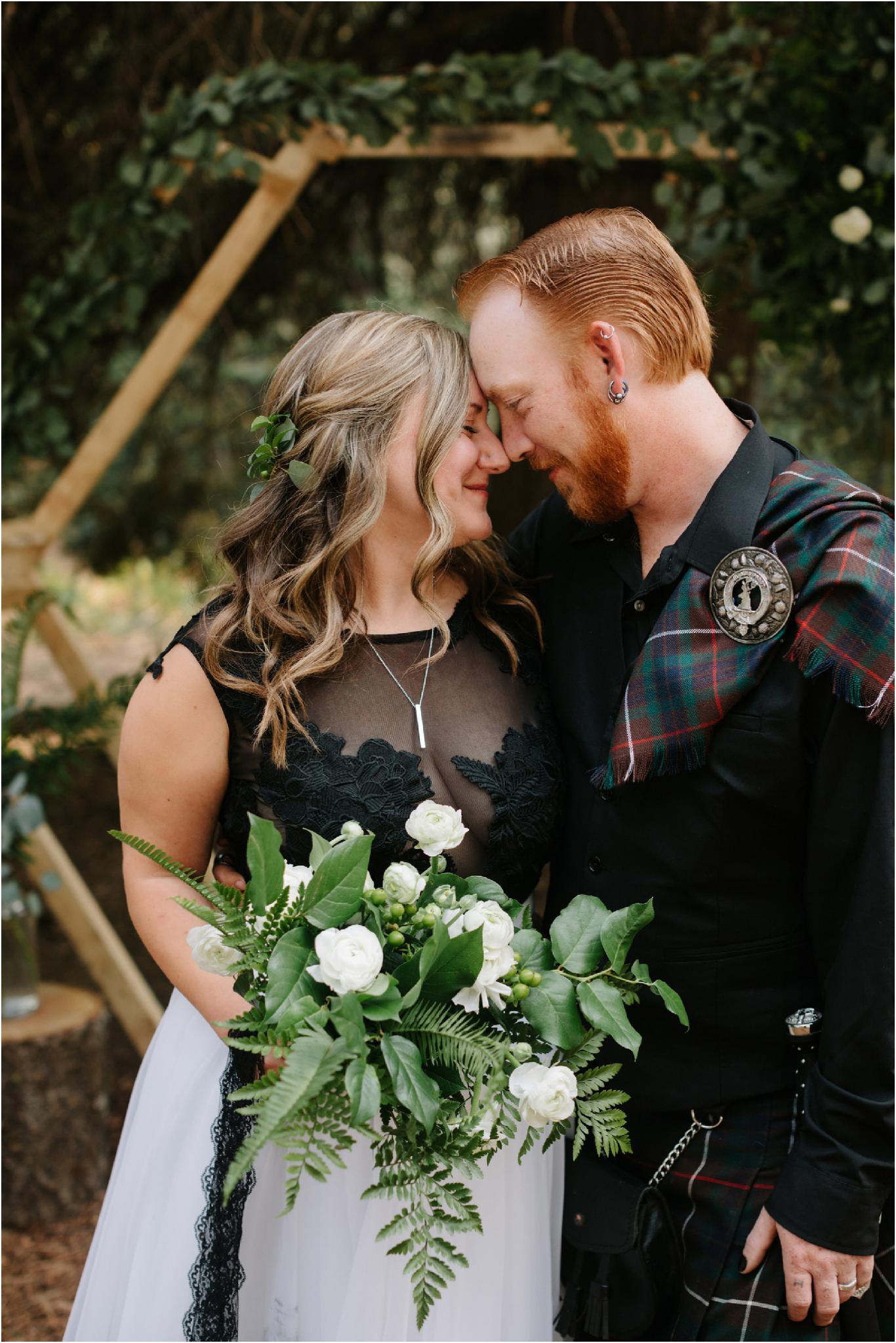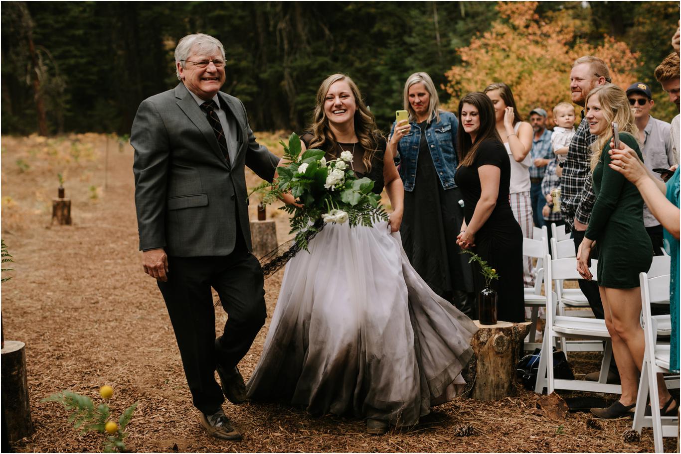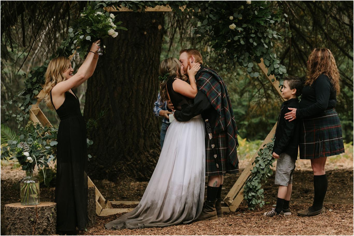 Josh’s family has deep ties to the land around Halfway. Like, seriously deep. His family actually came over on the Oregon Trail around 1868 (SO COOL!!!) and have lived there ever since. He told me that he has 6+ generations buried at the local cemetery. As we were driving around, he pointed out roads that his grandfather helped blast out with dynamite. The town already has a wild west feel to it, but learning the personal history made it even better. I could totally see how Mallory, a Portland girl like me, could fall hopelessly in love with the place and its inhabitants. Mallory and Josh planned their wedding in the town that started it all. They got ready at the lodge in town and a friends house, then held their wedding ceremony on Josh’s family property in the forest. He told me a story about a black bear that charged in the exact meadow they got married in, just a year or two earlier. The ceremony location is called “Pretty Tree,” nicknamed for the tall white fir tree that stands out in a small clearing. His great-grandfather always loved the tree and it was such a romantic spot to get married. Mallory is a graphic designer, and her design skills definitely made this Eastern Oregon wedding special. I was obsessed with the hexagonal ceremony arch, greenery with feathers, and the all the ceremony decor. PLUS she had a dip-dyed black wedding dress and bodysuit from Sweet Caroline Styles! How cool is that? Her outfit paired SO well with Josh’s traditional kilt that he wore to represent his family’s Fraser clan.