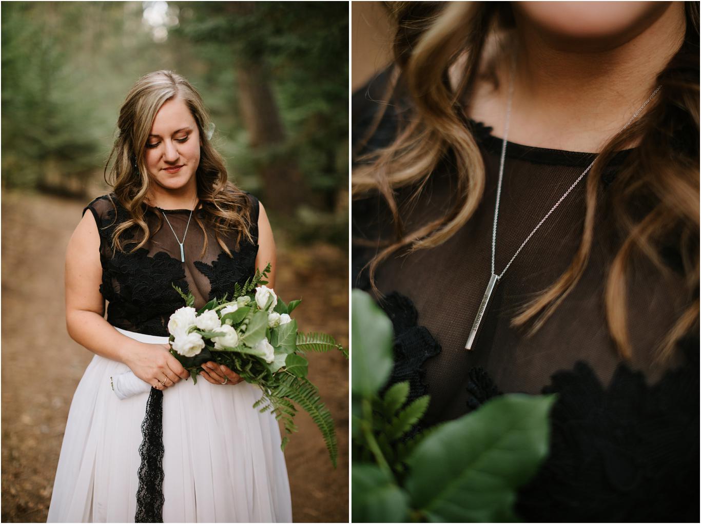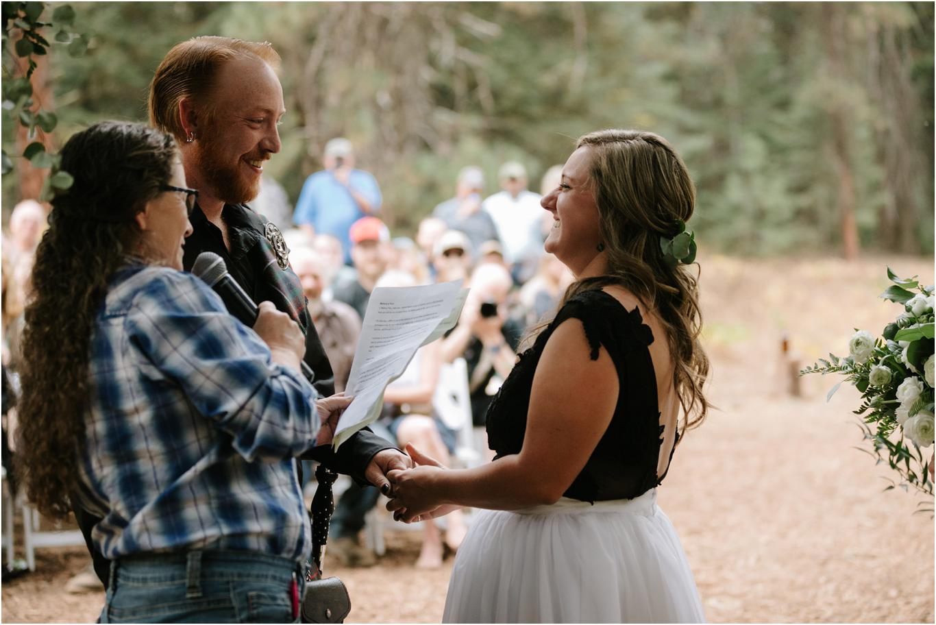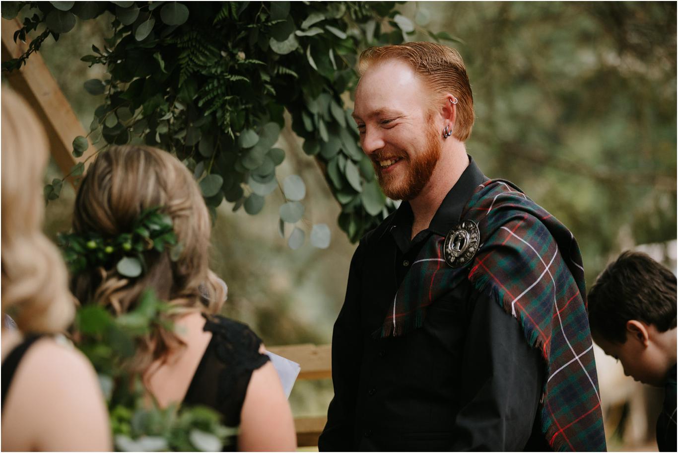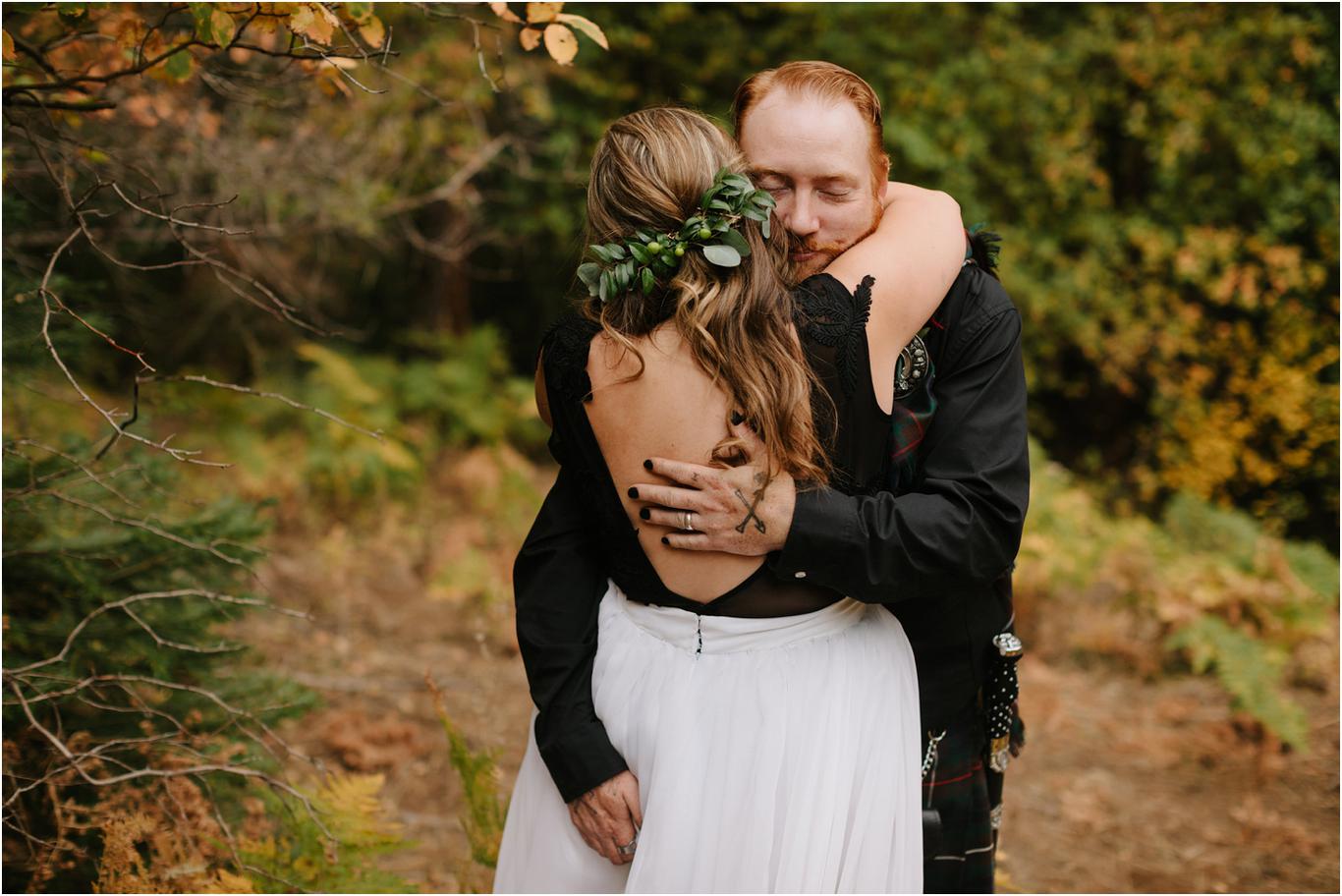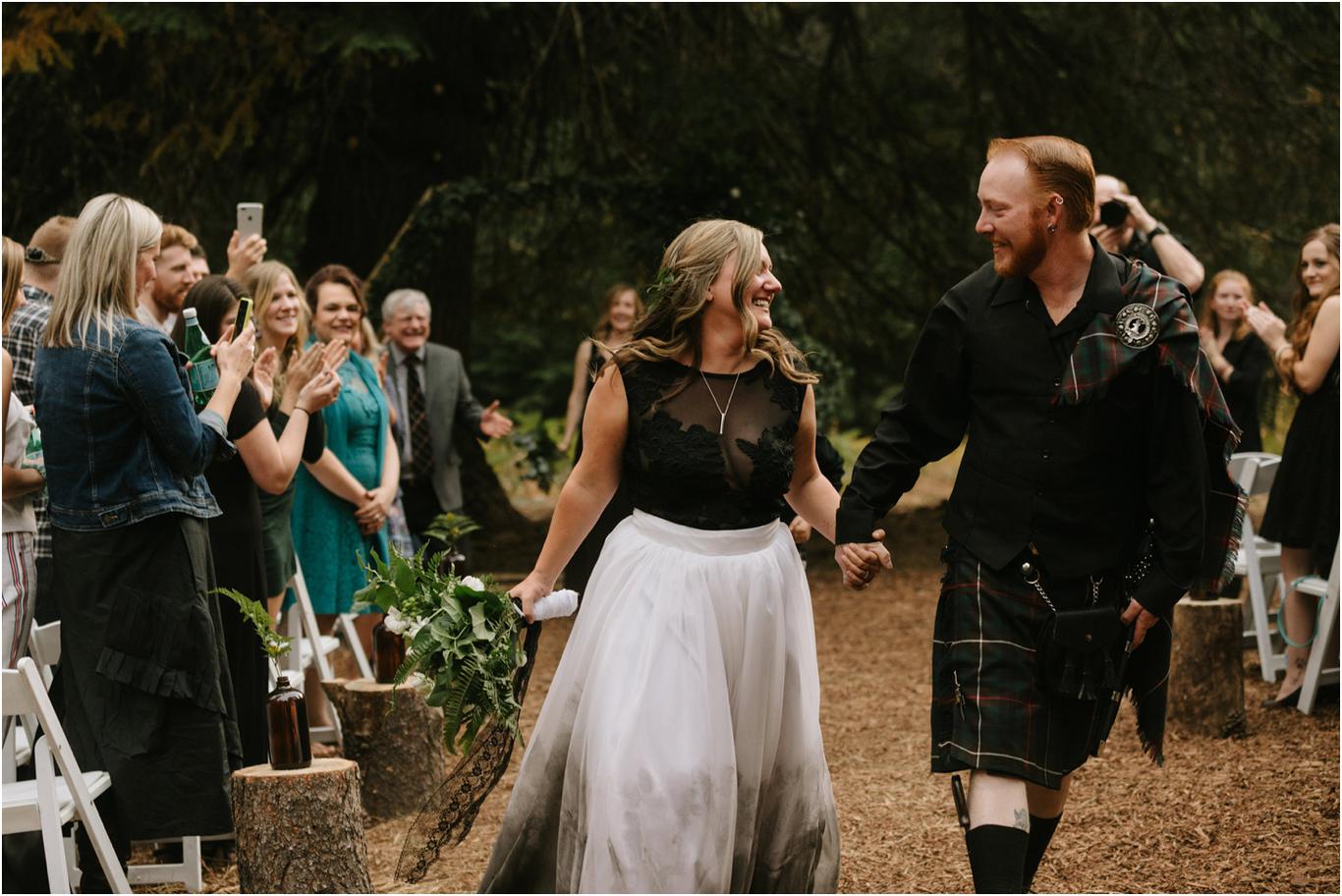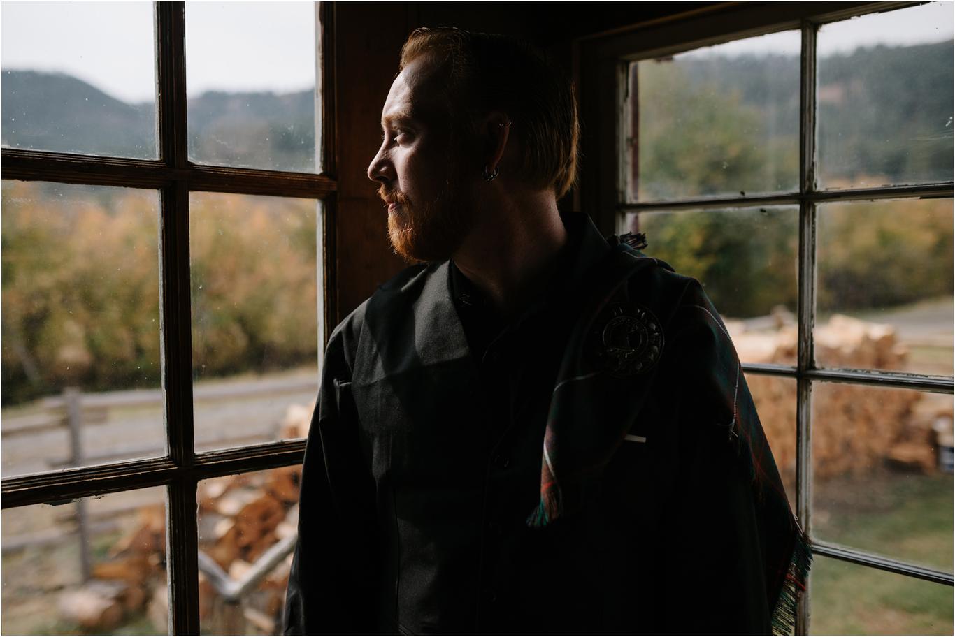 Josh’s family has deep ties to the land around Halfway. Like, seriously deep. His family actually came over on the Oregon Trail around 1868 (SO COOL!!!) and have lived there ever since. He told me that he has 6+ generations buried at the local cemetery. As we were driving around, he pointed out roads that his grandfather helped blast out with dynamite. The town already has a wild west feel to it, but learning the personal history made it even better. I could totally see how Mallory, a Portland girl like me, could fall hopelessly in love with the place and its inhabitants. Mallory and Josh planned their wedding in the town that started it all. They got ready at the lodge in town and a friends house, then held their wedding ceremony on Josh’s family property in the forest. He told me a story about a black bear that charged in the exact meadow they got married in, just a year or two earlier. The ceremony location is called “Pretty Tree,” nicknamed for the tall white fir tree that stands out in a small clearing. His great-grandfather always loved the tree and it was such a romantic spot to get married. Mallory is a graphic designer, and her design skills definitely made this Eastern Oregon wedding special. I was obsessed with the hexagonal ceremony arch, greenery with feathers, and the all the ceremony decor. PLUS she had a dip-dyed black wedding dress and bodysuit from Sweet Caroline Styles! How cool is that? Her outfit paired SO well with Josh’s traditional kilt that he wore to represent his family’s Fraser clan.