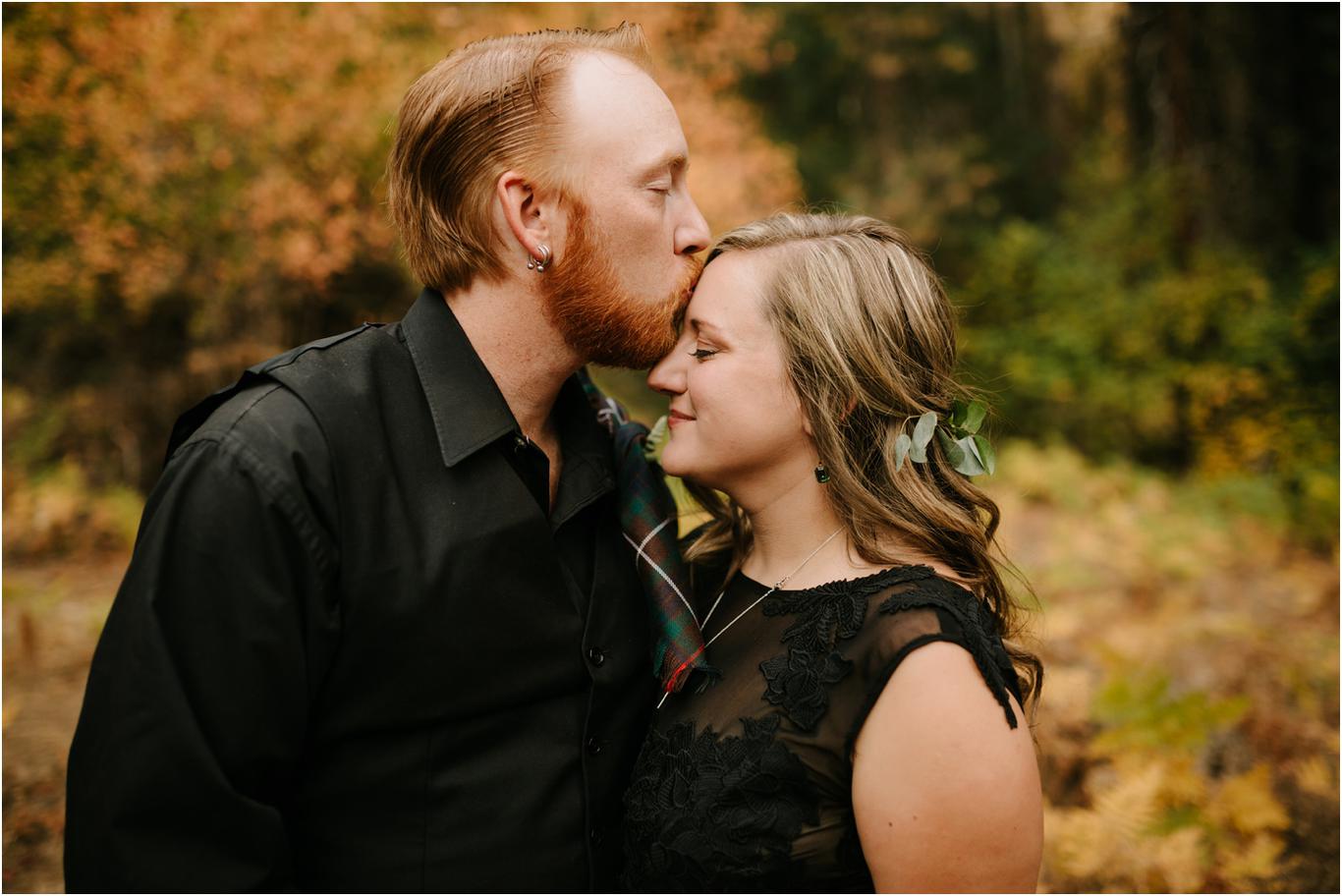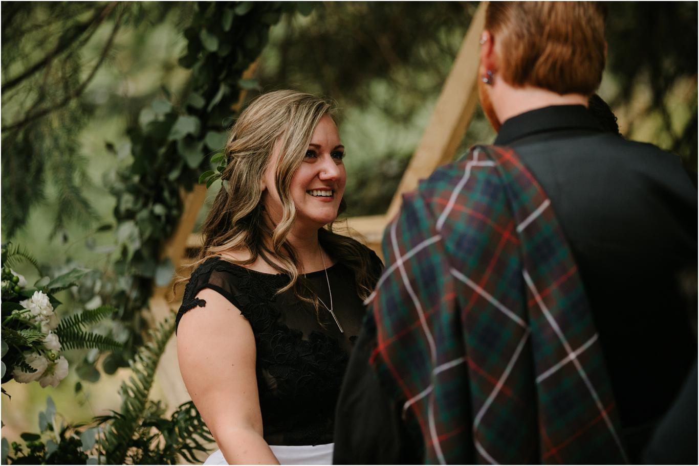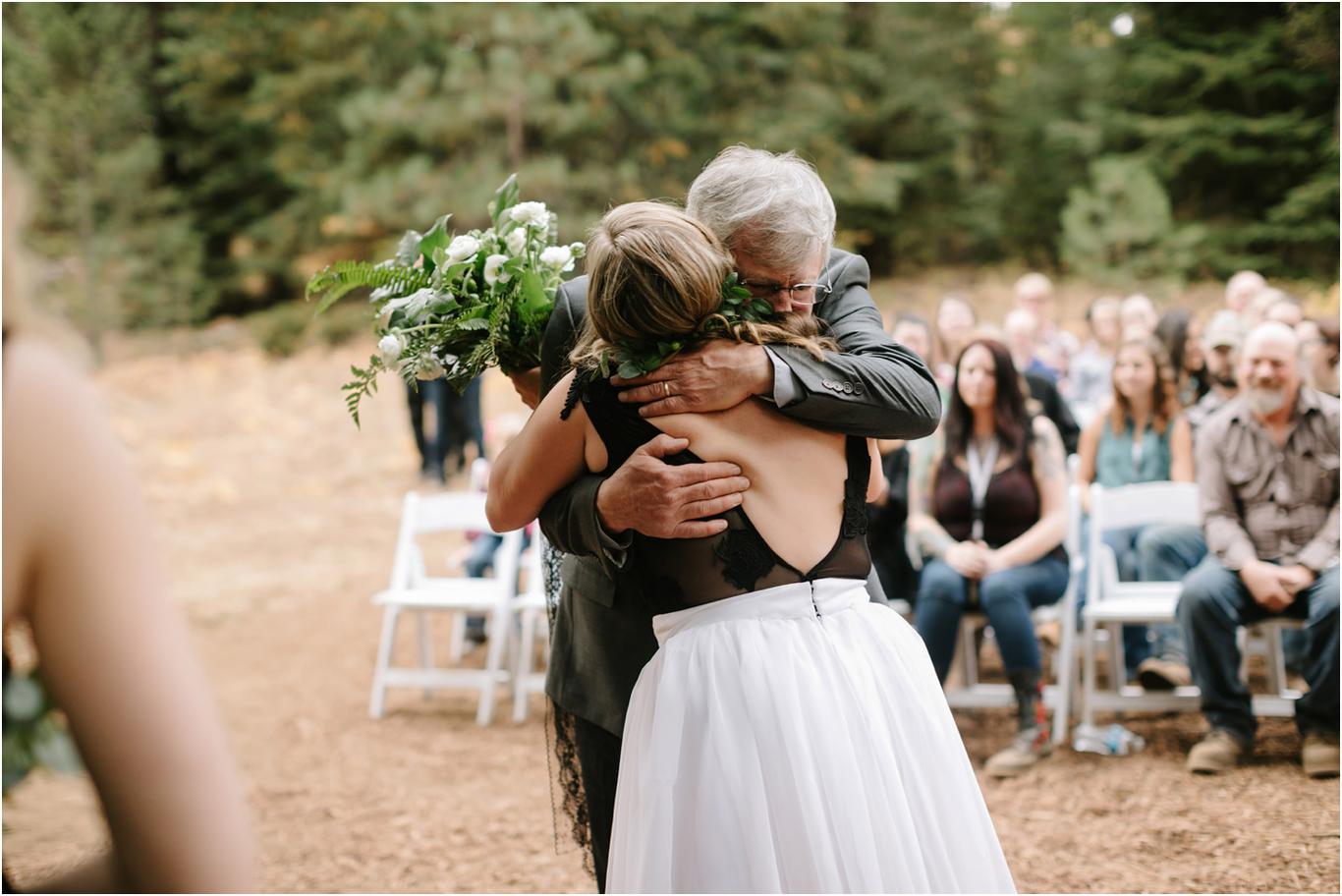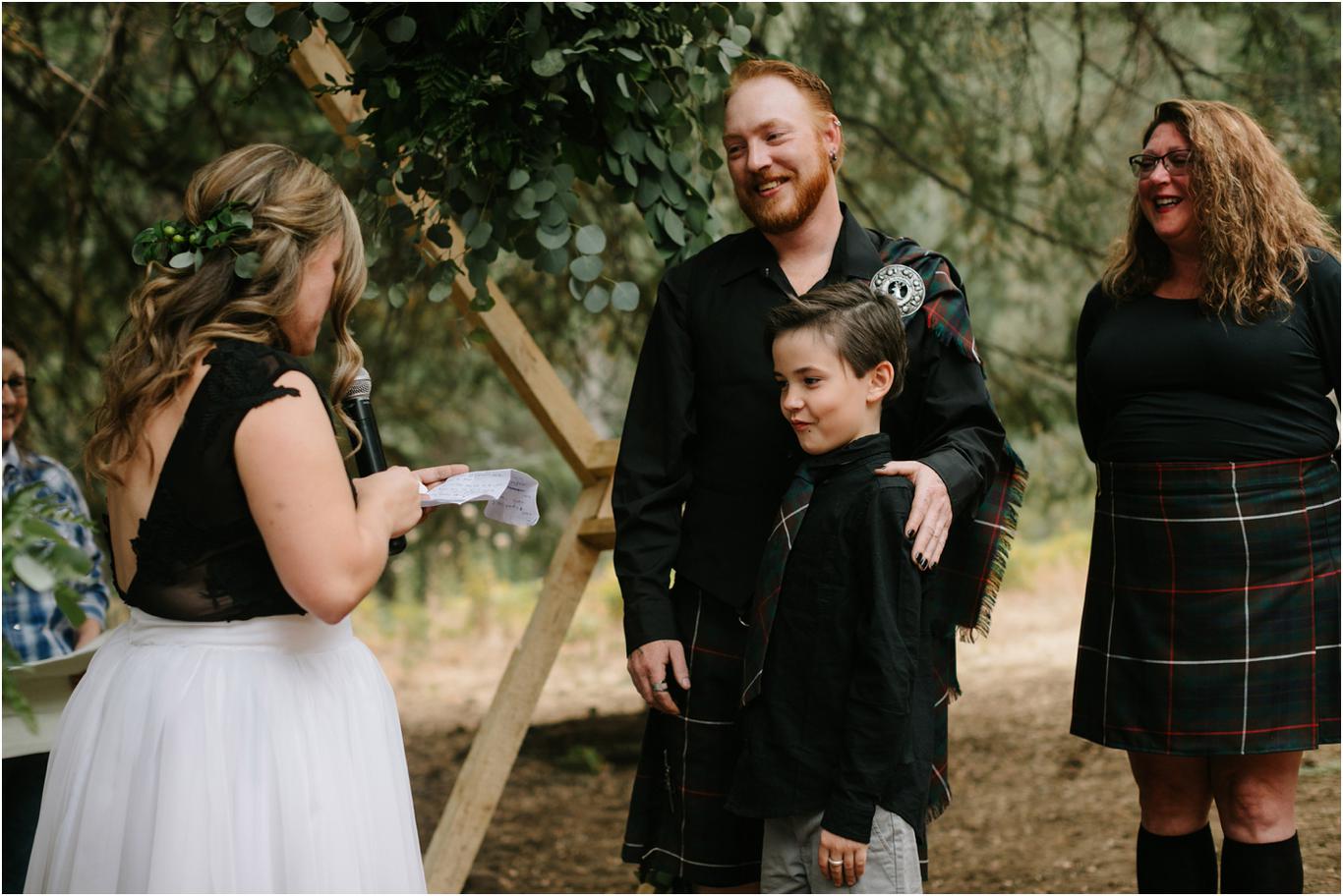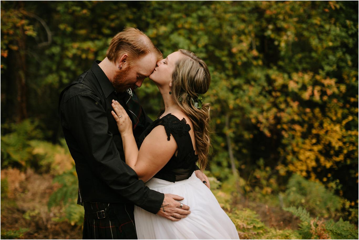 Josh’s family has deep ties to the land around Halfway. Like, seriously deep. His family actually came over on the Oregon Trail around 1868 (SO COOL!!!) and have lived there ever since. He told me that he has 6+ generations buried at the local cemetery. As we were driving around, he pointed out roads that his grandfather helped blast out with dynamite. The town already has a wild west feel to it, but learning the personal history made it even better. I could totally see how Mallory, a Portland girl like me, could fall hopelessly in love with the place and its inhabitants. Mallory and Josh planned their wedding in the town that started it all. They got ready at the lodge in town and a friends house, then held their wedding ceremony on Josh’s family property in the forest. He told me a story about a black bear that charged in the exact meadow they got married in, just a year or two earlier. The ceremony location is called “Pretty Tree,” nicknamed for the tall white fir tree that stands out in a small clearing. His great-grandfather always loved the tree and it was such a romantic spot to get married. Mallory is a graphic designer, and her design skills definitely made this Eastern Oregon wedding special. I was obsessed with the hexagonal ceremony arch, greenery with feathers, and the all the ceremony decor. PLUS she had a dip-dyed black wedding dress and bodysuit from Sweet Caroline Styles! How cool is that? Her outfit paired SO well with Josh’s traditional kilt that he wore to represent his family’s Fraser clan.