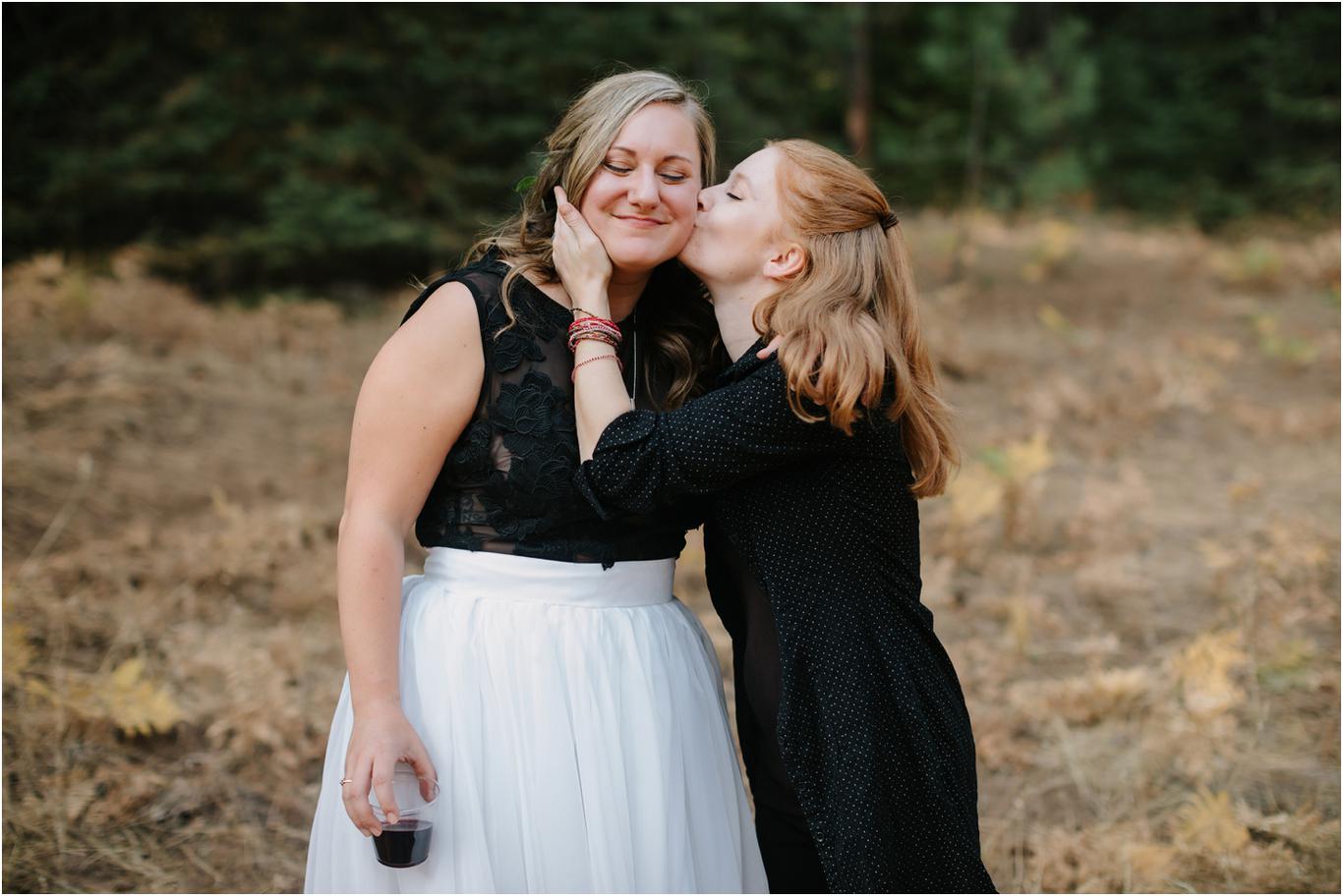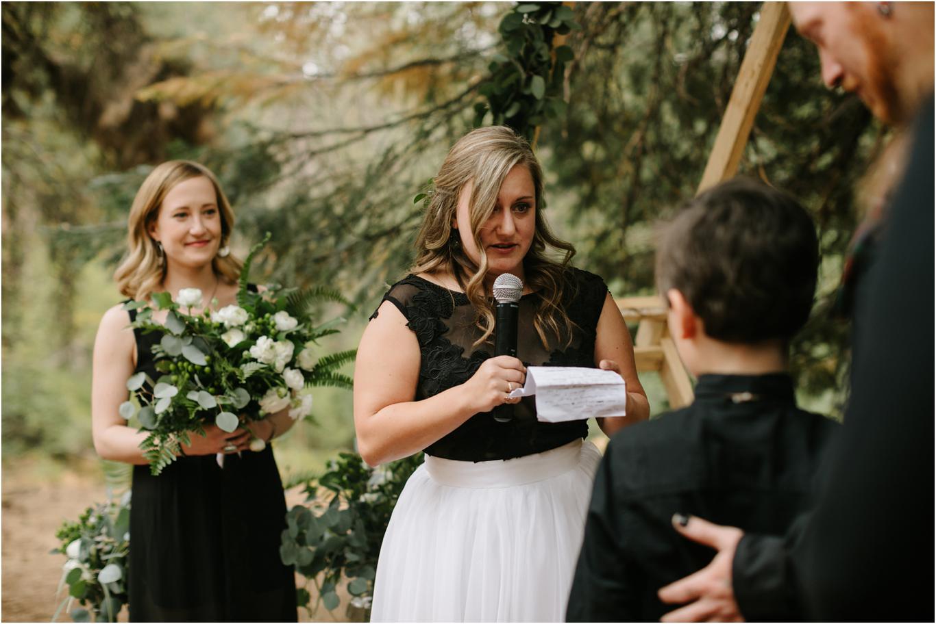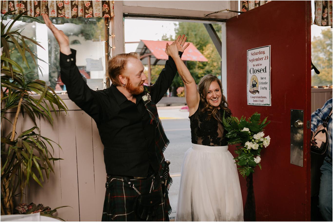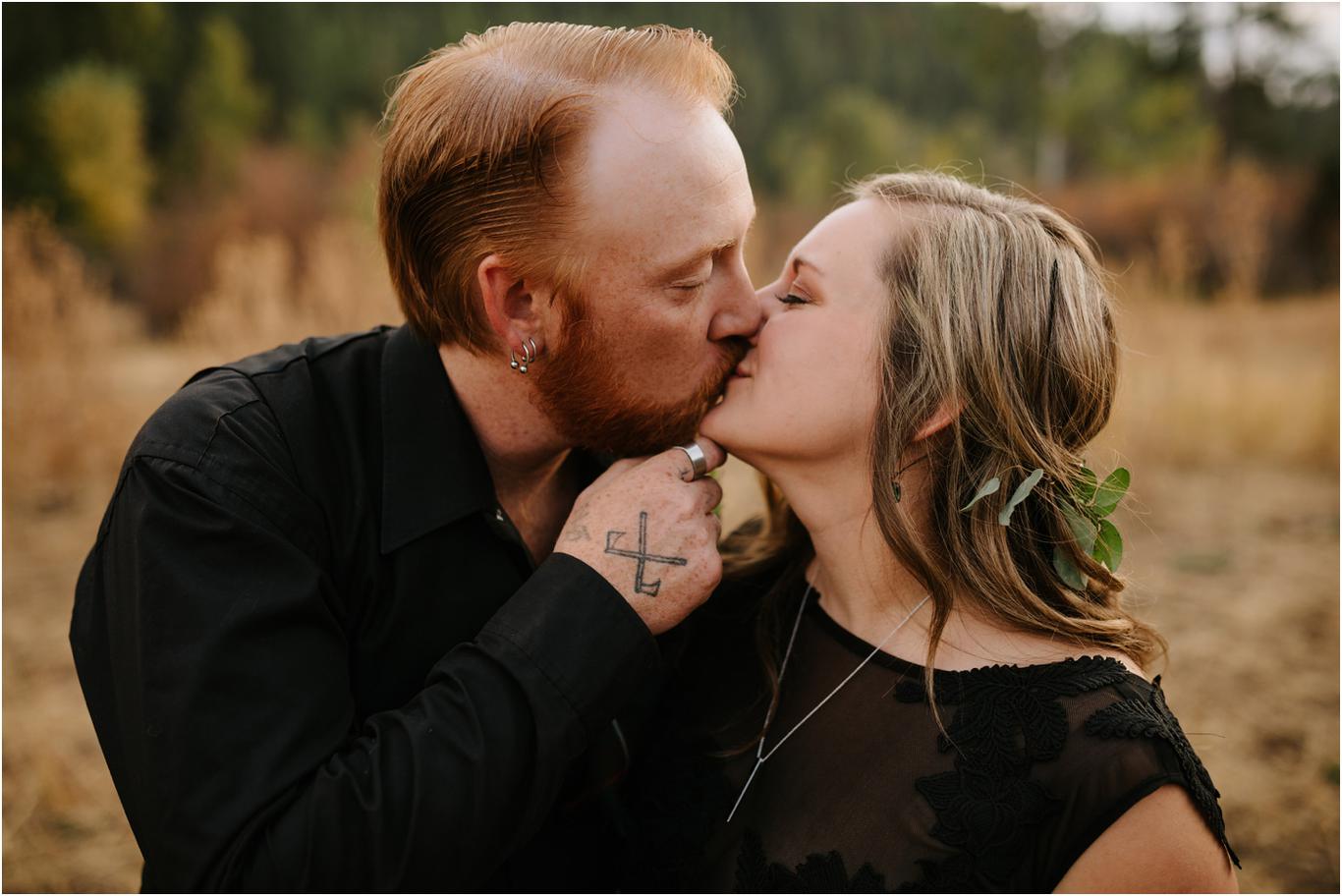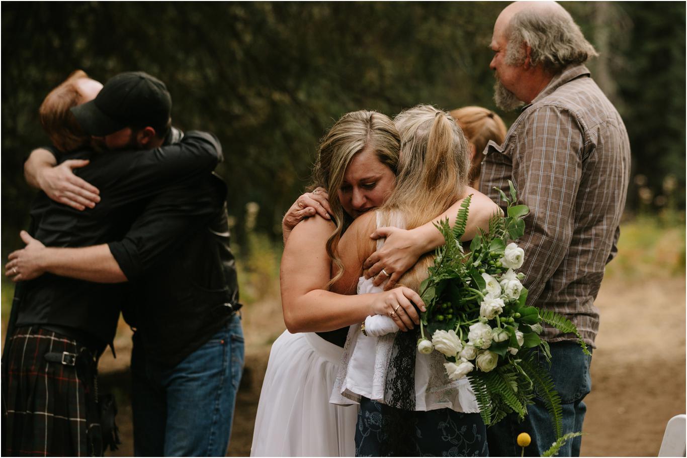 Josh’s family has deep ties to the land around Halfway. Like, seriously deep. His family actually came over on the Oregon Trail around 1868 (SO COOL!!!) and have lived there ever since. He told me that he has 6+ generations buried at the local cemetery. As we were driving around, he pointed out roads that his grandfather helped blast out with dynamite. The town already has a wild west feel to it, but learning the personal history made it even better. I could totally see how Mallory, a Portland girl like me, could fall hopelessly in love with the place and its inhabitants. Mallory and Josh planned their wedding in the town that started it all. They got ready at the lodge in town and a friends house, then held their wedding ceremony on Josh’s family property in the forest. He told me a story about a black bear that charged in the exact meadow they got married in, just a year or two earlier. The ceremony location is called “Pretty Tree,” nicknamed for the tall white fir tree that stands out in a small clearing. His great-grandfather always loved the tree and it was such a romantic spot to get married. Mallory is a graphic designer, and her design skills definitely made this Eastern Oregon wedding special. I was obsessed with the hexagonal ceremony arch, greenery with feathers, and the all the ceremony decor. PLUS she had a dip-dyed black wedding dress and bodysuit from Sweet Caroline Styles! How cool is that? Her outfit paired SO well with Josh’s traditional kilt that he wore to represent his family’s Fraser clan.