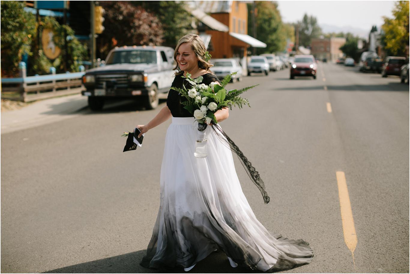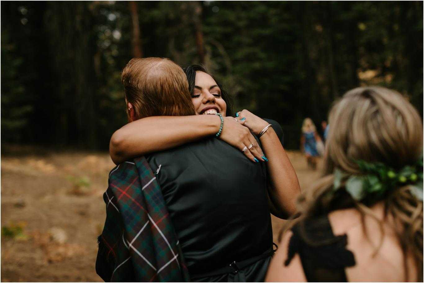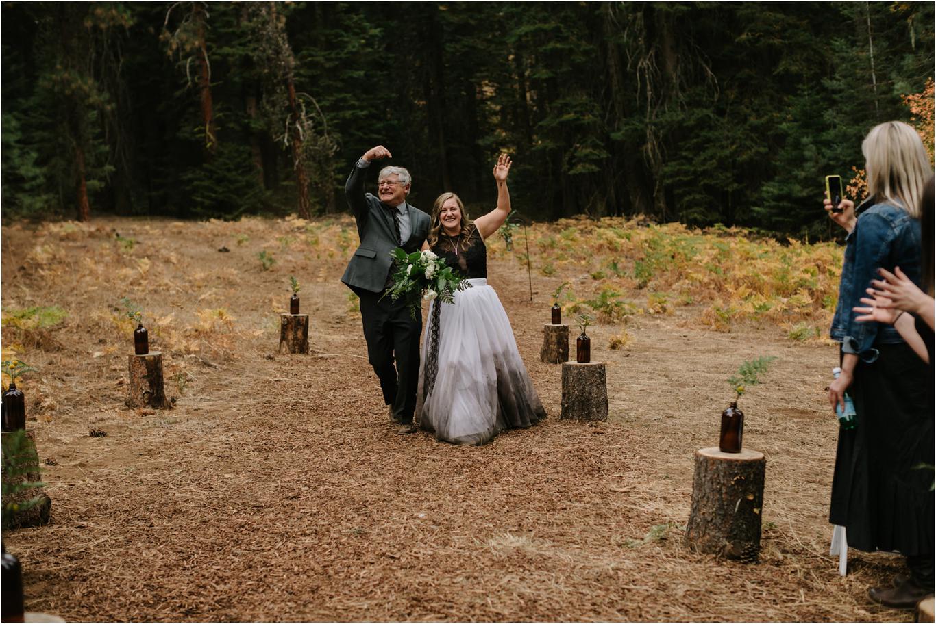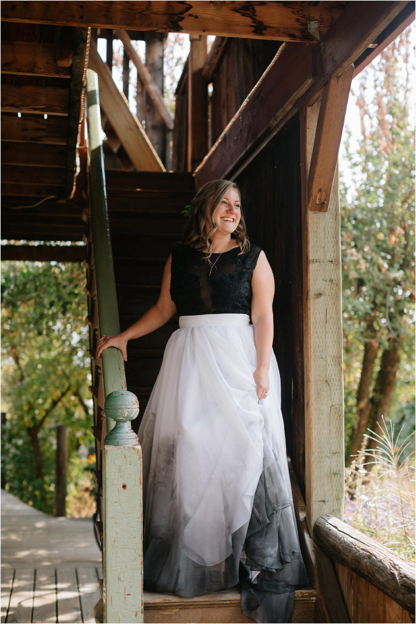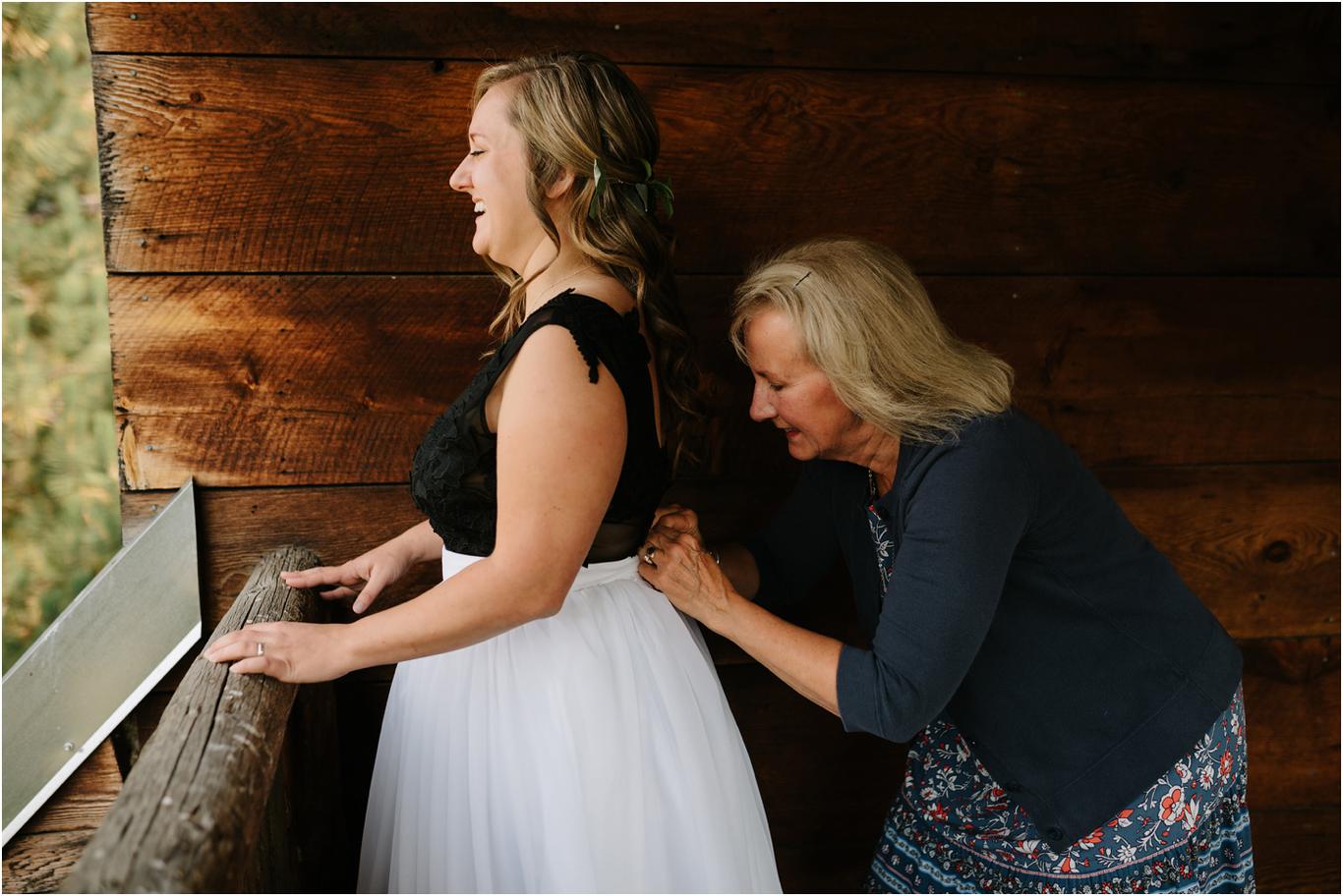 Josh’s family has deep ties to the land around Halfway. Like, seriously deep. His family actually came over on the Oregon Trail around 1868 (SO COOL!!!) and have lived there ever since. He told me that he has 6+ generations buried at the local cemetery. As we were driving around, he pointed out roads that his grandfather helped blast out with dynamite. The town already has a wild west feel to it, but learning the personal history made it even better. I could totally see how Mallory, a Portland girl like me, could fall hopelessly in love with the place and its inhabitants. Mallory and Josh planned their wedding in the town that started it all. They got ready at the lodge in town and a friends house, then held their wedding ceremony on Josh’s family property in the forest. He told me a story about a black bear that charged in the exact meadow they got married in, just a year or two earlier. The ceremony location is called “Pretty Tree,” nicknamed for the tall white fir tree that stands out in a small clearing. His great-grandfather always loved the tree and it was such a romantic spot to get married. Mallory is a graphic designer, and her design skills definitely made this Eastern Oregon wedding special. I was obsessed with the hexagonal ceremony arch, greenery with feathers, and the all the ceremony decor. PLUS she had a dip-dyed black wedding dress and bodysuit from Sweet Caroline Styles! How cool is that? Her outfit paired SO well with Josh’s traditional kilt that he wore to represent his family’s Fraser clan.