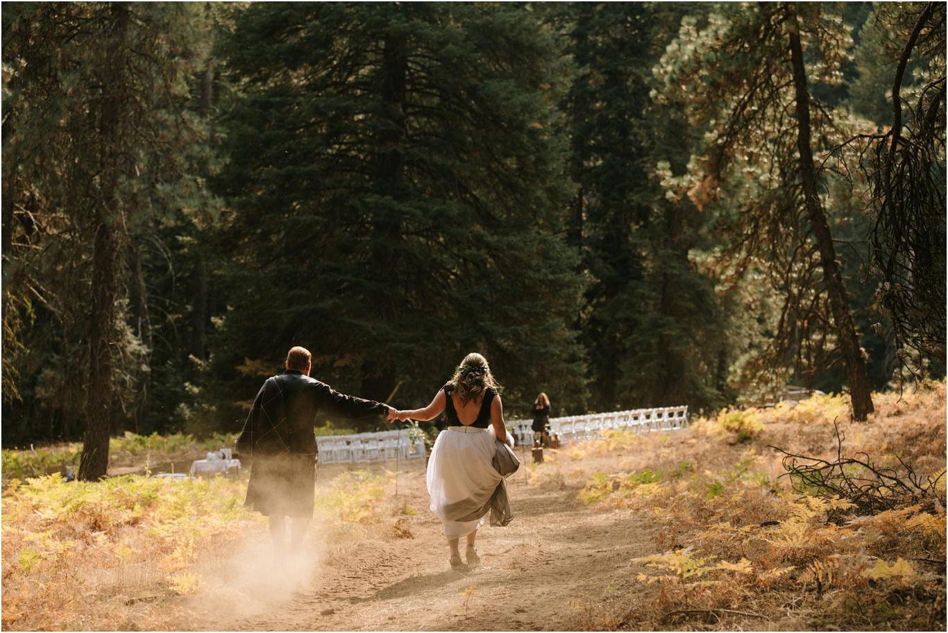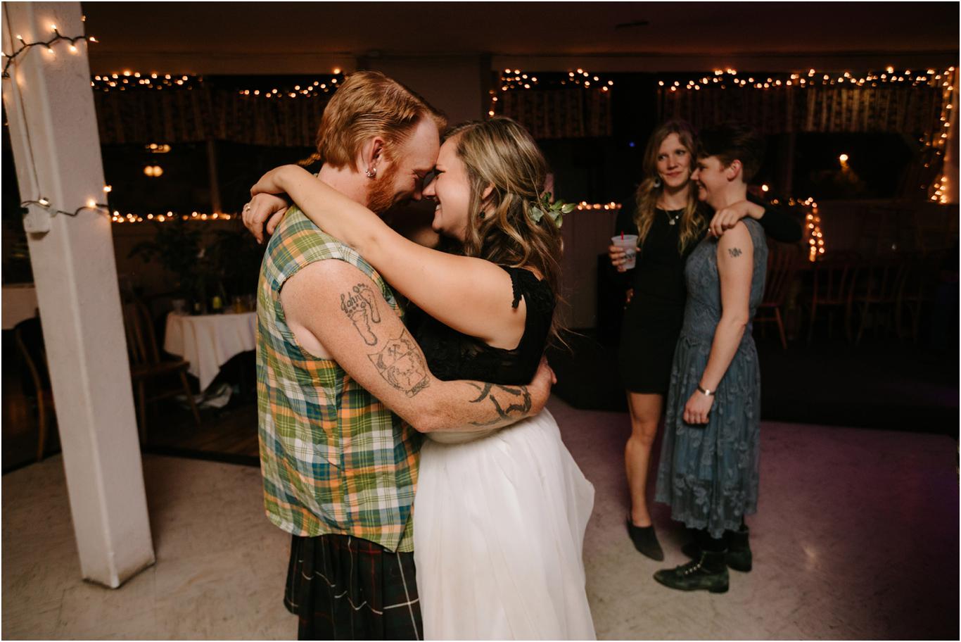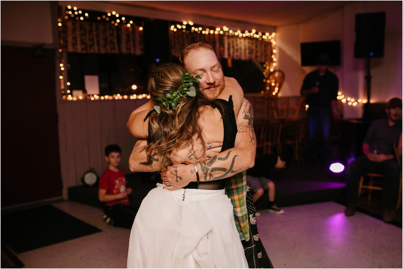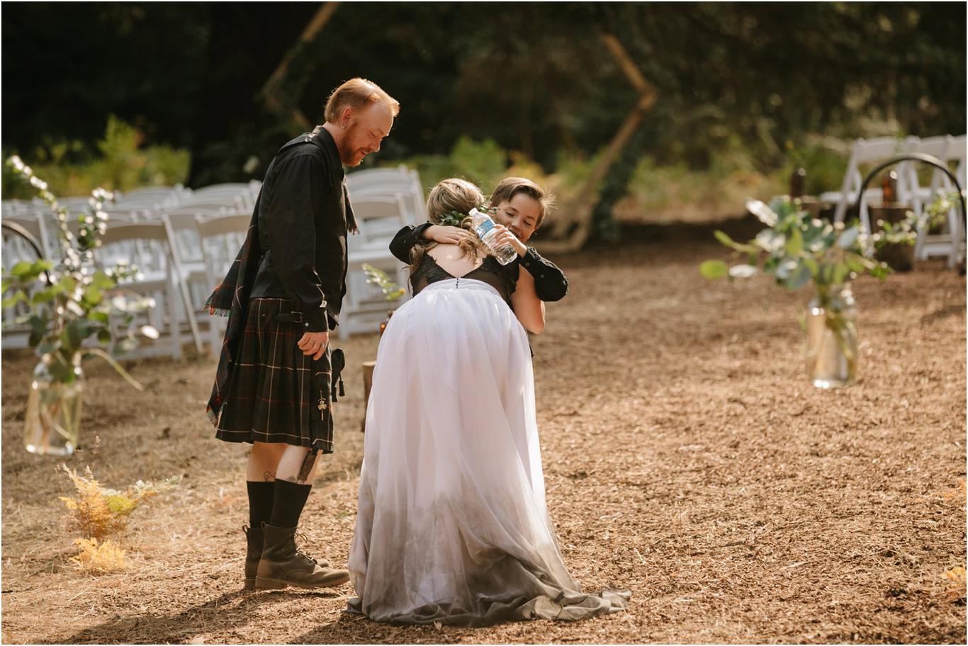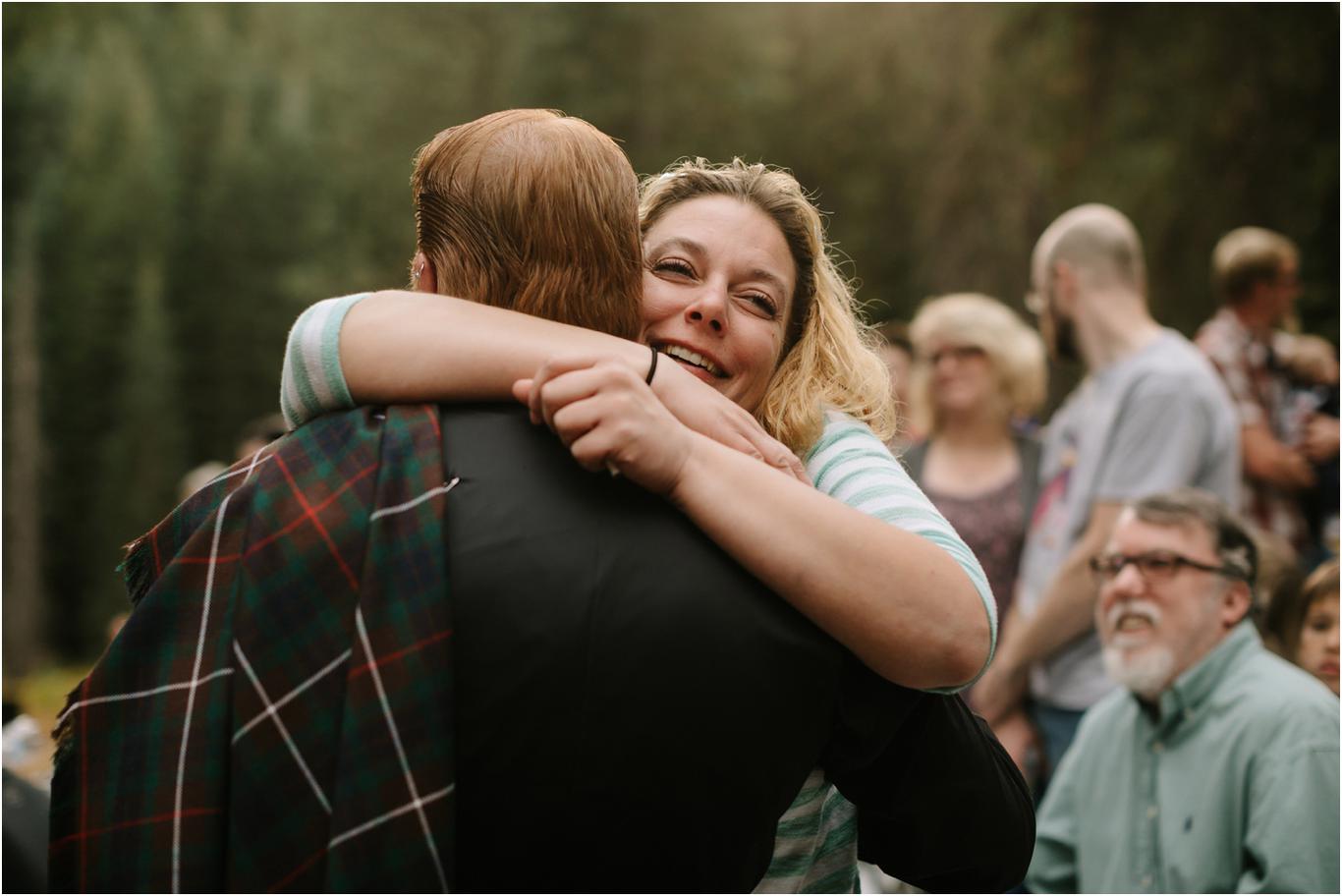 Josh’s family has deep ties to the land around Halfway. Like, seriously deep. His family actually came over on the Oregon Trail around 1868 (SO COOL!!!) and have lived there ever since. He told me that he has 6+ generations buried at the local cemetery. As we were driving around, he pointed out roads that his grandfather helped blast out with dynamite. The town already has a wild west feel to it, but learning the personal history made it even better. I could totally see how Mallory, a Portland girl like me, could fall hopelessly in love with the place and its inhabitants. Mallory and Josh planned their wedding in the town that started it all. They got ready at the lodge in town and a friends house, then held their wedding ceremony on Josh’s family property in the forest. He told me a story about a black bear that charged in the exact meadow they got married in, just a year or two earlier. The ceremony location is called “Pretty Tree,” nicknamed for the tall white fir tree that stands out in a small clearing. His great-grandfather always loved the tree and it was such a romantic spot to get married. Mallory is a graphic designer, and her design skills definitely made this Eastern Oregon wedding special. I was obsessed with the hexagonal ceremony arch, greenery with feathers, and the all the ceremony decor. PLUS she had a dip-dyed black wedding dress and bodysuit from Sweet Caroline Styles! How cool is that? Her outfit paired SO well with Josh’s traditional kilt that he wore to represent his family’s Fraser clan.