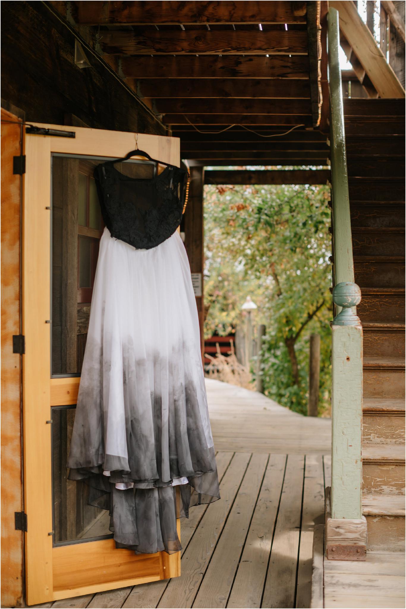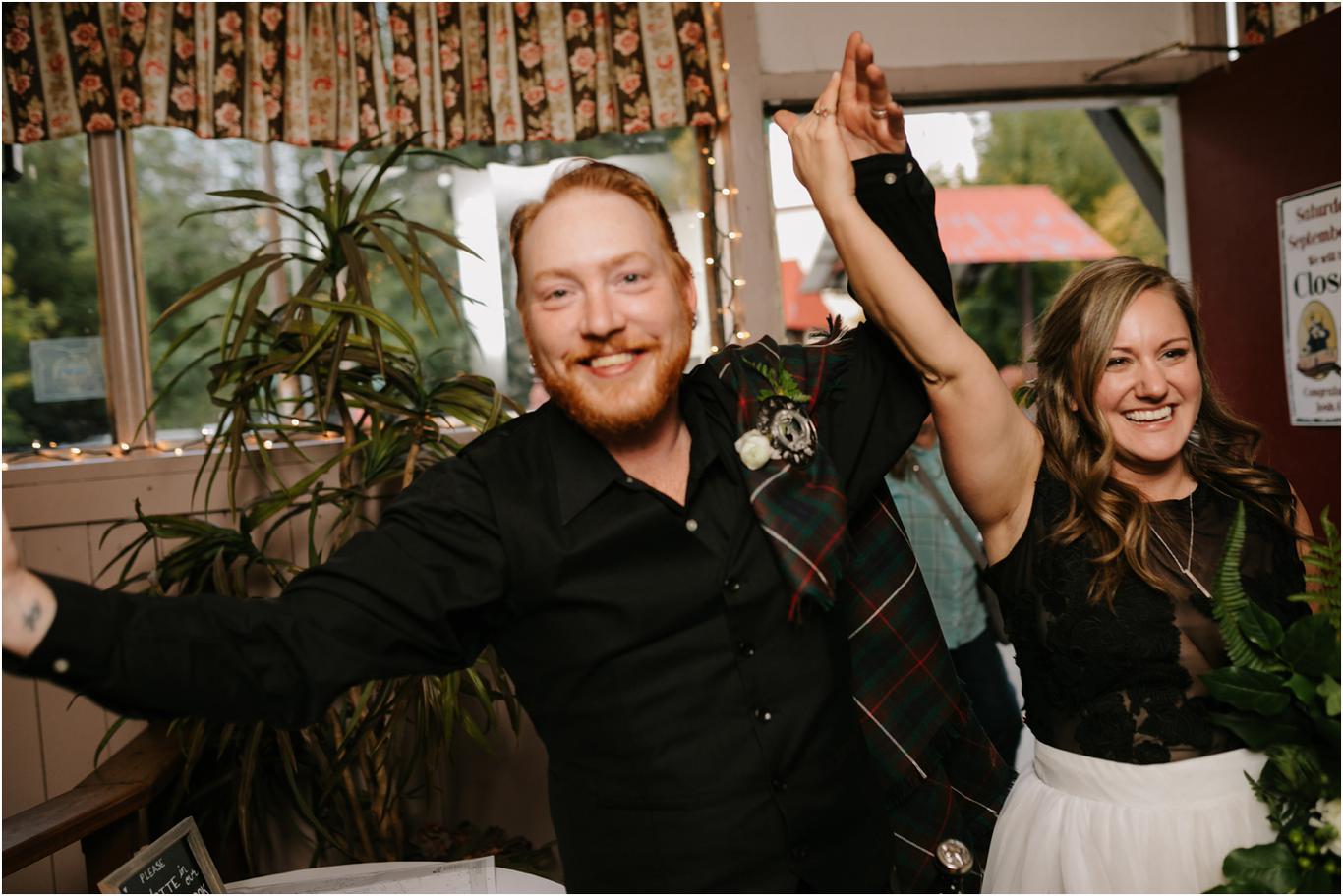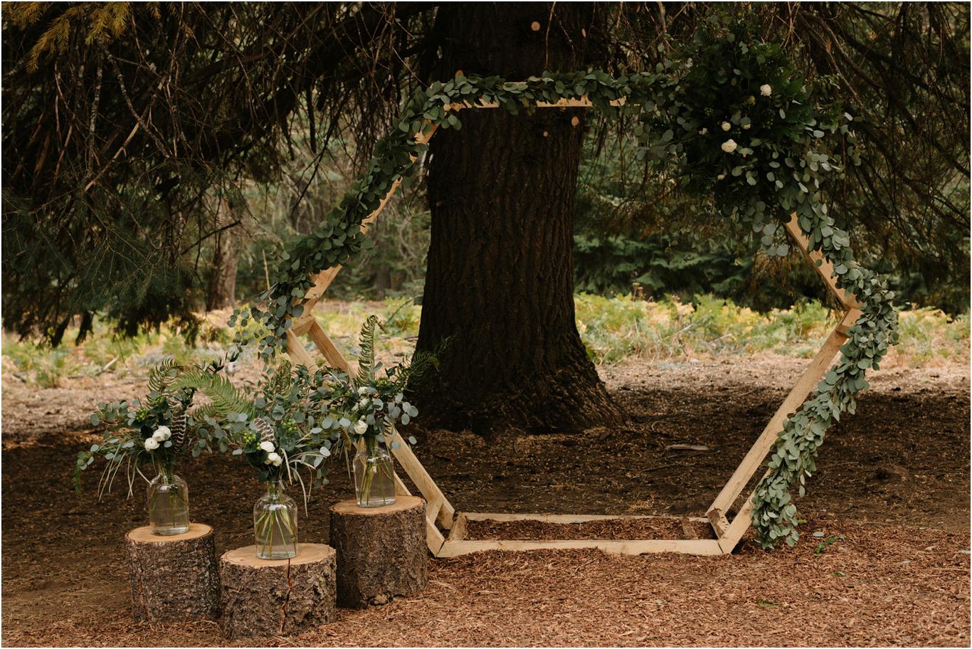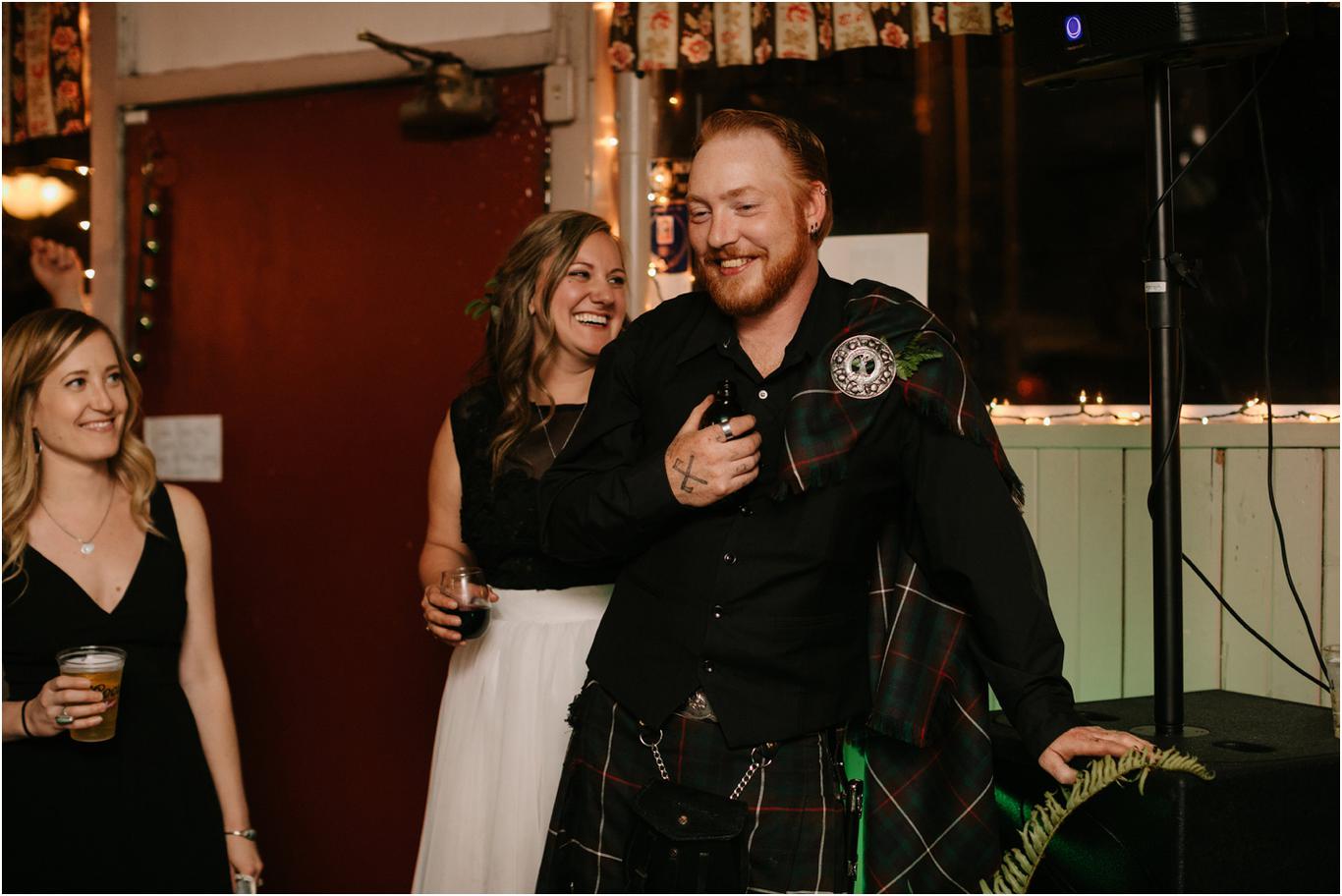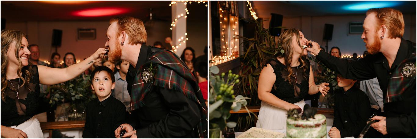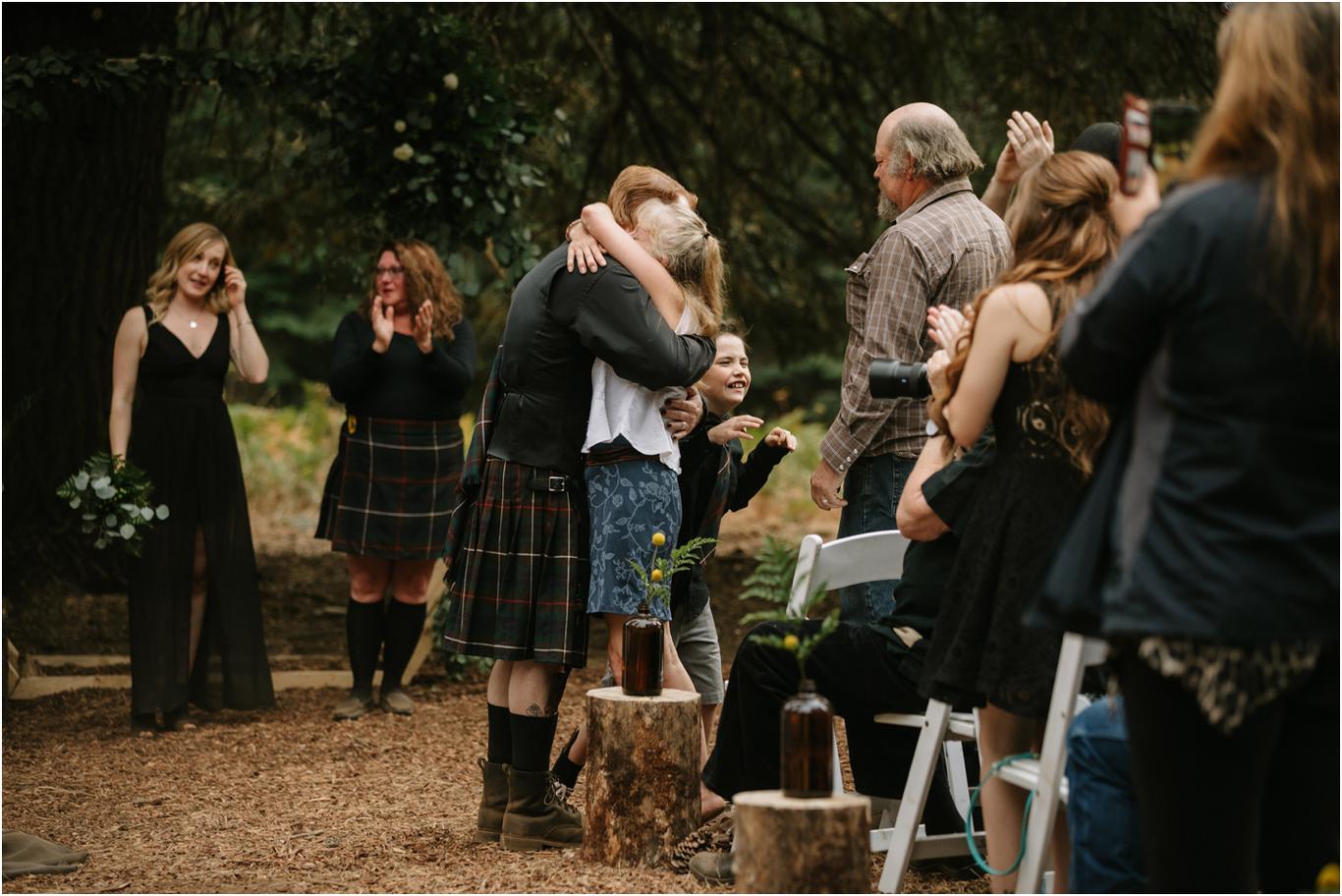 Josh’s family has deep ties to the land around Halfway. Like, seriously deep. His family actually came over on the Oregon Trail around 1868 (SO COOL!!!) and have lived there ever since. He told me that he has 6+ generations buried at the local cemetery. As we were driving around, he pointed out roads that his grandfather helped blast out with dynamite. The town already has a wild west feel to it, but learning the personal history made it even better. I could totally see how Mallory, a Portland girl like me, could fall hopelessly in love with the place and its inhabitants. Mallory and Josh planned their wedding in the town that started it all. They got ready at the lodge in town and a friends house, then held their wedding ceremony on Josh’s family property in the forest. He told me a story about a black bear that charged in the exact meadow they got married in, just a year or two earlier. The ceremony location is called “Pretty Tree,” nicknamed for the tall white fir tree that stands out in a small clearing. His great-grandfather always loved the tree and it was such a romantic spot to get married. Mallory is a graphic designer, and her design skills definitely made this Eastern Oregon wedding special. I was obsessed with the hexagonal ceremony arch, greenery with feathers, and the all the ceremony decor. PLUS she had a dip-dyed black wedding dress and bodysuit from Sweet Caroline Styles! How cool is that? Her outfit paired SO well with Josh’s traditional kilt that he wore to represent his family’s Fraser clan.