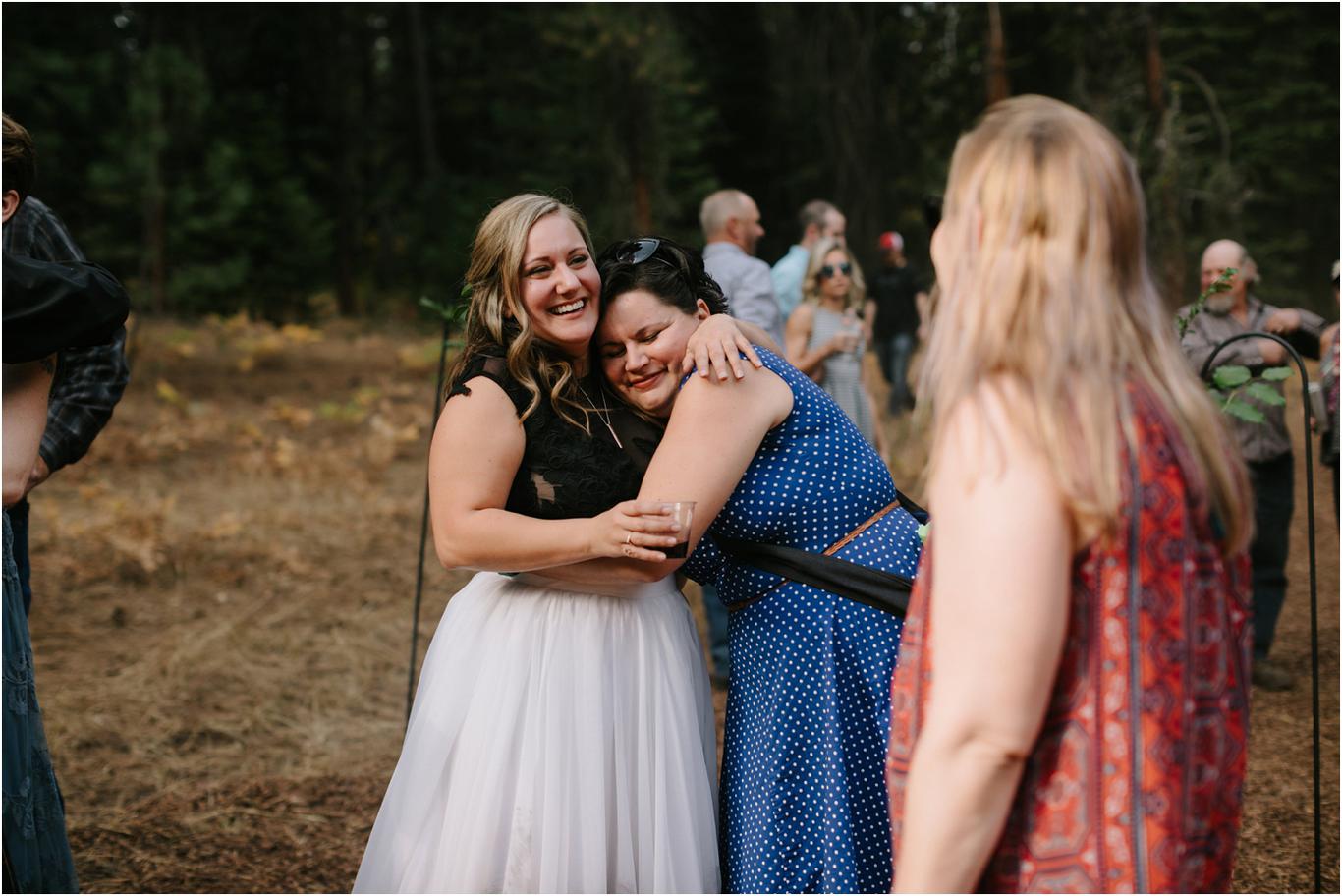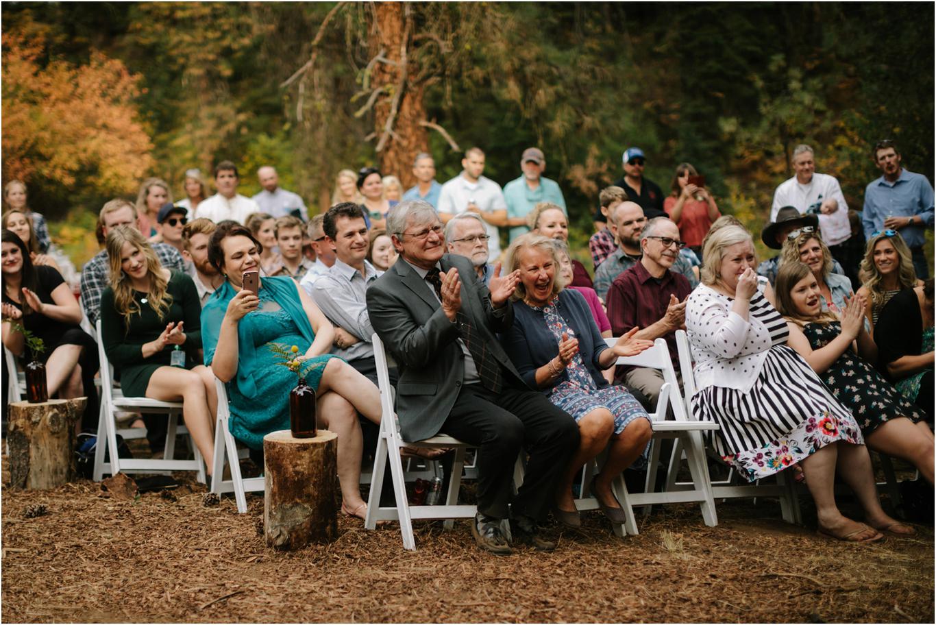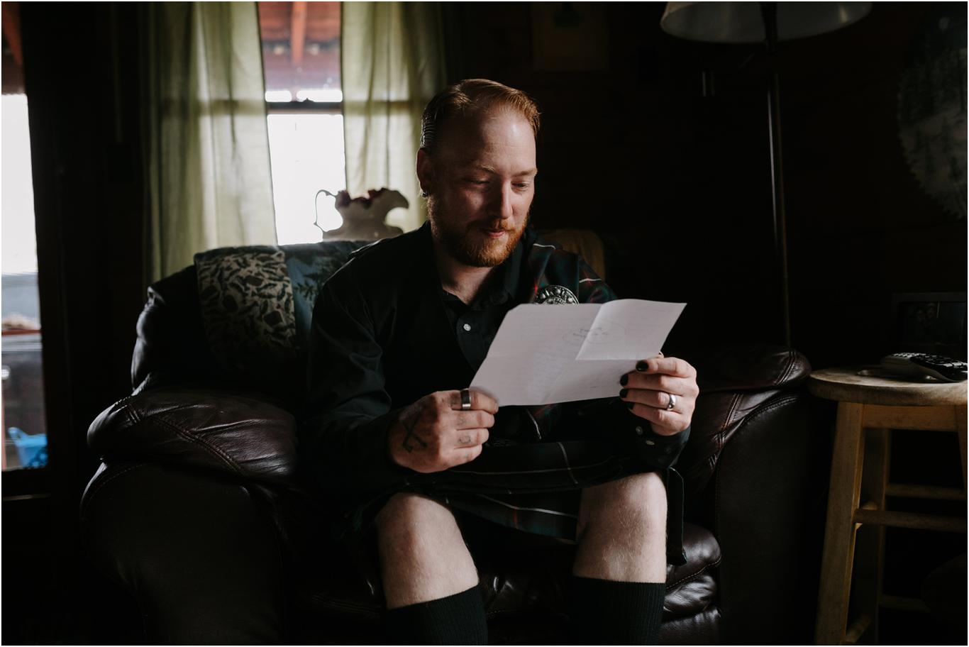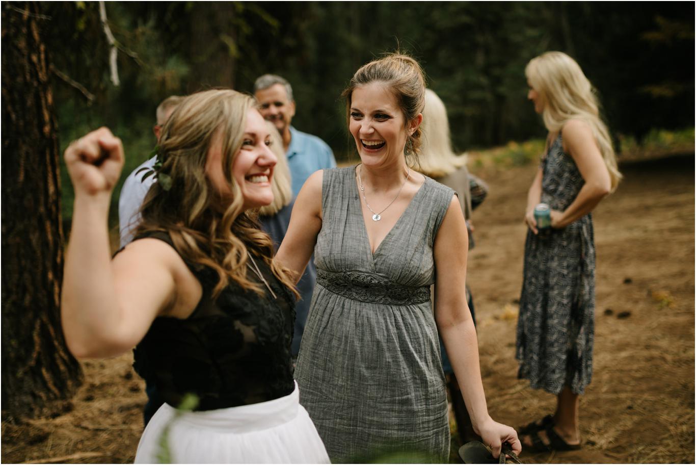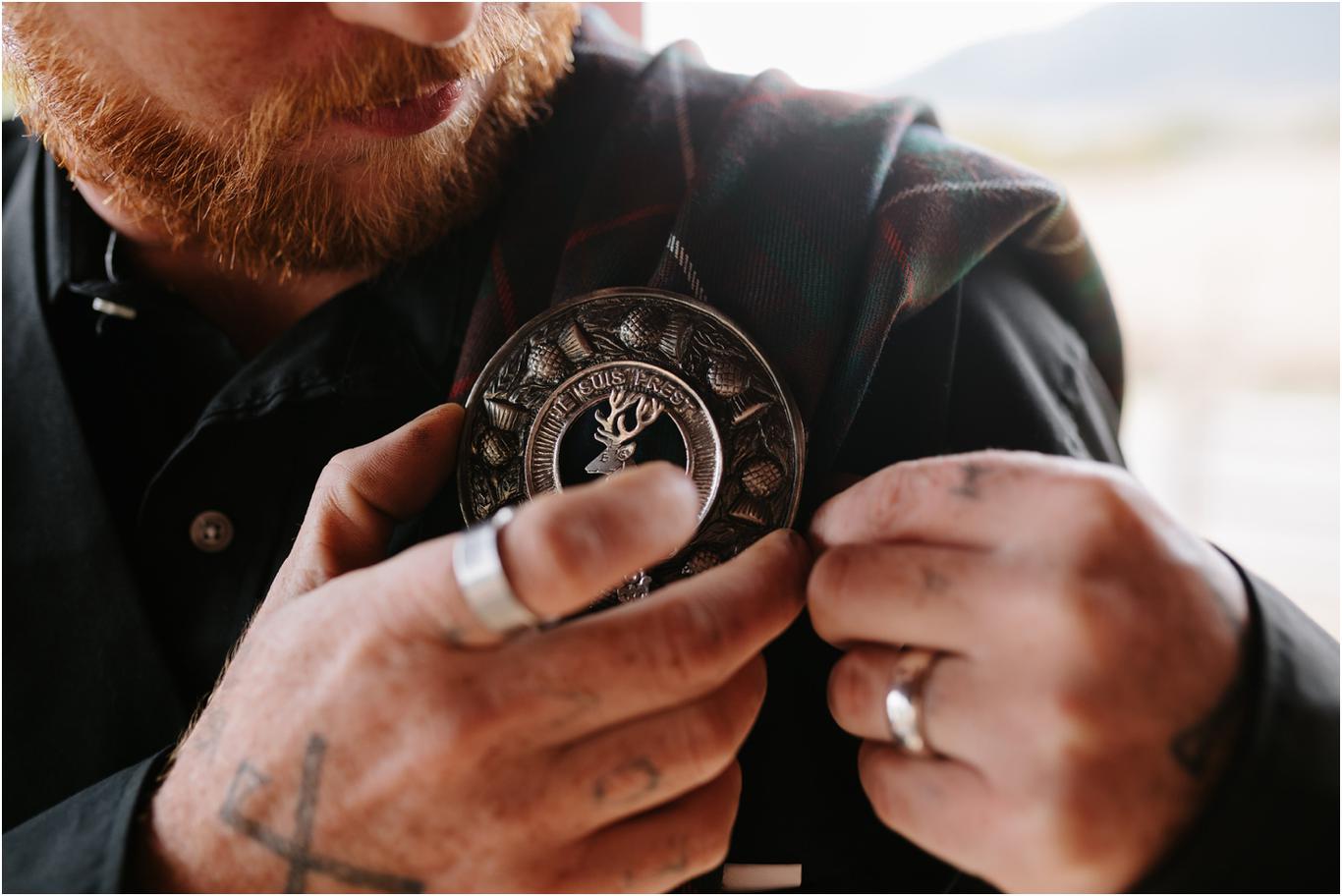 Josh’s family has deep ties to the land around Halfway. Like, seriously deep. His family actually came over on the Oregon Trail around 1868 (SO COOL!!!) and have lived there ever since. He told me that he has 6+ generations buried at the local cemetery. As we were driving around, he pointed out roads that his grandfather helped blast out with dynamite. The town already has a wild west feel to it, but learning the personal history made it even better. I could totally see how Mallory, a Portland girl like me, could fall hopelessly in love with the place and its inhabitants. Mallory and Josh planned their wedding in the town that started it all. They got ready at the lodge in town and a friends house, then held their wedding ceremony on Josh’s family property in the forest. He told me a story about a black bear that charged in the exact meadow they got married in, just a year or two earlier. The ceremony location is called “Pretty Tree,” nicknamed for the tall white fir tree that stands out in a small clearing. His great-grandfather always loved the tree and it was such a romantic spot to get married. Mallory is a graphic designer, and her design skills definitely made this Eastern Oregon wedding special. I was obsessed with the hexagonal ceremony arch, greenery with feathers, and the all the ceremony decor. PLUS she had a dip-dyed black wedding dress and bodysuit from Sweet Caroline Styles! How cool is that? Her outfit paired SO well with Josh’s traditional kilt that he wore to represent his family’s Fraser clan.
