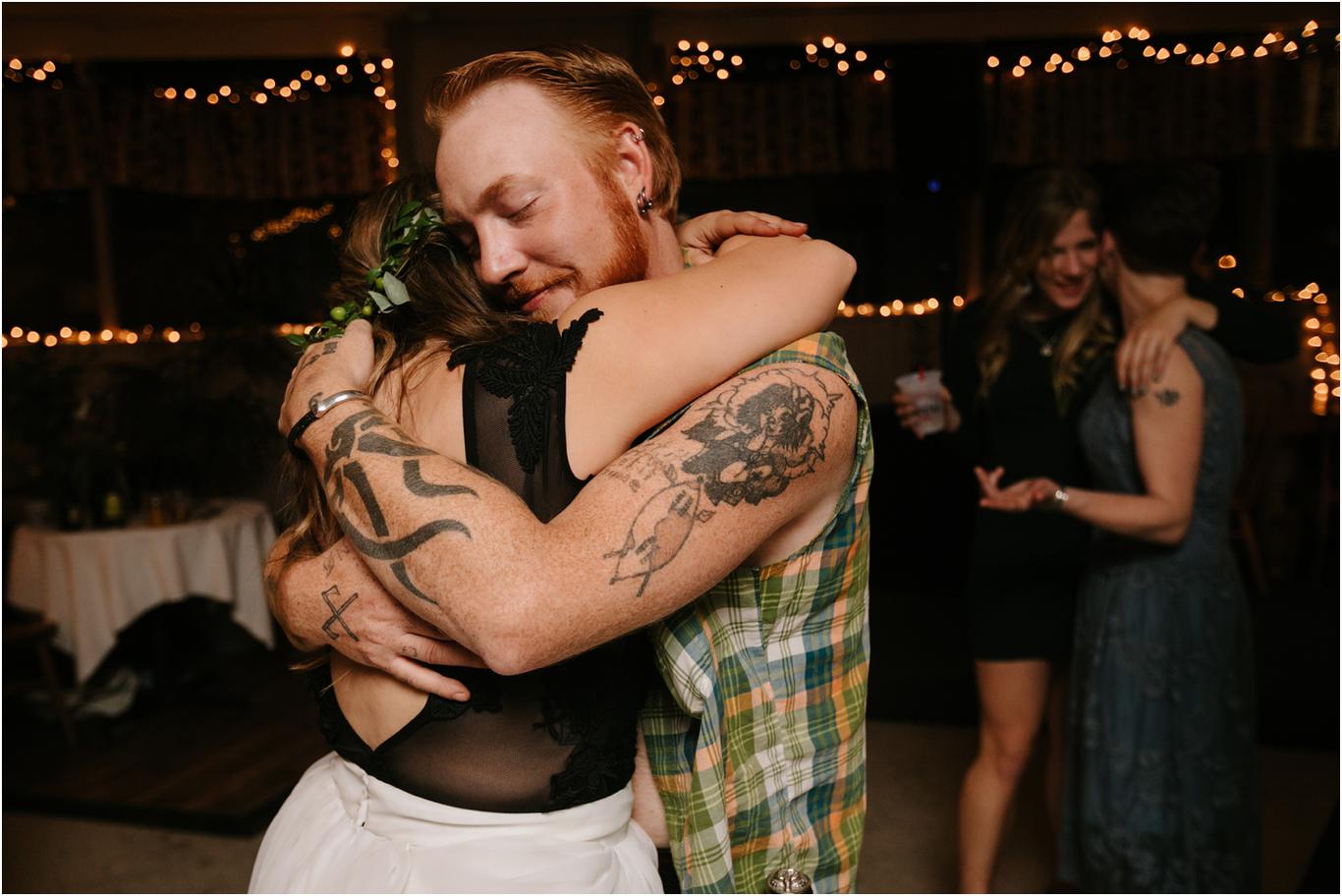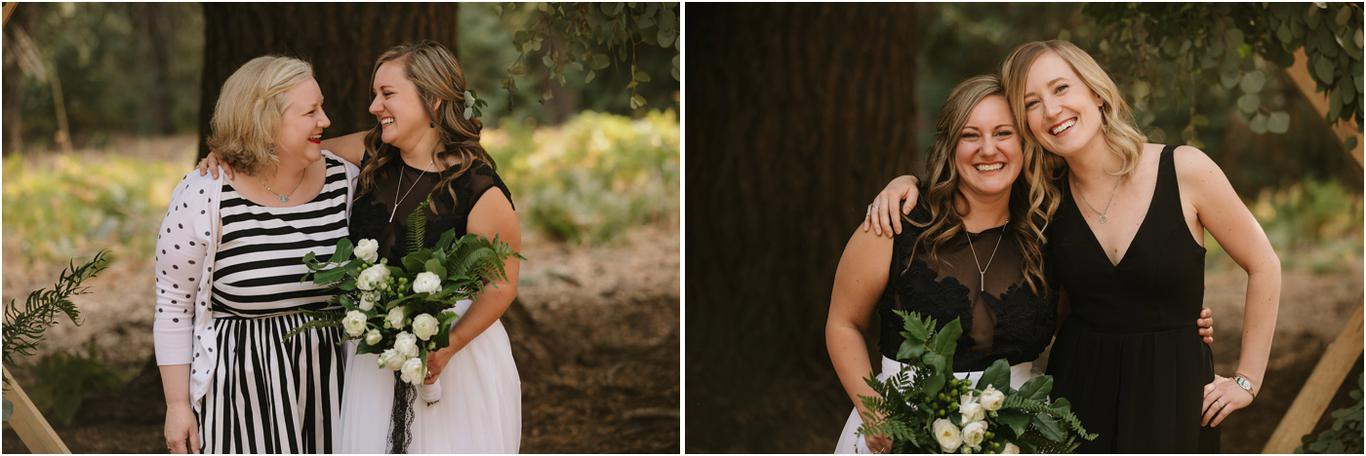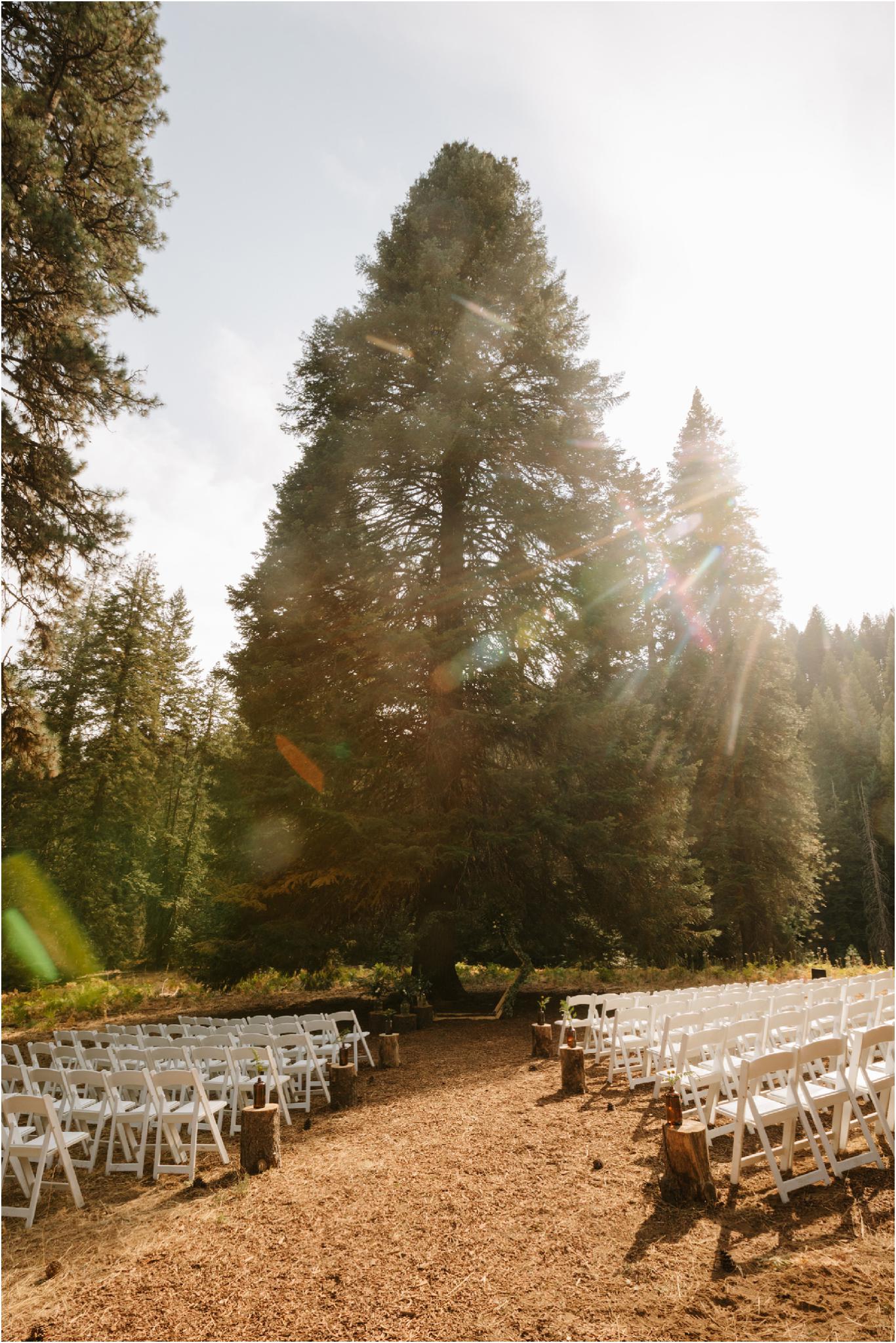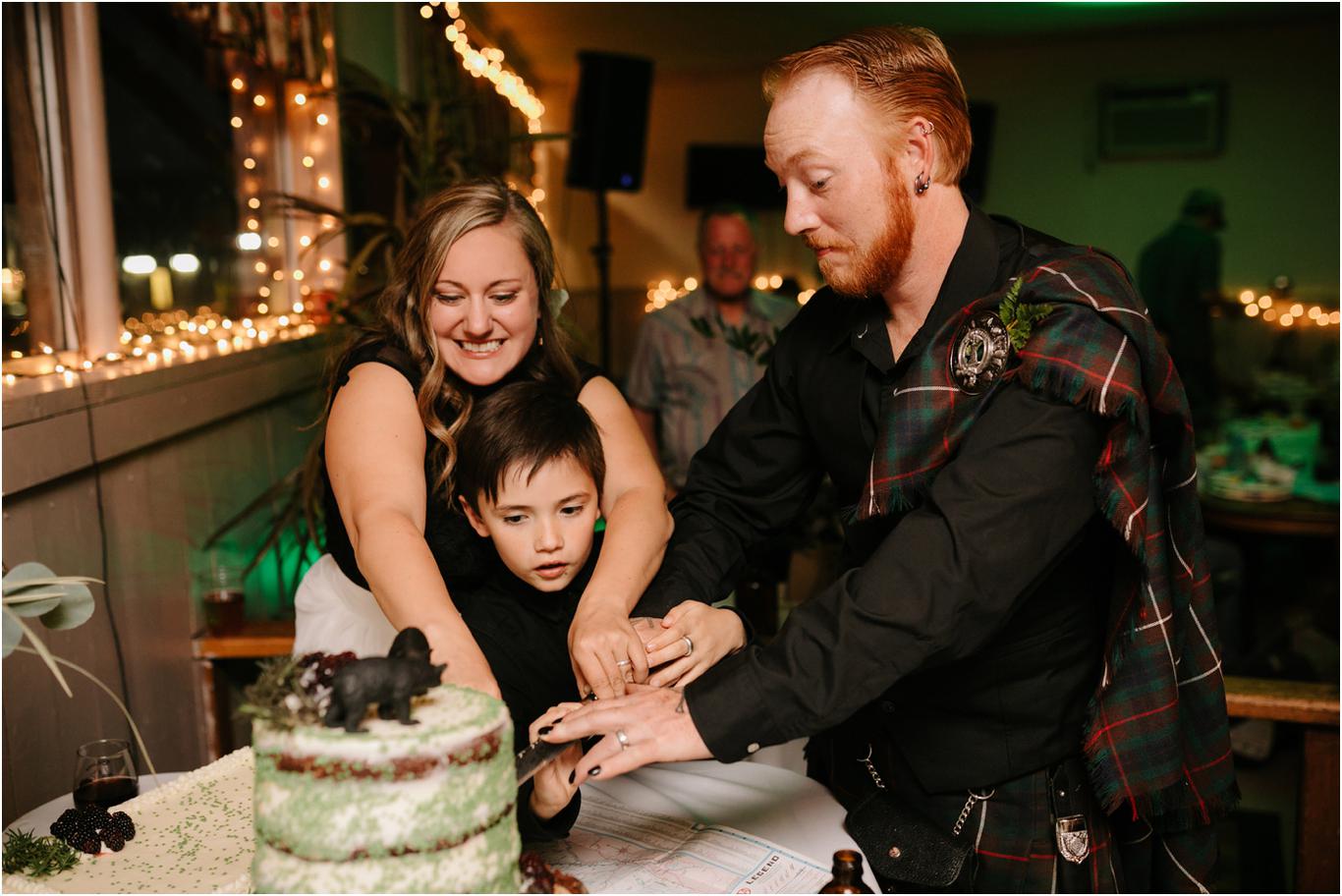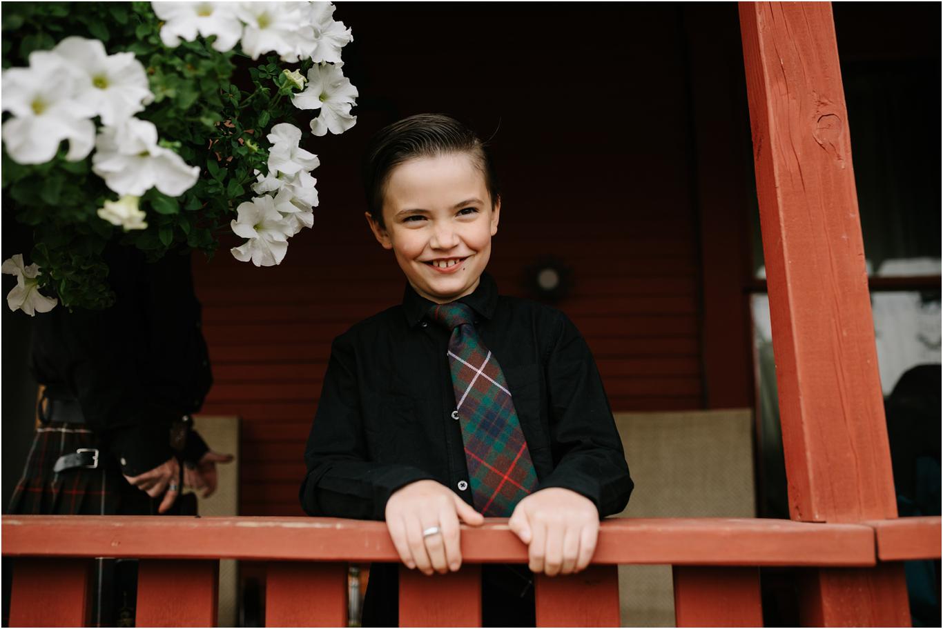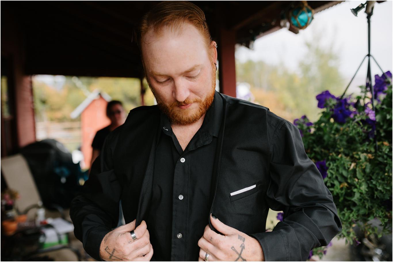 Josh’s family has deep ties to the land around Halfway. Like, seriously deep. His family actually came over on the Oregon Trail around 1868 (SO COOL!!!) and have lived there ever since. He told me that he has 6+ generations buried at the local cemetery. As we were driving around, he pointed out roads that his grandfather helped blast out with dynamite. The town already has a wild west feel to it, but learning the personal history made it even better. I could totally see how Mallory, a Portland girl like me, could fall hopelessly in love with the place and its inhabitants. Mallory and Josh planned their wedding in the town that started it all. They got ready at the lodge in town and a friends house, then held their wedding ceremony on Josh’s family property in the forest. He told me a story about a black bear that charged in the exact meadow they got married in, just a year or two earlier. The ceremony location is called “Pretty Tree,” nicknamed for the tall white fir tree that stands out in a small clearing. His great-grandfather always loved the tree and it was such a romantic spot to get married. Mallory is a graphic designer, and her design skills definitely made this Eastern Oregon wedding special. I was obsessed with the hexagonal ceremony arch, greenery with feathers, and the all the ceremony decor. PLUS she had a dip-dyed black wedding dress and bodysuit from Sweet Caroline Styles! How cool is that? Her outfit paired SO well with Josh’s traditional kilt that he wore to represent his family’s Fraser clan.
