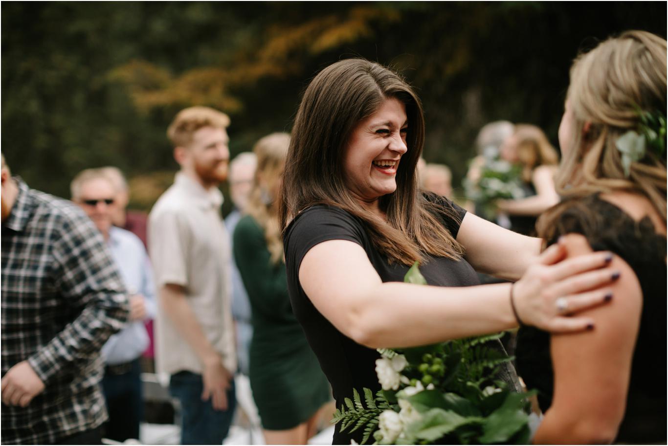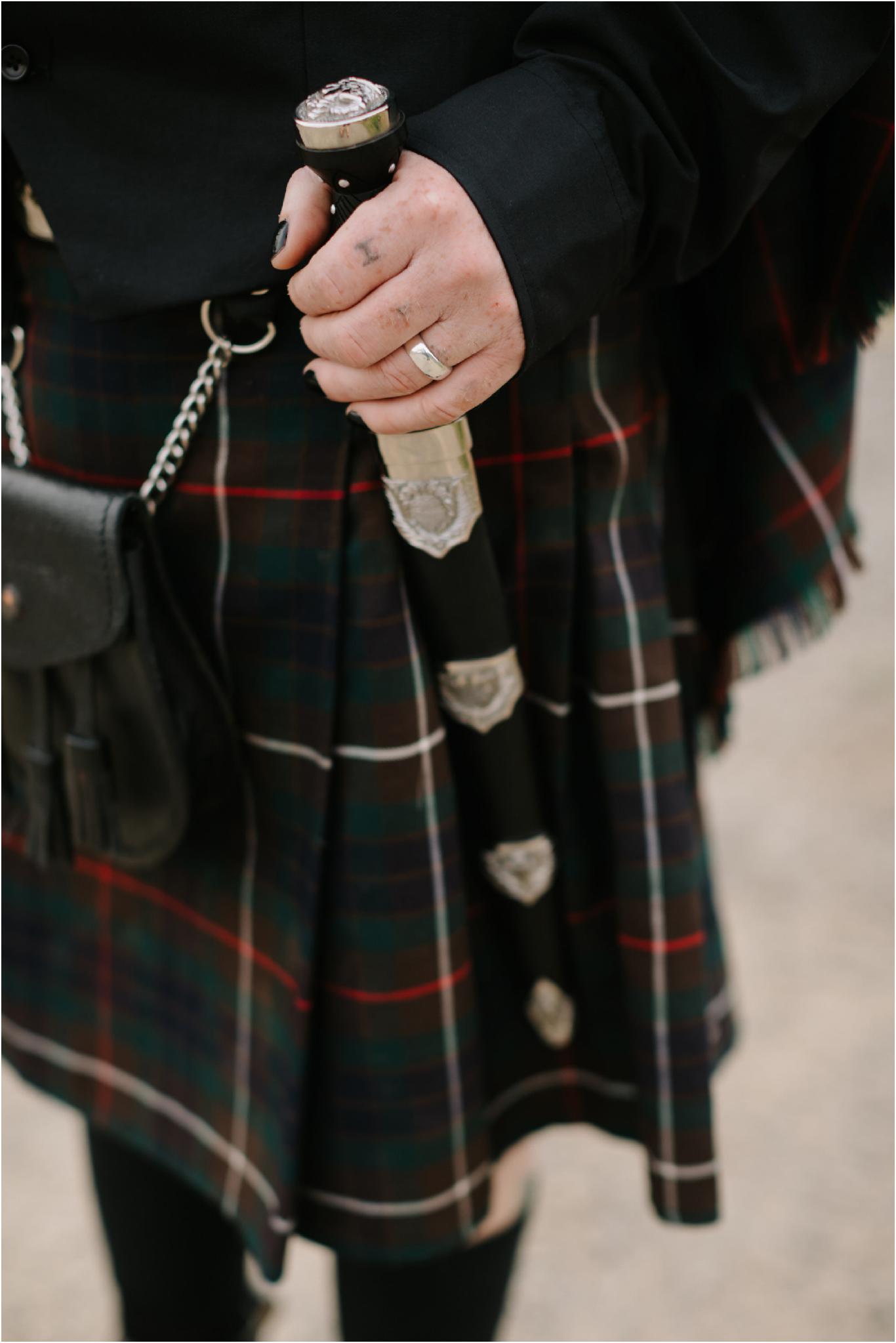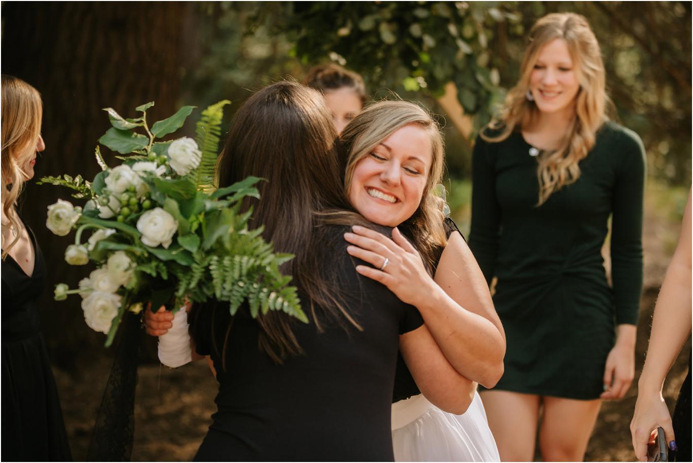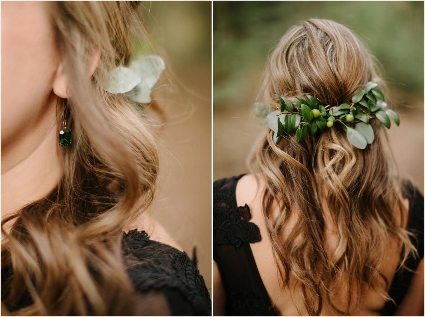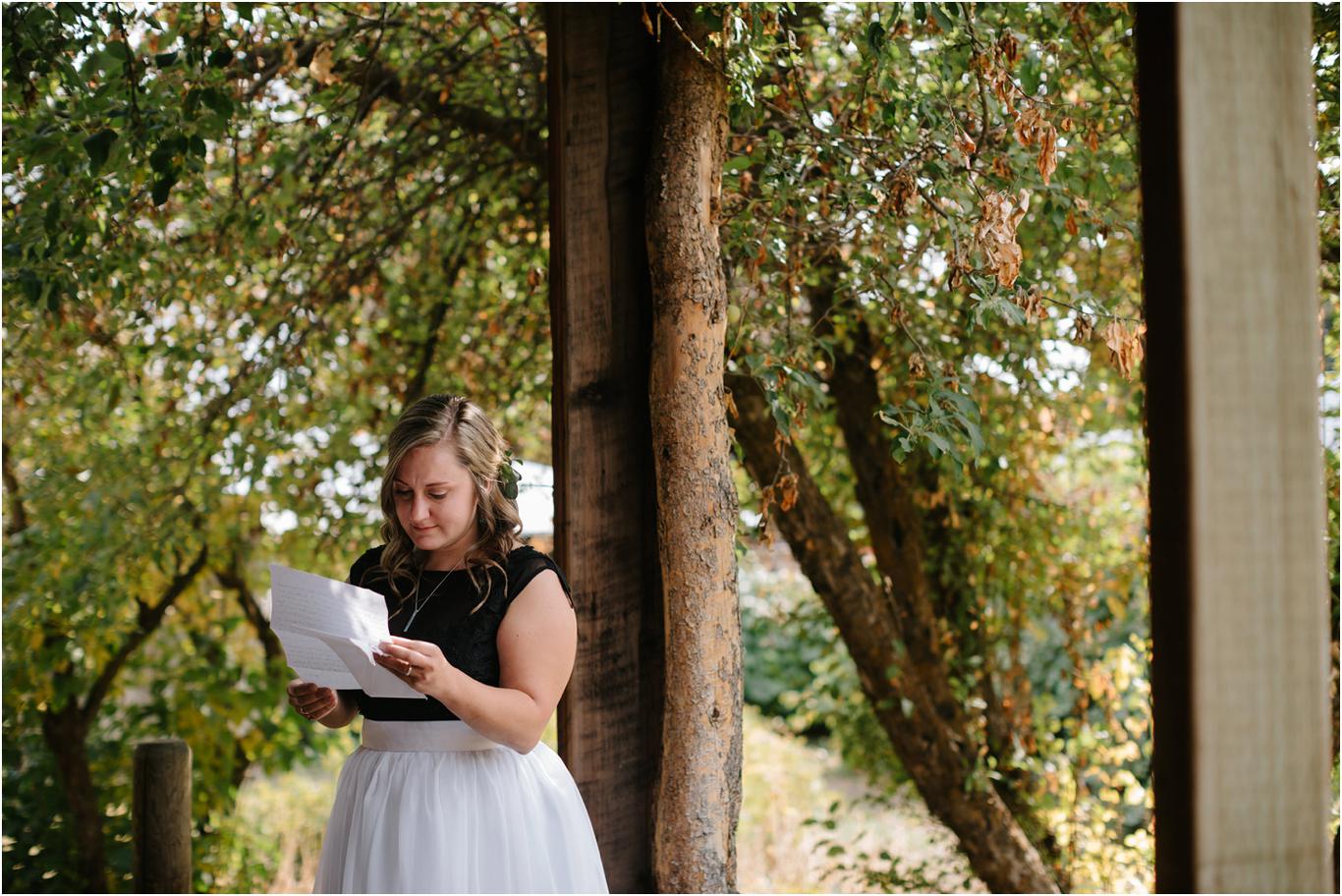 Josh’s family has deep ties to the land around Halfway. Like, seriously deep. His family actually came over on the Oregon Trail around 1868 (SO COOL!!!) and have lived there ever since. He told me that he has 6+ generations buried at the local cemetery. As we were driving around, he pointed out roads that his grandfather helped blast out with dynamite. The town already has a wild west feel to it, but learning the personal history made it even better. I could totally see how Mallory, a Portland girl like me, could fall hopelessly in love with the place and its inhabitants. Mallory and Josh planned their wedding in the town that started it all. They got ready at the lodge in town and a friends house, then held their wedding ceremony on Josh’s family property in the forest. He told me a story about a black bear that charged in the exact meadow they got married in, just a year or two earlier. The ceremony location is called “Pretty Tree,” nicknamed for the tall white fir tree that stands out in a small clearing. His great-grandfather always loved the tree and it was such a romantic spot to get married. Mallory is a graphic designer, and her design skills definitely made this Eastern Oregon wedding special. I was obsessed with the hexagonal ceremony arch, greenery with feathers, and the all the ceremony decor. PLUS she had a dip-dyed black wedding dress and bodysuit from Sweet Caroline Styles! How cool is that? Her outfit paired SO well with Josh’s traditional kilt that he wore to represent his family’s Fraser clan.