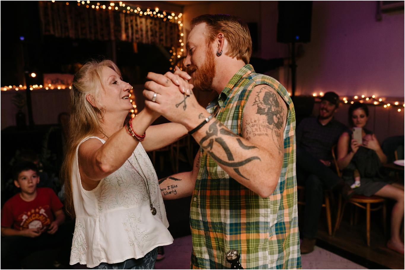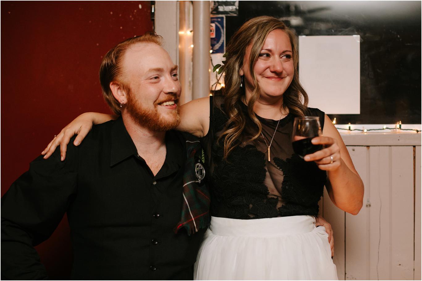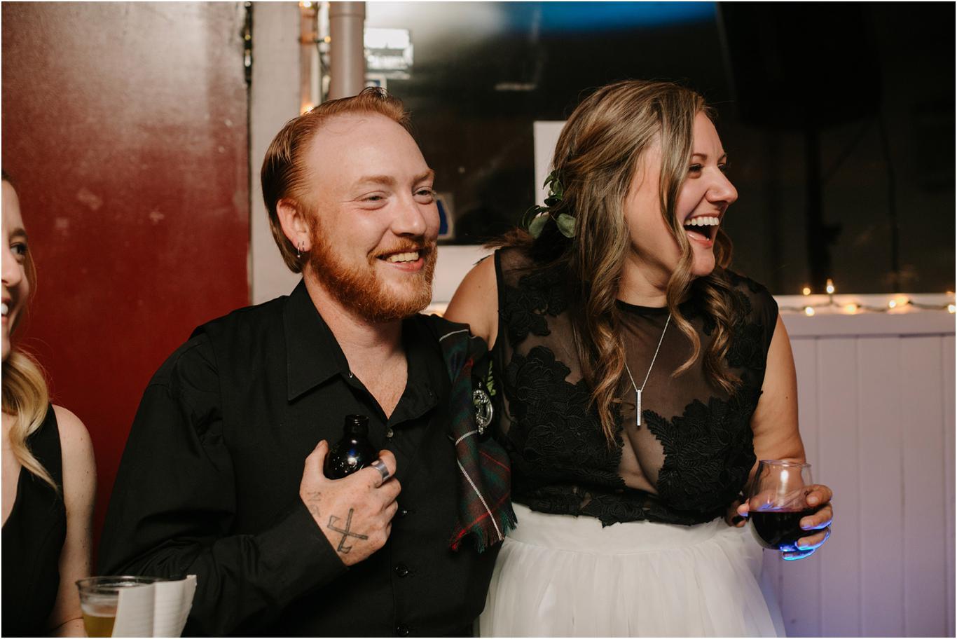 There was only one obvious place to hold Mallory and Josh’s wedding reception: at the bar that started everything. Josh works as a bartender at Wild Bills, a western dive bar in the heart of Halfway. His best friend (and Best Wo-man in his wedding party) owns the bar and was stoked to host their reception there. It was laid-back, fun, and one heck of a party. Most importantly, it was SO them. Mallory told me that the thing she loves most about Josh is that he is patient, kind, and loves her for who I she is. “We have the best time doing things together โ making things, exploring, and just hanging out,” she told me. When she asked Josh his favorite thing, he immediately responded, “her butt!” But he was joking. “The thing that attracted me to Mallory right in the beginning is her laugh,” he said. And it’s easy to see why. She has a light-up-the-whole-room laugh that just makes everything in life brighter. And it was something I was happy to capture in all their joyful wedding photos. This weekend was SO happy, relaxed, fun and unique and it was an honor to be their Eastern Oregon wedding photographer!