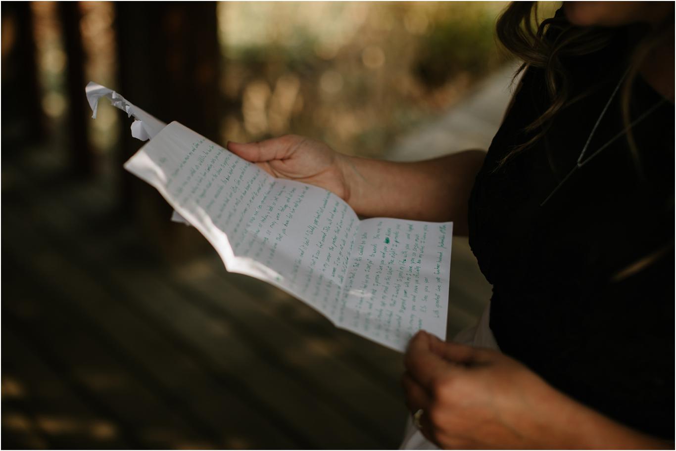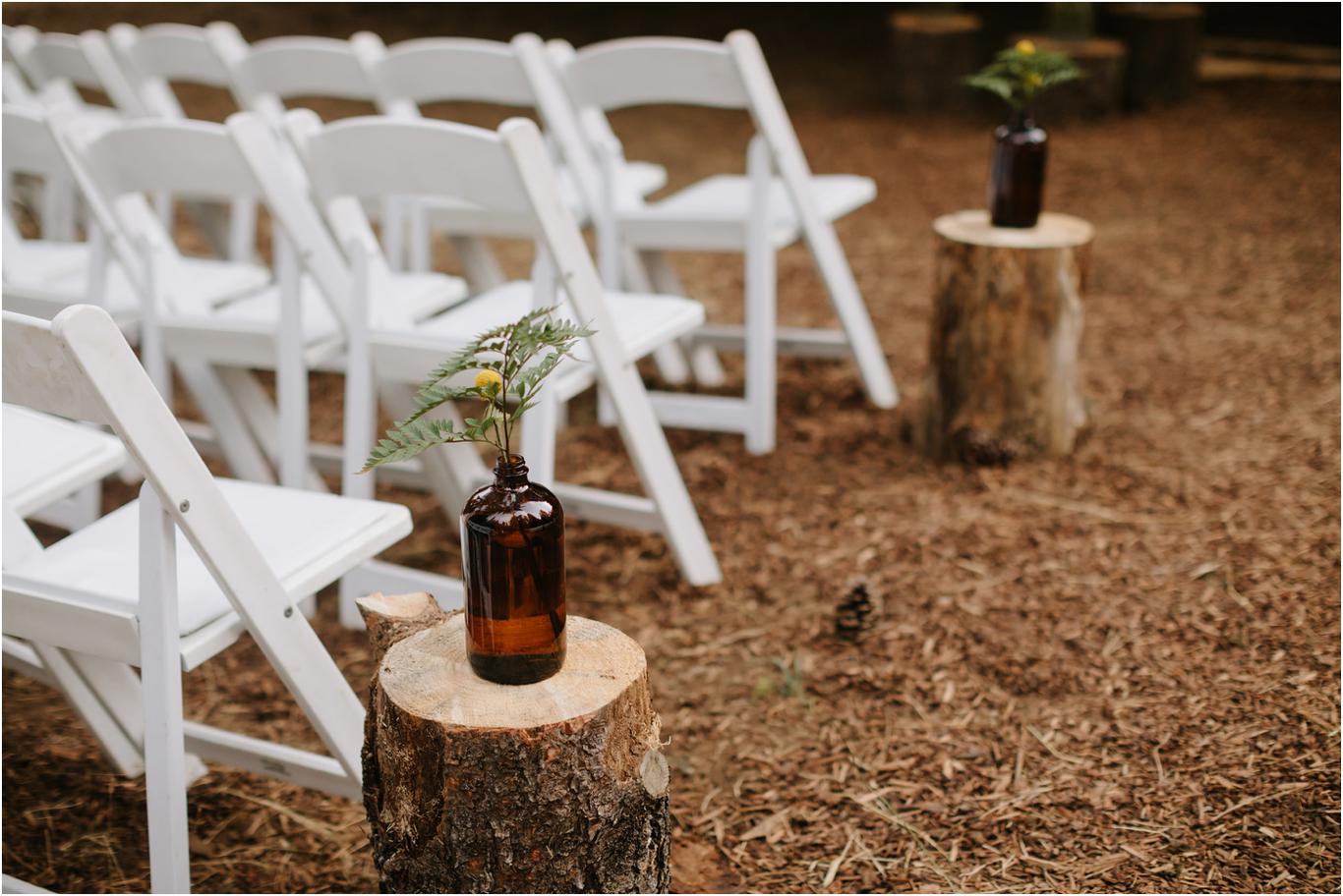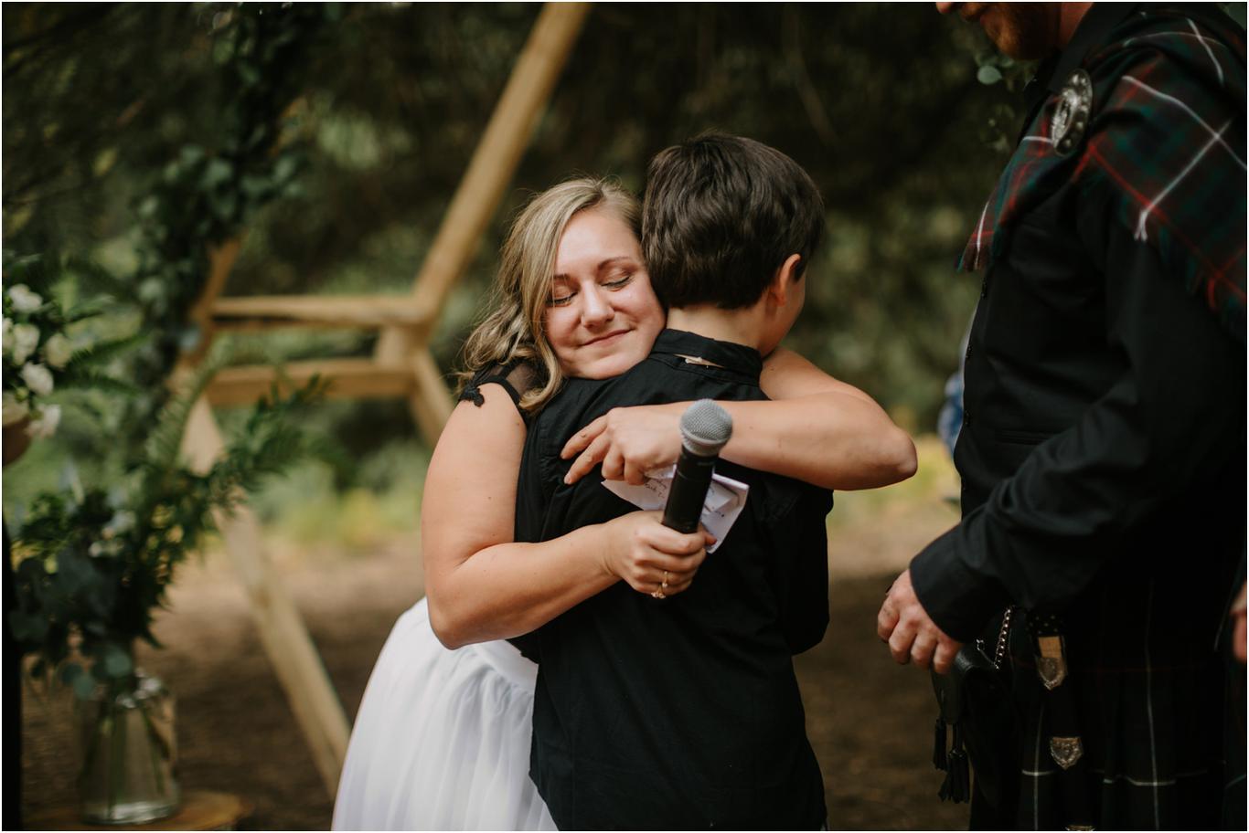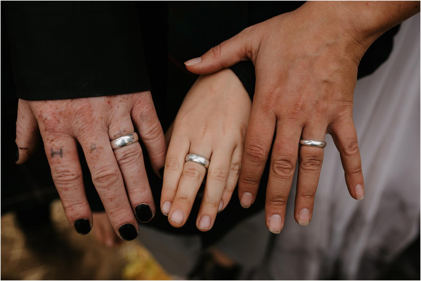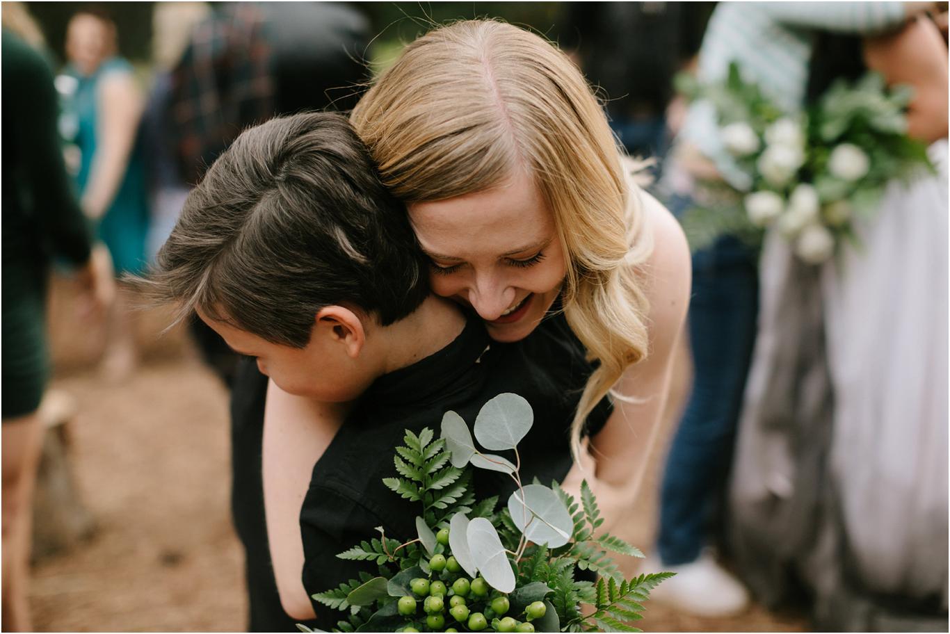 There was definitely a natural theme to the wedding weekend. As Josh was pinning his Fraser family crest to his outfit, I read the words “Je Suis Prest” engraved in it. It’s the motto of his Scottish clan and it means “I am ready.” Mallory also wore a necklace with the saying on it. I thought it was really special considering the way the words tied the past with the present. One of the most significant parts of their marriage is that Josh has a son, John. Mallory wasn’t just committing to Josh that weekend, she was committing to a lifetime of being John’s mom as well. Their wedding ceremony at Pretty Tree began with Josh and John dancing down the aisle to the song Oo de Lally from Robin Hood. After Mallory and her dad walked down the aisle, the first thing that Mallory did was say vows to John. She promised to take care of him and be his mom for the rest of their lives together. Pretty much everyone cried. And as Mallory and Josh exchanged their own vows and rings, John got his own ring too. The three of them actually made the rings themselves too โ three timeless silver bands handmade with love.