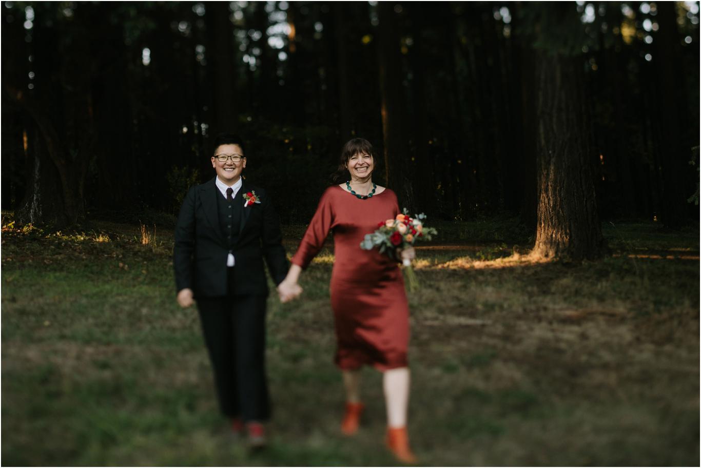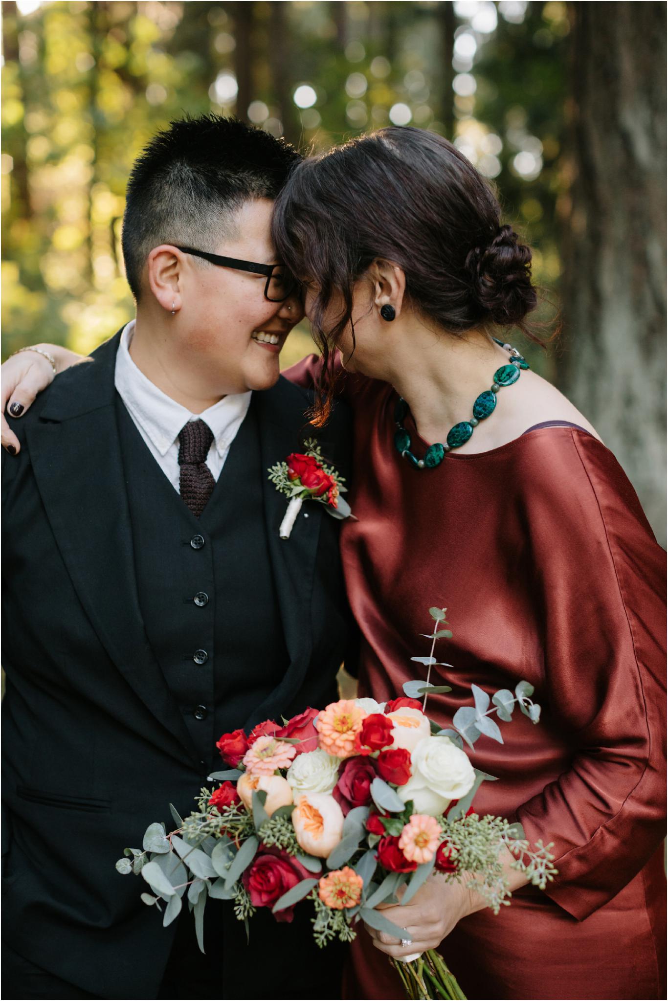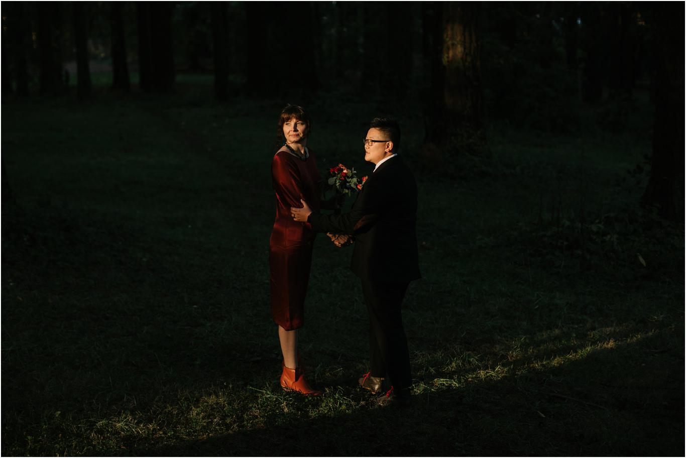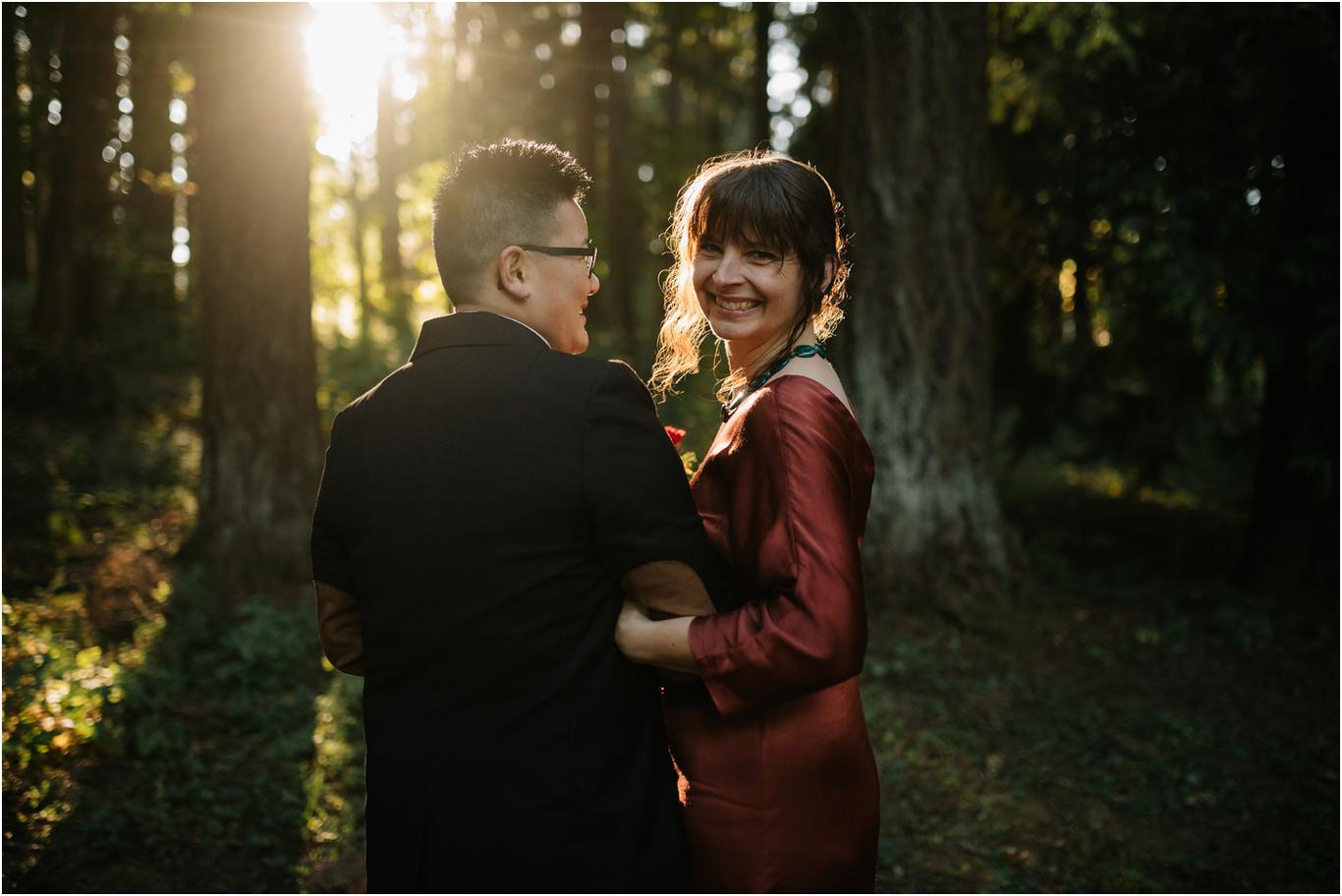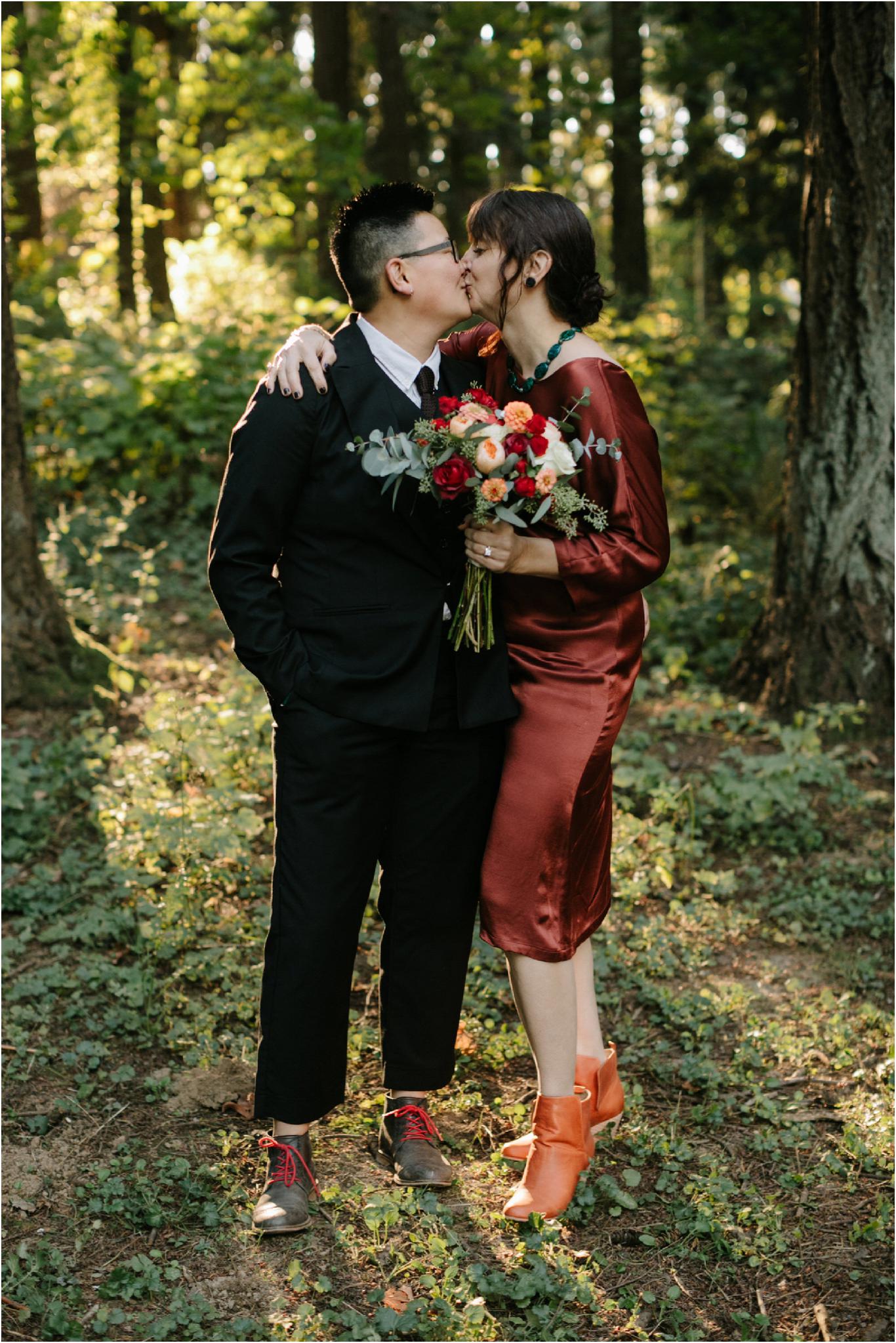 After scheming a bit, Cissey and Marya came up with the perfect plan. They decided to have an intimate Portland elopement in the forest at Pier Park. The park is just down the street from their house, and they go there all the time together! They got ready together that morning, then hosted cocktails and snacks in their backyard before walking over to the forest for their ceremony. We took a ton of pictures amongst the tall trees, then spent a little more time hanging out at their house, eating cake, giving toasts and enjoying the crisp fall weather before dinner. Finally, as it got dark, we set off to Little Sheep, a Mongolian Hot Pot restaurant in Beaverton! It was SO them and such a unique and fun way to end the day with a huge, long meal! I was SO happy I got to be their Portland same sex wedding photographer, as well as a guest!