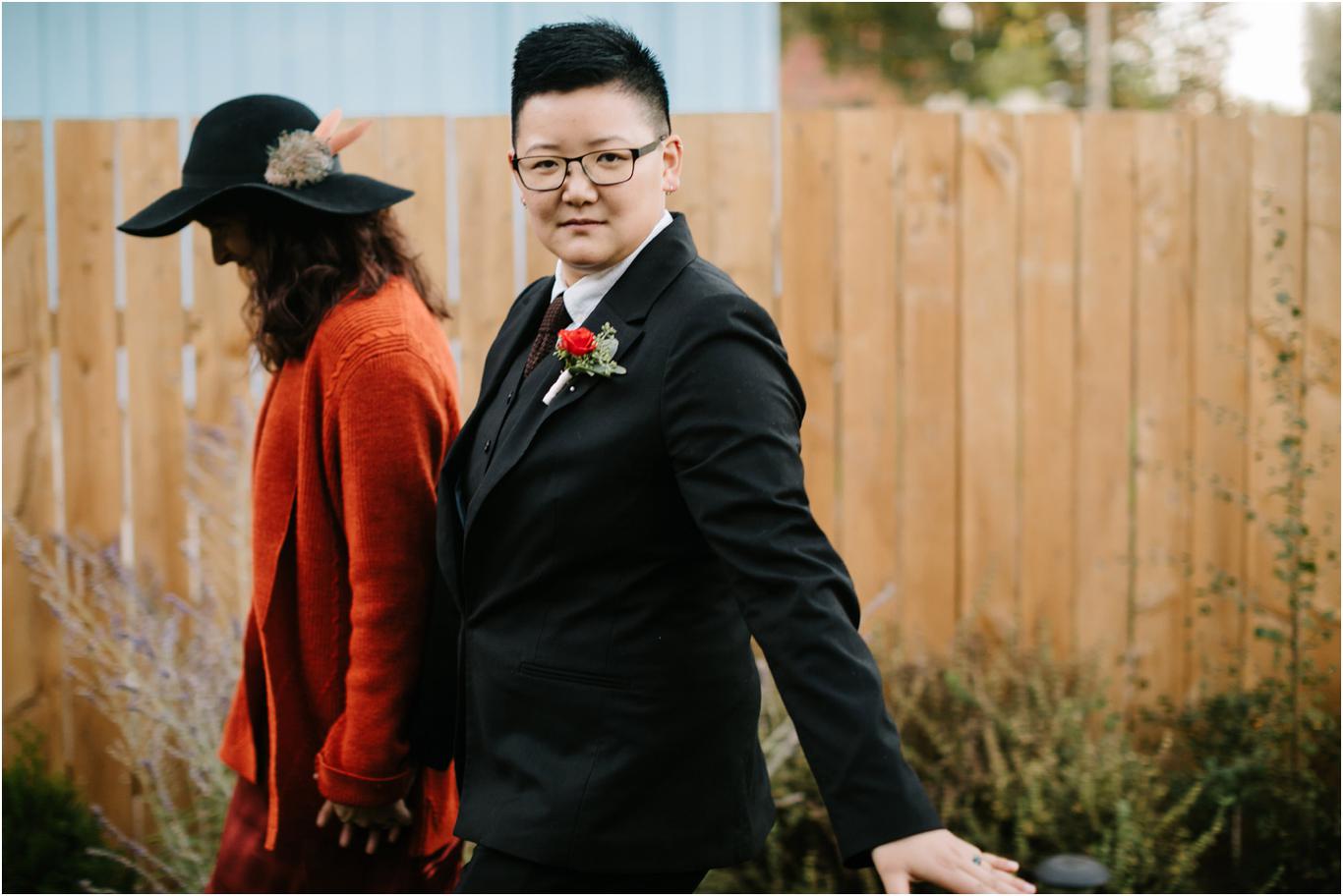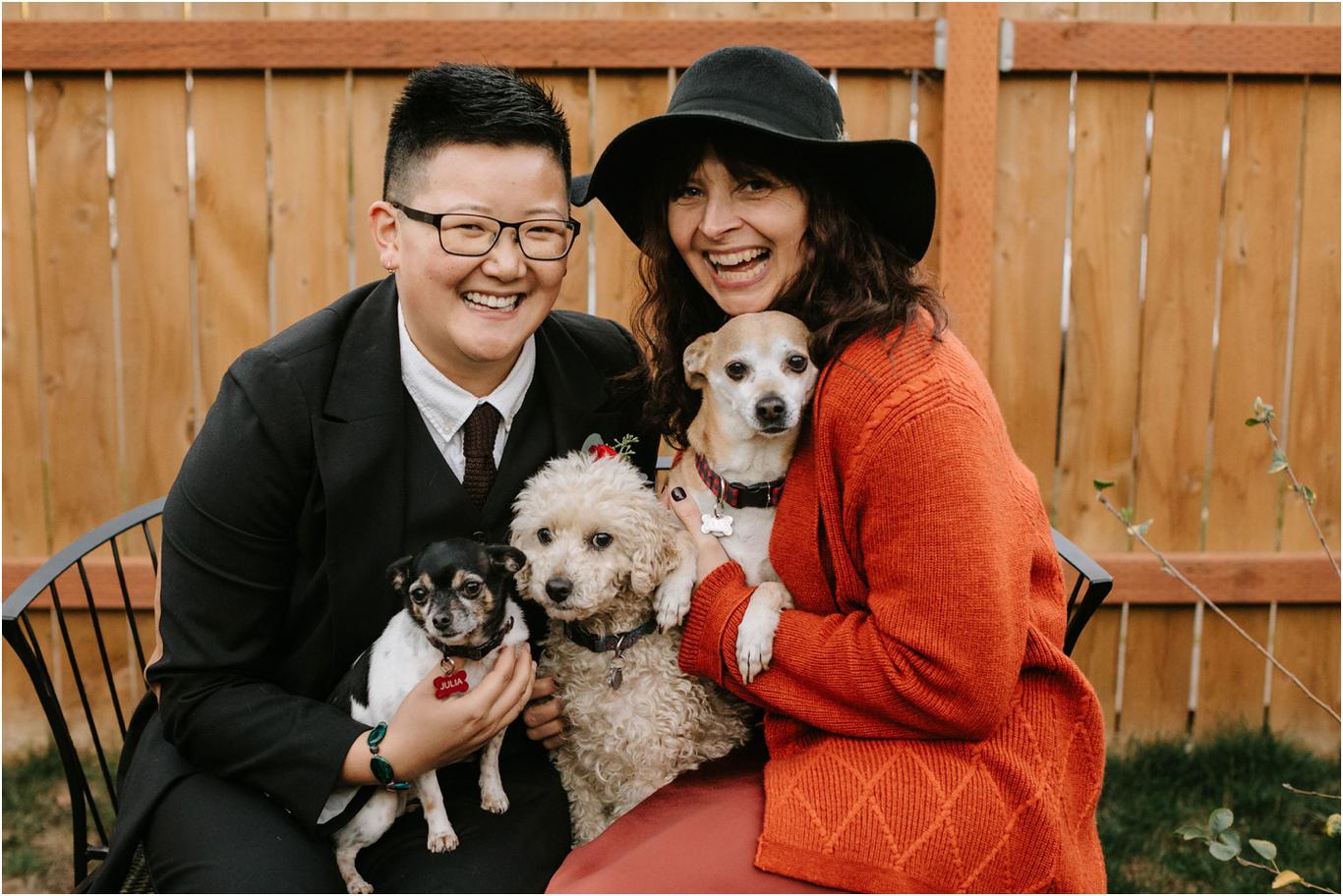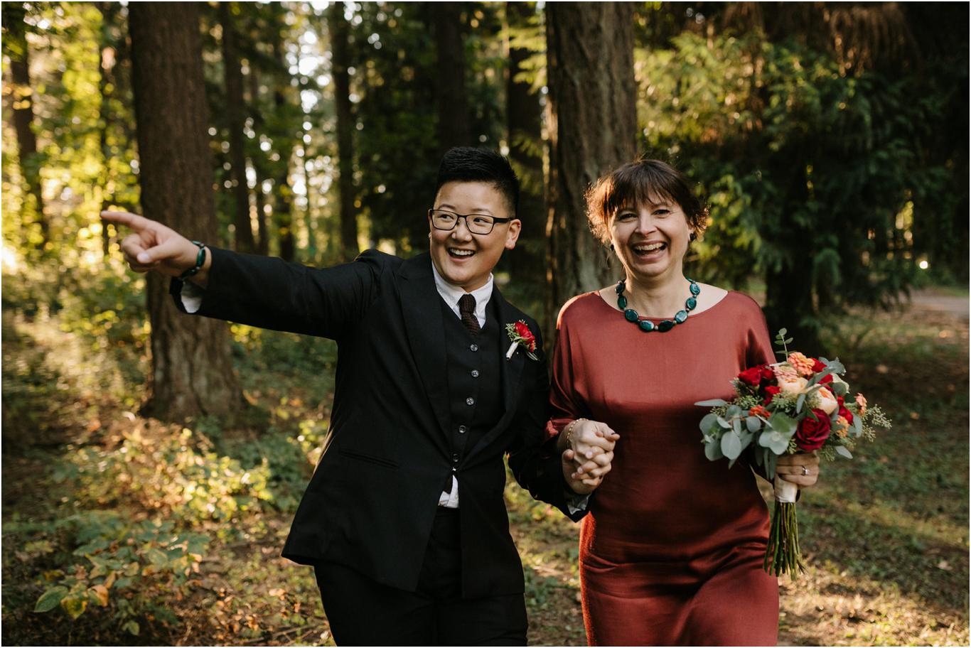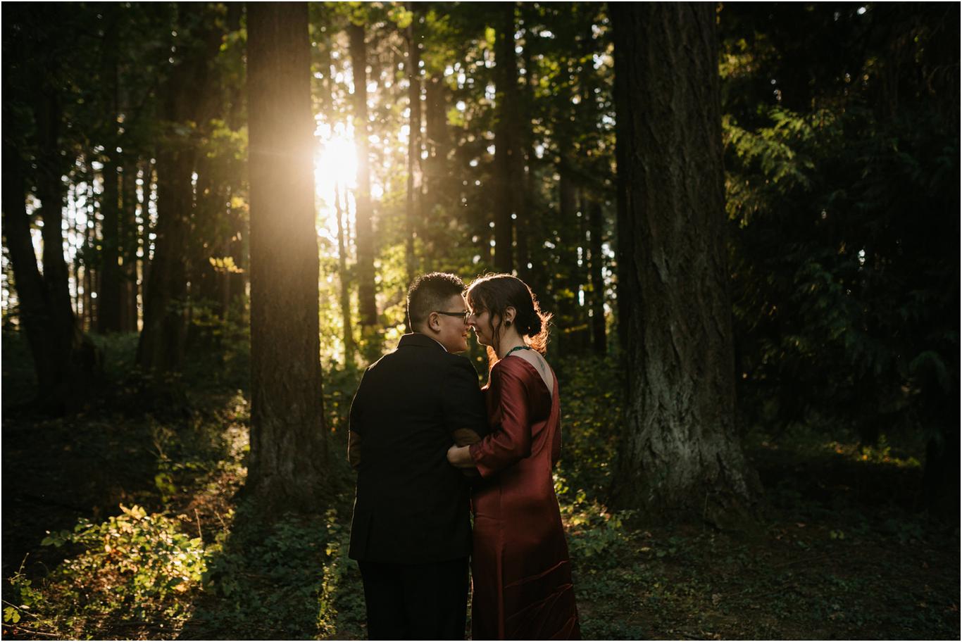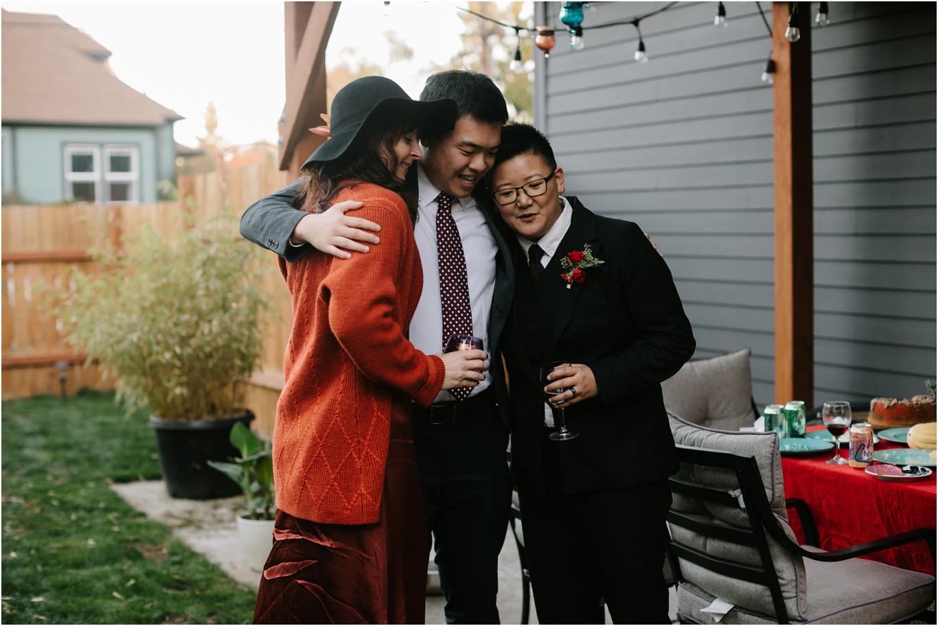 After scheming a bit, Cissey and Marya came up with the perfect plan. They decided to have an intimate Portland elopement in the forest at Pier Park. The park is just down the street from their house, and they go there all the time together! They got ready together that morning, then hosted cocktails and snacks in their backyard before walking over to the forest for their ceremony. We took a ton of pictures amongst the tall trees, then spent a little more time hanging out at their house, eating cake, giving toasts and enjoying the crisp fall weather before dinner. Finally, as it got dark, we set off to Little Sheep, a Mongolian Hot Pot restaurant in Beaverton! It was SO them and such a unique and fun way to end the day with a huge, long meal! I was SO happy I got to be their Portland same sex wedding photographer, as well as a guest!