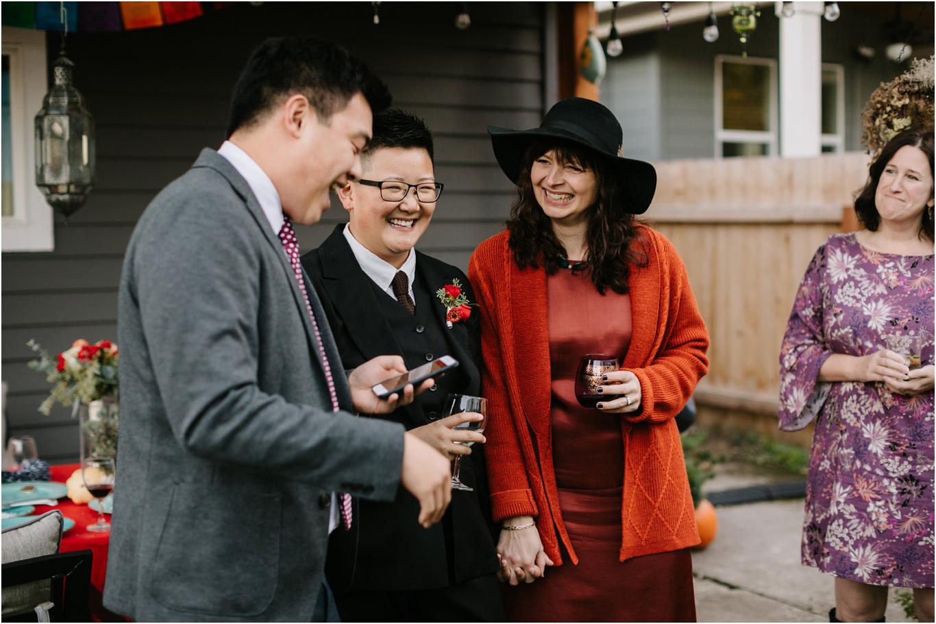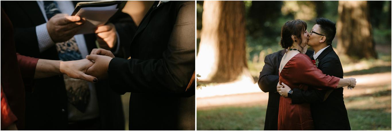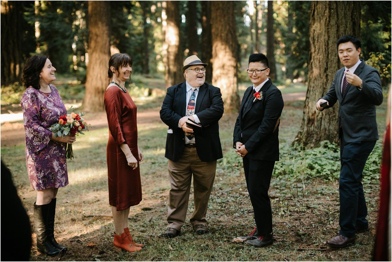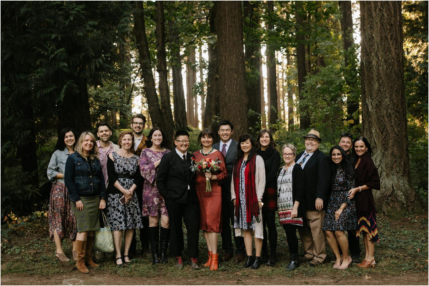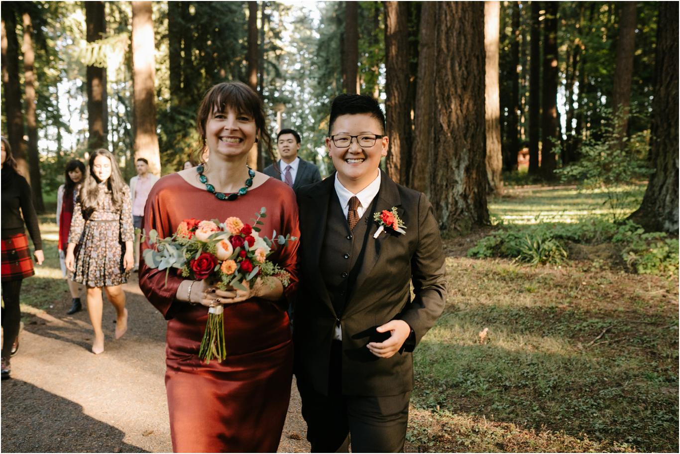 After scheming a bit, Cissey and Marya came up with the perfect plan. They decided to have an intimate Portland elopement in the forest at Pier Park. The park is just down the street from their house, and they go there all the time together! They got ready together that morning, then hosted cocktails and snacks in their backyard before walking over to the forest for their ceremony. We took a ton of pictures amongst the tall trees, then spent a little more time hanging out at their house, eating cake, giving toasts and enjoying the crisp fall weather before dinner. Finally, as it got dark, we set off to Little Sheep, a Mongolian Hot Pot restaurant in Beaverton! It was SO them and such a unique and fun way to end the day with a huge, long meal! I was SO happy I got to be their Portland same sex wedding photographer, as well as a guest!