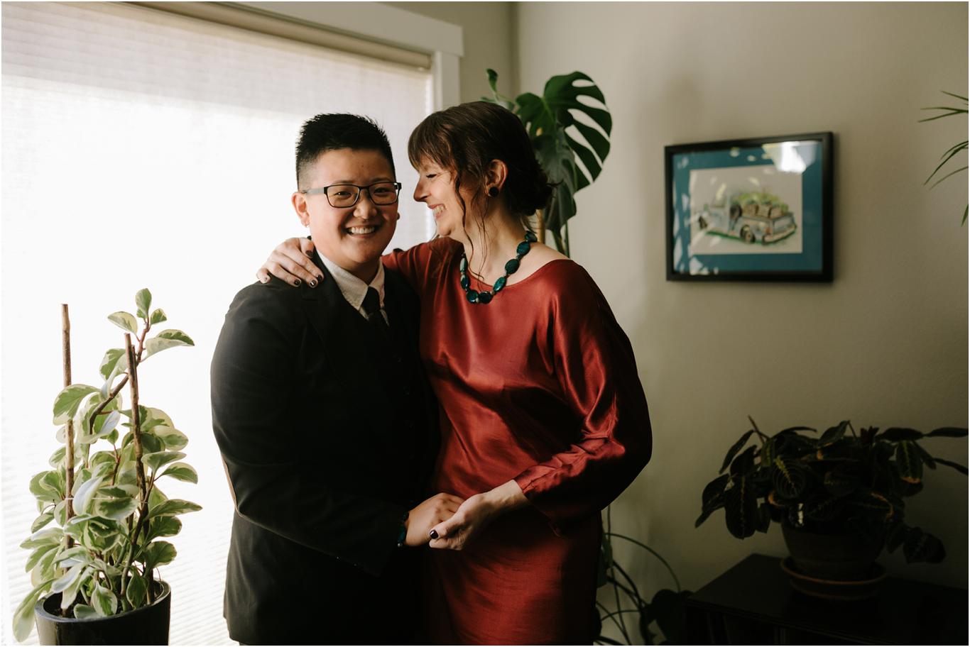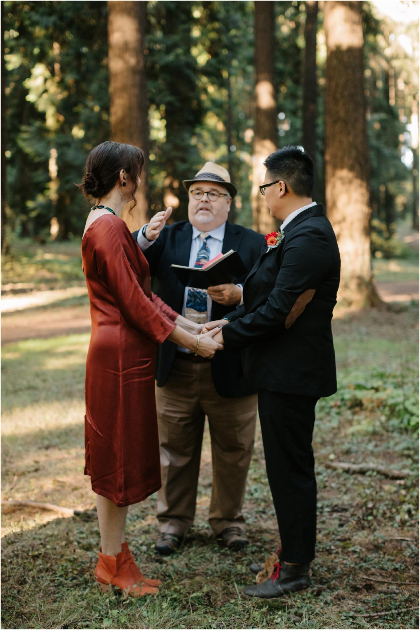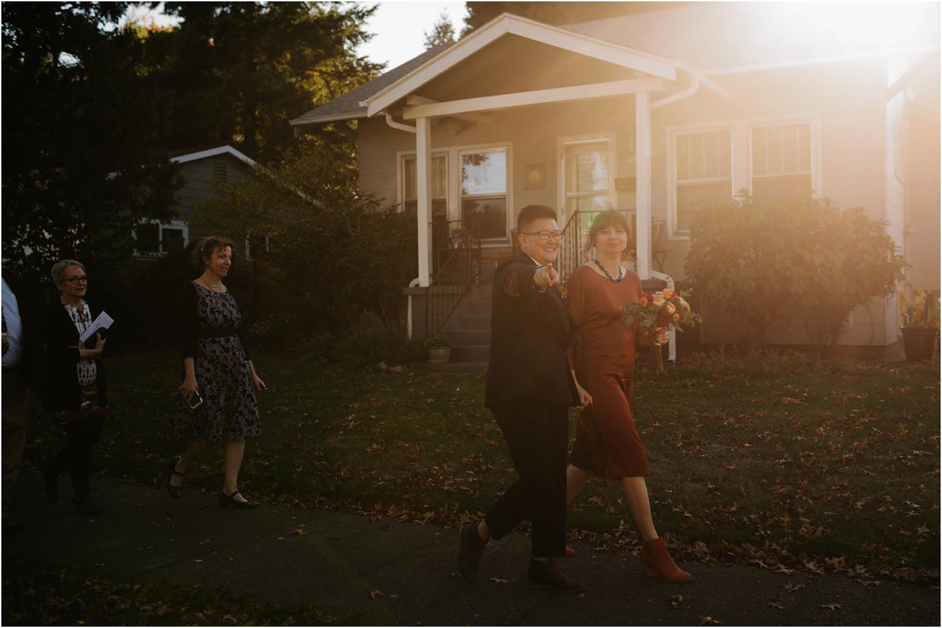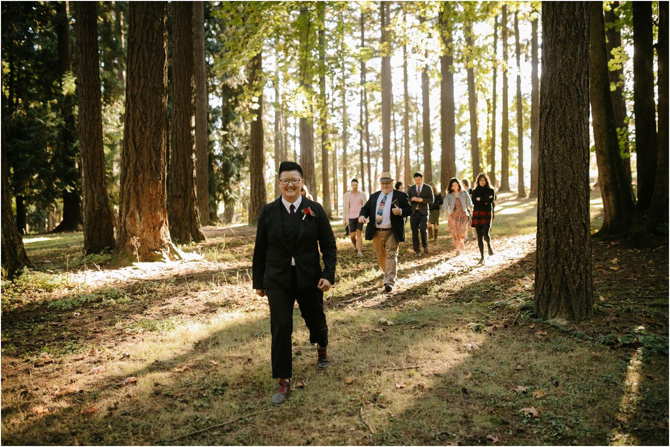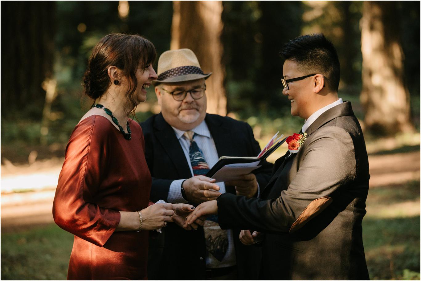 After scheming a bit, Cissey and Marya came up with the perfect plan. They decided to have an intimate Portland elopement in the forest at Pier Park. The park is just down the street from their house, and they go there all the time together! They got ready together that morning, then hosted cocktails and snacks in their backyard before walking over to the forest for their ceremony. We took a ton of pictures amongst the tall trees, then spent a little more time hanging out at their house, eating cake, giving toasts and enjoying the crisp fall weather before dinner. Finally, as it got dark, we set off to Little Sheep, a Mongolian Hot Pot restaurant in Beaverton! It was SO them and such a unique and fun way to end the day with a huge, long meal! I was SO happy I got to be their Portland same sex wedding photographer, as well as a guest!
