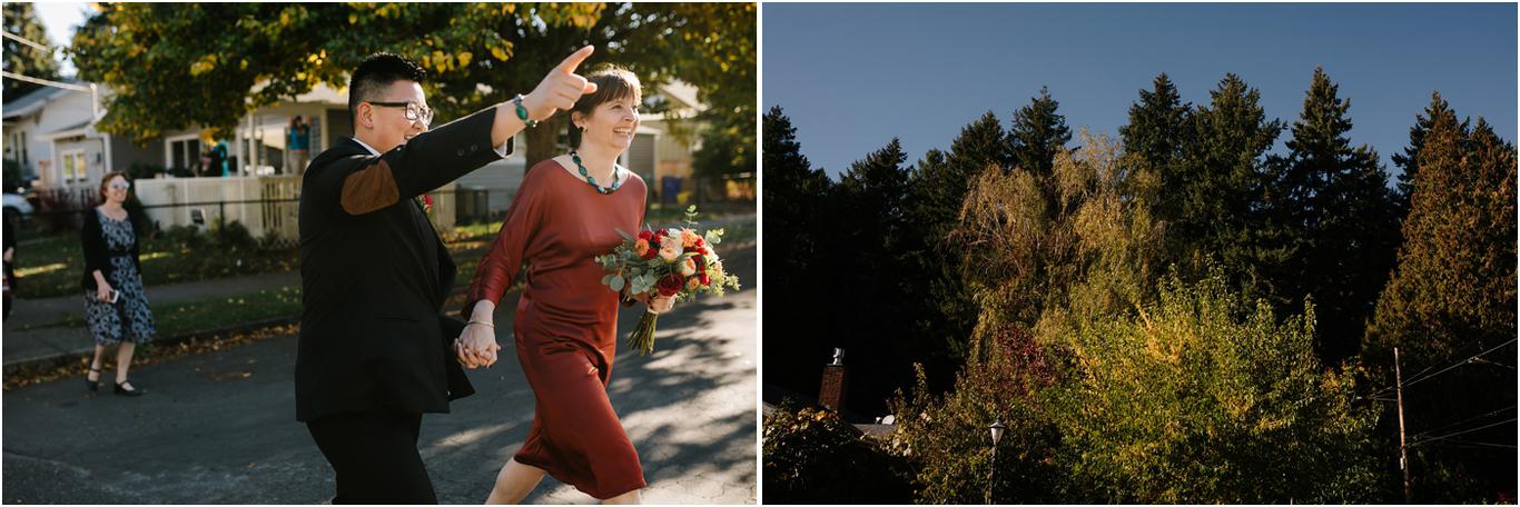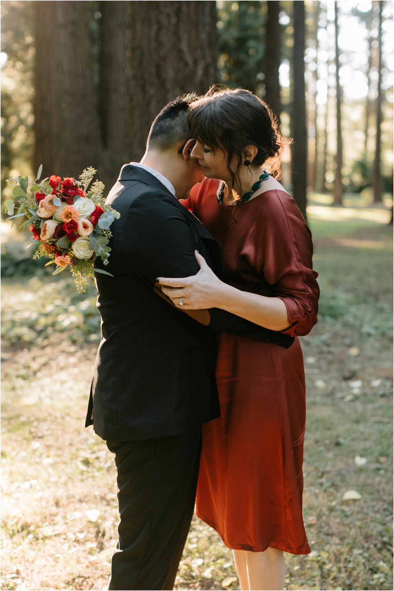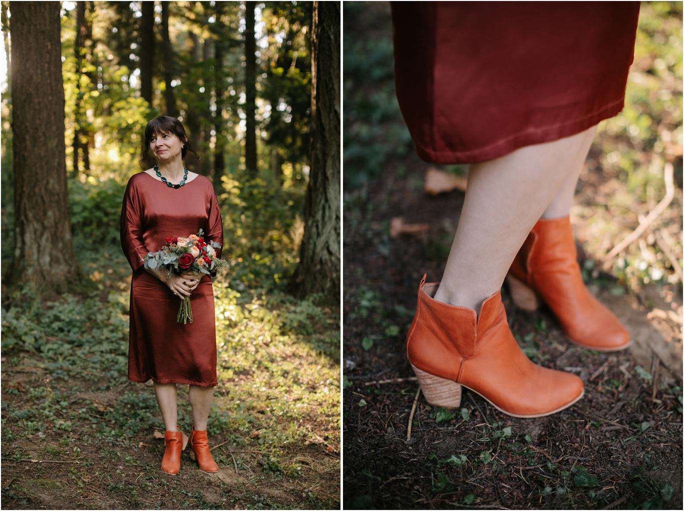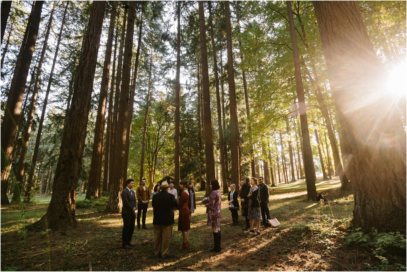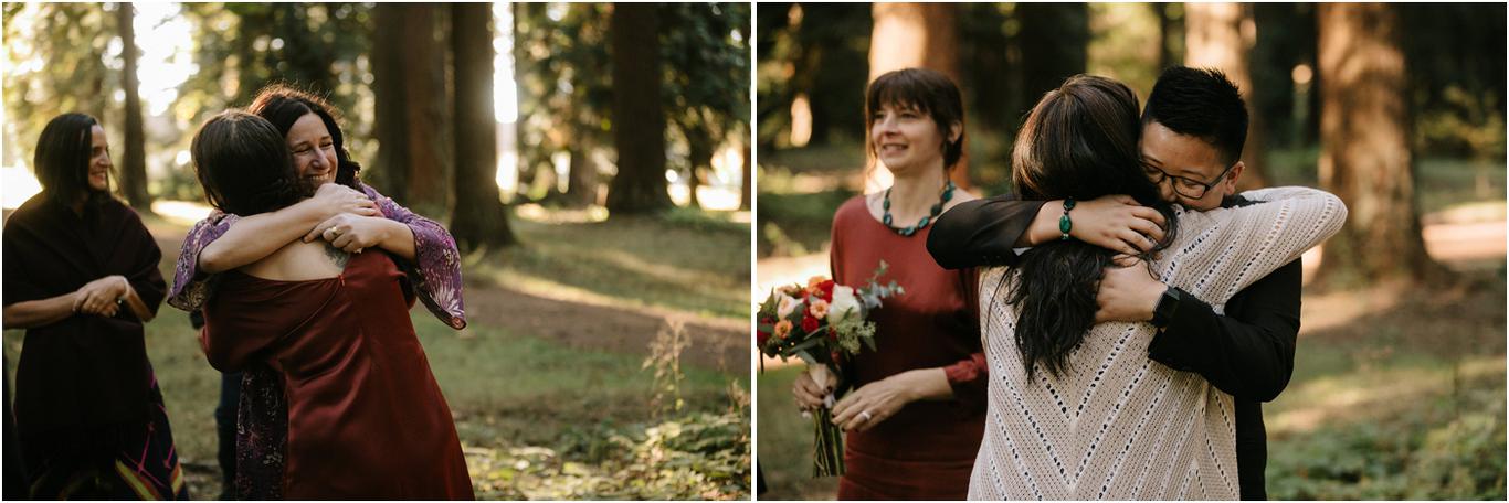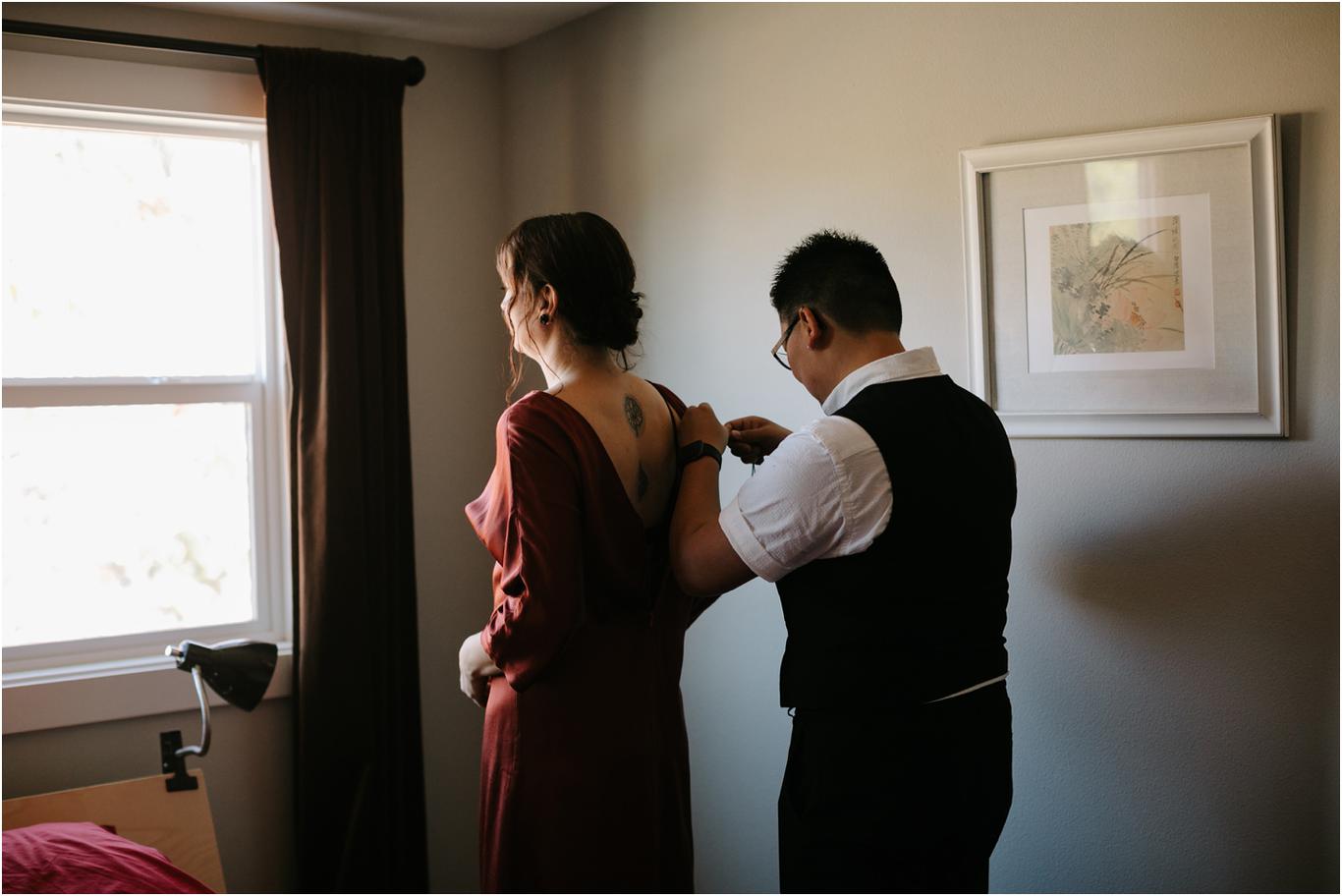 After scheming a bit, Cissey and Marya came up with the perfect plan. They decided to have an intimate Portland elopement in the forest at Pier Park. The park is just down the street from their house, and they go there all the time together! They got ready together that morning, then hosted cocktails and snacks in their backyard before walking over to the forest for their ceremony. We took a ton of pictures amongst the tall trees, then spent a little more time hanging out at their house, eating cake, giving toasts and enjoying the crisp fall weather before dinner. Finally, as it got dark, we set off to Little Sheep, a Mongolian Hot Pot restaurant in Beaverton! It was SO them and such a unique and fun way to end the day with a huge, long meal! I was SO happy I got to be their Portland same sex wedding photographer, as well as a guest!