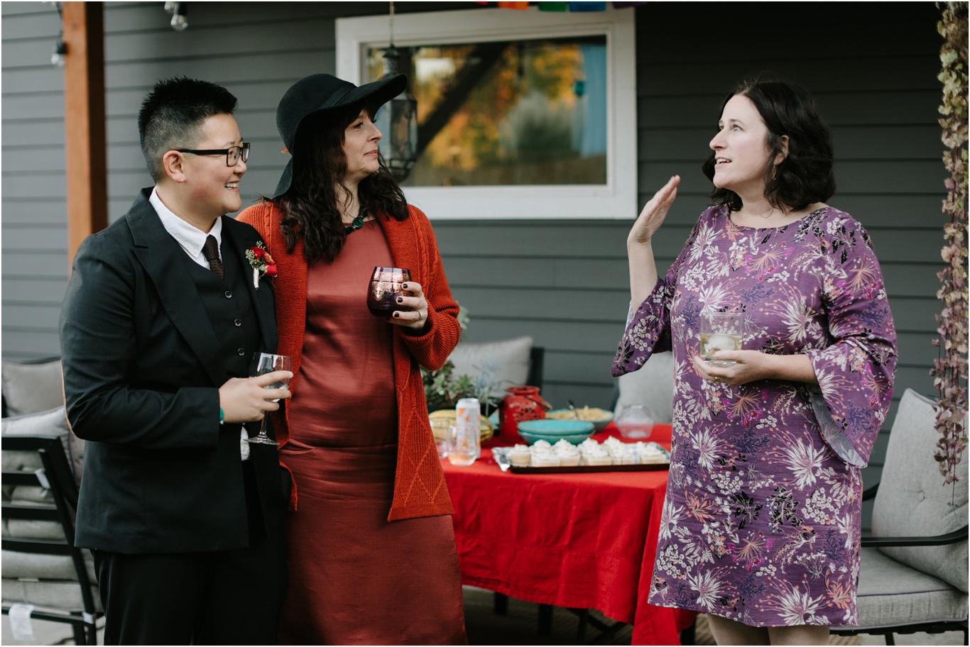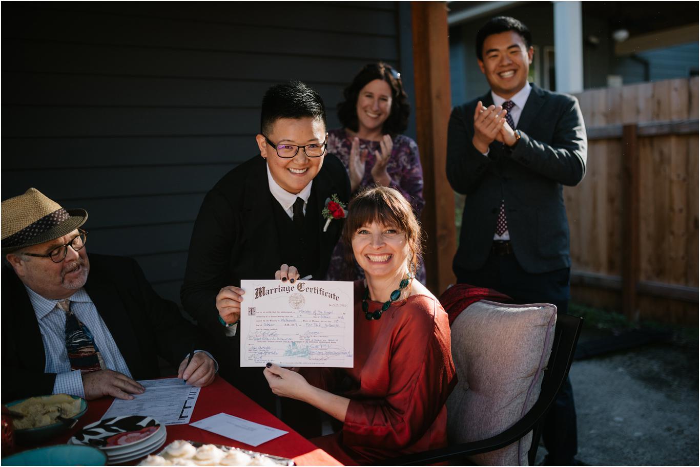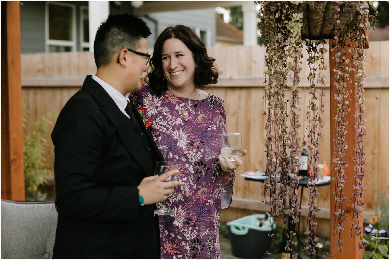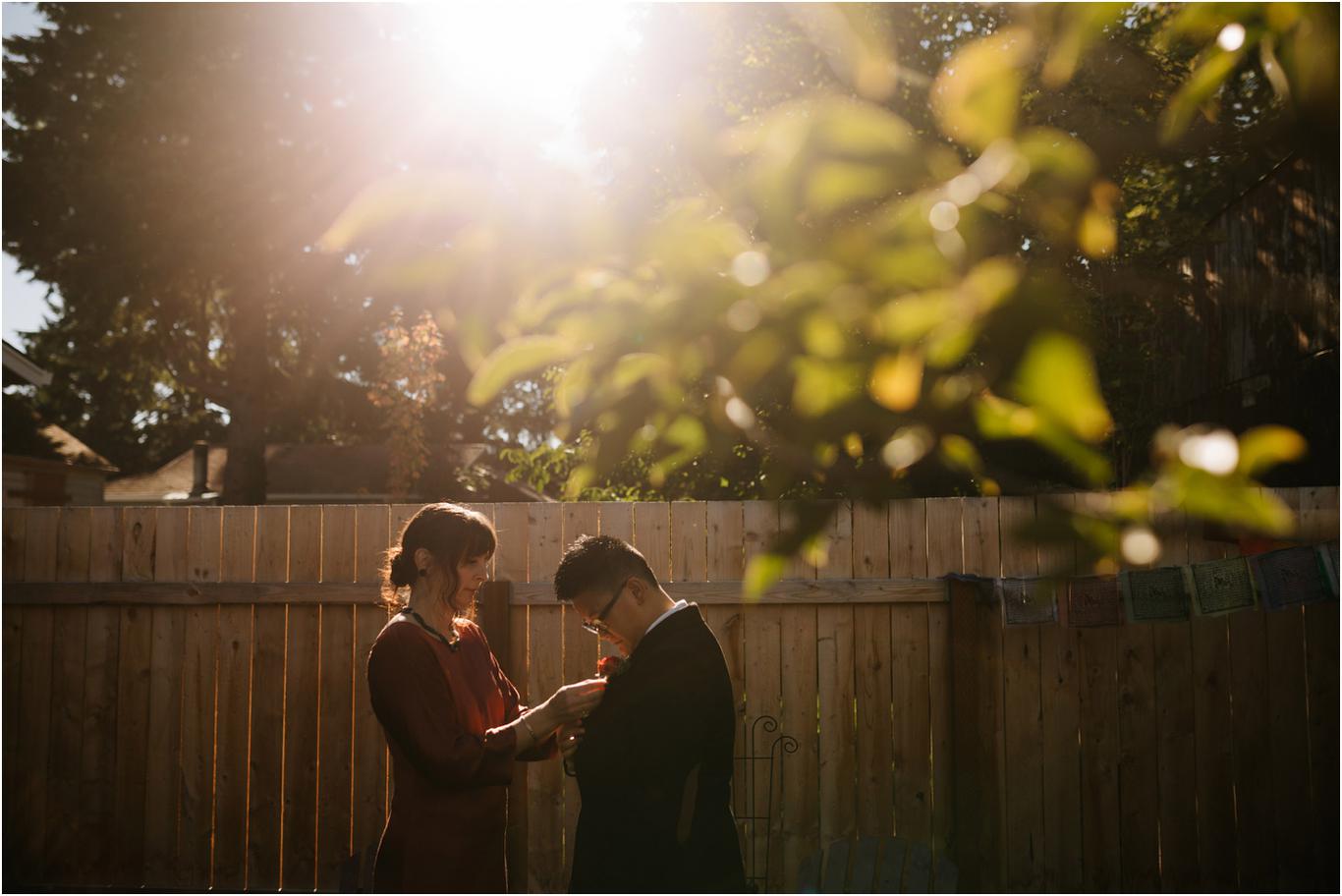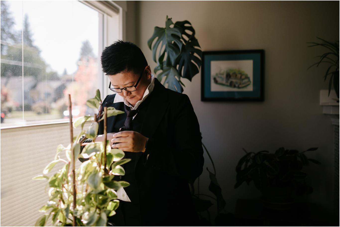 After scheming a bit, Cissey and Marya came up with the perfect plan. They decided to have an intimate Portland elopement in the forest at Pier Park. The park is just down the street from their house, and they go there all the time together! They got ready together that morning, then hosted cocktails and snacks in their backyard before walking over to the forest for their ceremony. We took a ton of pictures amongst the tall trees, then spent a little more time hanging out at their house, eating cake, giving toasts and enjoying the crisp fall weather before dinner. Finally, as it got dark, we set off to Little Sheep, a Mongolian Hot Pot restaurant in Beaverton! It was SO them and such a unique and fun way to end the day with a huge, long meal! I was SO happy I got to be their Portland same sex wedding photographer, as well as a guest!