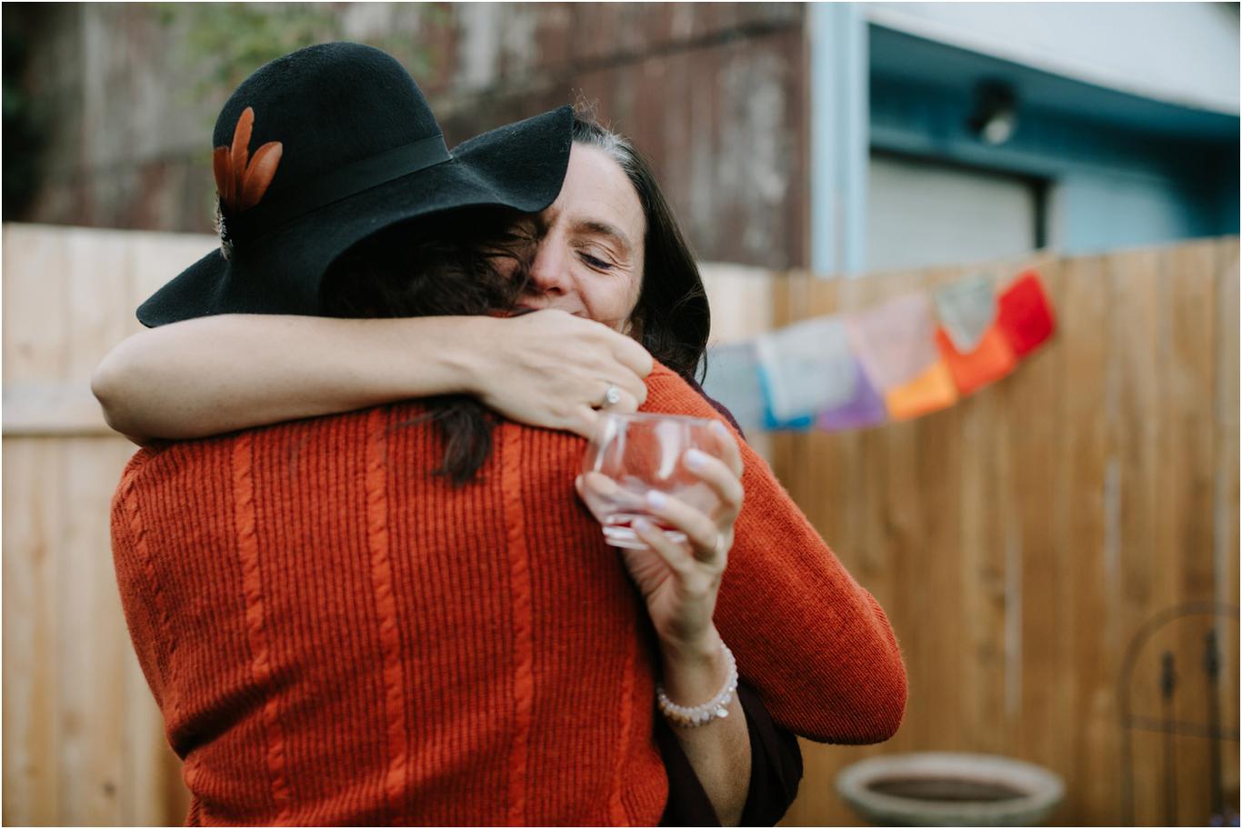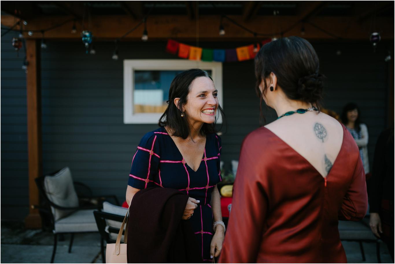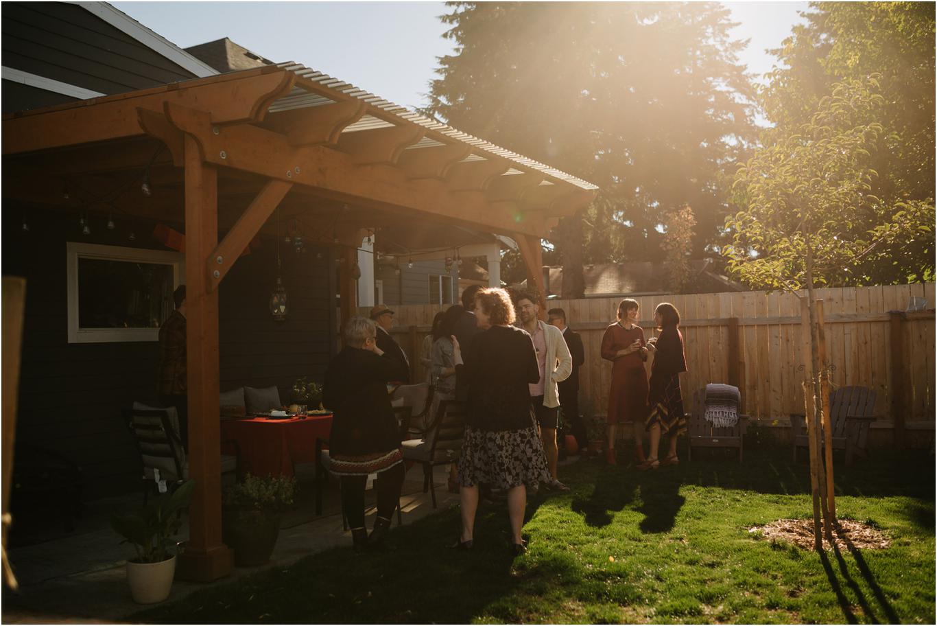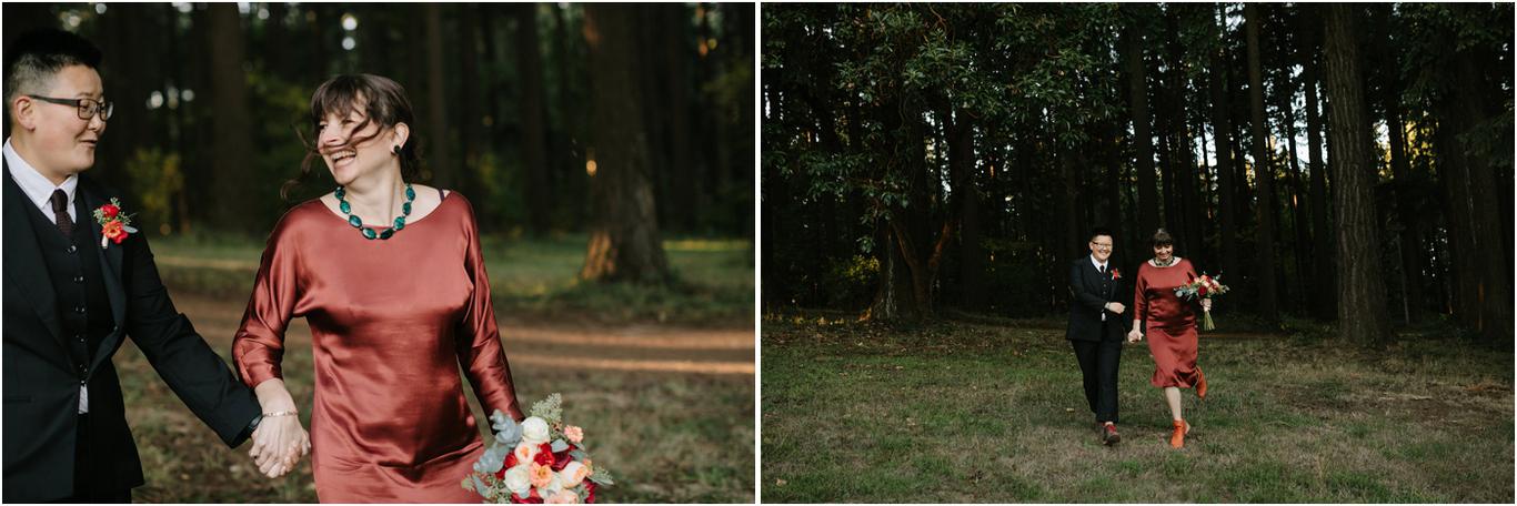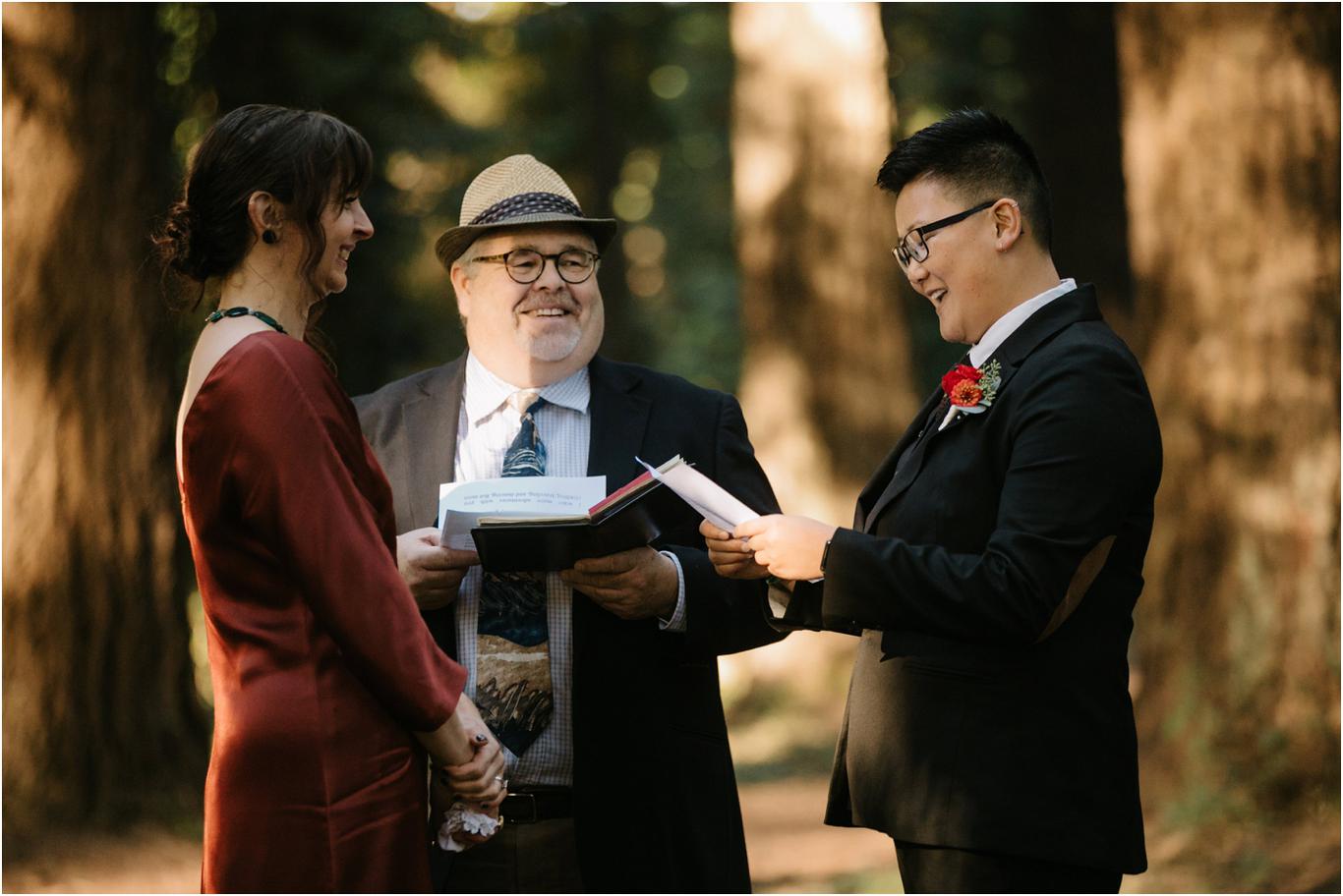 After scheming a bit, Cissey and Marya came up with the perfect plan. They decided to have an intimate Portland elopement in the forest at Pier Park. The park is just down the street from their house, and they go there all the time together! They got ready together that morning, then hosted cocktails and snacks in their backyard before walking over to the forest for their ceremony. We took a ton of pictures amongst the tall trees, then spent a little more time hanging out at their house, eating cake, giving toasts and enjoying the crisp fall weather before dinner. Finally, as it got dark, we set off to Little Sheep, a Mongolian Hot Pot restaurant in Beaverton! It was SO them and such a unique and fun way to end the day with a huge, long meal! I was SO happy I got to be their Portland same sex wedding photographer, as well as a guest!