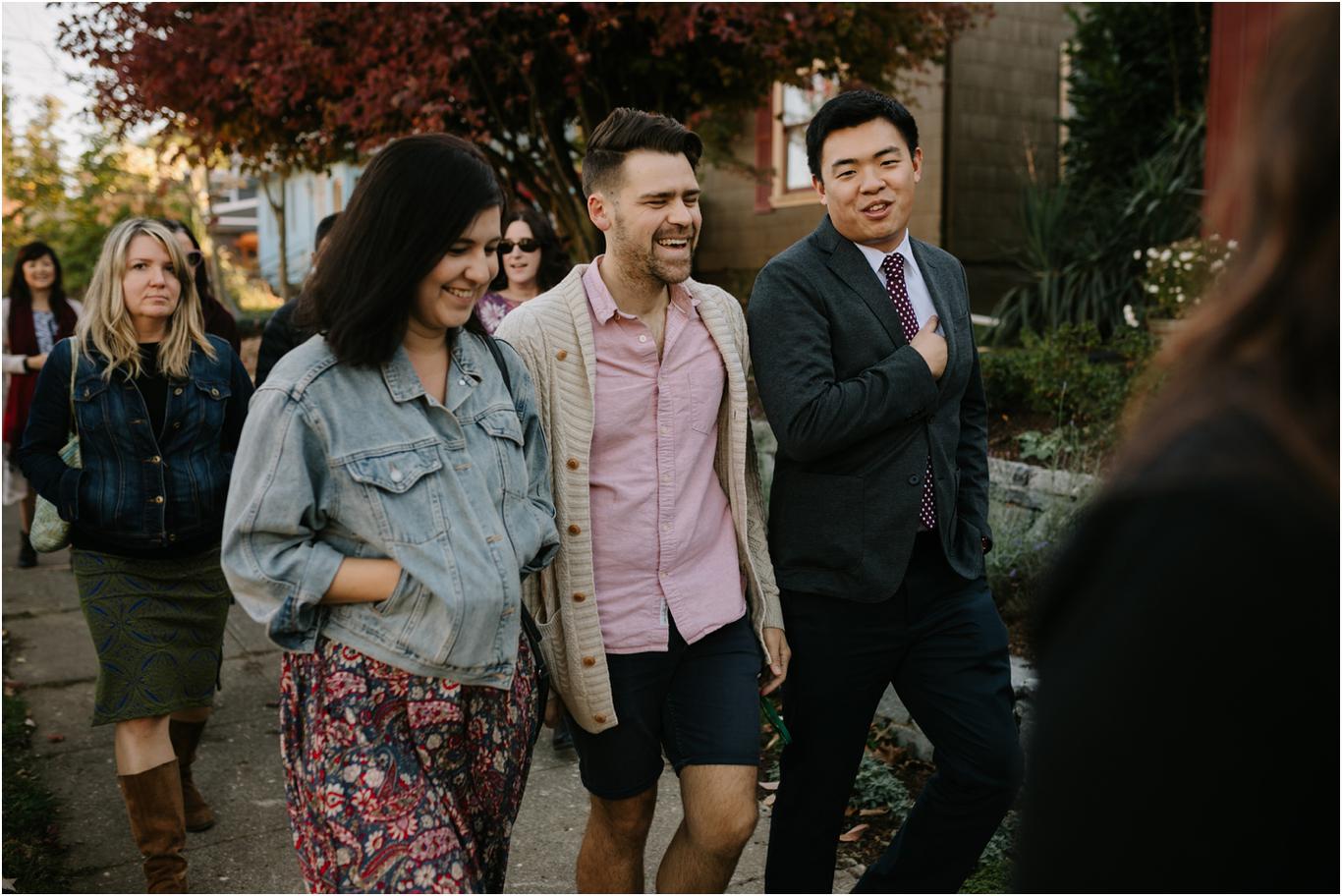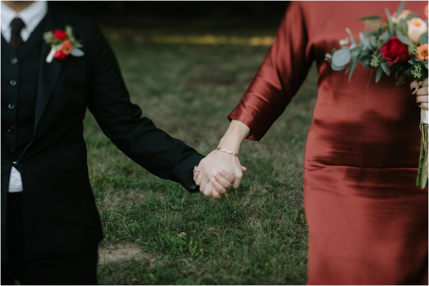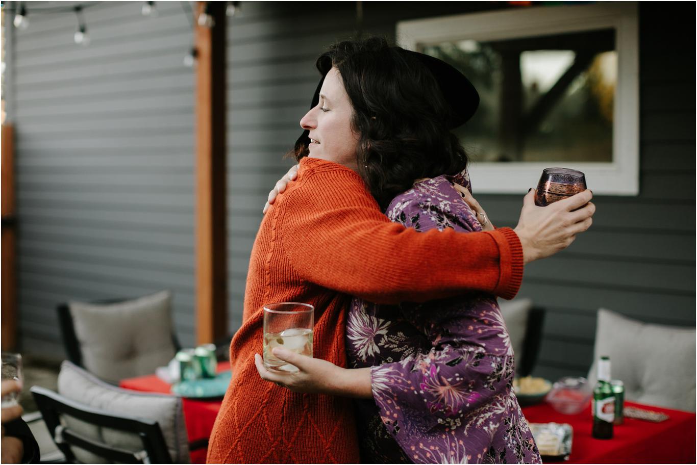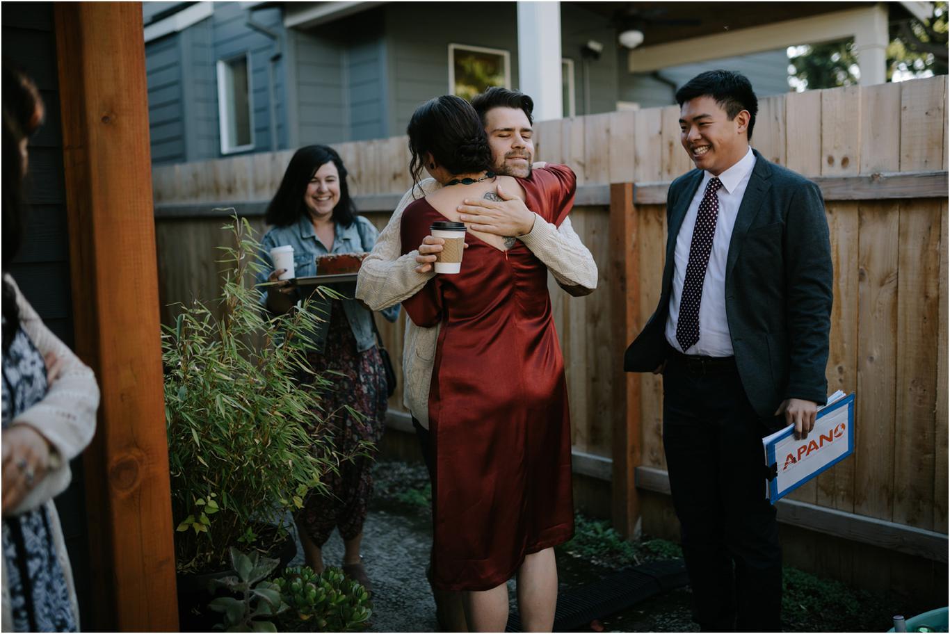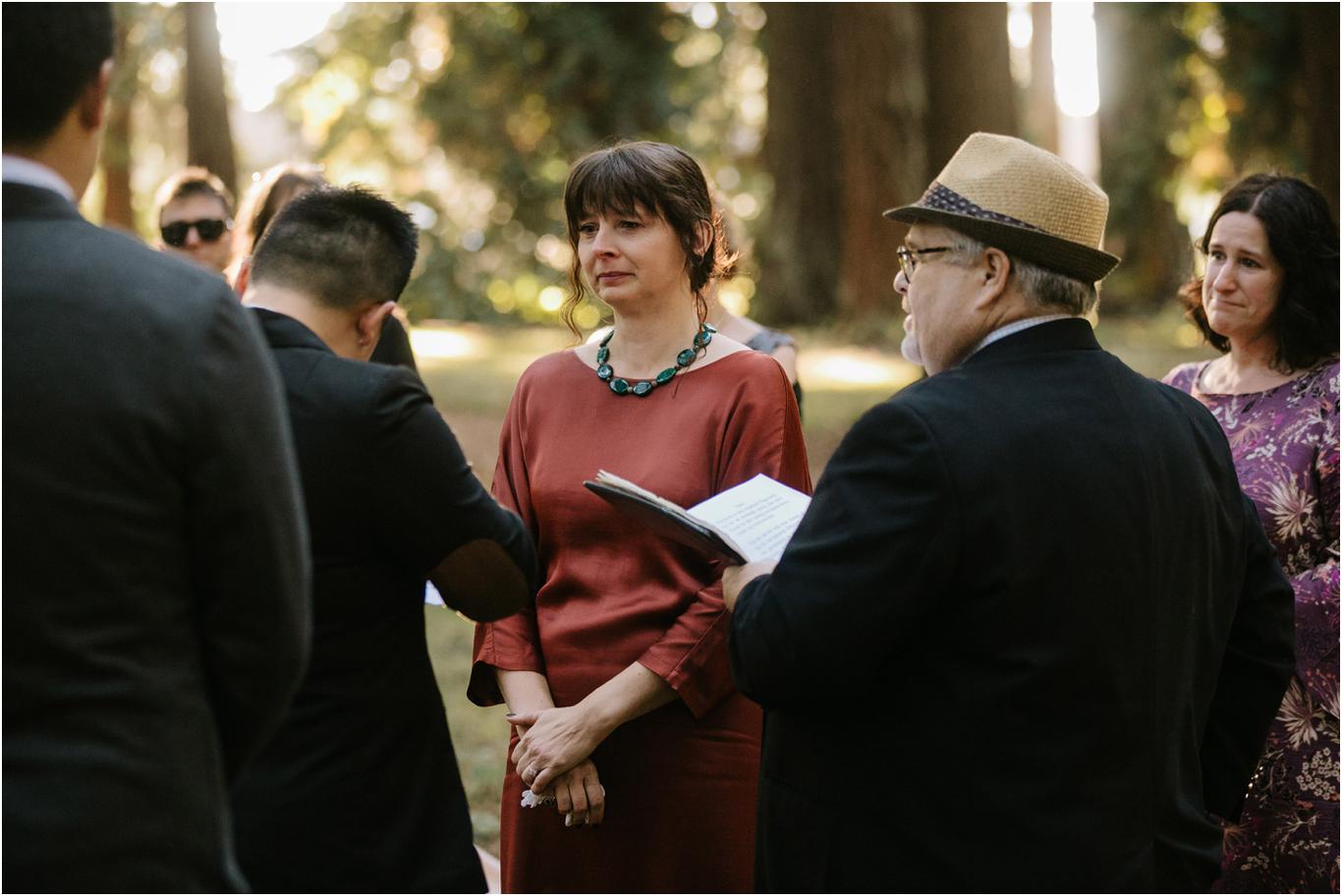 After scheming a bit, Cissey and Marya came up with the perfect plan. They decided to have an intimate Portland elopement in the forest at Pier Park. The park is just down the street from their house, and they go there all the time together! They got ready together that morning, then hosted cocktails and snacks in their backyard before walking over to the forest for their ceremony. We took a ton of pictures amongst the tall trees, then spent a little more time hanging out at their house, eating cake, giving toasts and enjoying the crisp fall weather before dinner. Finally, as it got dark, we set off to Little Sheep, a Mongolian Hot Pot restaurant in Beaverton! It was SO them and such a unique and fun way to end the day with a huge, long meal! I was SO happy I got to be their Portland same sex wedding photographer, as well as a guest!